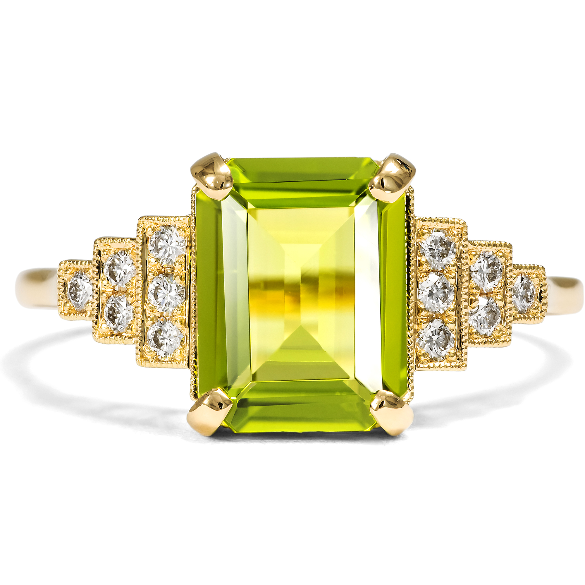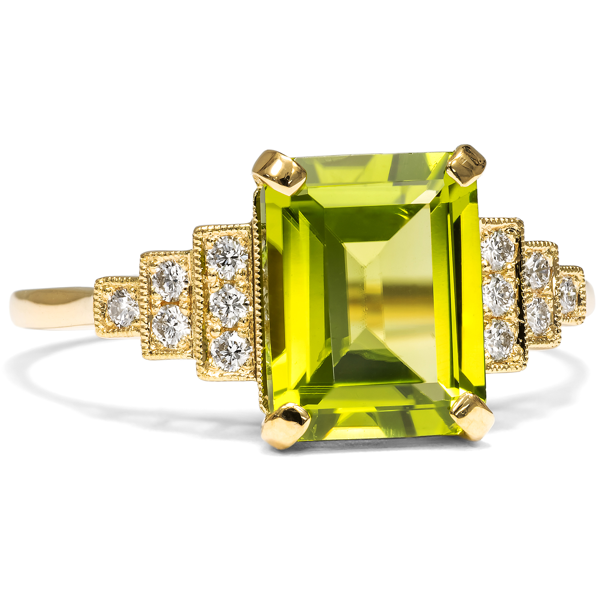 Pieces of jewellery with peridot are relatively rare today - yet the strong, fresh green of this gemstone is unusually beautiful and its story is worth telling. Peridot first became a much-loved fashion stone around 1890, especially in England. At that time, Egypt was under British rule - and it was there, on St. John's Island in the Red Sea, which belonged to Egypt, that the olive-green stone was first discovered and mined. At the same time, according to ancient legends, peridot was the favorite stone of the last pharaoh Cleopatra: its spring-like colour was thus associated with references to both the distant past and the present of the Empire. Today, peridots are also found in Sri Lanka, Brazil and the USA, among other places. However, all locations have the fresh and intense color of the gemstones in common, which delights at first glance. For this ring, we have selected a peridot weighing around 2.30 carats in an emerald cut, which impresses with its color intensity and clarity. Twelve brilliant-cut diamonds accompany the center stone on finely stepped ring shoulders. All stones are set in warm, radiant yellow gold. Our daily contact with historical objects led us to design the ring in the spirit of antique pieces. We took our inspiration from Art Deco jewellery, with its love of graphic, geometric shapes. We then had the design cast in gold using an old technique and refined by hand. The result is a modern ring which, with its delicate shapes and high-quality workmanship, is in the best tradition of European jewellery art.