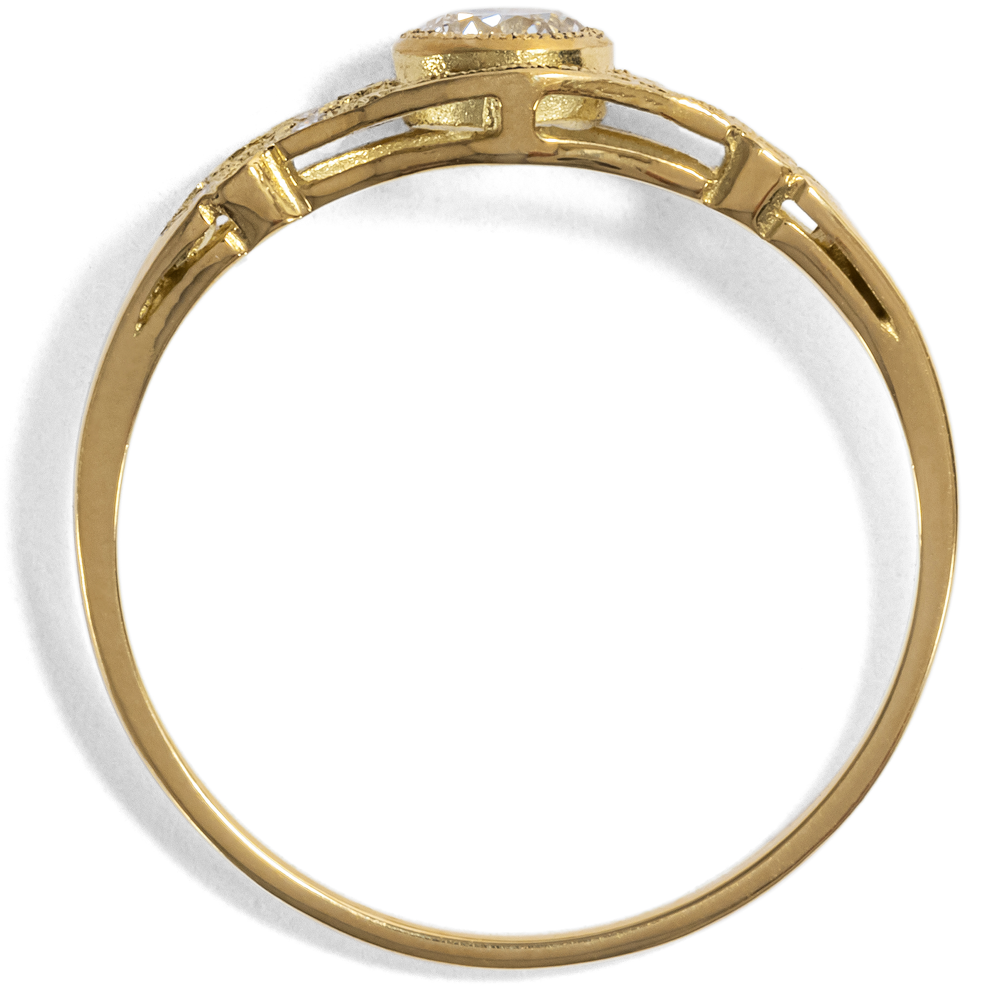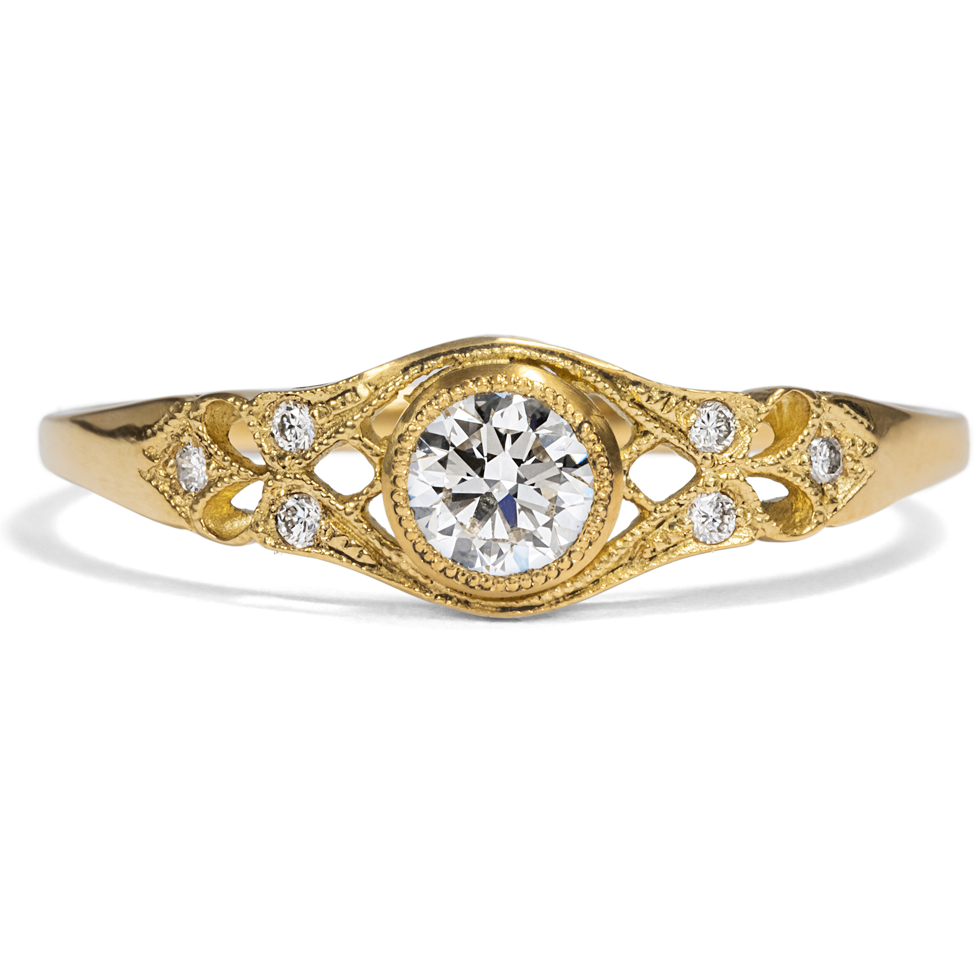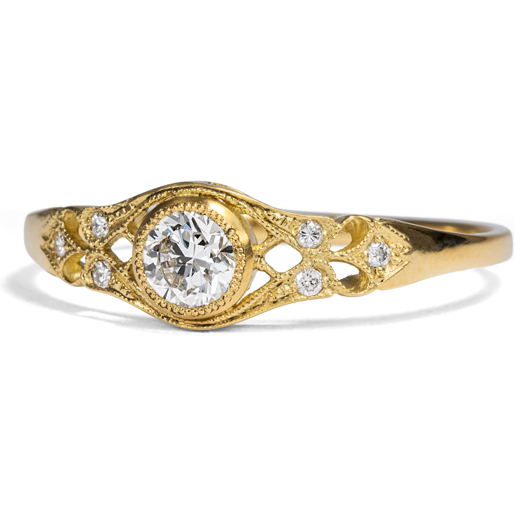 The dilemma of the antique jewelry dealer is to let go of particularly beautiful pieces of jewelry that have only come into our possession after a long search. After all, the hand-forged unique pieces are usually only available once and some pieces of jewelry, sold years ago, are sometimes impossible to forget and linger on. One such piece of jewelry was a diamond ring from around 1905, which immediately impressed us with its delicate yet elegant design. We therefore asked our goldsmith to forge a ring model for us, just like the one we once owned and loved. This ring, our "favorite", has been in our range for a while now. In response to several customer requests, we have now designed a variation of it that combines the shape of our favorite piece with a larger diamond. This high-carat gold ring is also made from antique material. Its center is now adorned with a wonderful, flawless 0.30 ct brilliant-cut diamond. An independent certificate from the GIA for the central diamond is included with the ring. Fine openwork and millegrain decorations structure the surface and give the piece its light elegance. Small additional diamonds add further points of light. The ring can also be worn every day thanks to its high-quality, durable materials and flat design.