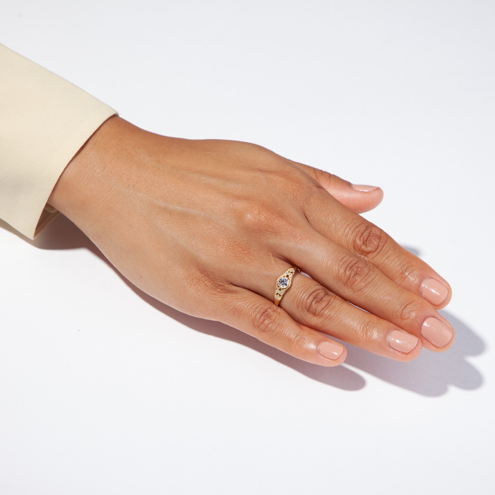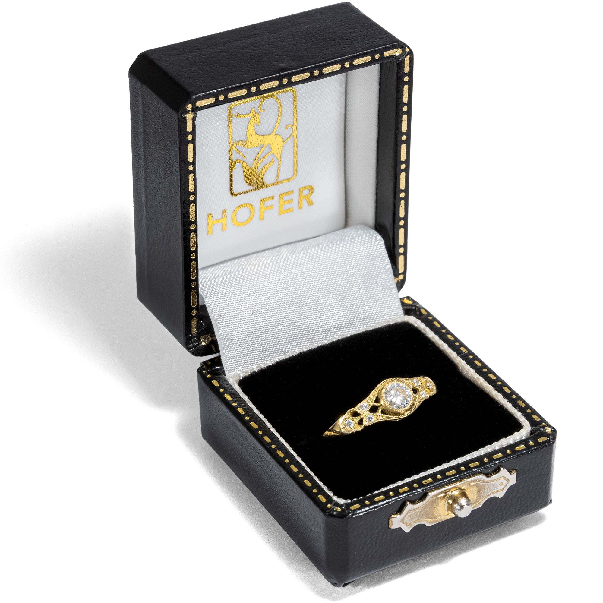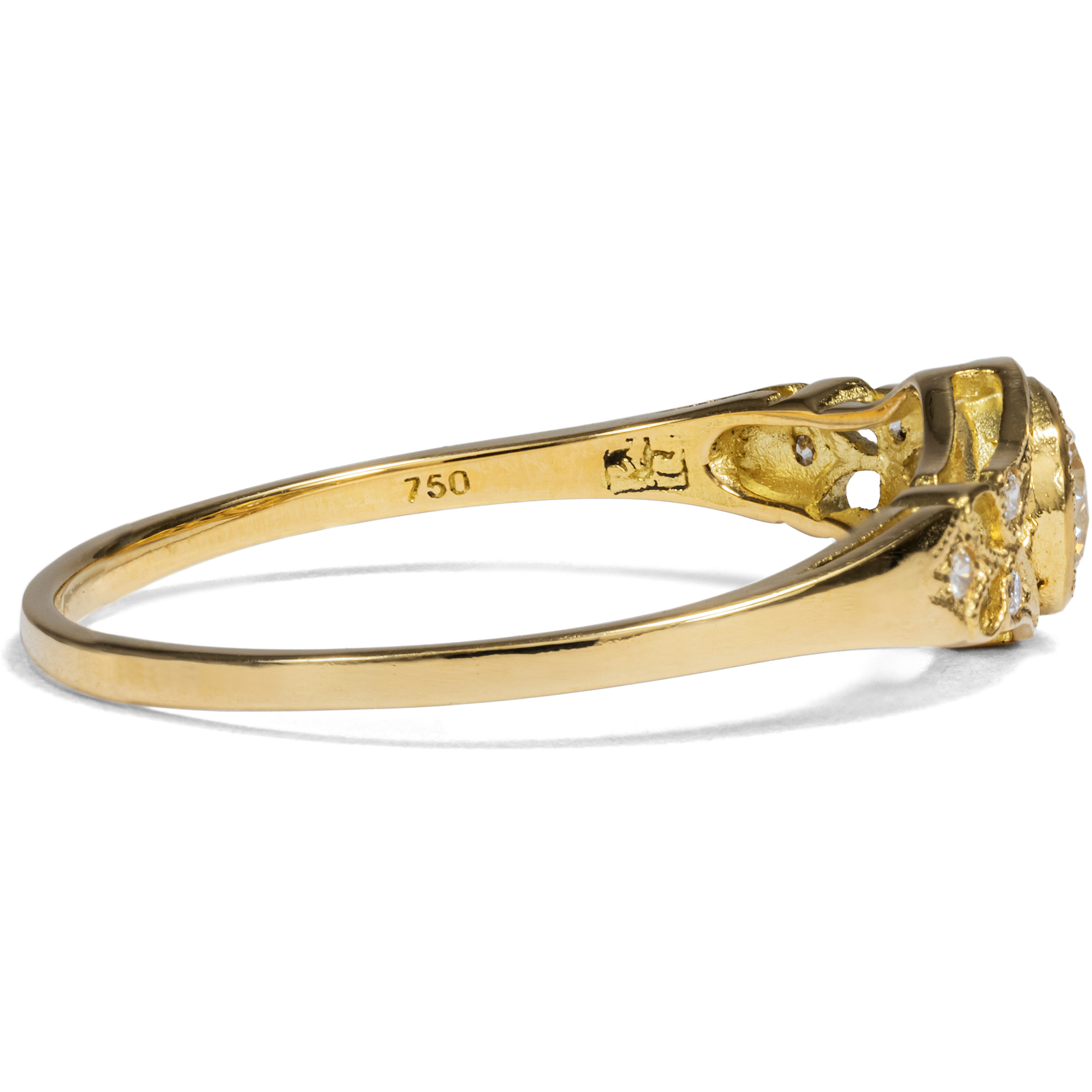 The dilemma of the antique jewelry dealer is to let go of particularly beautiful pieces of jewelry that have only come into our possession after a long search. After all, the hand-forged unique pieces are usually only available once and some pieces of jewelry, sold years ago, are sometimes impossible to forget and linger on. One such piece of jewelry was a diamond ring from around 1905, which immediately impressed us with its delicate yet elegant design. We therefore asked our goldsmith to forge a ring model for us, just like the one we once owned and loved. This ring, our "favorite", has been in our range for a while now. In response to several customer requests, we have now designed a variation of it that combines the shape of our favorite piece with a larger diamond. This high-carat gold ring is also made from antique material. Its center is now adorned with a wonderful, flawless 0.30 ct brilliant-cut diamond. An independent certificate from the GIA for the central diamond is included with the ring. Fine openwork and millegrain decorations structure the surface and give the piece its light elegance. Small additional diamonds add further points of light. The ring can also be worn every day thanks to its high-quality, durable materials and flat design.