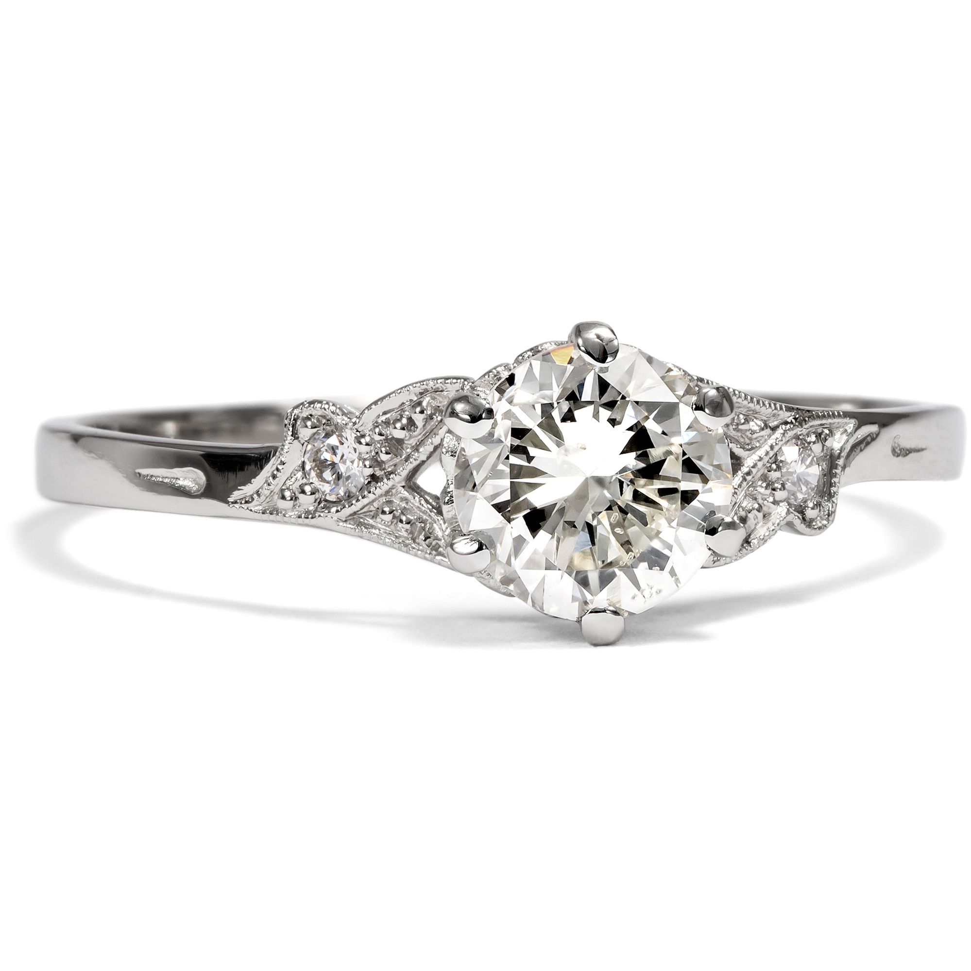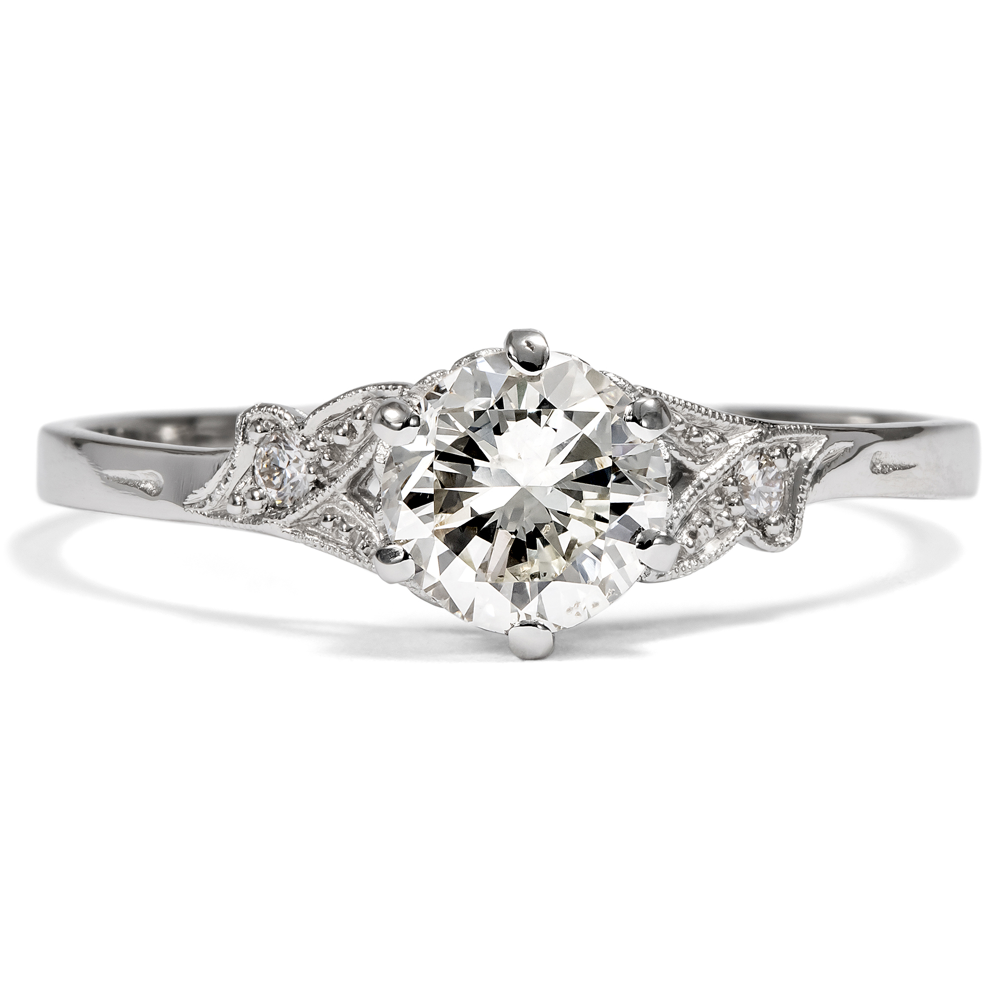 As antique jewelry dealers, our love of antique objects means that we occasionally also buy unmounted gemstones. After all, every historic diamond is an unmistakable, unique piece with its very own character. However, the search for beautiful settings for our historical diamonds turned out to be more difficult than expected. Modern ready-made settings, as you can buy them in stores, are often soulless machine products with no feeling for shape and proportion. But beautiful, hand-forged, antique settings rarely come to us without matching diamonds. So we commissioned our goldsmith to make a ring setting according to our design, which we then had cast using an old technique. We had this ring made from fine platinum and had a vintage diamond from the 1970s set in it. The diamond of 0.79 ct sparkles in a warm tinted white+ (K) color grade and has only very small inclusions (si). All in all, it is a medium diamond quality that nevertheless impresses with its beautiful brilliance when set in a ring. Two smaller diamonds in delicate ornaments with milgrains enliven the ring shoulders and give the piece its light elegance, which sets off the large brilliant-cut diamond wonderfully. At the same time, the piece of jewellery sparkles with every ray of light that hits its finely crafted surfaces. The ring can also be worn every day thanks to its high-quality, durable materials and flat design. An ideal ring for what is probably the most important question in life - and that is always a matter of the heart!