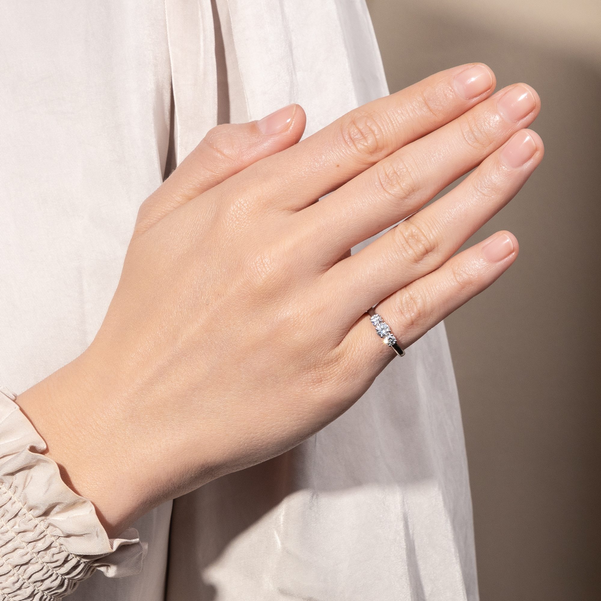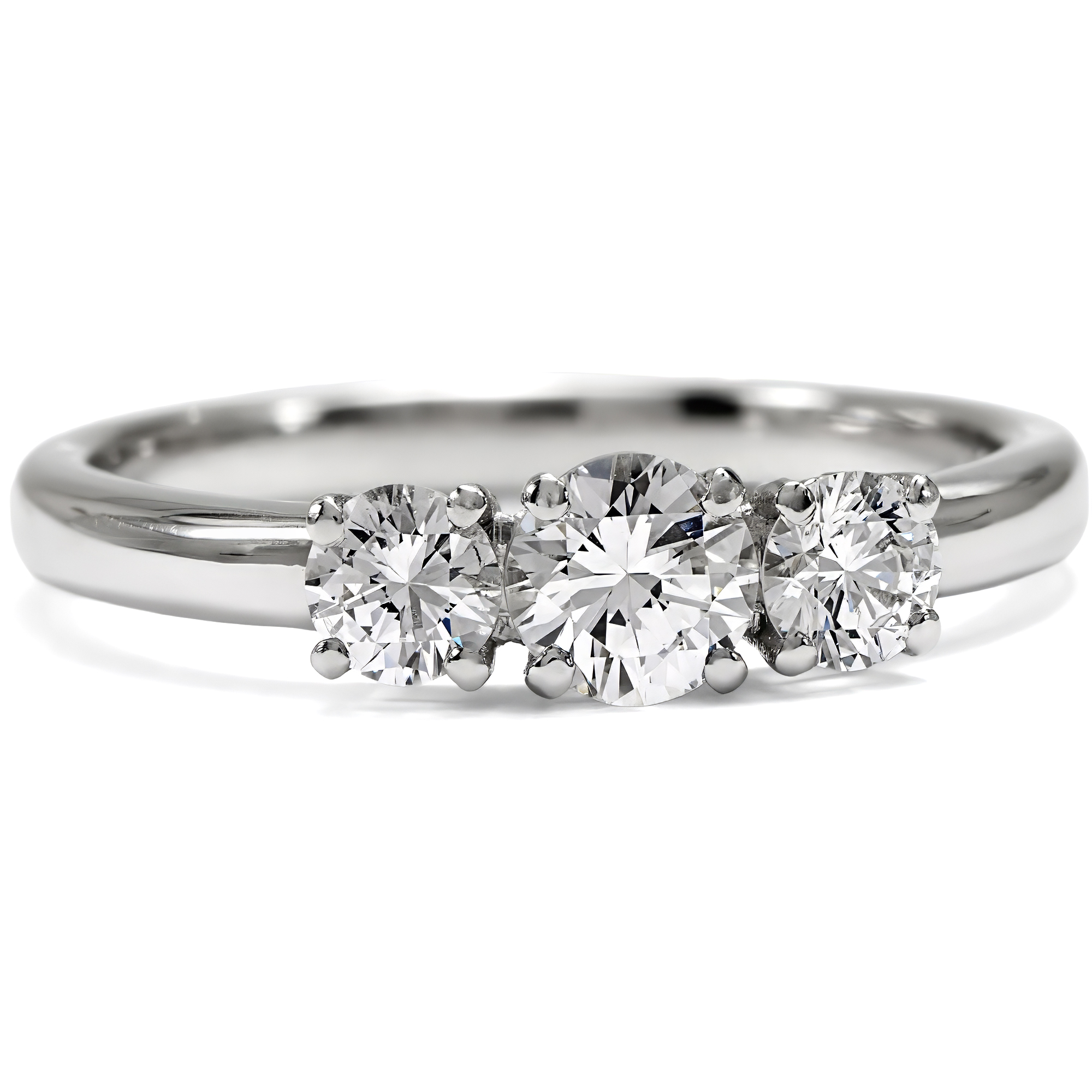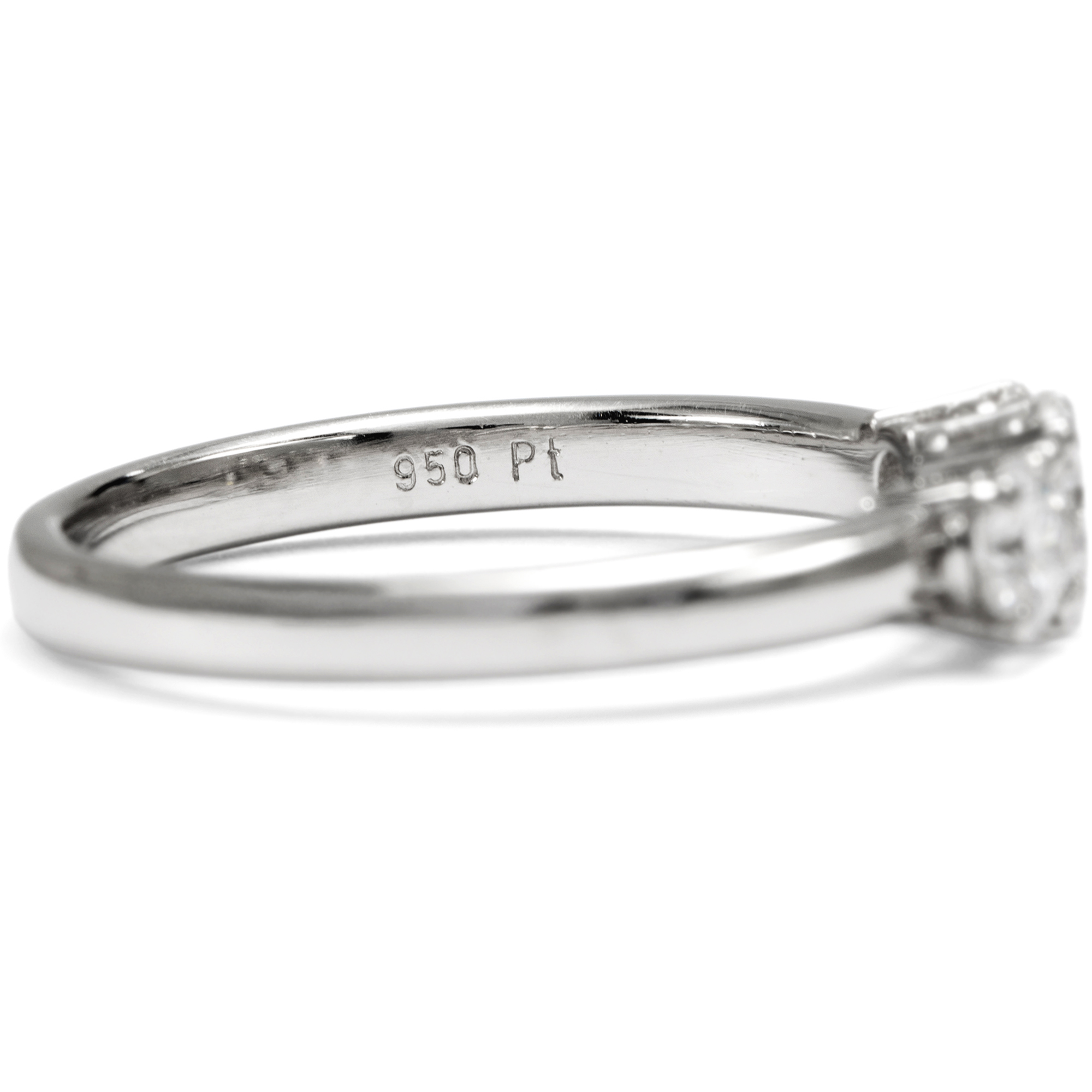 "Tradition is not the worship of ashes, but the passing on of fire." The famous symphonist Gustav Mahler (1860-1911) already knew this. This sentence applies particularly to this modern ring, as its romantic symbolism follows a centuries-old tradition. The ring was commissioned by us and is a fine example of the survival of a classical type which at the same time does not deny its time of origin. The understated, modern platinum ring band features three sparkling diamonds weighing a total of 0.64 carats, with a larger center stone weighing 0.31 ct flanked by two smaller diamonds. All the stones shine white and show only very small inclusions (vsi). The special feature of this ring is that all three diamonds are vintage diamonds. They came to us as part of pieces of jewellery from the 1960s and 1970s, which unfortunately could no longer be repaired. However, the diamonds were perfectly preserved and of very good quality, so we decided to set them in this new ring made by our goldsmiths. The design idea for the ring was developed from the tradition of trilogy rings, which are charged with content: Thus, the number of gemstones in these pieces is meant to represent the past, present and future lived together. The diamonds, which according to legend are indestructible and therefore eternal gemstones, represent the promise of eternity. Due to its shape, but also its meaning, our ring can therefore be a perfect engagement ring or a gift of love.