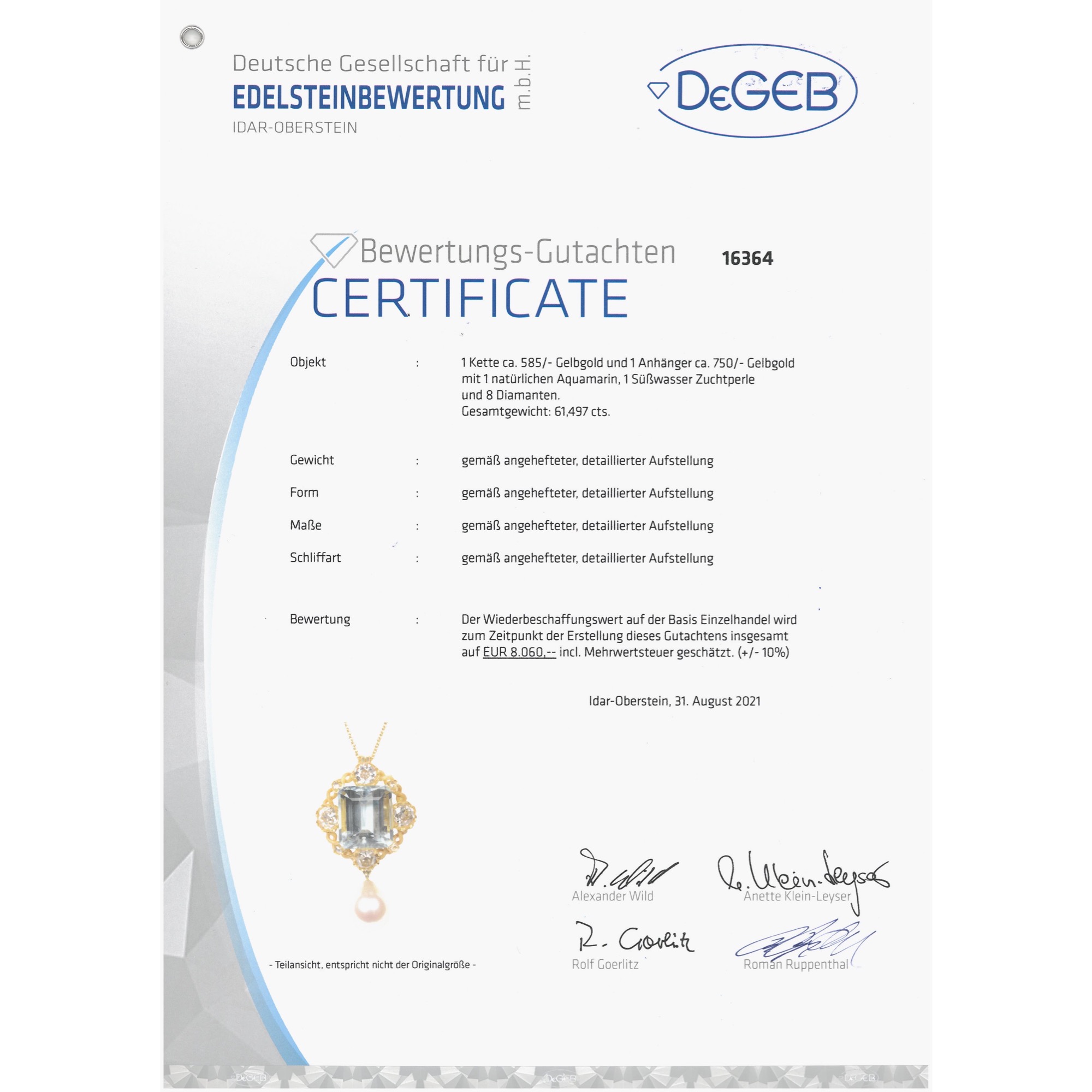 Around the middle of the 19th century, goldsmiths were fond of transferring naturalistic motifs from the plant world into jewellery. Surprisingly, one of the most sought-after motifs was the branch! In fact, this initially inconspicuous motif is ideally suited for jewellery design. The natural pattern requires a finely grained structuring of the gold, which was fashionable in the middle of the century anyway and allowed the goldsmith to use all his skill. The present jewel forms a frame of finely grained knots, forged from 18-carat yellow gold. Diamond roses and old mine cut diamonds glisten like dewdrops on these branches. This frame was created in the years around 1850, but it found its way to us without its original center stone. So we considered a new setting for the antique piece. An aquamarine of more than 10 carats was chosen as the center of the piece and a drop pearl is pendulously attached to the composition. Thus, in the spirit of the 19th century's enthusiasm for nature, a piece of jewellery was created that, with its branch design, has a reference to the land and, with its gemstone setting, a reference to the sea: For the aquamarine is named after sea water, from the Latin aqua marina. After careful reworking by our goldsmith, we have had an independent certificate drawn up attesting to the quality of the materials used. It comes with the magnificent pendant.