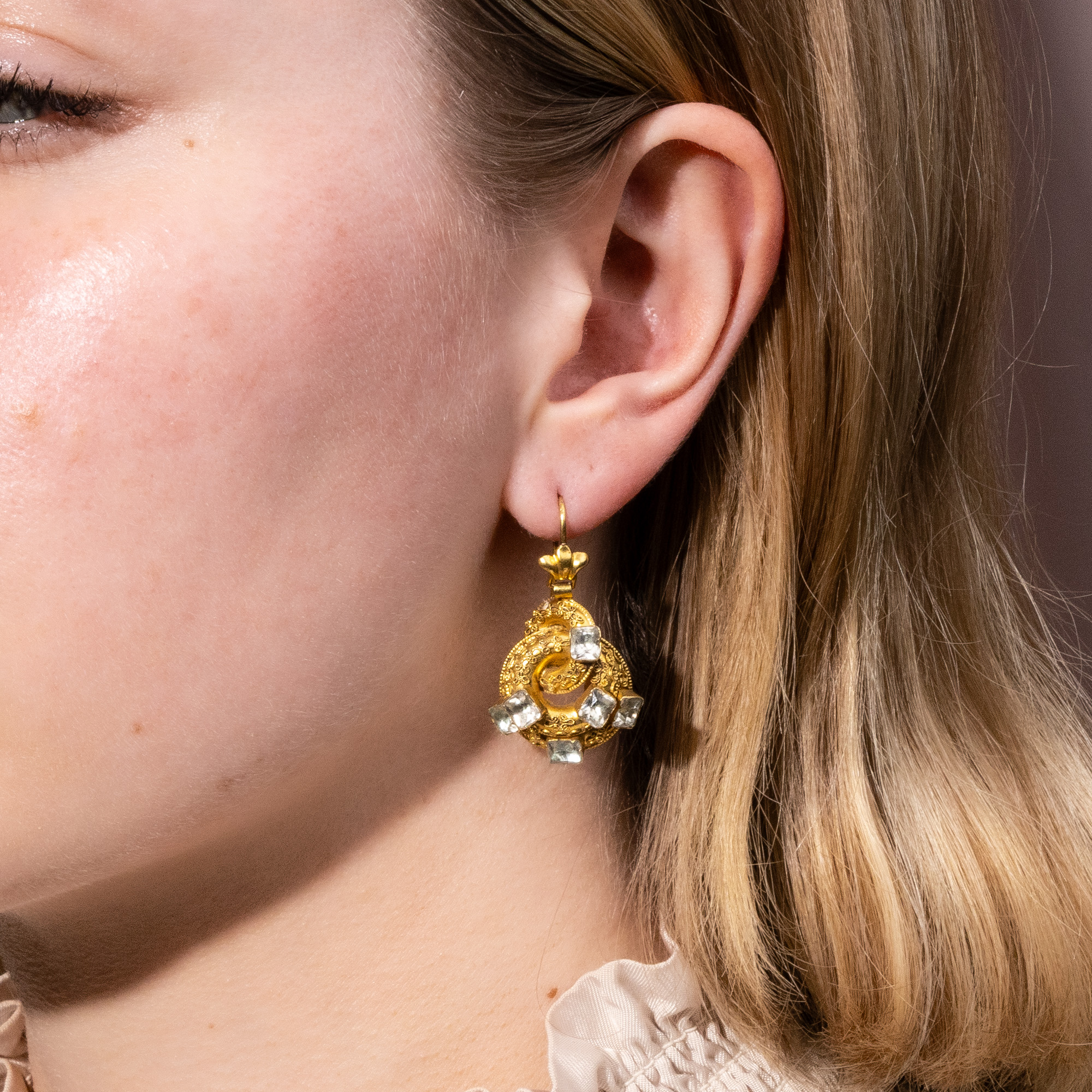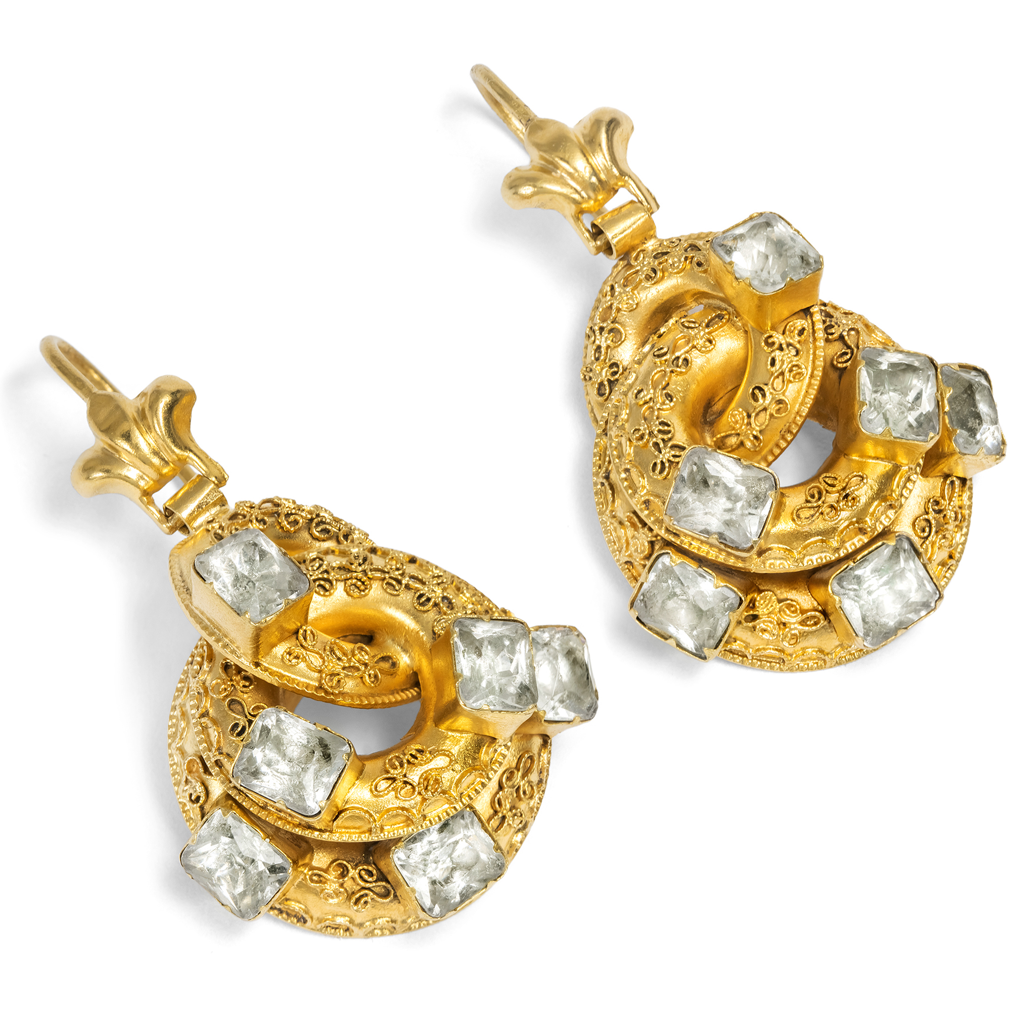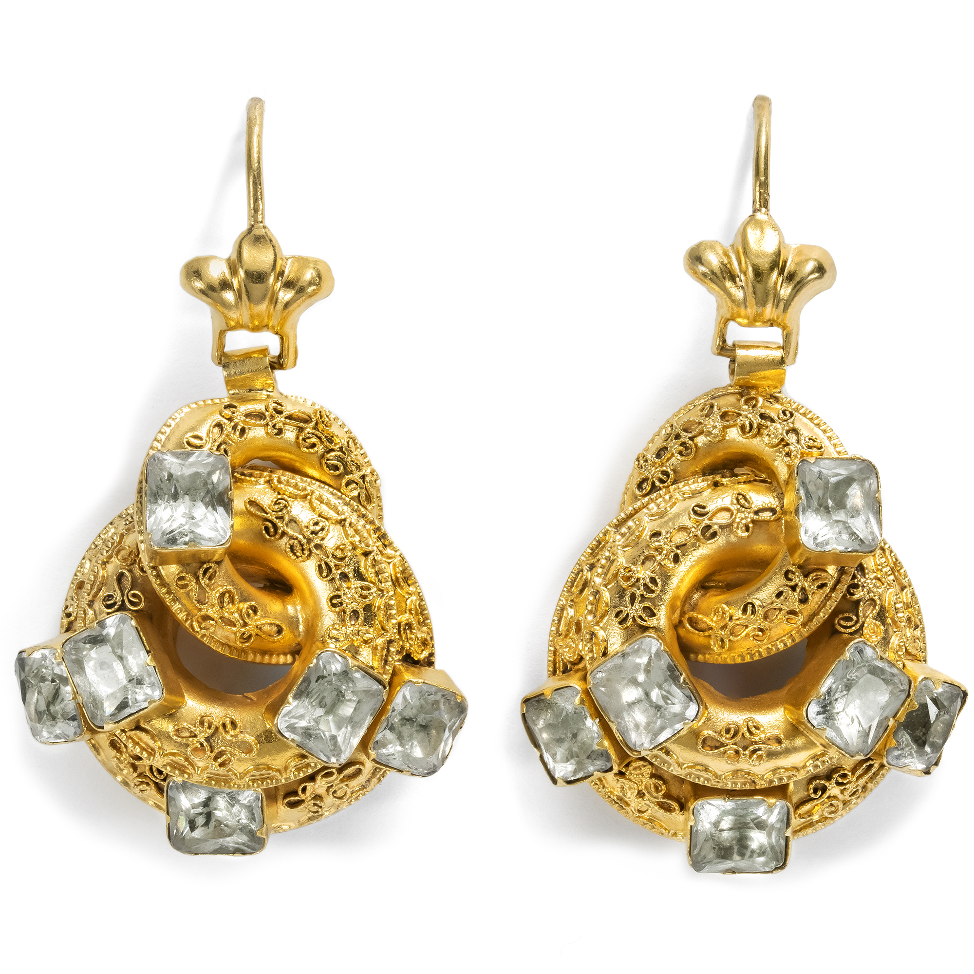 This pair of earrings is reminiscent of a walk in the woods on a clear, sunlit morning in winter. Sparkling glass stones in a delicate aquamarine blue glitter like ice crystals, highlighted by closed settings. They appear to be frozen to golden branches that are twisted into knots. The design language of the earrings is typical of Victorian jewellery from around 1850. Knots of intertwined gold ribbons, textured with overlays of fine gold cords, were set with gemstones such as almandines, emeralds and coral, as well as imitations of coloured glass, which were faceted and set with the same effort. The knot motif had developed from the fashion for naturalistic works in the form of branches, leaves and grapes: After all, nature was the focus not only in the sciences, but also in art. We discovered the beautiful earrings in London. They were created over a century and a half ago in England and have survived very well since then,