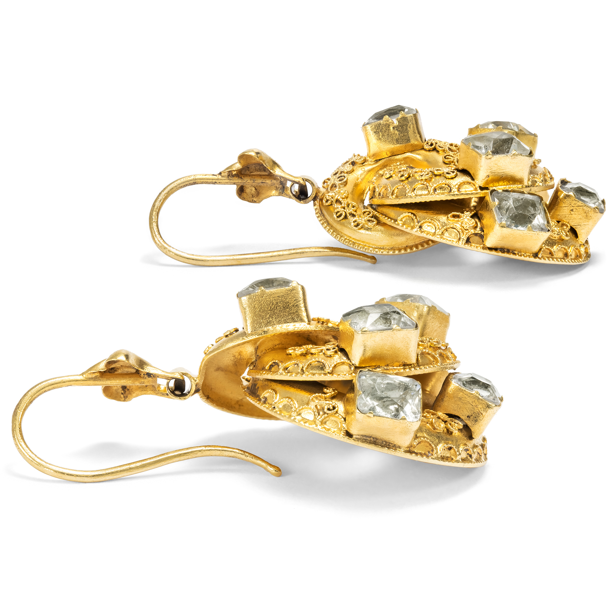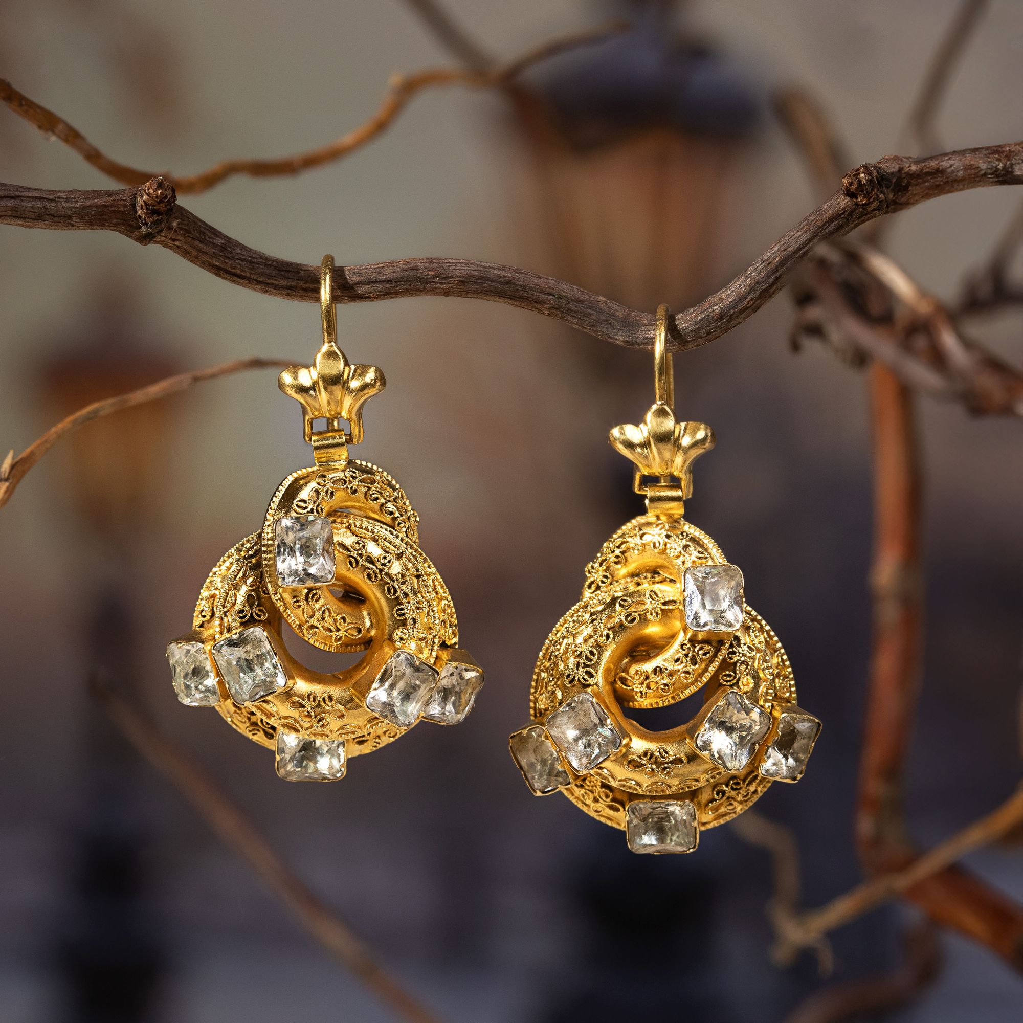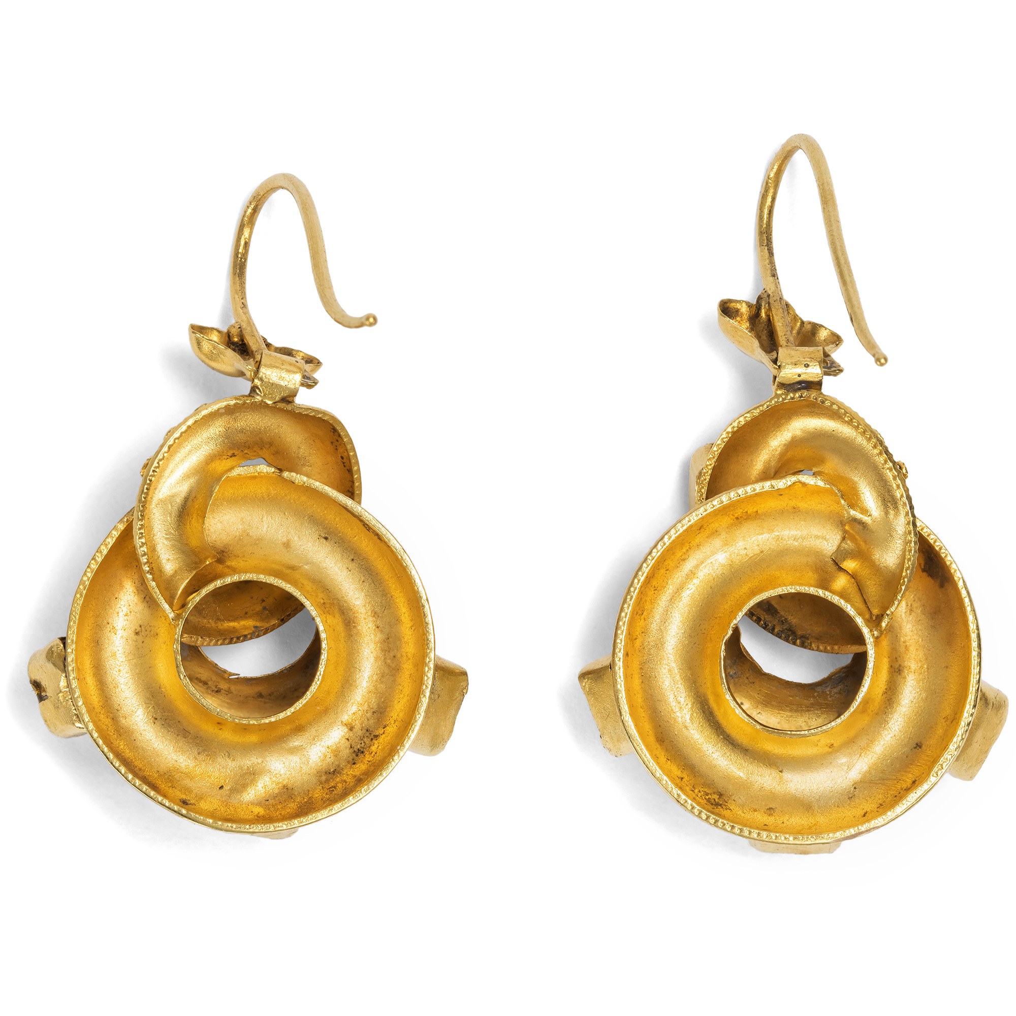This pair of earrings is reminiscent of a walk in the woods on a clear, sunlit morning in winter. Sparkling glass stones in a delicate aquamarine blue glitter like ice crystals, highlighted by closed settings. They appear to be frozen to golden branches that are twisted into knots. The design language of the earrings is typical of Victorian jewellery from around 1850. Knots of intertwined gold ribbons, textured with overlays of fine gold cords, were set with gemstones such as almandines, emeralds and coral, as well as imitations of coloured glass, which were faceted and set with the same effort. The knot motif had developed from the fashion for naturalistic works in the form of branches, leaves and grapes: After all, nature was the focus not only in the sciences, but also in art. We discovered the beautiful earrings in London. They were created over a century and a half ago in England and have survived very well since then,