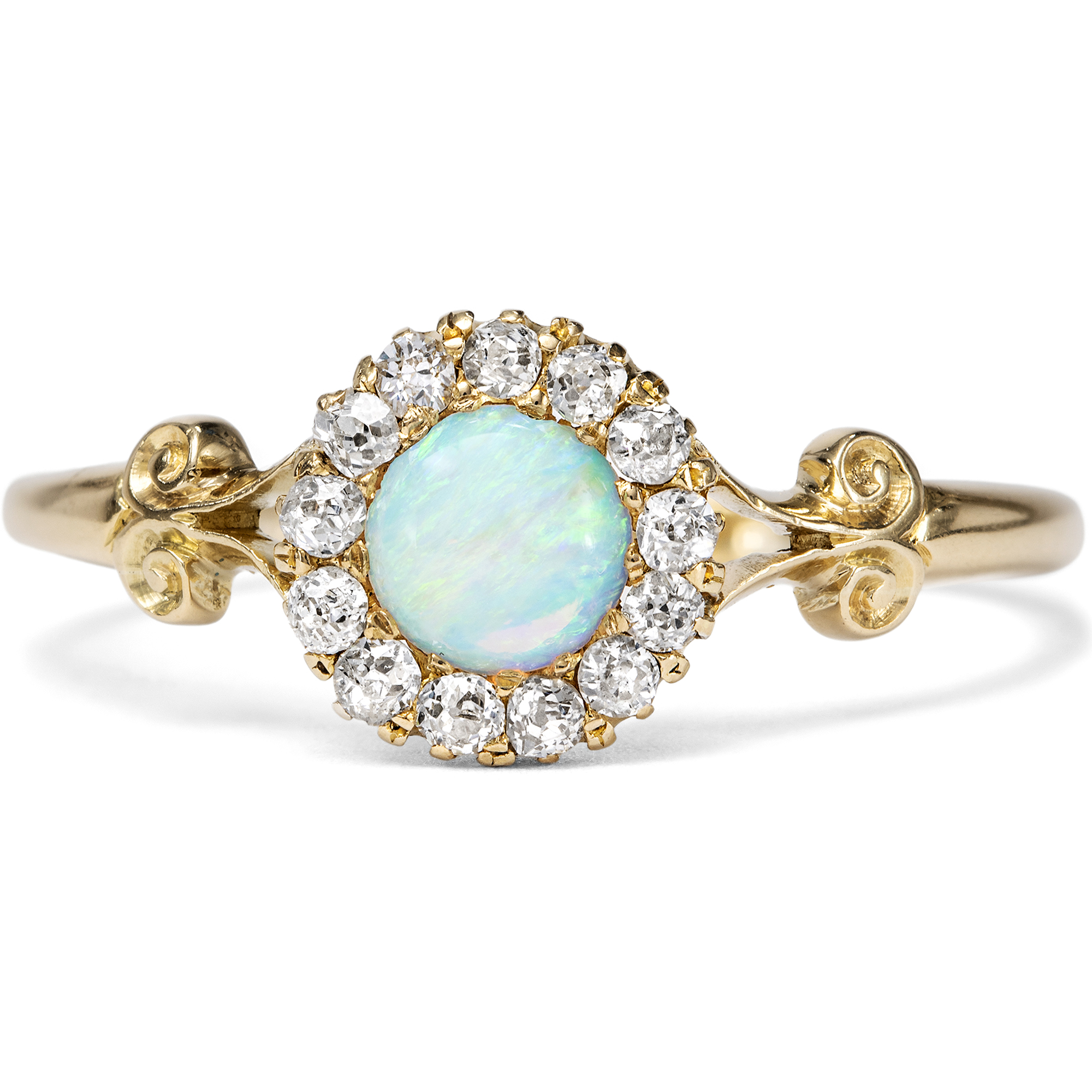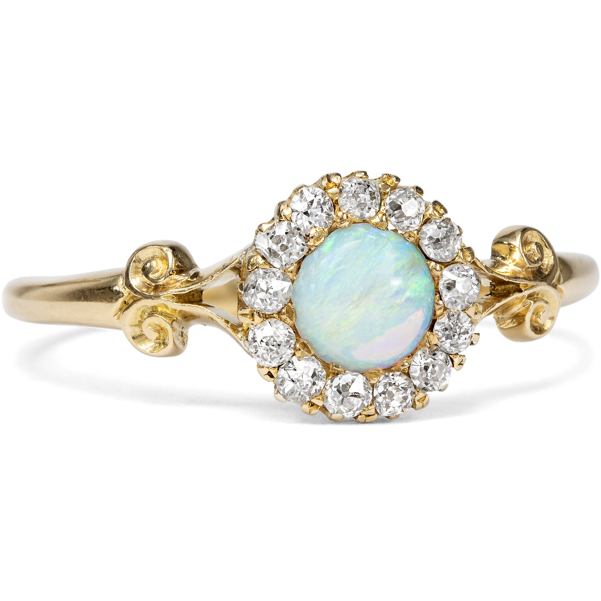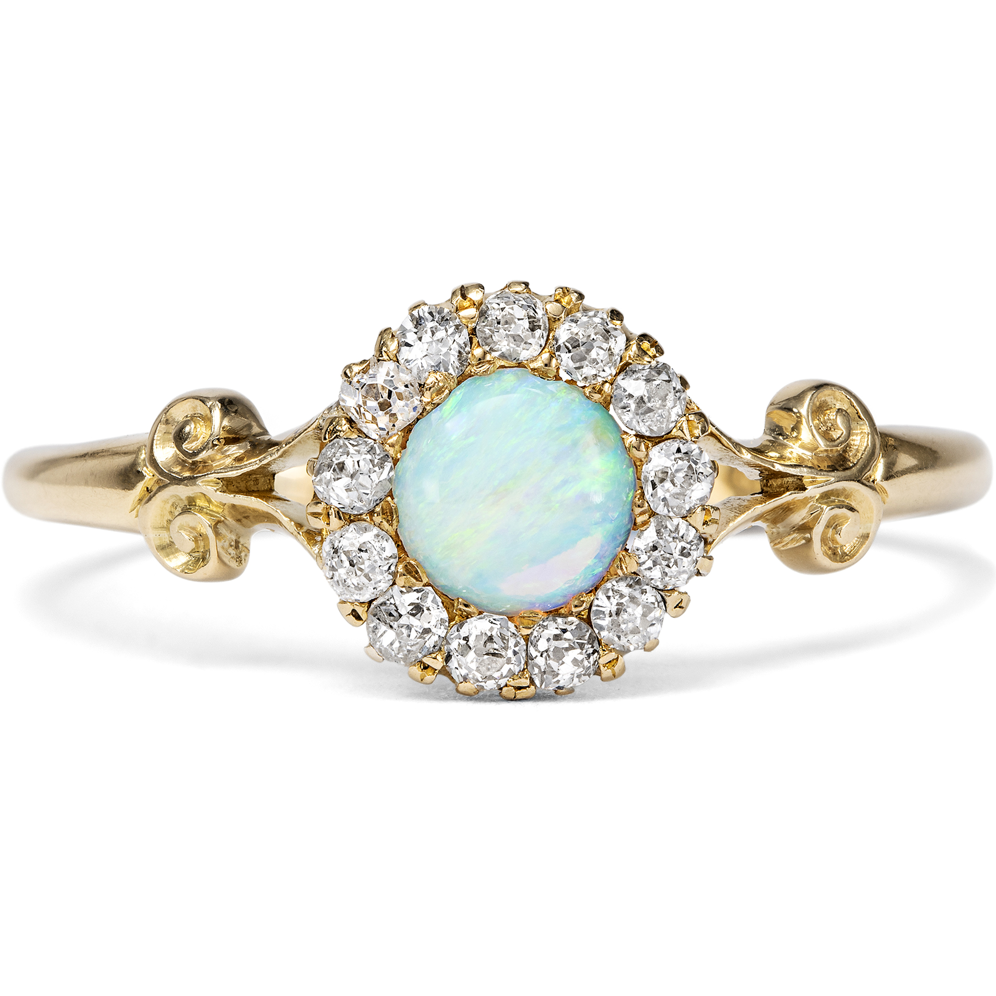 Australia is famous for the most beautiful opals in the world. But did you know that pieces of jewellery with Australian precious opals have not been on the gemstone market for that long? The first European to discover opals in Australia was the German geologist Johannes Menge. He found the first opals north of Adelaide as early as 1841, but these finds received little attention as they were not yet precious opals of jewelry quality. The first finds of such precious opals were not documented until 1872, and commercial mining began in the 1890s. From then on, Australian opal captured the hearts of gemstone lovers and collectors all over the world. This ring, which we discovered in London, features a magnificent Australian full opal. The small but first-class gemstone, cut into a round, shimmering cabochon, displays a soft red and green as well as a rare orange over a light body. This particularly coveted color composition seems to glow in the light. The opal is accompanied by thirteen old-cut diamonds, which frame the play of colors with sparkling reflections. The compact ring made of high-carat gold impresses with its magnificent stone setting and the harmonious balance between shine and color. As we encountered it in London, the ring retains the aura of a discovery: the glow of Australia captured in gold.