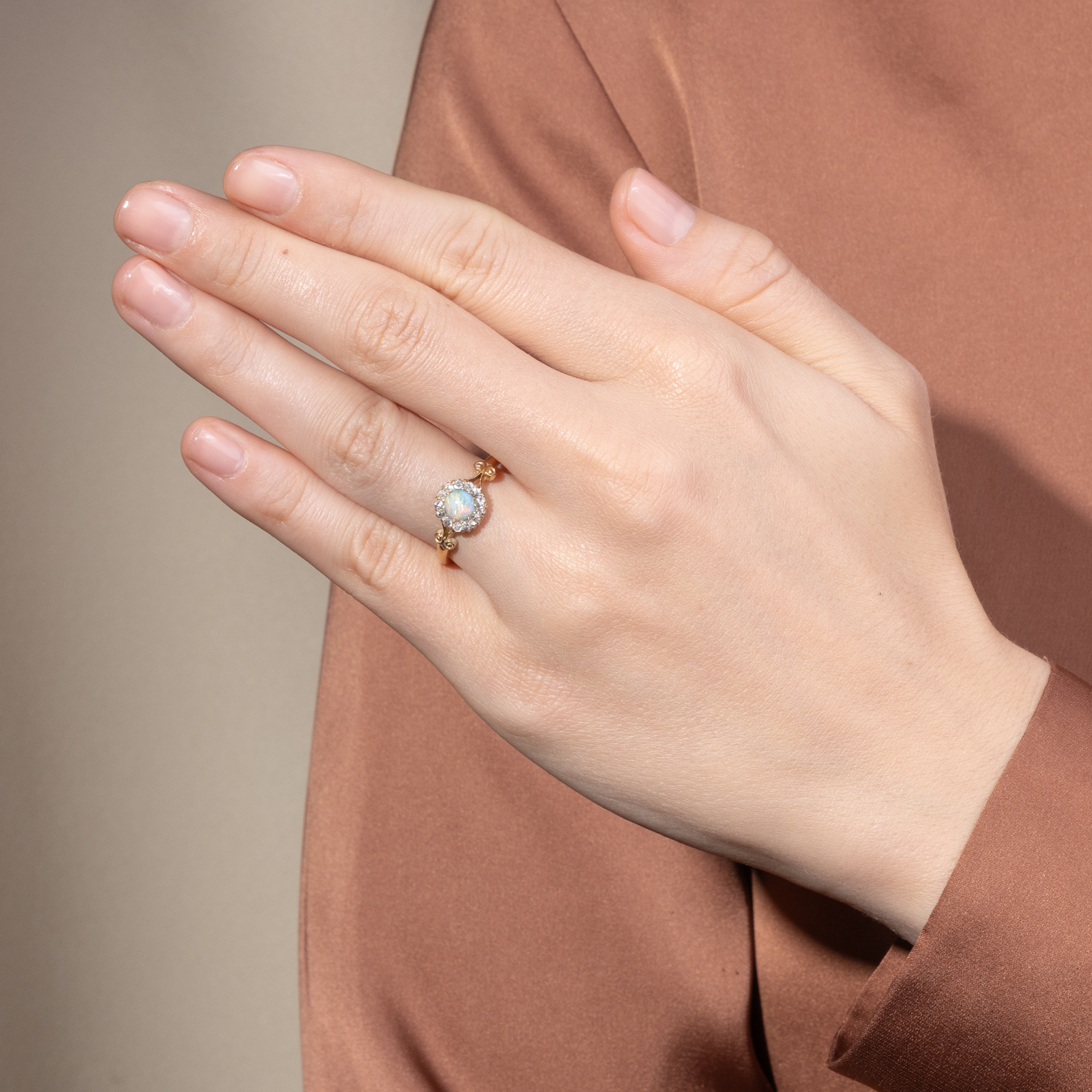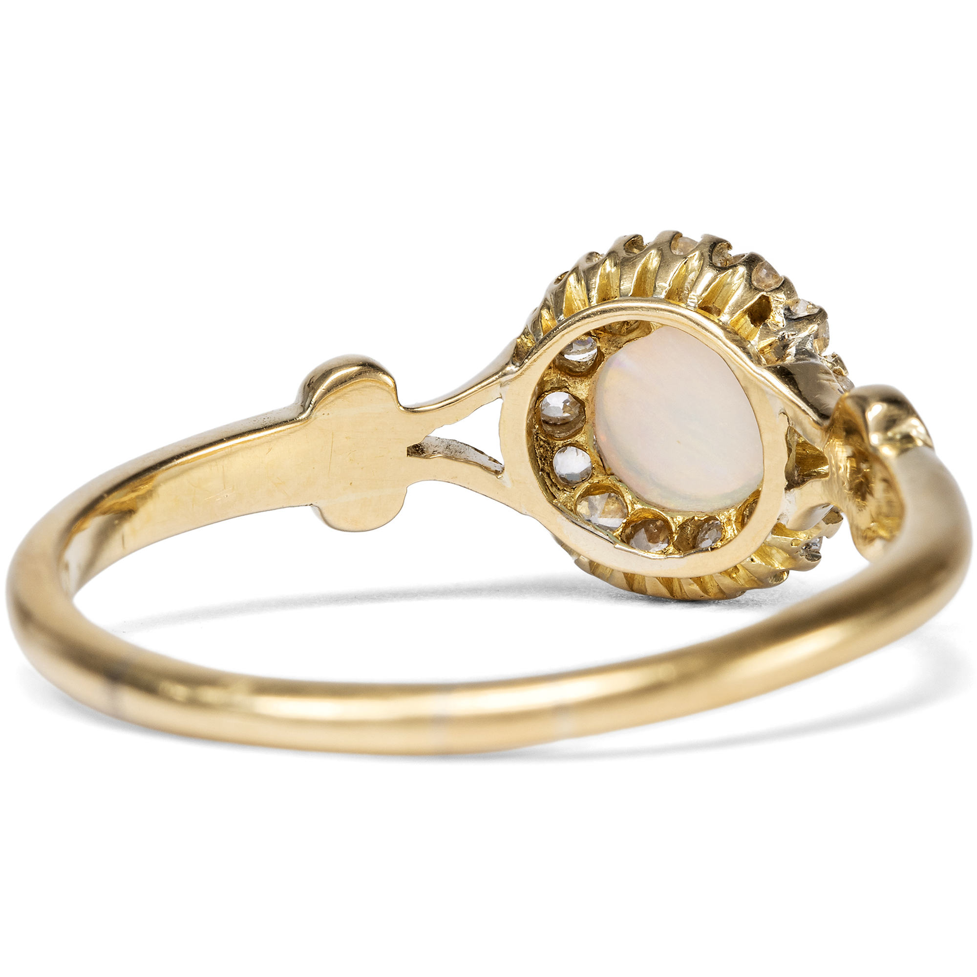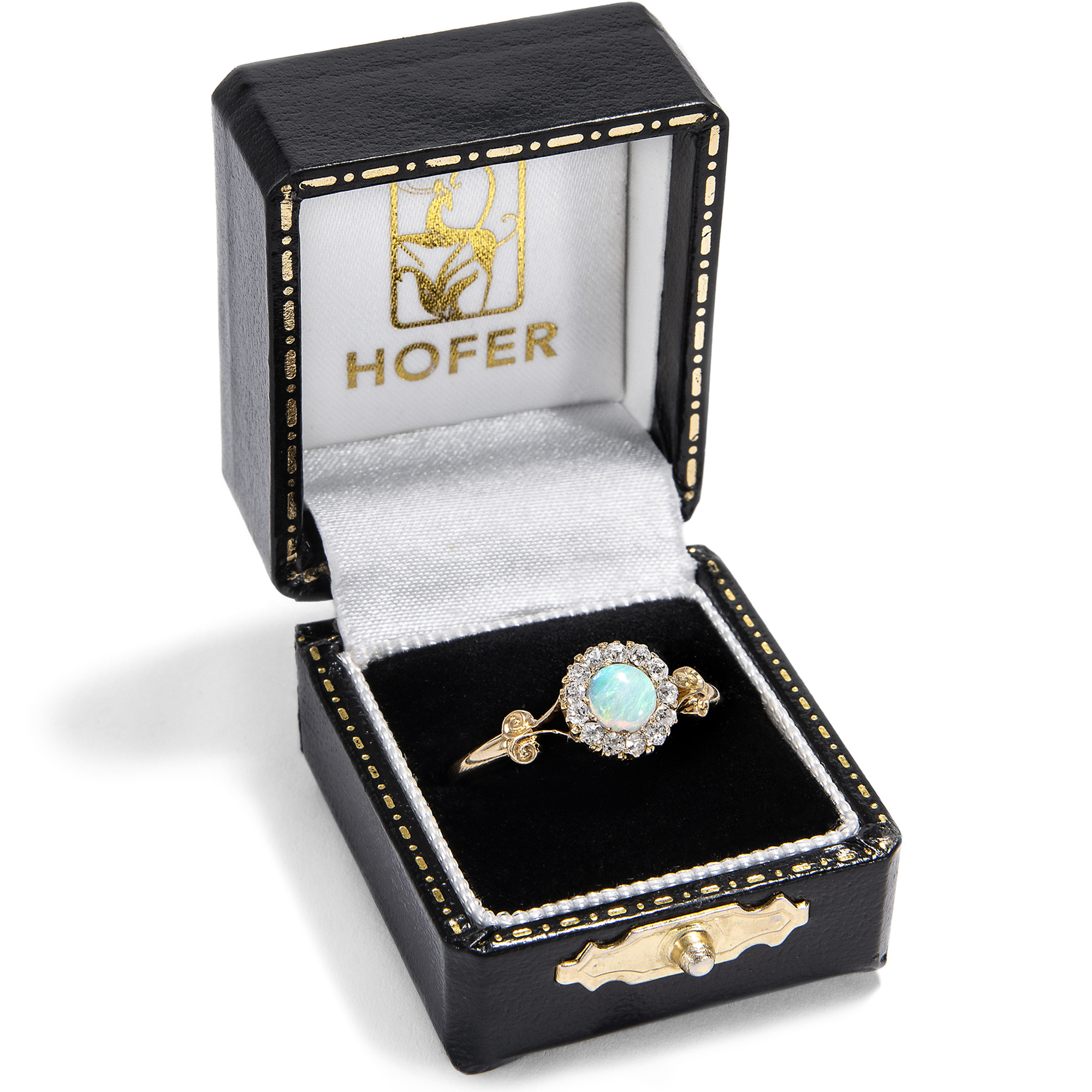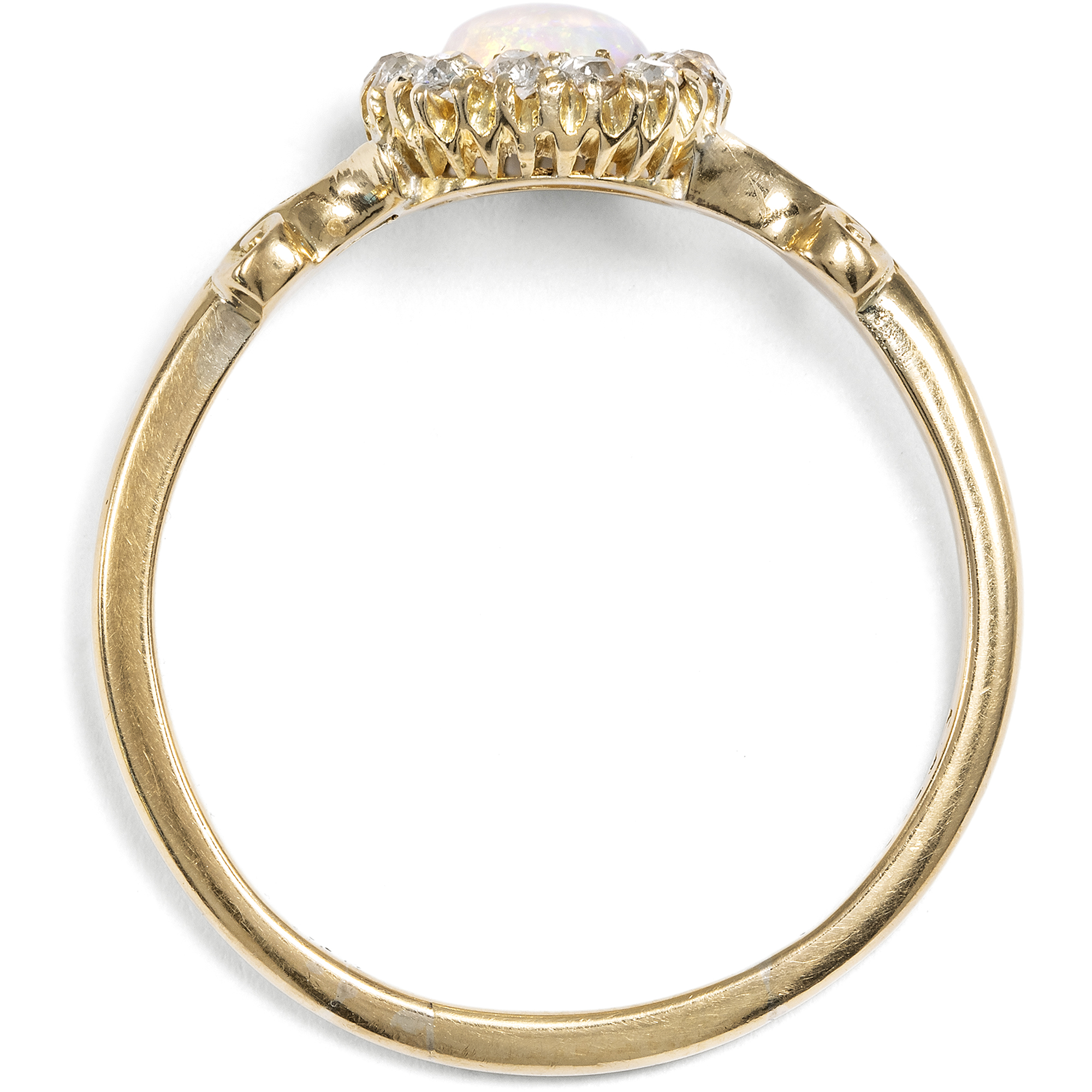 Australia is famous for the most beautiful opals in the world. But did you know that pieces of jewellery with Australian precious opals have not been on the gemstone market for that long? The first European to discover opals in Australia was the German geologist Johannes Menge. He found the first opals north of Adelaide as early as 1841, but these finds received little attention as they were not yet precious opals of jewelry quality. The first finds of such precious opals were not documented until 1872, and commercial mining began in the 1890s. From then on, Australian opal captured the hearts of gemstone lovers and collectors all over the world. This ring, which we discovered in London, features a magnificent Australian full opal. The small but first-class gemstone, cut into a round, shimmering cabochon, displays a soft red and green as well as a rare orange over a light body. This particularly coveted color composition seems to glow in the light. The opal is accompanied by thirteen old-cut diamonds, which frame the play of colors with sparkling reflections. The compact ring made of high-carat gold impresses with its magnificent stone setting and the harmonious balance between shine and color. As we encountered it in London, the ring retains the aura of a discovery: the glow of Australia captured in gold.