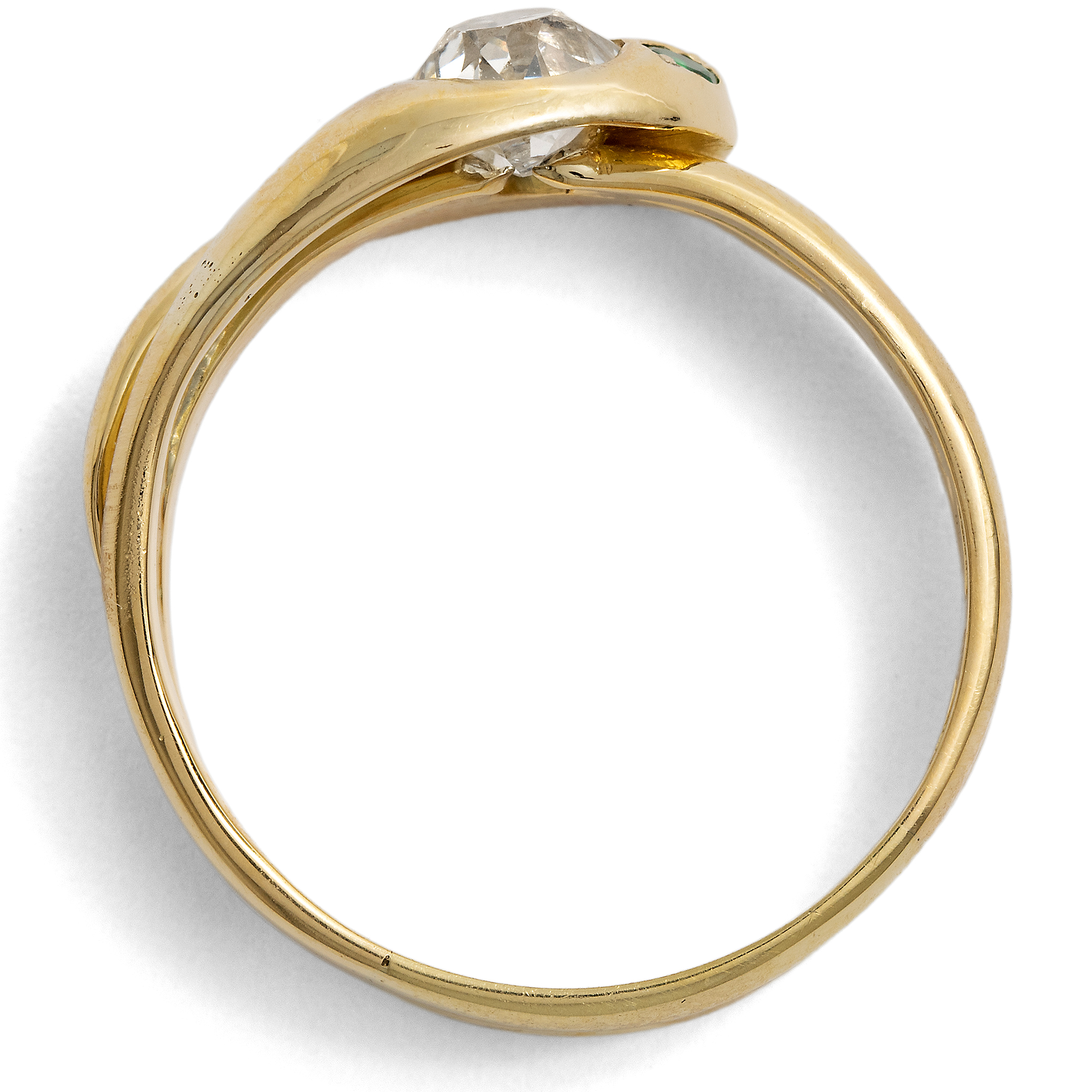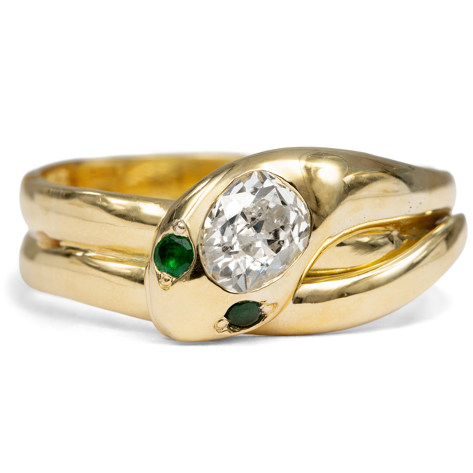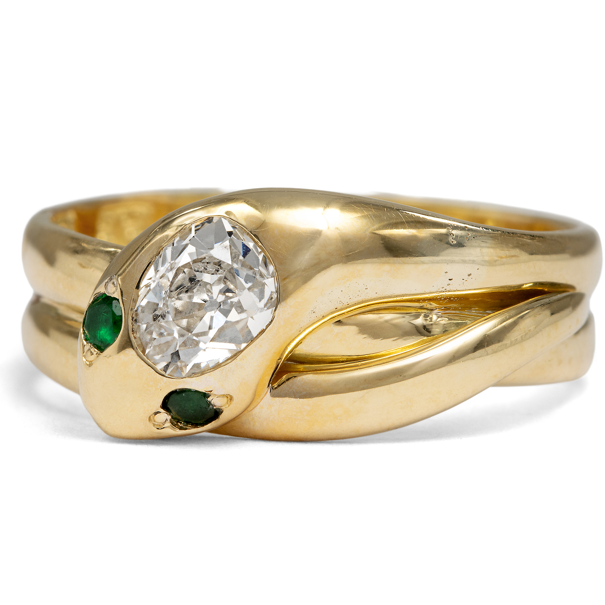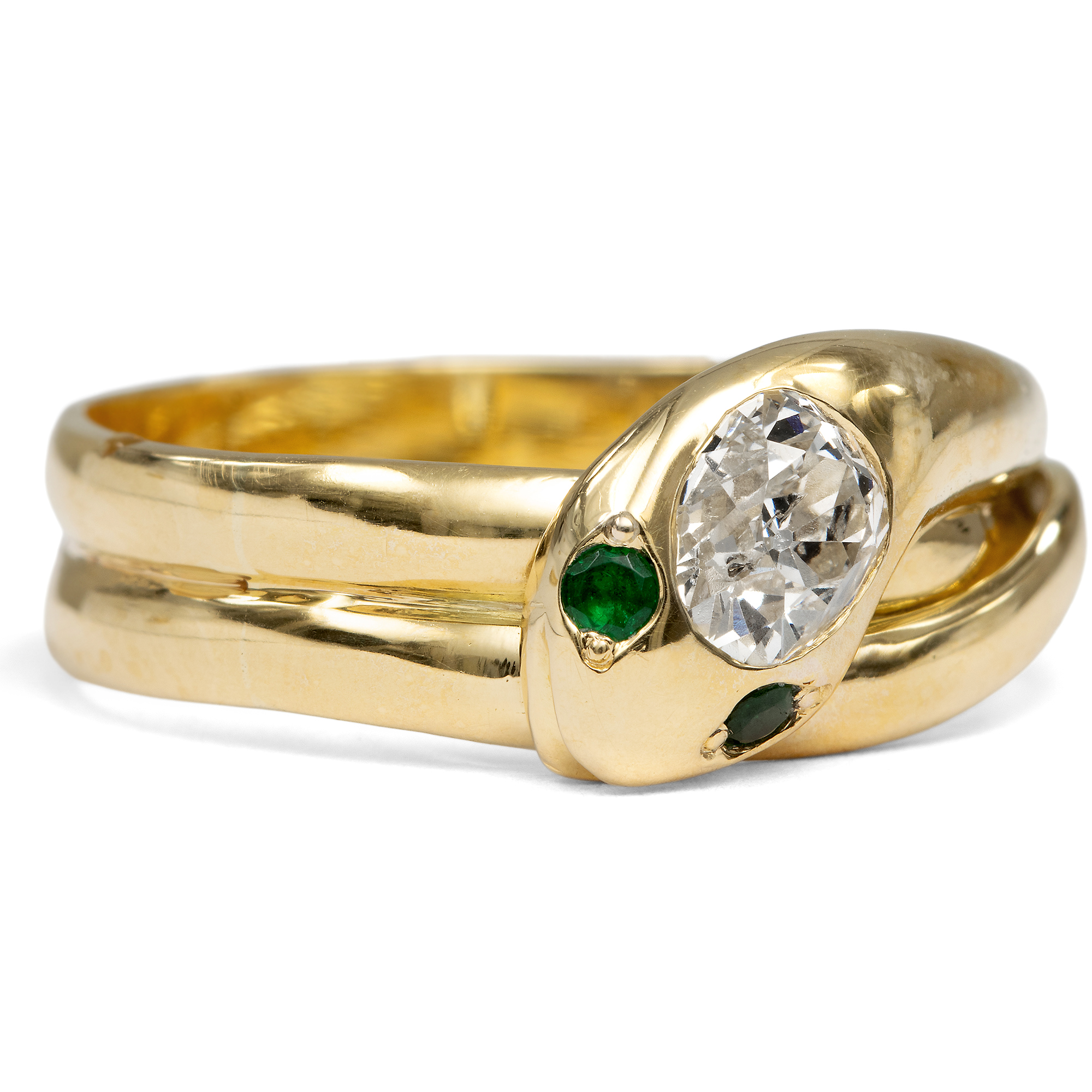 This ring made of warm, shiny gold is designed in the shape of a writhing snake. The head of the animal bears a beautiful, individually cut diamond in a slightly teardrop-shaped old cut, while the eyes of the snake are formed from emeralds. The ring motif of the snake is an ancient symbol of friendship and solidarity. This pictorial idea was already widespread in ancient Egypt; in Germany it experienced a heyday during the Biedermeier period and later flourished again in Art Nouveau. A famous historical example of this symbolism is Queen Victoria's engagement ring: in 1839, she received a snake ring with an emerald, her birthstone, from Prince Albert as a sign of eternal love and loyalty. Our piece also comes from England and was created around 1890. The diamond is white and shows some natural graphite inclusions, which attest to its authenticity; it weighs approximately 0.69 ct. We discovered the precious creeper in London.
