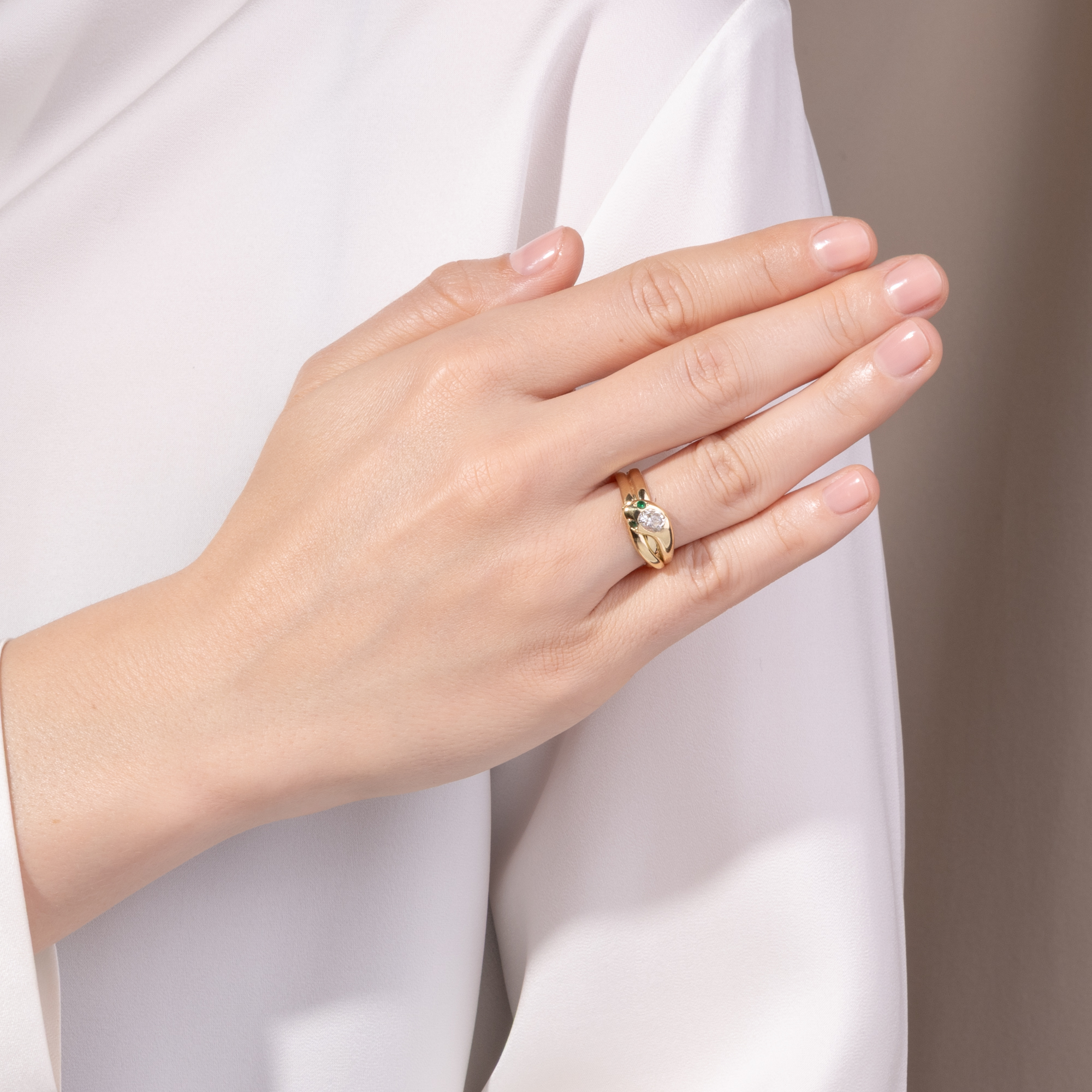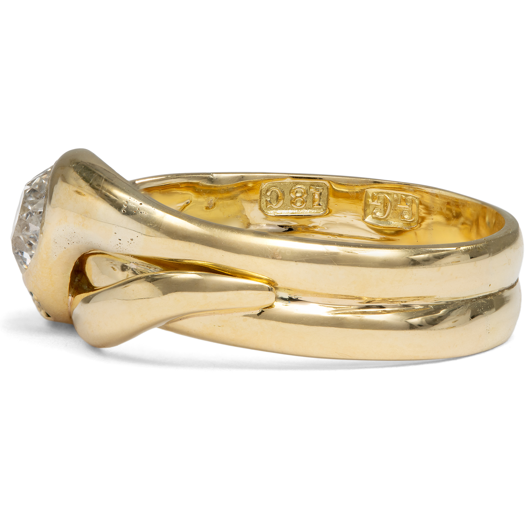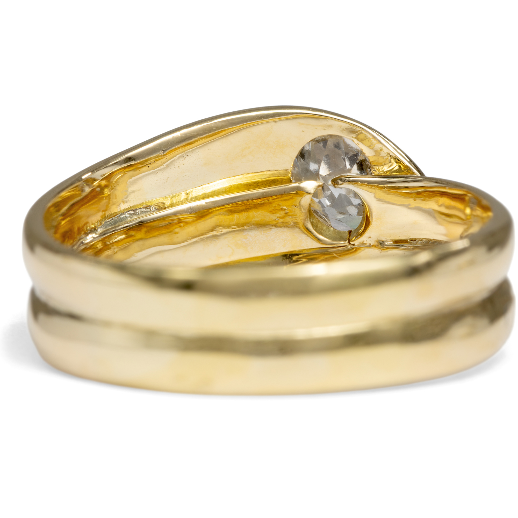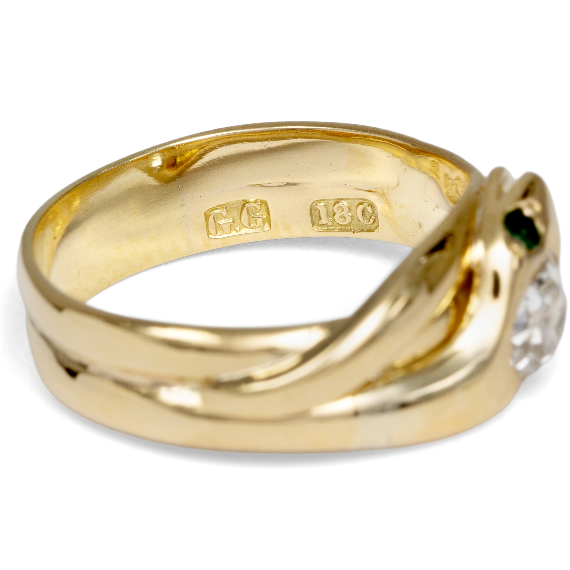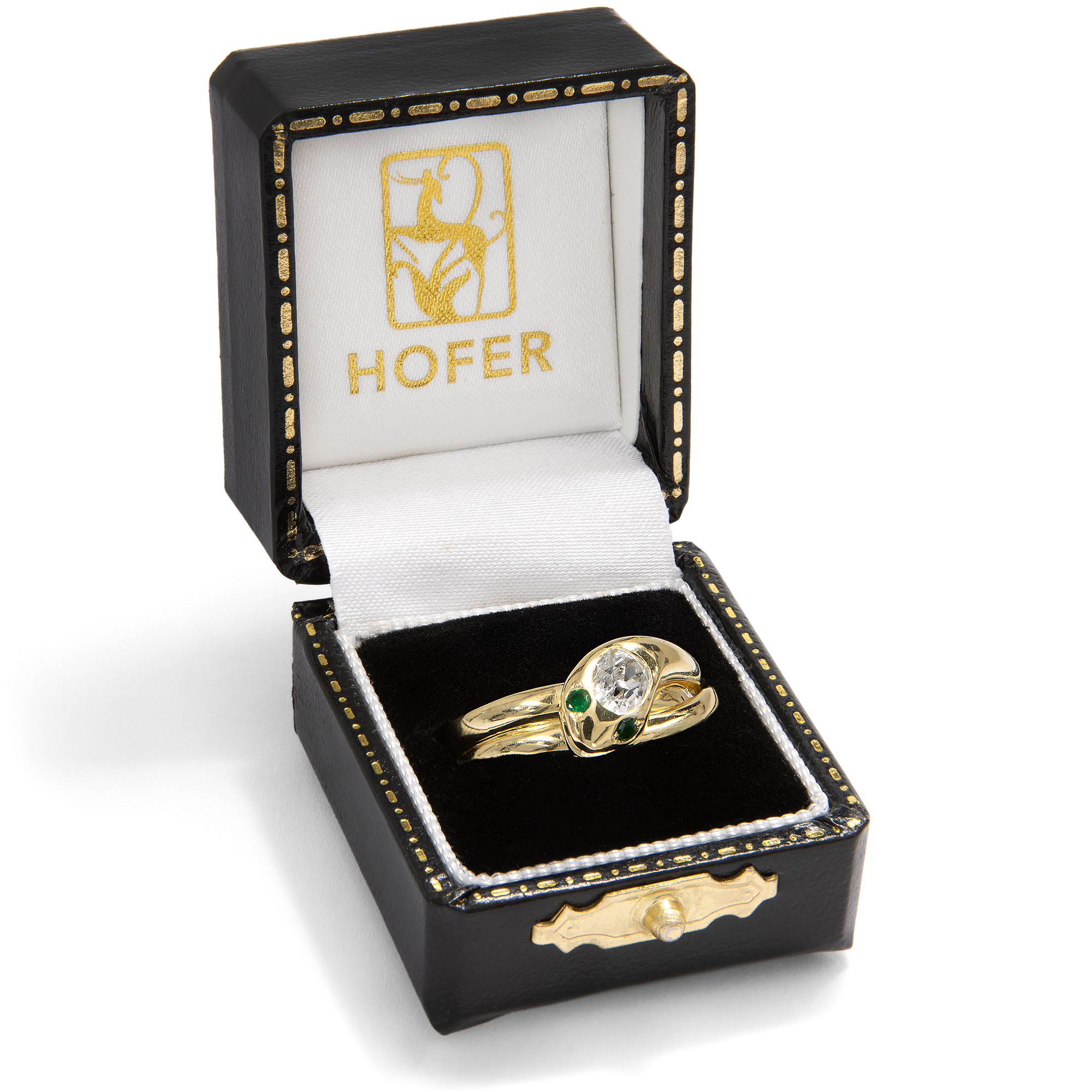 This ring made of warm, shiny gold is designed in the shape of a writhing snake. The head of the animal bears a beautiful, individually cut diamond in a slightly teardrop-shaped old cut, while the eyes of the snake are formed from emeralds. The ring motif of the snake is an ancient symbol of friendship and solidarity. This pictorial idea was already widespread in ancient Egypt; in Germany it experienced a heyday during the Biedermeier period and later flourished again in Art Nouveau. A famous historical example of this symbolism is Queen Victoria's engagement ring: in 1839, she received a snake ring with an emerald, her birthstone, from Prince Albert as a sign of eternal love and loyalty. Our piece also comes from England and was created around 1890. The diamond is white and shows some natural graphite inclusions, which attest to its authenticity; it weighs approximately 0.69 ct. We discovered the precious creeper in London.