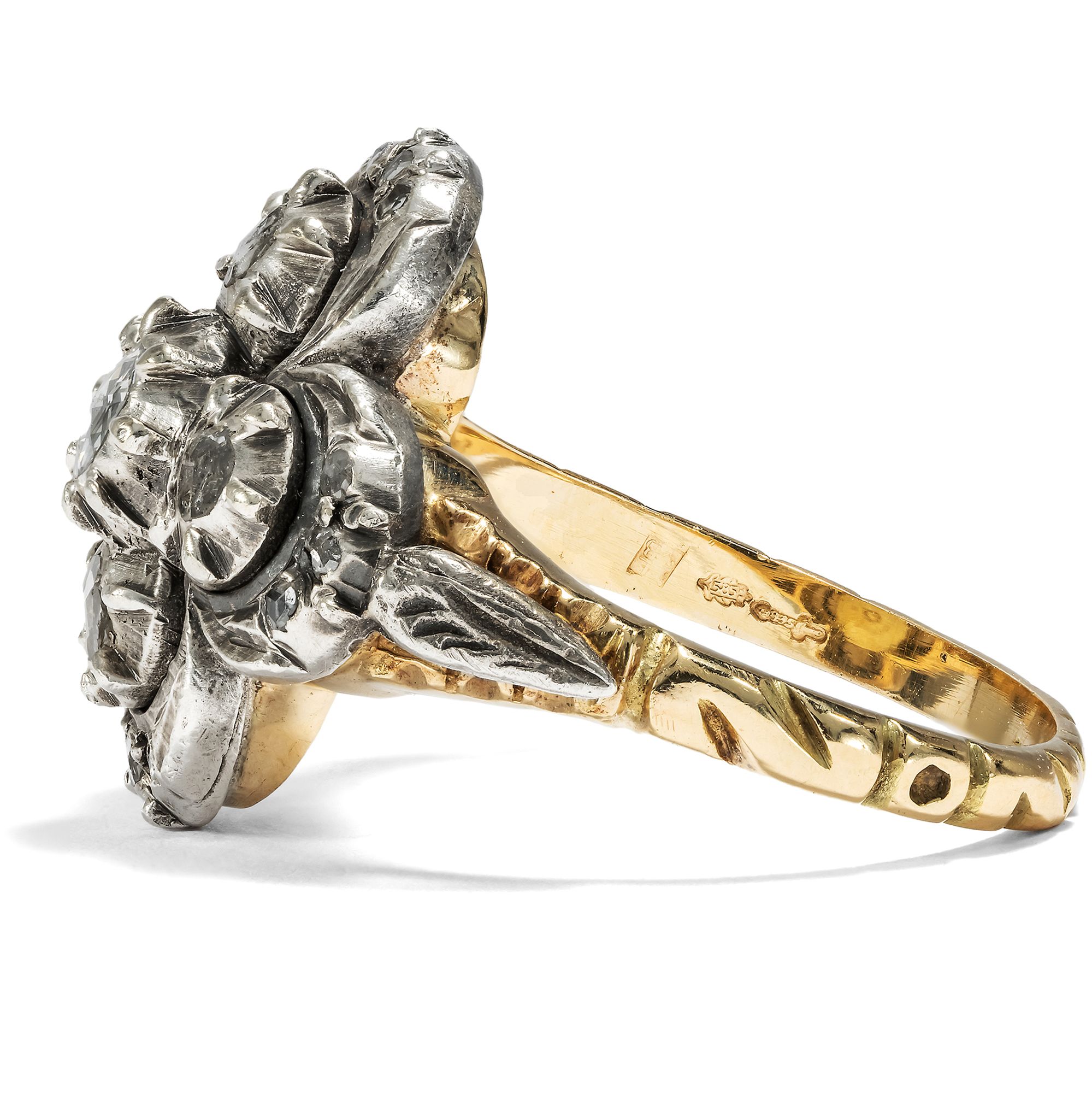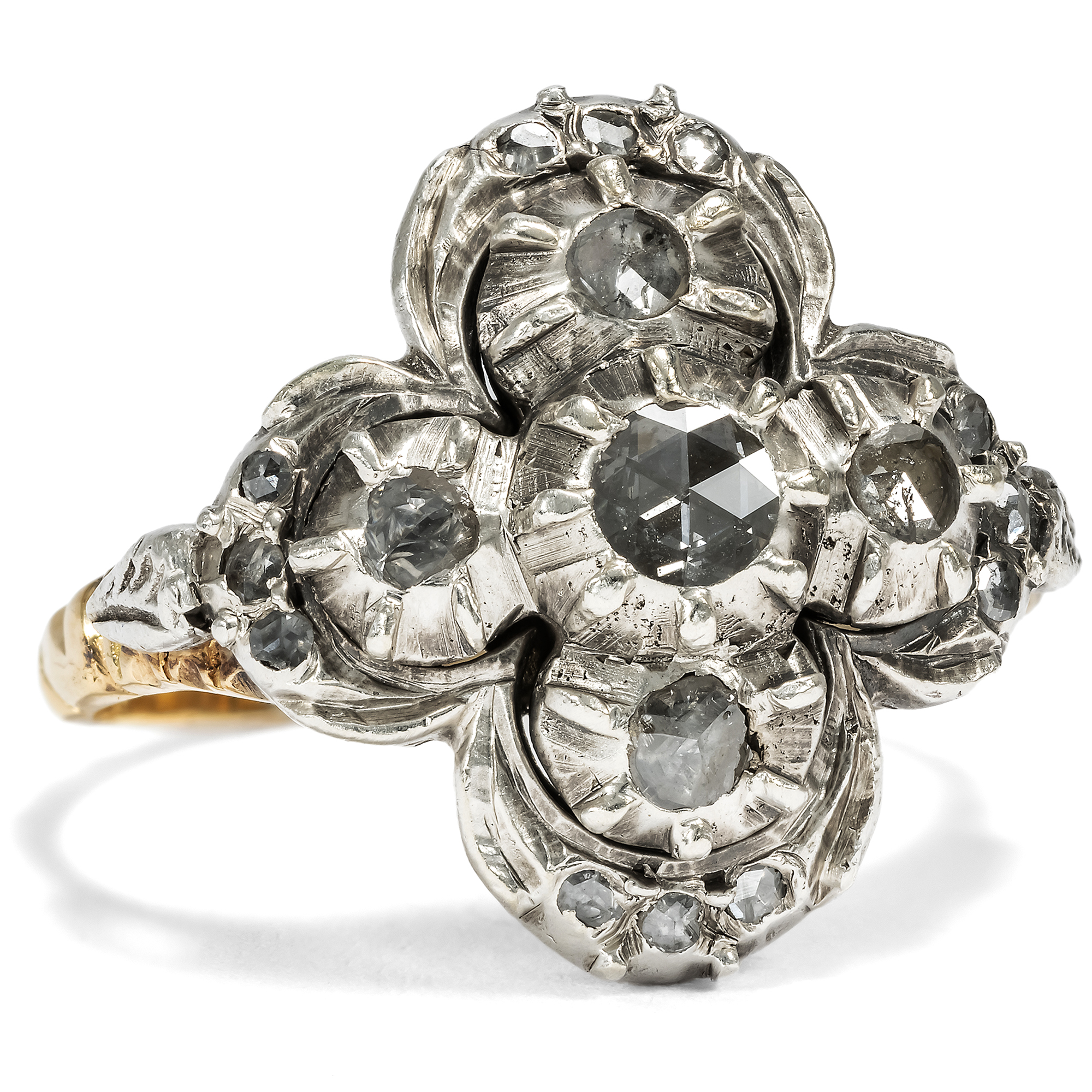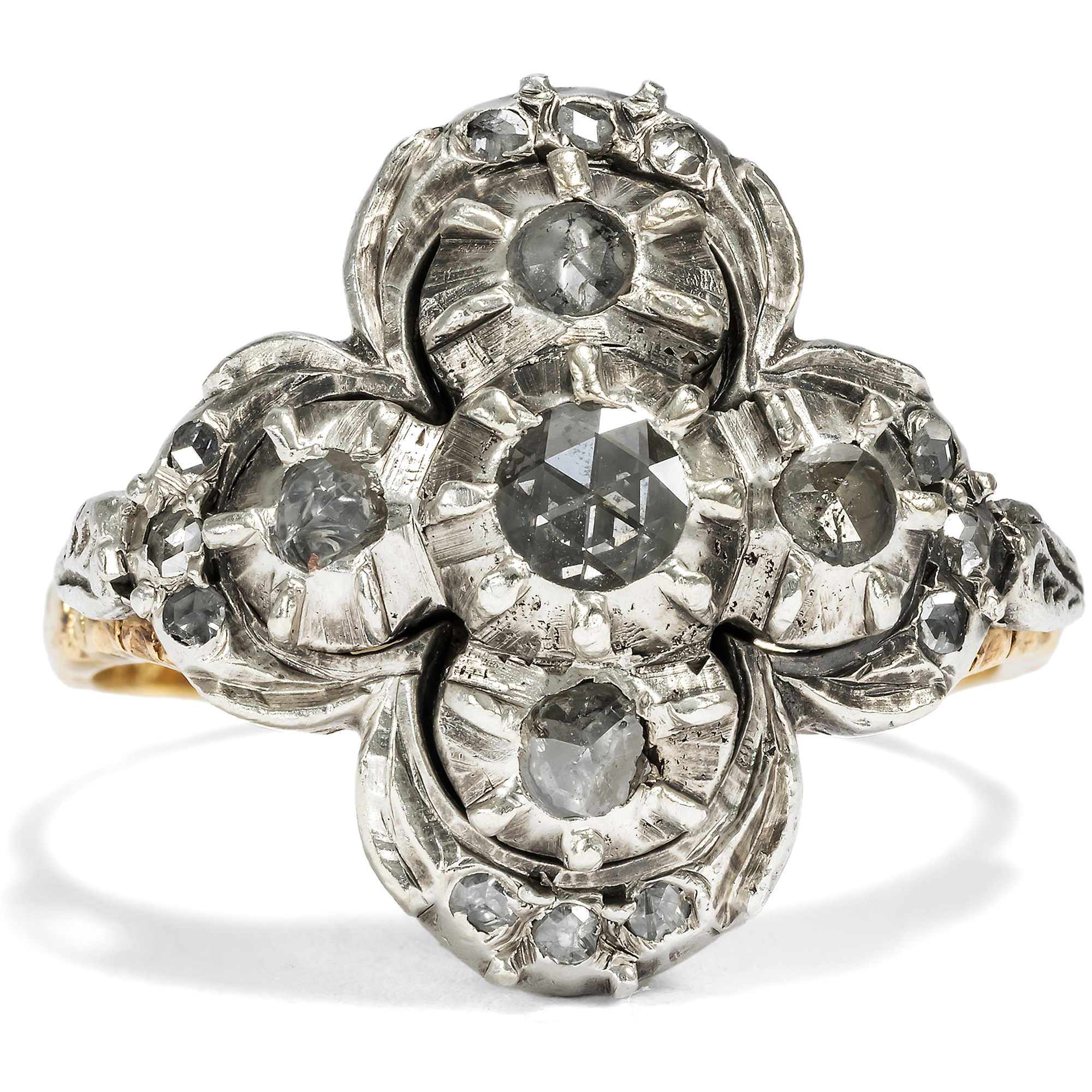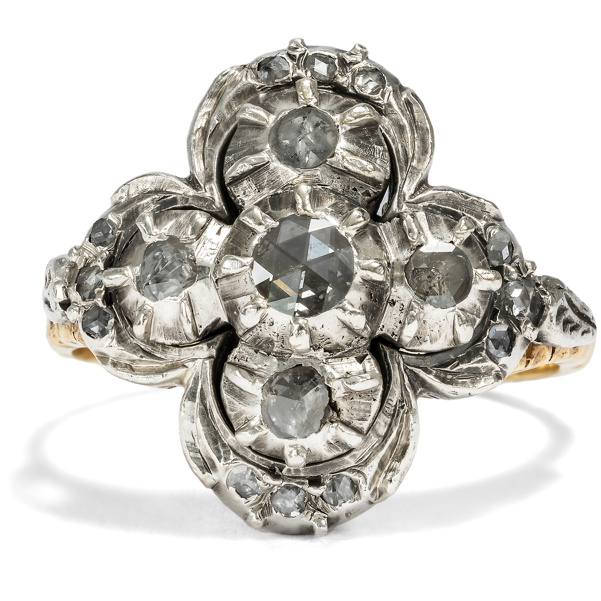 The city of Amsterdam was the centre of the global diamond trade for many centuries. The ships of the East India Company first brought the precious stones to the Netherlands from India, and from the 18th century onwards also from Brazil. In fact, all the diamonds from the Brazilian deposits discovered in 1725 were sold exclusively to Dutch traders! The constant influx of gemstones also fuelled the diamond cutters in Amsterdam and Antwerp. Numerous technical innovations were developed in the skilled workshops and traditional cut shapes were perfected. One speciality was the rose cut, which is still referred to today as the "Dutch rose cut". The soft lustre of the diamond rose makes it popular with many enthusiasts. This ring from the 1950s presents seventeen of these special gemstones and arranges them in a so-called quatrefoil. The gemstones shine in closed mirror settings made of silver. The undersides of the ring head and the ornamented rail, which come into contact with the skin, are made of gold and therefore do not discolour. The design language of the ring is inspired by 18th century models, whose nostalgic touch was particularly popular again in the post-war period. We discovered the ring in Amsterdam.