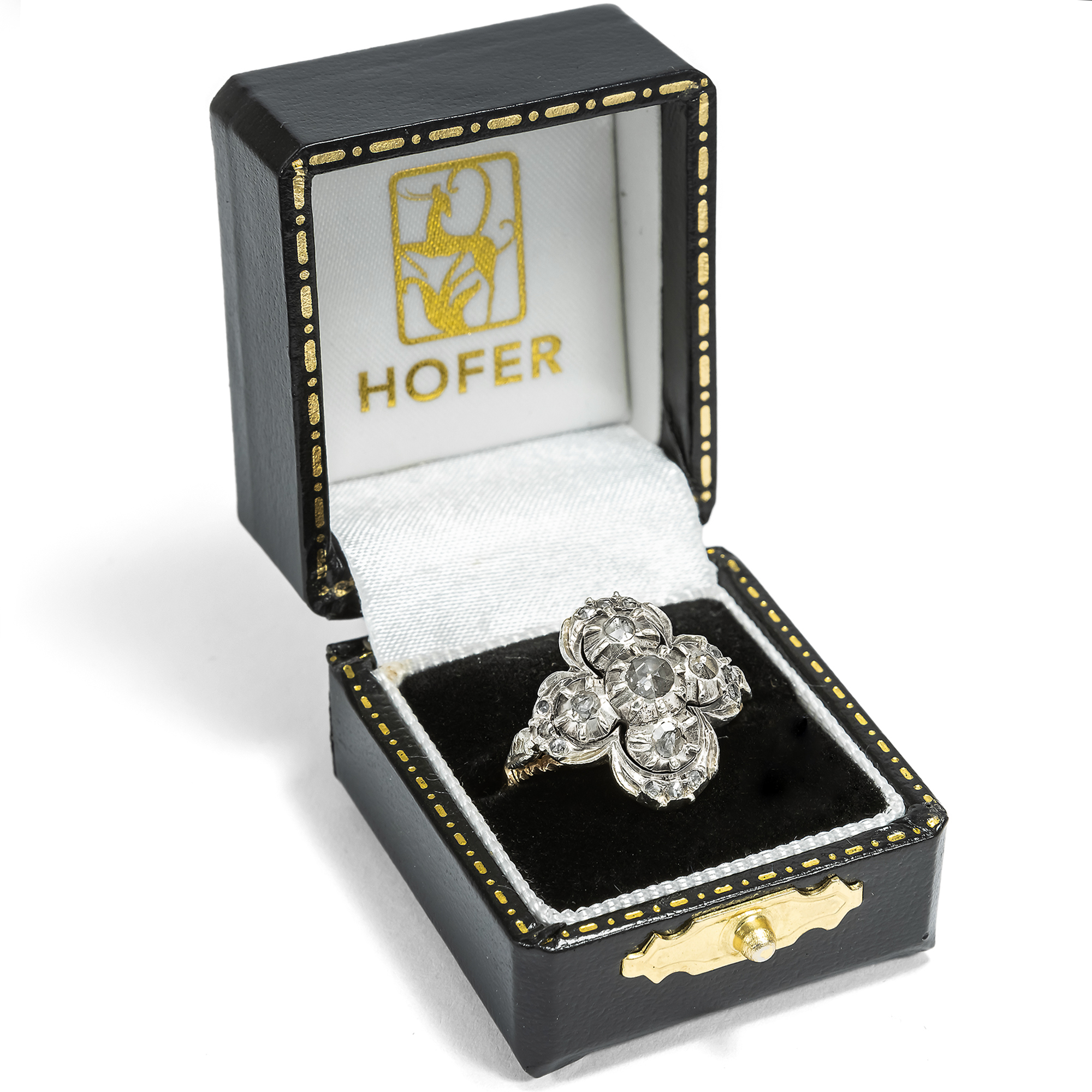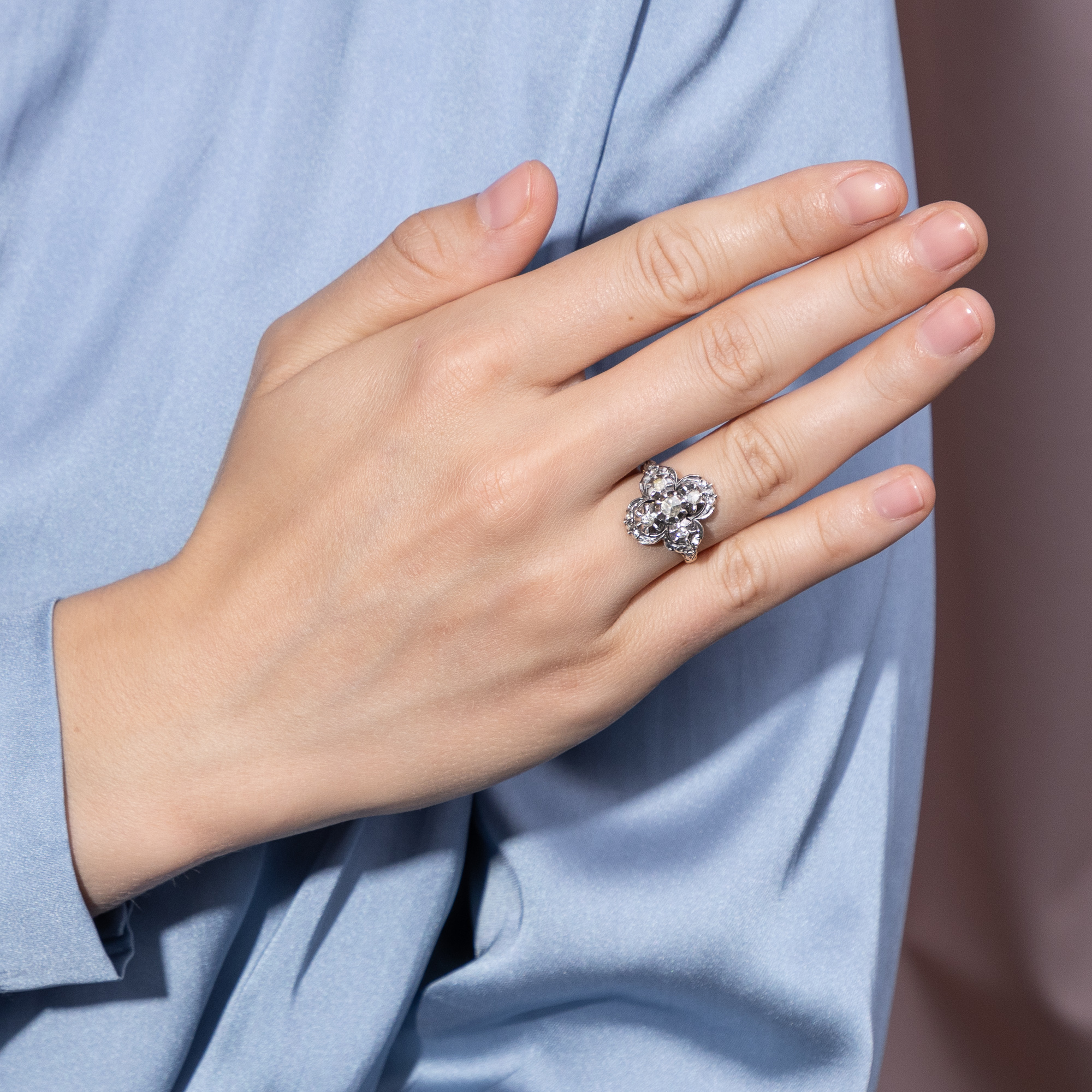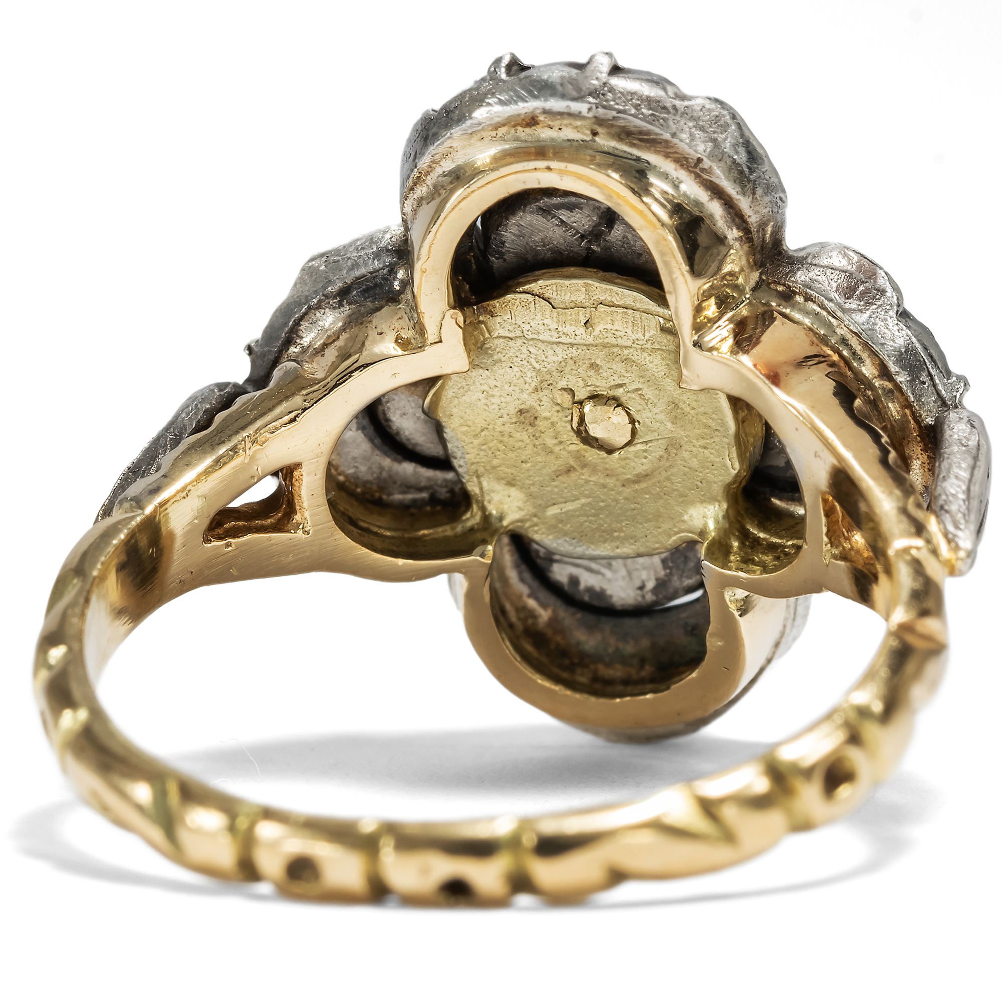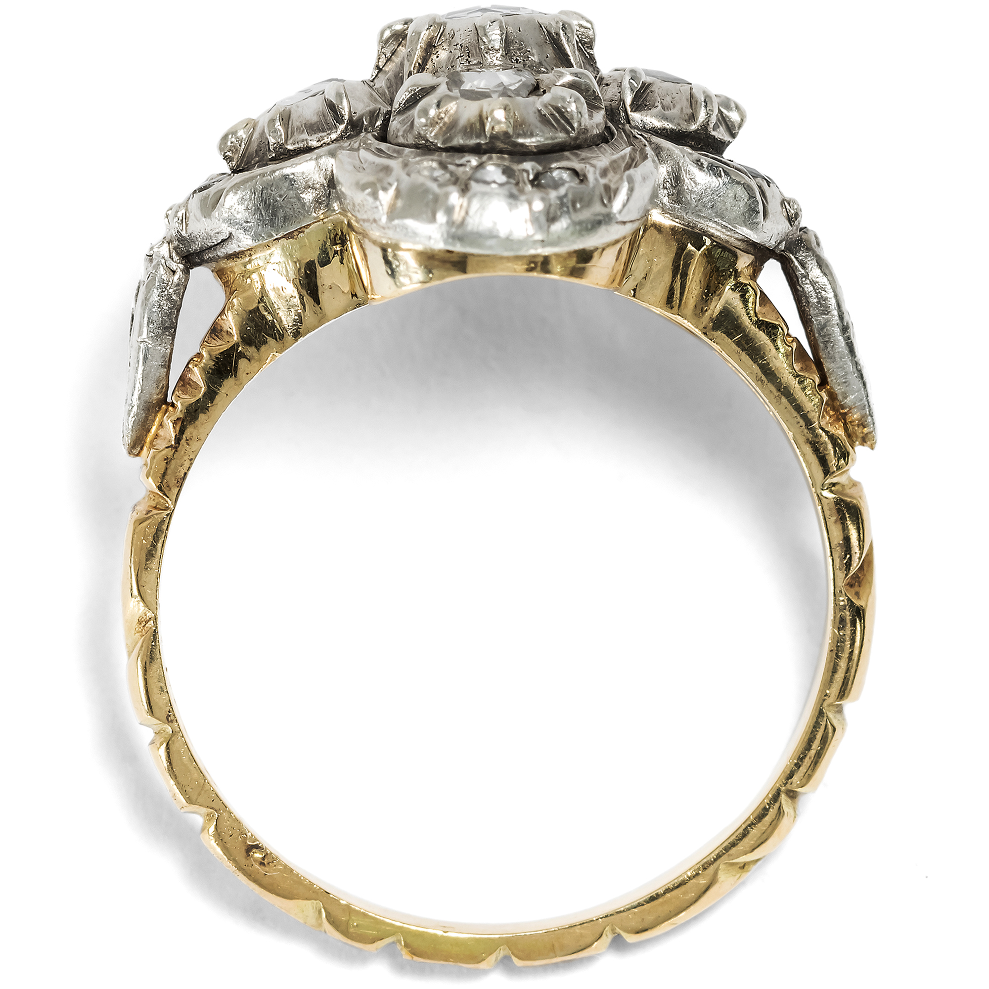 The city of Amsterdam was the centre of the global diamond trade for many centuries. The ships of the East India Company first brought the precious stones to the Netherlands from India, and from the 18th century onwards also from Brazil. In fact, all the diamonds from the Brazilian deposits discovered in 1725 were sold exclusively to Dutch traders! The constant influx of gemstones also fuelled the diamond cutters in Amsterdam and Antwerp. Numerous technical innovations were developed in the skilled workshops and traditional cut shapes were perfected. One speciality was the rose cut, which is still referred to today as the "Dutch rose cut". The soft lustre of the diamond rose makes it popular with many enthusiasts. This ring from the 1950s presents seventeen of these special gemstones and arranges them in a so-called quatrefoil. The gemstones shine in closed mirror settings made of silver. The undersides of the ring head and the ornamented rail, which come into contact with the skin, are made of gold and therefore do not discolour. The design language of the ring is inspired by 18th century models, whose nostalgic touch was particularly popular again in the post-war period. We discovered the ring in Amsterdam.