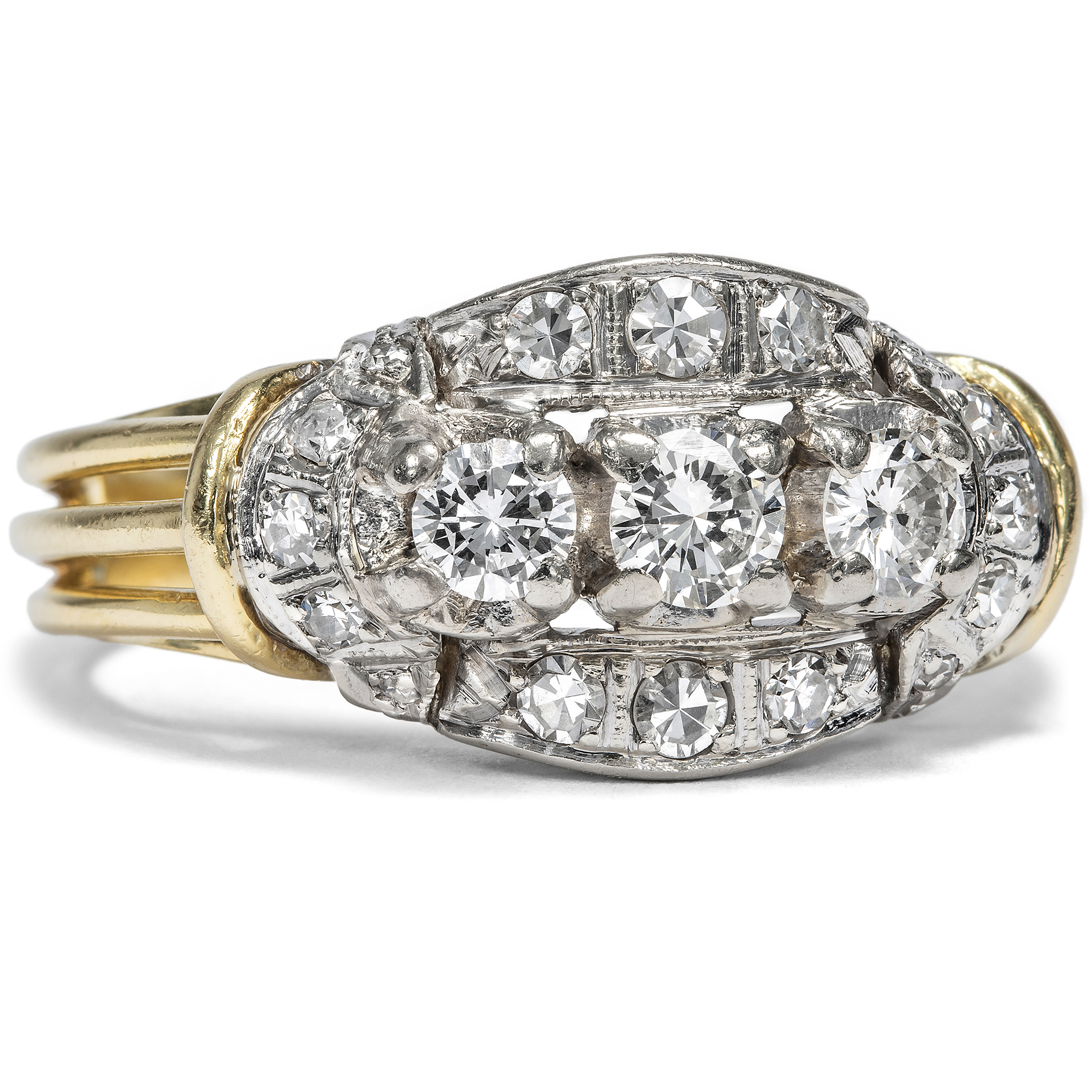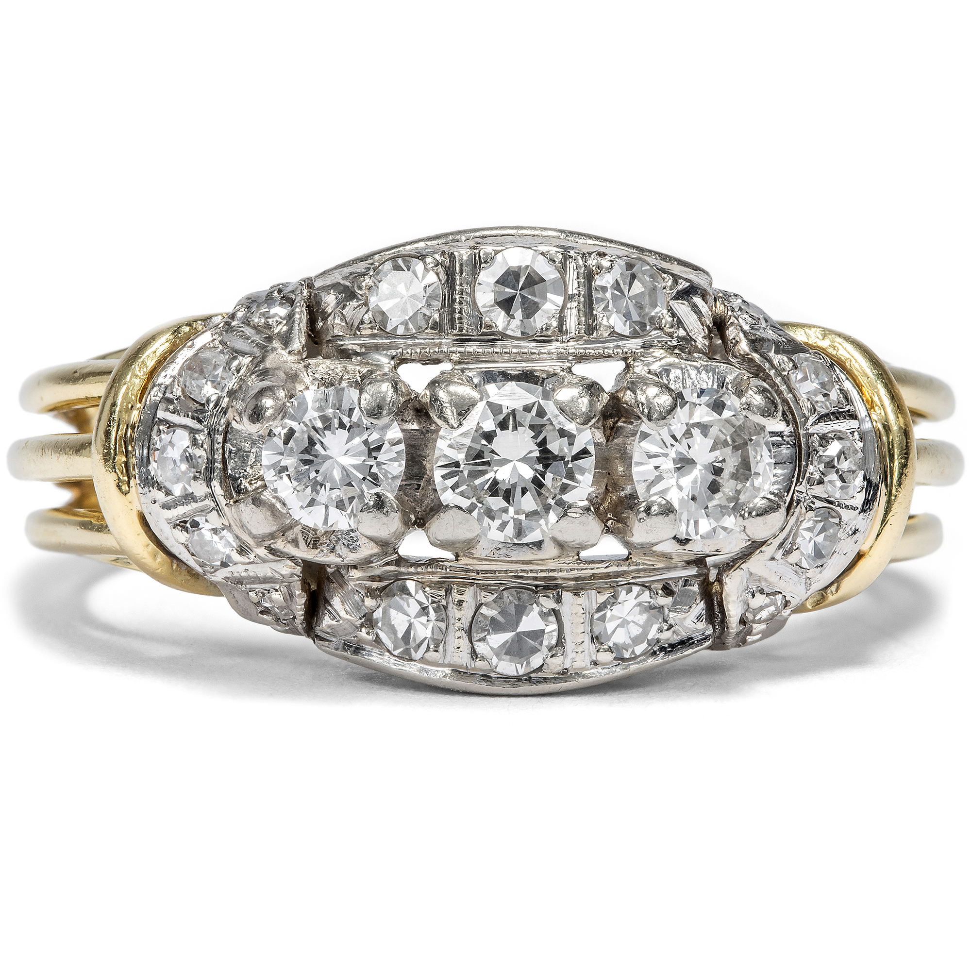 Like many pieces of jewellery from the 1950s and 1960s, this exquisite diamond ring still hints at the elegantly streamlined design language of the retro style that dominated the 1930s and 1940s. However, some details reveal that our ring was created in the post-war period. For example, the solid ring band and the overall lavish use of materials point to the later period of origin. A certain abstraction also hints at mid-century forms. The three-part yellow gold shank of the ring widens towards the top and holds a cross-mounted ring face made of white gold. In the center, we see a row of three white diamonds framed by sixteen smaller octagonal diamonds. A total of 0.74 ct of diamonds have been gathered on this high-quality goldsmith's work. According to the hallmark, the ring is the work of the goldsmiths Julius Graef and Co, which existed under the name "Graeco" in Idar-Oberstein until the 1990s. The ring is a fine example of how jewellery served to present the new joie de vivre to the outside world in the first two decades of the Federal Republic.