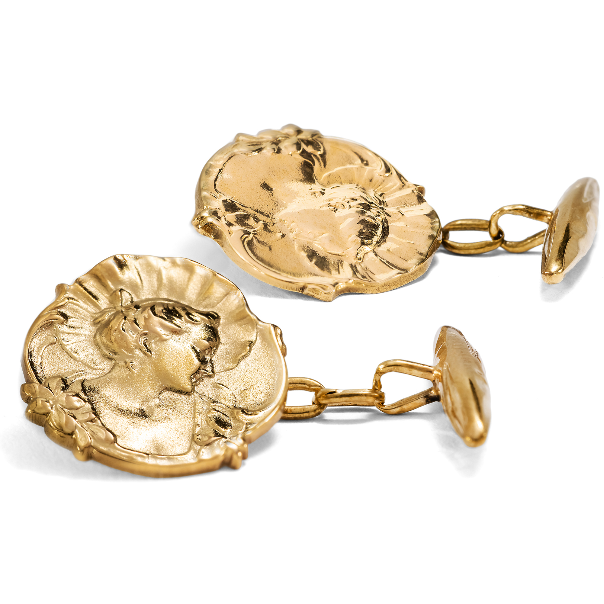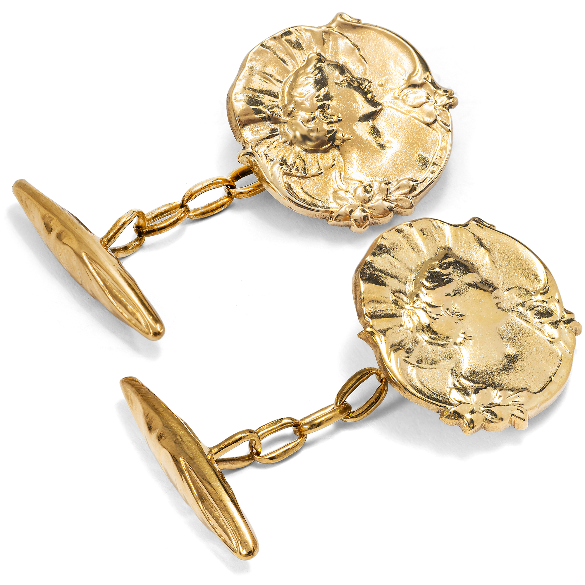 Vor allem in Frankreich, wo der Jugendstil als Art Nouveau bekannt ist, feierten die Gestalter die Schönheit der Frau in unzähligen Schmuckstücken. Ihre weichen Formen und das frei fließende Haar galten als Symbole von Jugend und Leben. Die vorliegenden Manschettenknöpfe aus Gold greifen dieses Motiv auf und interpretieren es auf phantasievolle Weise. Im Relief ist das Profil einer jungen Frau dargestellt, deren lockiges, üppiges Haar von einem großen Hut geschmückt wird. Dieser scheint sich in eine prachtvolle Blüte zu verwandeln – eine charakteristische Verschmelzung von Mensch und Natur, wie sie im Jugendstil häufig anzutreffen ist. Der verträumte Blick der Frau geht nach rechts unten und verliert sich in einem angedeuteten Hintergrund aus zarten Blättern. Der verlorene Ausdruck lädt den Betrachter ein, sich das Verborgene vorzustellen, das ihrem Blick zu folgen scheint. Die Manschettenknöpfe sind außergewöhnlich gut erhalten und strahlen noch heute wie zu ihrer Entstehungszeit. Kurze Kettchen verbinden die Knöpfe mit torpedoförmigen Knebeln und unterstreichen die kunstvolle Verarbeitung. Das Paar wurde in den Jahren um 1900 vermutlich in Breslau gefertigt und fand seinen Weg zu uns über Hamburg.