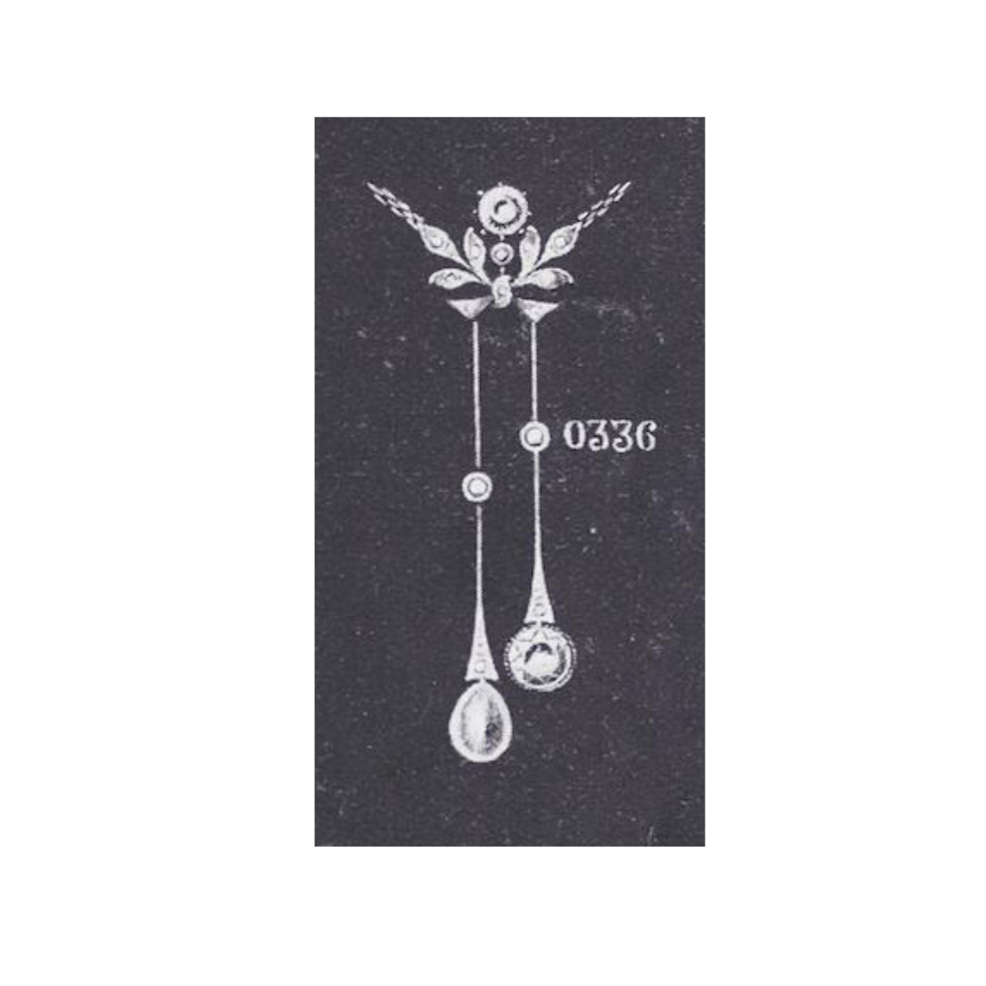 Lavallièren oder Negligé-Colliers waren eine beliebte Schmuckform des frühen 20. Jahrhunderts. Während man in den USA unter dem Namen Lavallière alle Colliers mit Anhängern an zarten Ketten verstand, bezeichnete dieser Begriff in Europa – insbesondere in Deutschland – eine spezifischere Form des Colliers: nämlich solche mit zwei ungleich langen Pendeln. Der Begriff „Négligé-Collier“ spielt auf die legere Eleganz eines solchen asymmetrischen Schmuckstücks an, denn er ist vom französischen Wort für „nachlässig“ abgeleitet. Wie auch immer man es nennen mag – das vorliegende Collier demonstriert eindrucksvoll die Eleganz eines solchen Schmuckstücks. In der Mitte einer Ankerkette aus Platin befindet sich ein kleiner Anhänger, den funkelnde Diamanten in kleinen Blättchen aus Platin zieren. Sie halten zarte Pendel, an deren Enden ein großer Diamant im kissenförmigen Altschliff und eine Blisterperle angebracht sind. Blisterperlen sind in der Muschelschale angewachsene Perlen. Sie werden auf einem Stück Perlmutt montiert und wirken in der Aufsicht wie eine vollrunde Perle. In Schmuck des frühen 20. Jahrhunderts verwendete man sie gern, denn Perlen waren vor der Erfindung der Perlenzucht mitunter so teuer wie gleichgroße Diamanten. Interessant ist auch der große Diamant im anderen Pendel. Er wiegt beinahe ein Karat und besitzt eine deutlich wahrnehmbare, hellgelbe Farbe: Das Collier variiert so verschiedene Tönungen, von dem hellen Weiß der kleinen Diamanten und des Platins über den Cremeton der beiden Perlen hin zum warmen Gelb des großen Diamanten. Das Schmuckstück besitzt dadurch eine gewisse Wärme, trotz des kühlen, eleganten Looks. Wir haben das Collier hier in Berlin ankaufen können. Das Modell befand sich um 1908 in der Offerte des Hanauer Juweliers W. Behrens, siehe letzte Abb. Die kleinen Abweichungen lassen sich dadurch erklären, dass nicht alle Naturperlen gleich sind – und dass Diamanten oftmals von den Kundinnen eingesendet wurden, um Steine aus Erbstücken neu verwenden zu lassen. Dies scheint auch hier der Fall zu sein, denn der große Diamant hat jenen Schliff und jene Tönung, wie sie eher im letzten Drittel des 19. Jahrhundert zu finden waren.