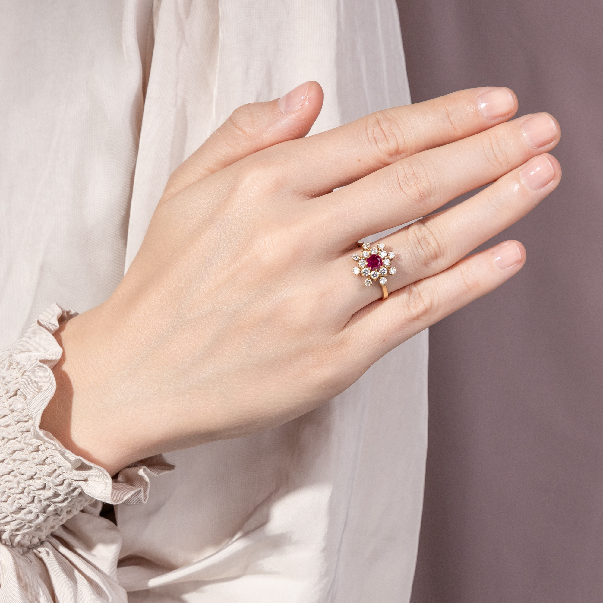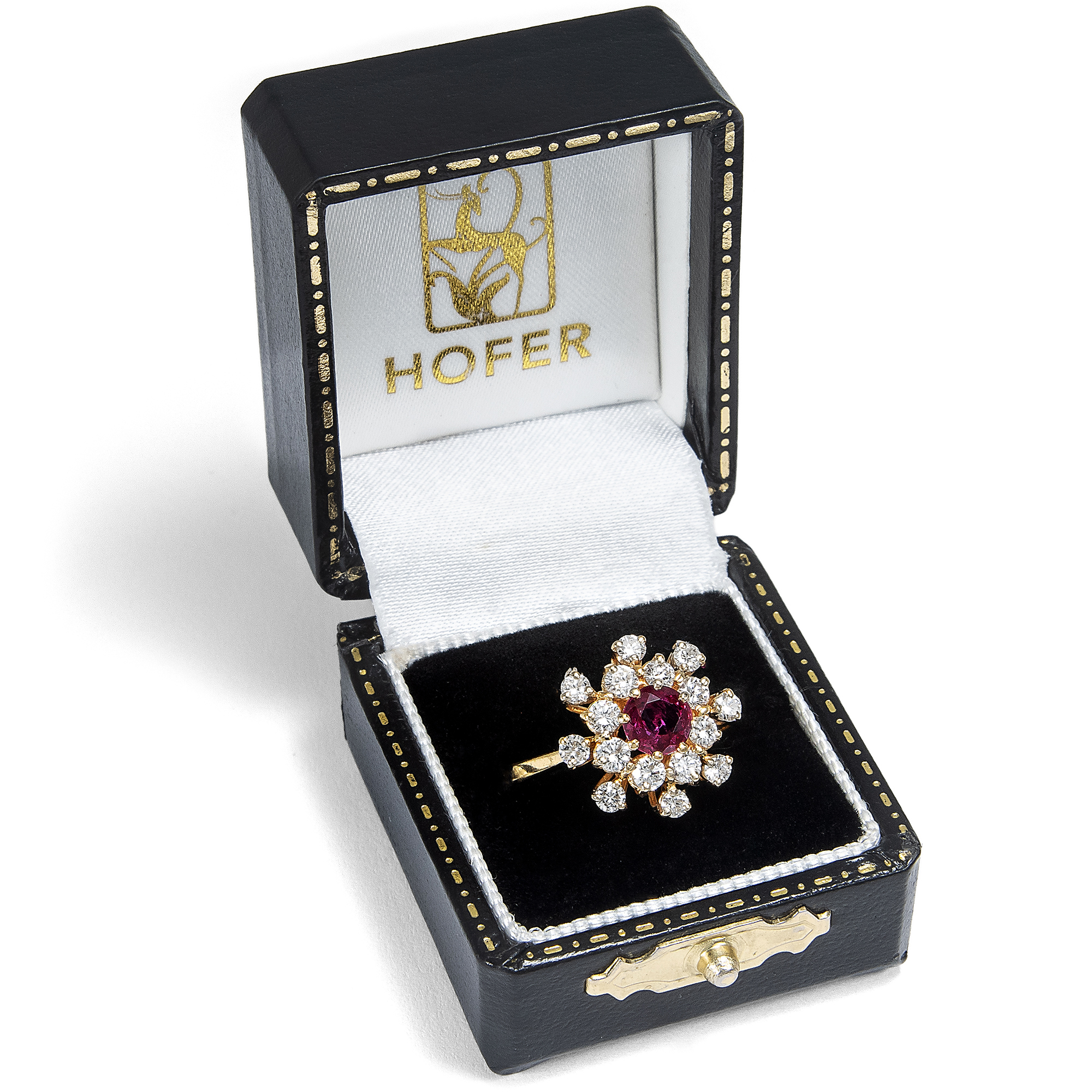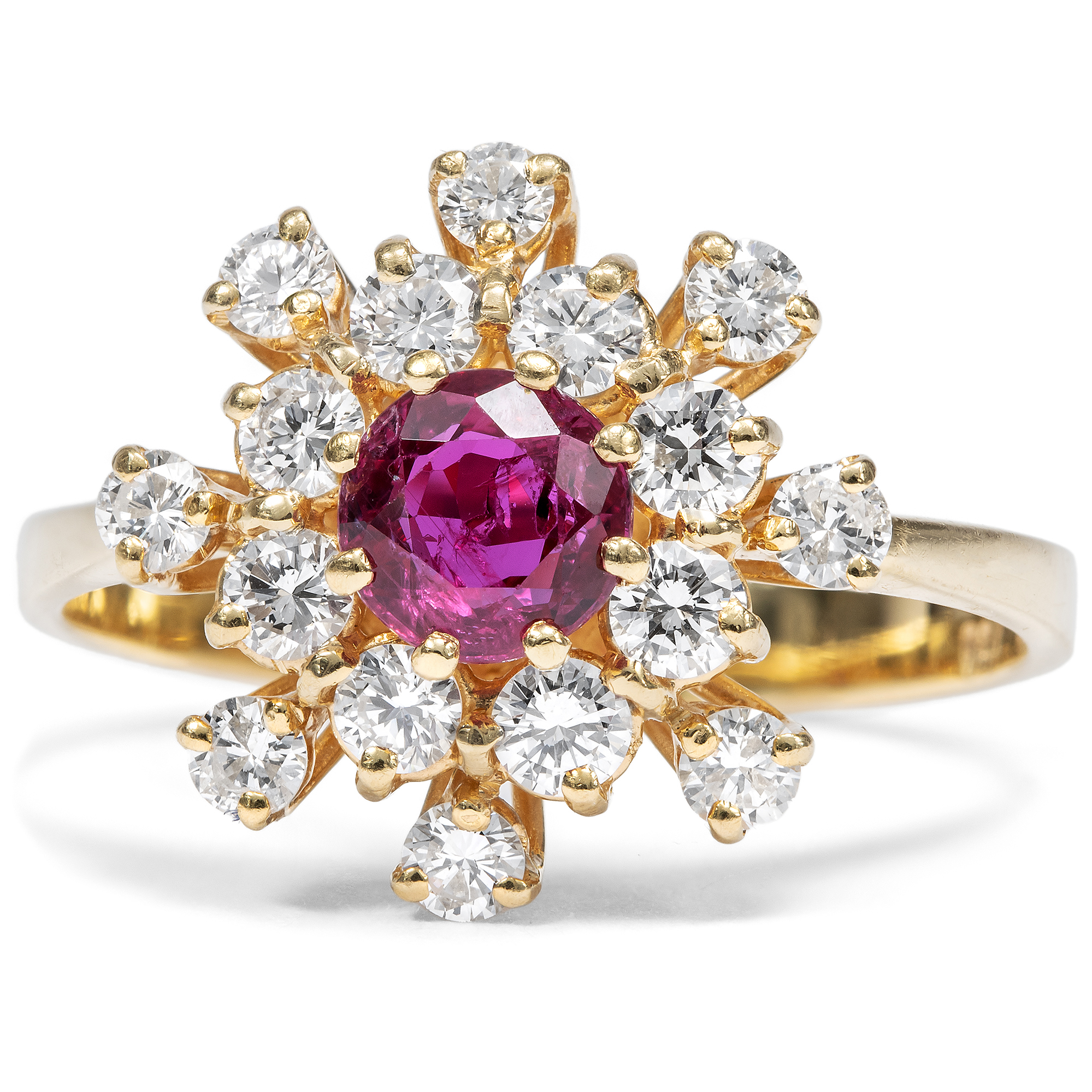 Die meisten der noch heute beliebten Ringformen fanden zur Jahrhundertwende um 1900 ihre schönste Blüte. Der „Toi-et-Moi“-Ring, der Duchesse- und der Marquise-Ring sowie schließlich der Entourage-Ring gehören zu diesen beliebten Klassikern. Vor allem der Entourage-Ring – also ein Ring mit einem großen Farbstein in der Mitte, gerahmt von funkelnden Diamanten – ist seitdem nie aus der Mode gekommen und wurde in den darauffolgenden Generationen unzählige Male variiert. Der hier vorliegende, in den letzten Jahren entstandene Ring folgt dieser klassischen Form – und variiert sie zugleich auf ganz besondere Weise. In seiner Mitte präsentiert der Entwurf einen leuchtend roten Rubin. Der Edelstein mit etwa 0,68 ct Gewicht zeigt einige natürliche Einschlüsse als Beleg seiner Echtheit, und seine Farbe ist lebhaft und intensiv. Gerahmt wird der Stein von sechzehn Diamanten im Brillantschliff, die zusammen rund 0,80 ct auf die Waage bringen. Die Diamanten rahmen den Rubin dabei jedoch nicht einfach nur: Sie bilden zugleich einen funkelnden Eiskristall, eine Schneeflocke, die in schönstem, hellen Weiß funkelt und strahlt. Im Gegensatz zu den meisten modernen Entourage-Ringen, die aus Weißgold gefertigt sind, wurde für diesen Ring hochkarätiges Gelbgold verwendet. Dadurch wirkt er warm und besitzt eine romantische Note, auch wenn die Ringschiene durchaus grafisch und klar entworfen ist. Schön ist zudem, dass der Ring, obwohl nicht klein, nicht zu hoch auf dem Finger liegt. Zu uns fand der sehr gut erhaltene Ring aus dem Rheinland.