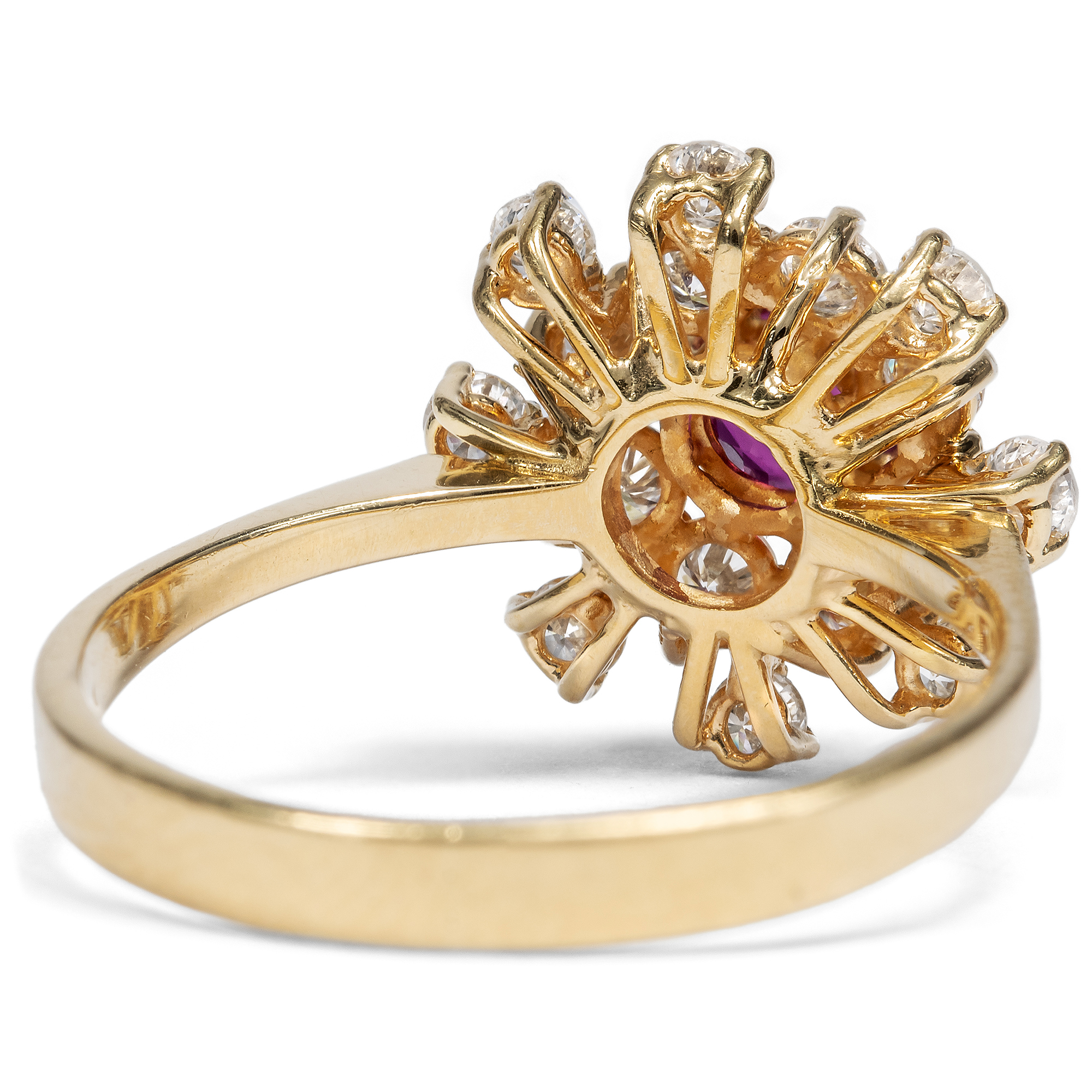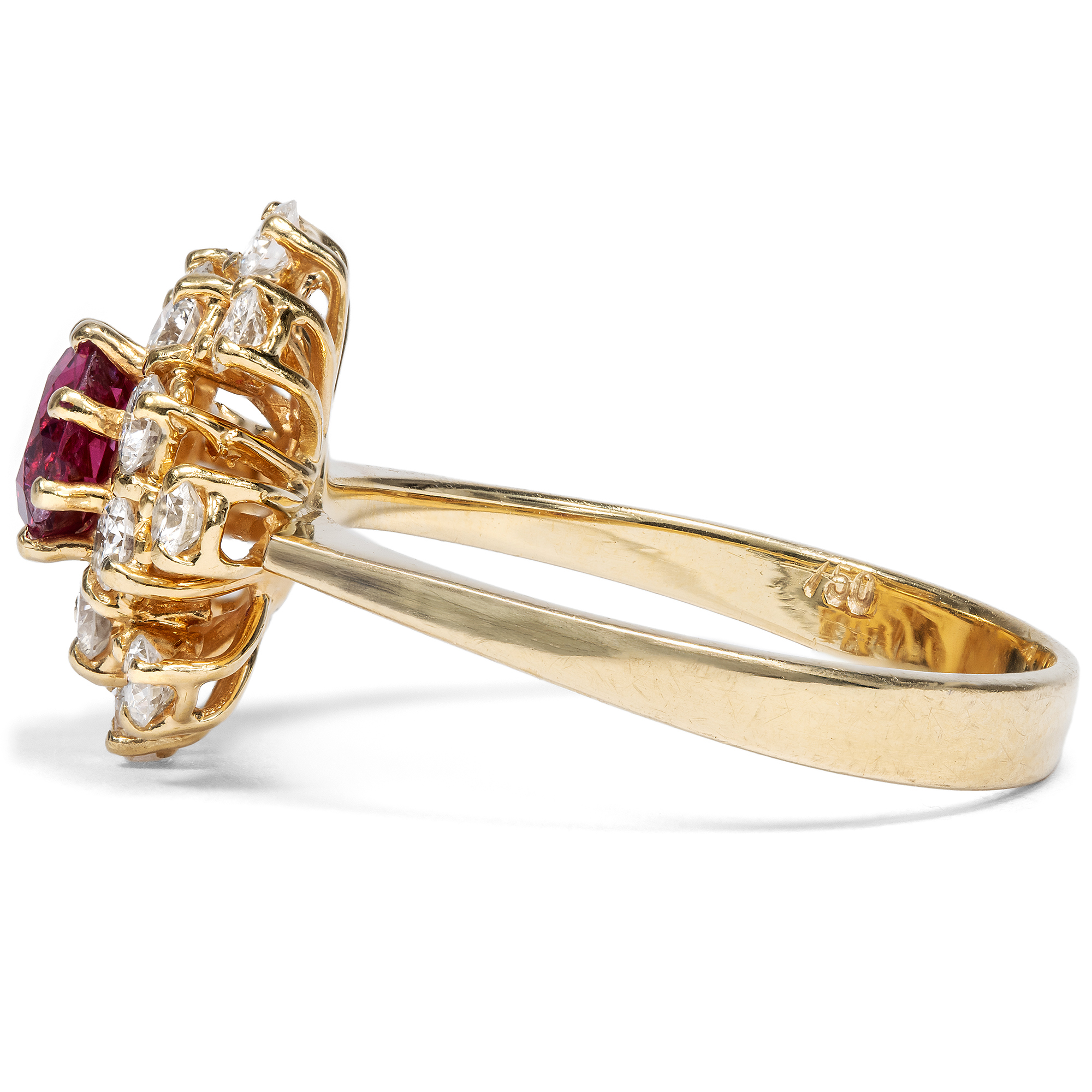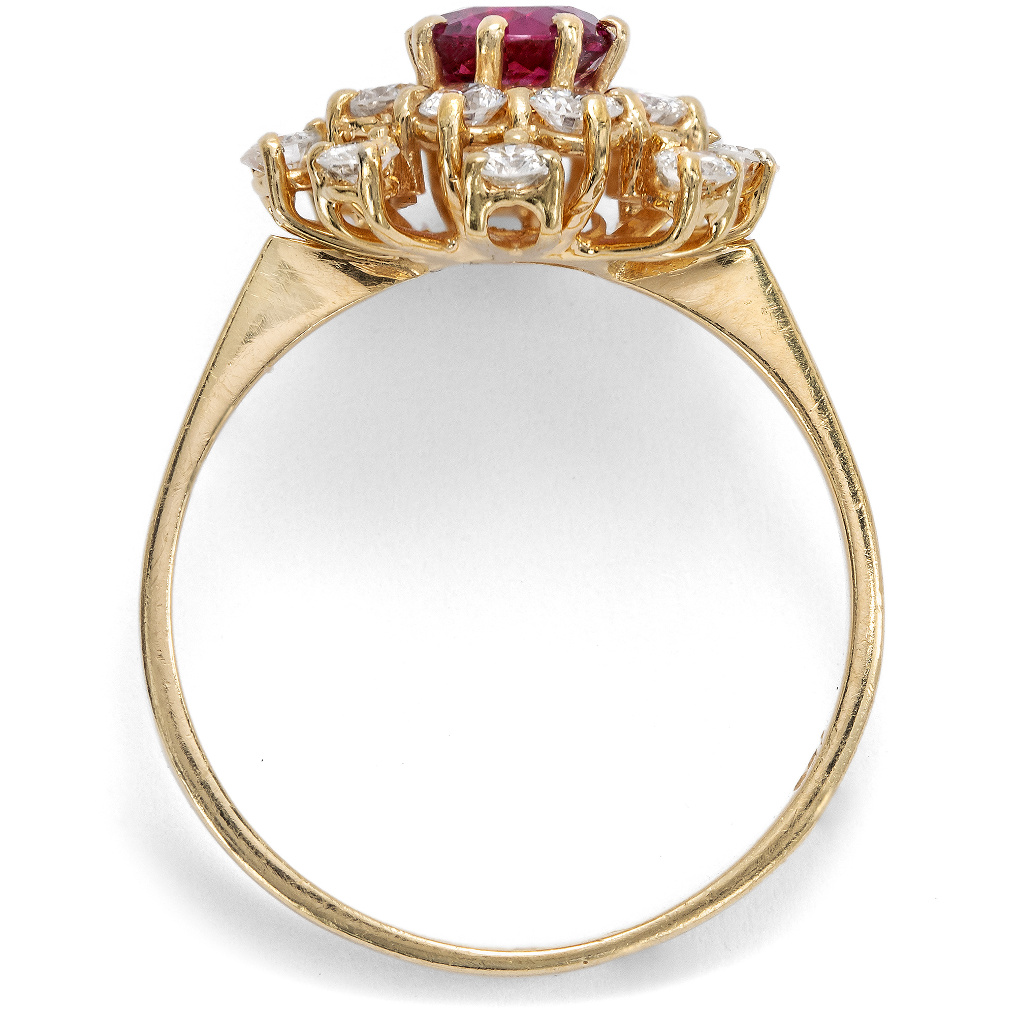 Die meisten der noch heute beliebten Ringformen fanden zur Jahrhundertwende um 1900 ihre schönste Blüte. Der „Toi-et-Moi“-Ring, der Duchesse- und der Marquise-Ring sowie schließlich der Entourage-Ring gehören zu diesen beliebten Klassikern. Vor allem der Entourage-Ring – also ein Ring mit einem großen Farbstein in der Mitte, gerahmt von funkelnden Diamanten – ist seitdem nie aus der Mode gekommen und wurde in den darauffolgenden Generationen unzählige Male variiert. Der hier vorliegende, in den letzten Jahren entstandene Ring folgt dieser klassischen Form – und variiert sie zugleich auf ganz besondere Weise. In seiner Mitte präsentiert der Entwurf einen leuchtend roten Rubin. Der Edelstein mit etwa 0,68 ct Gewicht zeigt einige natürliche Einschlüsse als Beleg seiner Echtheit, und seine Farbe ist lebhaft und intensiv. Gerahmt wird der Stein von sechzehn Diamanten im Brillantschliff, die zusammen rund 0,80 ct auf die Waage bringen. Die Diamanten rahmen den Rubin dabei jedoch nicht einfach nur: Sie bilden zugleich einen funkelnden Eiskristall, eine Schneeflocke, die in schönstem, hellen Weiß funkelt und strahlt. Im Gegensatz zu den meisten modernen Entourage-Ringen, die aus Weißgold gefertigt sind, wurde für diesen Ring hochkarätiges Gelbgold verwendet. Dadurch wirkt er warm und besitzt eine romantische Note, auch wenn die Ringschiene durchaus grafisch und klar entworfen ist. Schön ist zudem, dass der Ring, obwohl nicht klein, nicht zu hoch auf dem Finger liegt. Zu uns fand der sehr gut erhaltene Ring aus dem Rheinland.