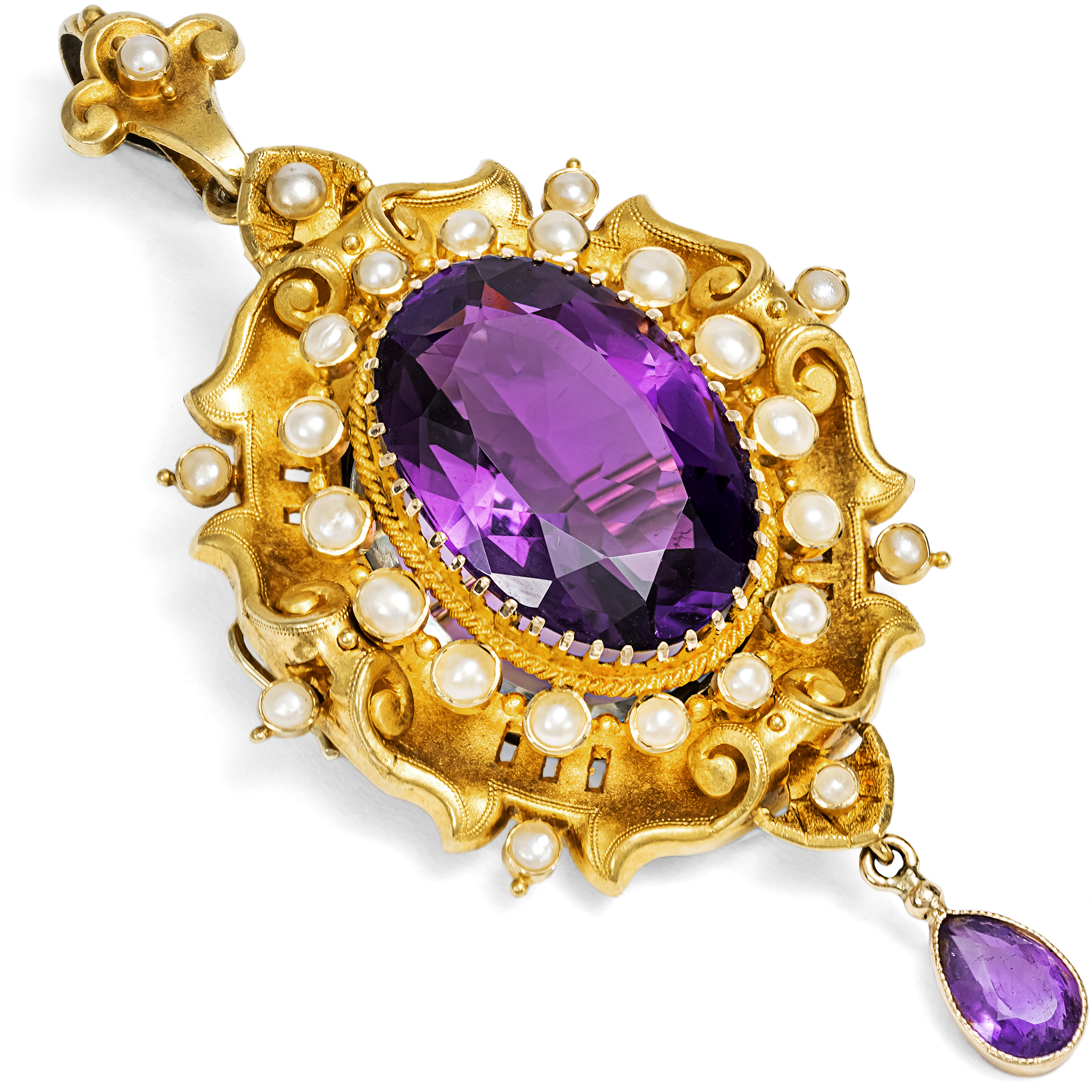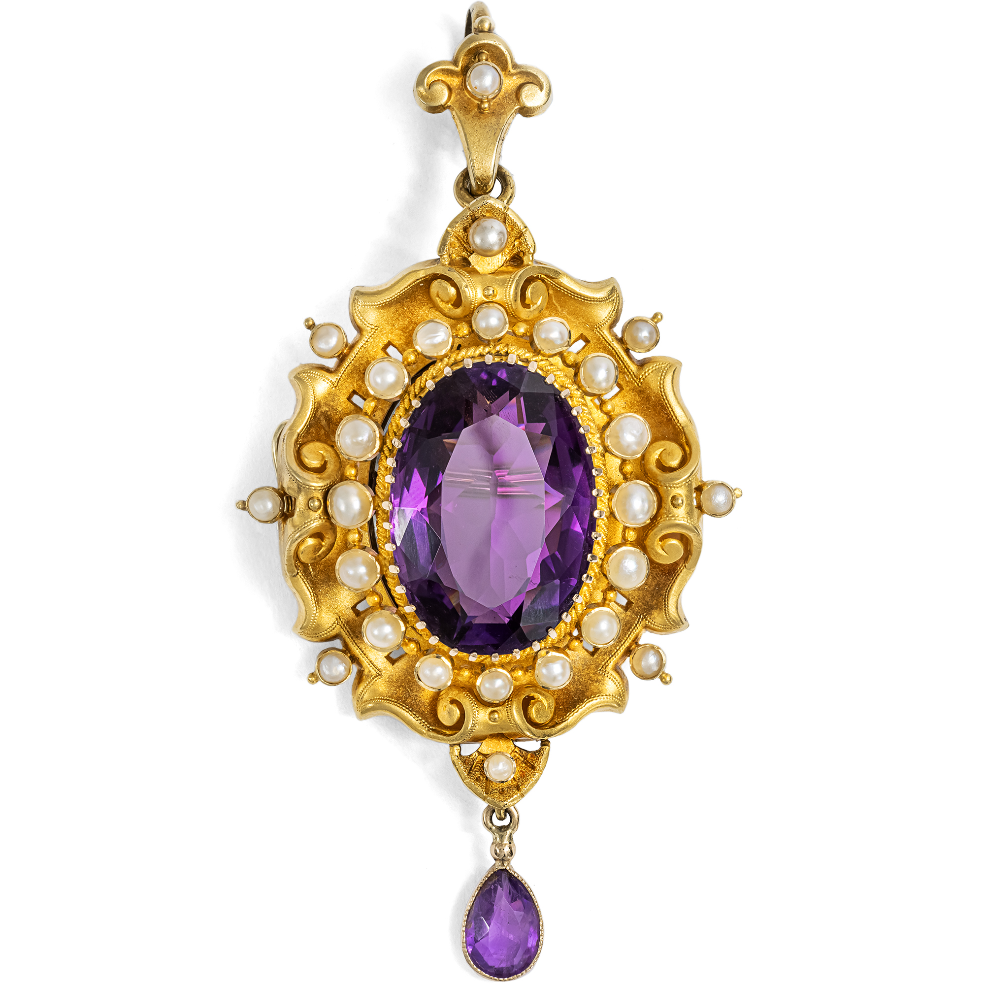 Ein tiefvioletter Amethyst schimmert geheimnisvoll im Zentrum einer Komposition aus samtig mattiertem Gold. Das Gold bildet eigenwillige Schwünge und Voluten aus, formt muschelartige Elemente, welche von kleinen Perlen ergänzt werden. Unterhalb pendelt ein weiterer Amethyst in Tropfenform. Nach oben hin wird der Entwurf von einer lilienförmigen Anhängerschlaufe komplettiert. Es ist die gesamte Opulenz des eklektischen Historismus der 1880er Jahre, die hier ihre Pracht entfaltet. Tatsächlich ist das Medaillon so auffällig gestaltet, dass man kaum annehmen mag, dass es ein Geheimnis hüten kann. Doch hinter dem zentralen Amethyst befindet sich ein Medaillonfach, das auf der Rückseite aufgeklappt werden kann. Besonders reizvoll ist, dass der im Inneren gehütete Schatz – ob Foto, Haarlocke oder Briefchen – dann leicht durch den Amethyst hindurchschimmert: sichtbar, doch unauffällig, nur für Eingeweihte bemerkbar. Wie so viele Schmuckstücke jener Epoche lässt sich auch diese Arbeit auf zweierlei Weise tragen. Soll es als Brosche dienen, so lässt sich die Schlaufe aushaken und die Öse einklappen. Als Anhänger wiederum lässt sich die Nadel abnehmen. Ein wirklich wunderbares Medaillon, das so detailverliebt ist, wie man es sich von einem antiken Schmuckstück nur wünschen kann.