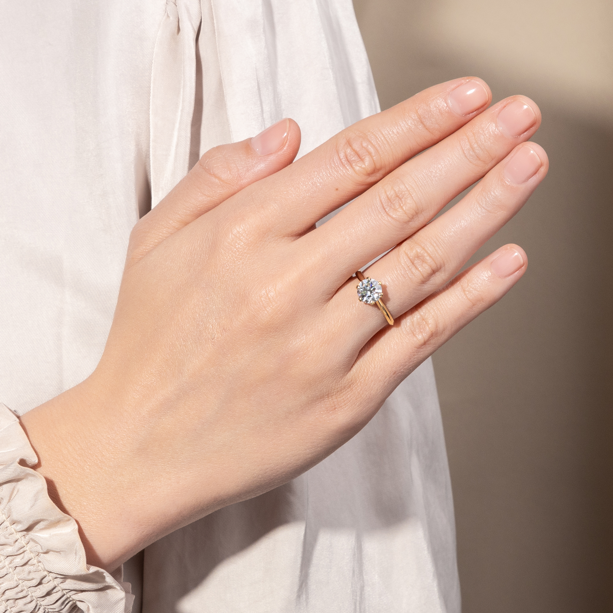 Schon seit dem späten Mittelalter ist der Brauch bezeugt, zur Verlobung einen Diamantring zu überreichen. Allerdings war dieser härteste aller Edelsteine eine ausgesprochene Kostbarkeit und beinahe ausschließliches Privileg des Adels. Erst nachdem im späten 19. Jahrhundert ergiebige Vorkommen in Südafrika entdeckt worden waren, konnten sich auch breitere Schichten Diamantschmuck leisten. Der klassische Solitärring, also ein Ring mit nur einem Diamanten, soll auf einen Entwurf des berühmten Juweliers Tiffany & Co. aus dem Jahr 1886 zurückgehen. Bis heute ist diese Form des Ringes der Inbegriff des Verlobungsringes geblieben: In ihm bündelt sich alle Zeichenhaftigkeit, die man von einem Schmuckstück erwarten kann, dem ein Versprechen zugrunde liegt. Ein solcher Solitärring ist auf unseren Auftrag hin hier in Berlin entstanden. In seiner Mitte präsentiert er einen funkelnden Diamanten im Brillantschliff von 1,60 Karat Gewicht. Der Diamant ist leicht warm getönt in der Farbstufe „Leicht getöntes Weiß+ (Top Crystal, I)“ und überzeugt mit sehr guter Reinheit „VVS2“ und sehr gutem Brillanzgrad. In seiner Fassung aus Gelbgold wirkt der Stein makellos weiß. Der Ring wurde bewusst nachhaltig hergestellt. Der Diamant ist ein Vintage-Stein der 1960er-Jahre, der hier in Zweitverwendung eingesetzt ist. Er stammt aus einer Brosche, die wir leider nicht mehr restaurieren konnten. Auch das Gold stammt aus Vintage-Schmuckstücken. Zwei unabhängige Gutachten über die Qualität des Diamanten liegen dem Ring bei.