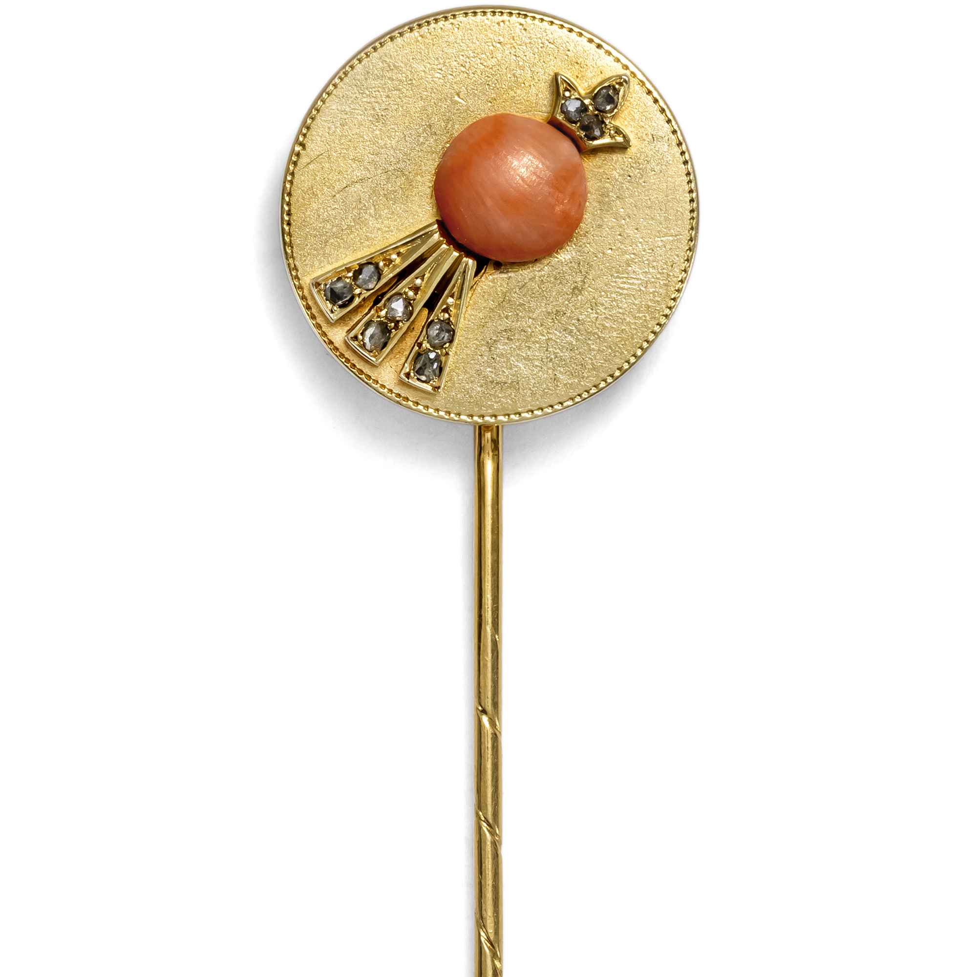 „Ohne Krawattennadel bin ich nicht angezogen“ lautete ein Ausspruch von Karl Lagerfeld, der in Modedingen bekanntermaßen einen besonderen Spürsinn hatte. Als stilvolles Accessoire können schmückende Nadeln egal ob auf einem heute selten gewordenen Plastron, einer Krawatte oder dem Revers einen modischen Akzent setzten und als Distinktionsmerkmal für den Herrn von Welt genutzt werden. Besonders freuen wir uns daher, hier eine besonders hübsche Anstecknadel anbieten zu können. Die relativ große Nadel zeigt ein rundes Schaustück, das eine Sternschnuppe zeigt. Aus kleinen Diamanten im Rosenschliff und einer lachsfarbenen Mittelmeerkoralle gebildet, hebt sich das Himmelsphänomen schön vor einem mattierten Goldgrund ab. Wir datieren die Nadel in die Jahre um 1880, aufgrund ihres Formats sowie ihrer Formensprache mit appliziertem Motiv auf mattem Gold. Wir haben sie hier in Berlin entdeckt. Sie lässt sich am Revers, an der Krawatte, aber auch am Mantel tragen.