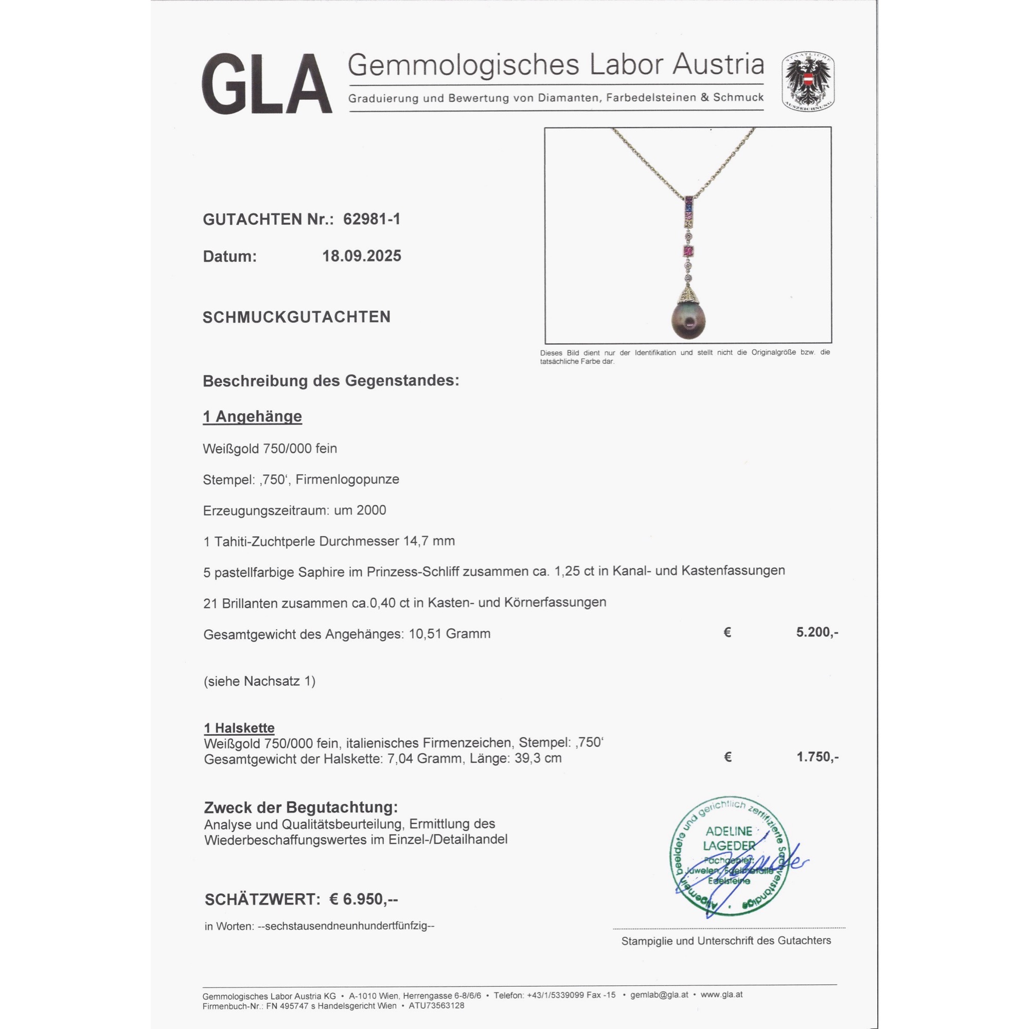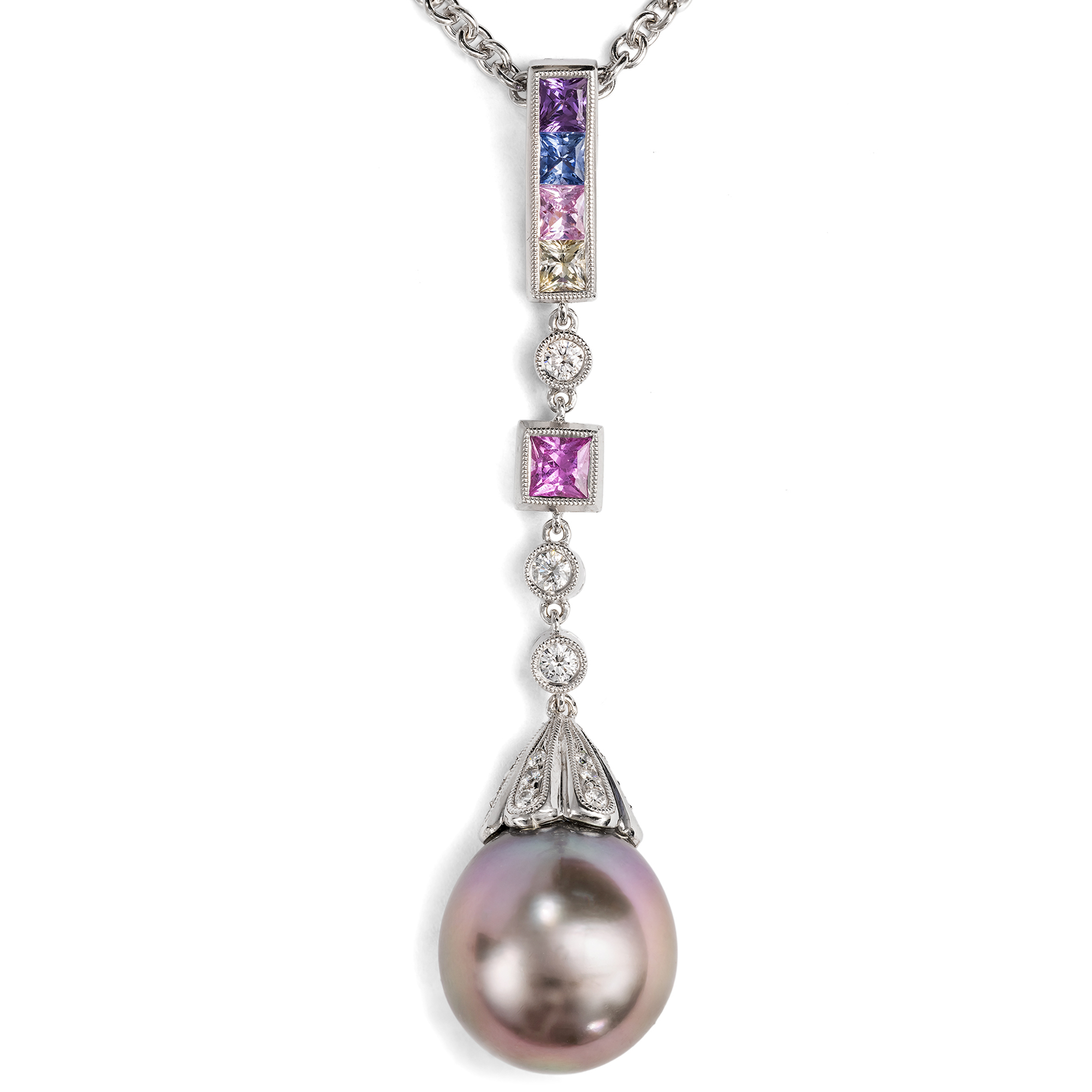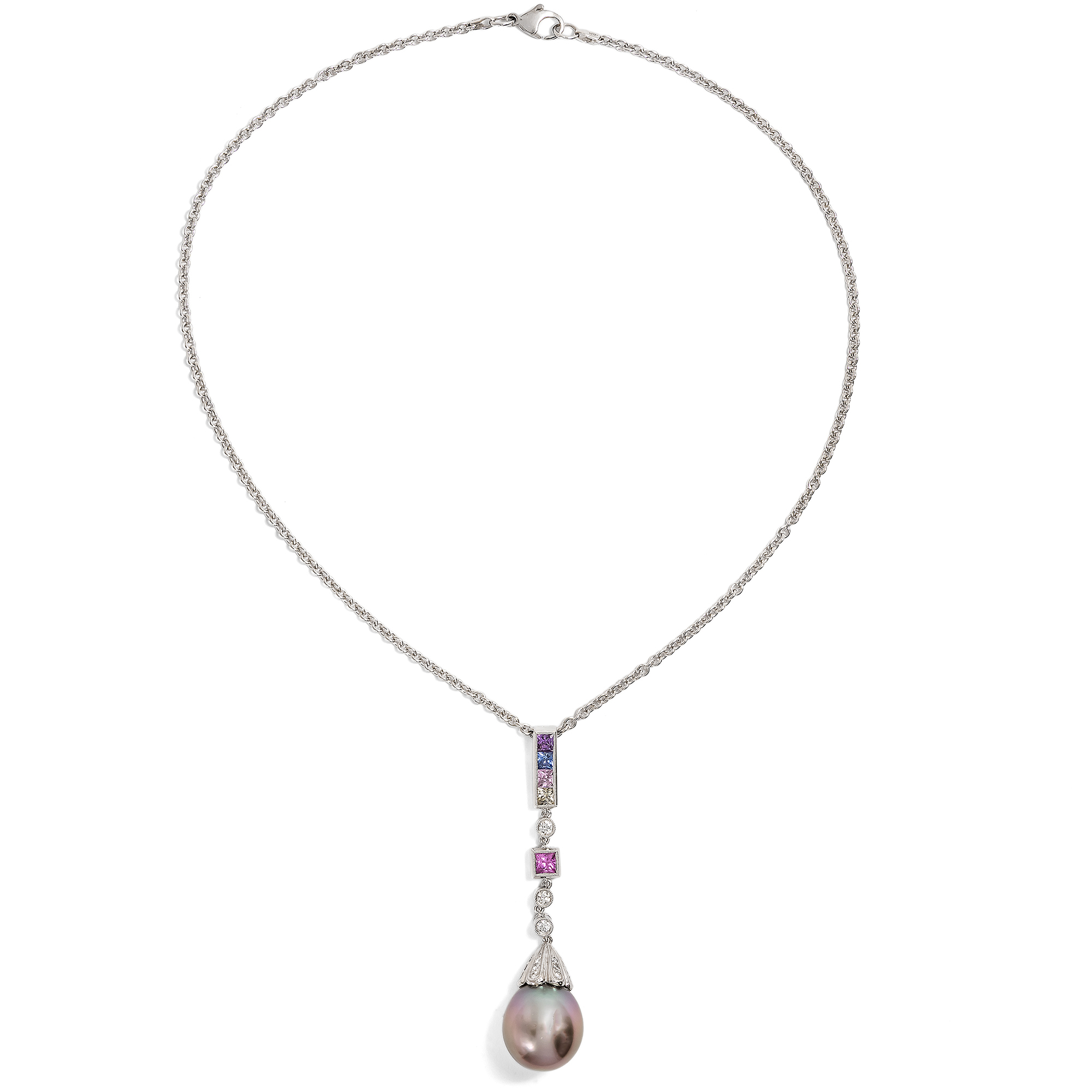 Tahitiperlen zählen zu den begehrtesten und edelsten Perlen der Welt – nicht nur wegen ihrer Größe, sondern auch aufgrund ihrer natürlichen, faszinierenden Farbigkeit. Ihre Zucht erfordert besondere Sorgfalt: Sie entstehen ausschließlich in den warmen, kristallklaren Lagunen Französisch-Polynesiens – auf Atollen und Archipelen, wo die empfindliche schwarzlippige Auster (Pinctada margaritifera) ideale Bedingungen vorfindet. Nur diese Muschelart bringt jene einzigartigen, dunkelgrauen bis tiefschwarzen Perlen hervor, die als Tahitiperlen weltweit Anerkennung genießen. Eine besonders schöne Tahitiperle mit einem Durchmesser von etwa 14,7 mm ist in diesem modernen Anhänger verarbeitet, den wir hier in Berlin entdeckt haben. Die dunkelgraue Perle hat eine makellose Oberfläche mit einem vielfarbigen Überfang in sog. „Peacock-Farben“. Tatsächlich schimmert die Perle je nach Lichteinfall violett und grün, so dass sie in dieser Farbigkeit tatsächlich an das edle Gefieder eines Pfaus erinnert. Die Perle wird gehalten von einer Fassung, die mit feinen Brillanten und kleinen Millegreffes verziert ist. Darüber ist eine Reihe kostbarer Saphire gesetzt, in feinen Pastellfarben. Die natürlichen Steine haben ein Gewicht von zusammen etwa 1,25 ct, und sie sind im Carréeschliff geformt. Drei weitere Brillanten vervollständigen die Komposition, die an einer massiven Ankerkette getragen werden kann. Ersonnen wurde das kostbare Schmuckstück in der Manufaktur Schöffel in Stuttgart, und geliefert wird es mit einem detaillierten Gutachten aus Wien.