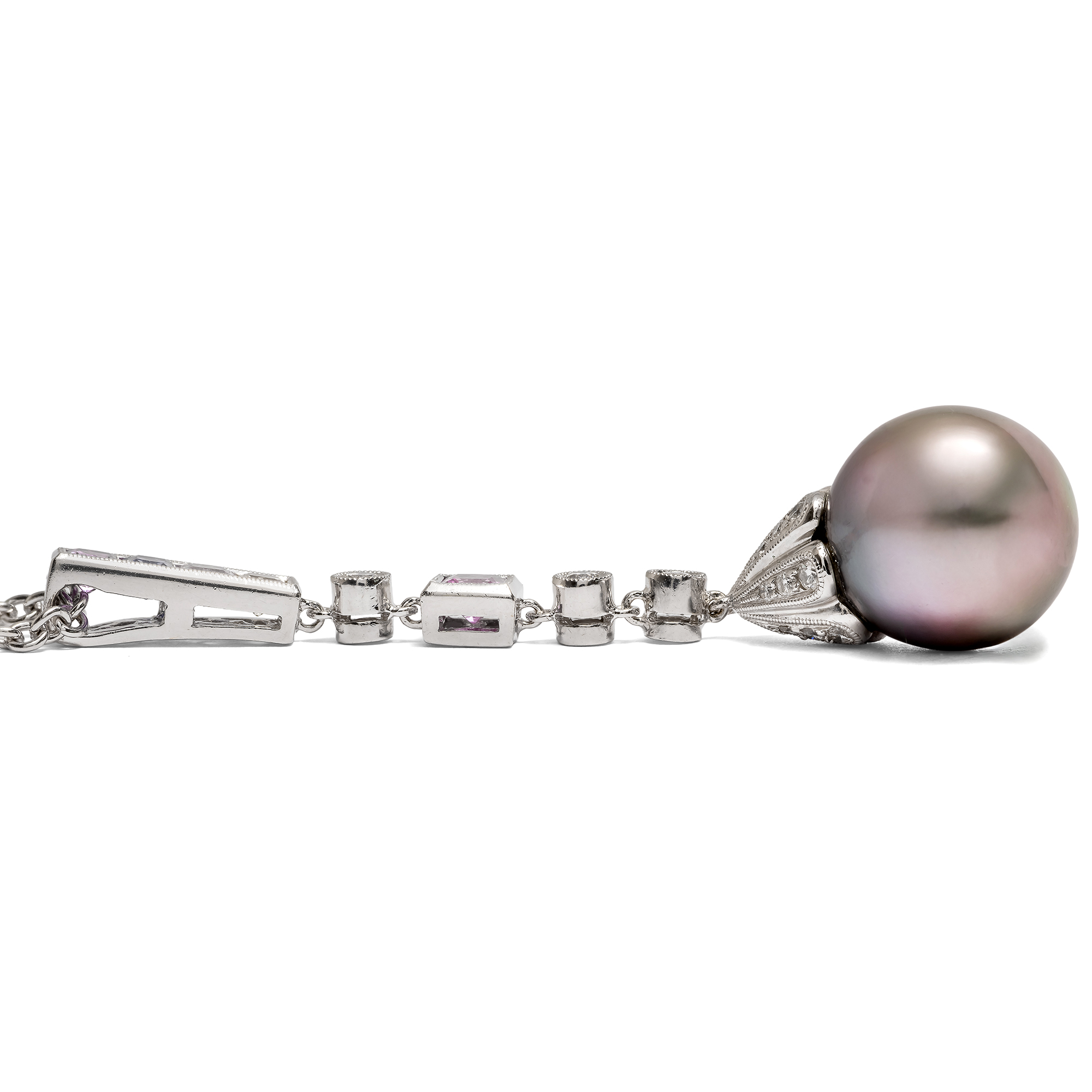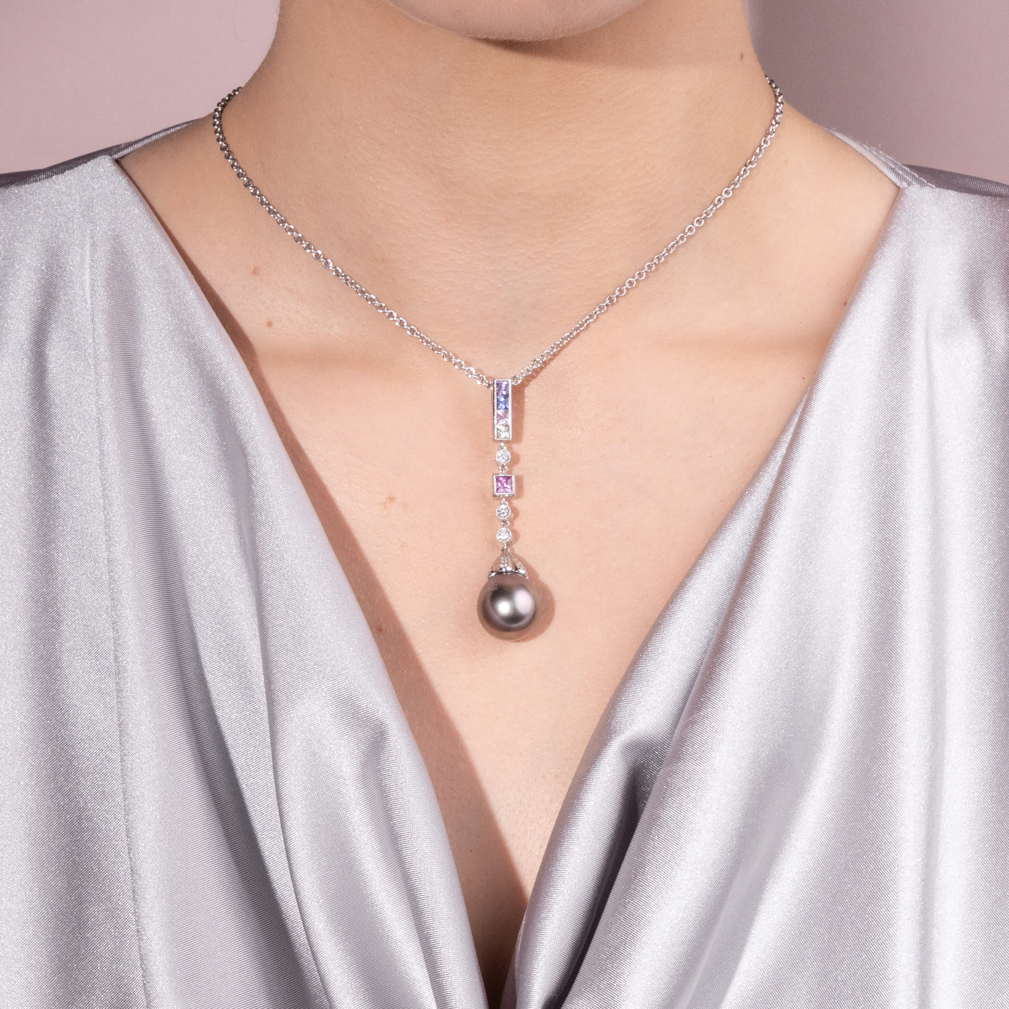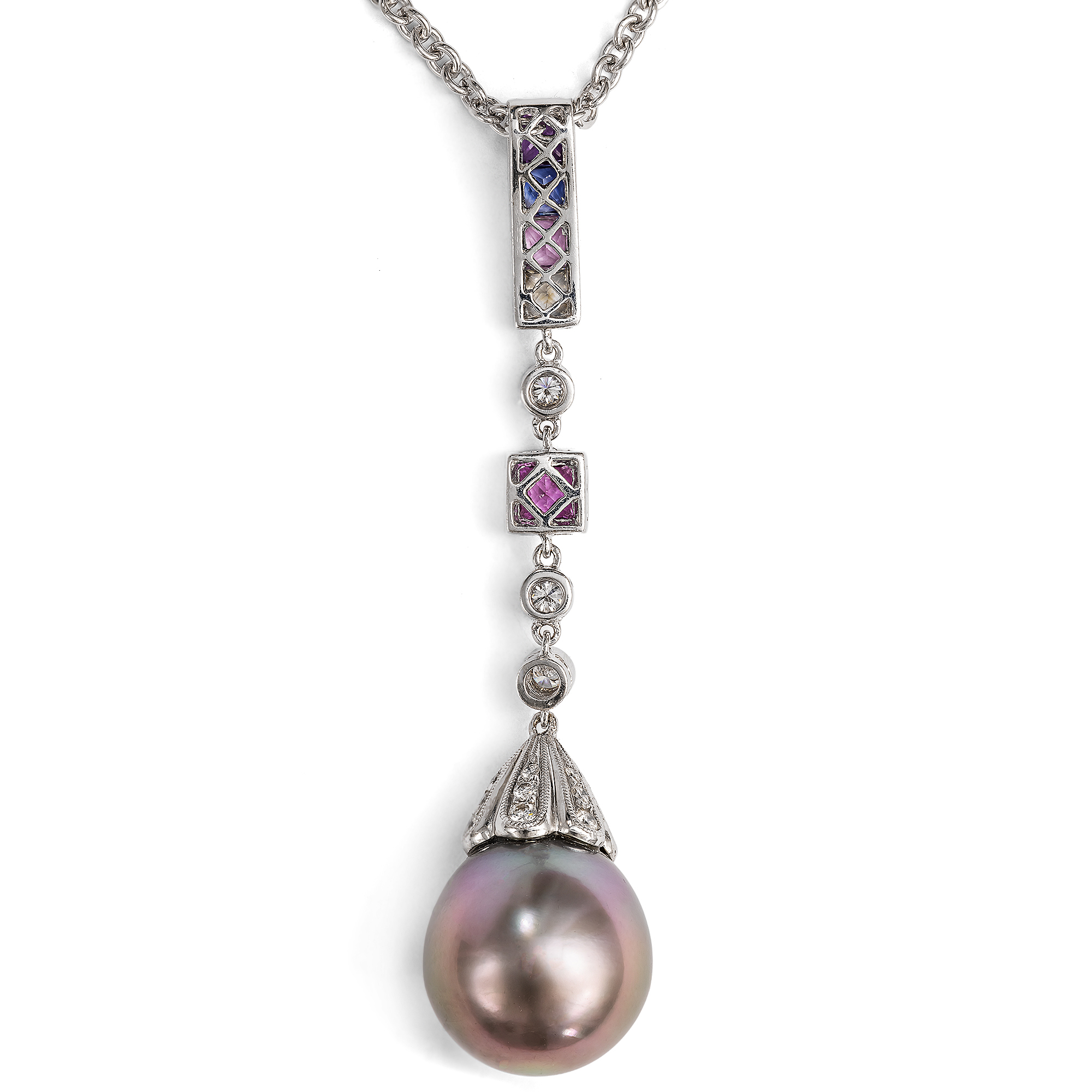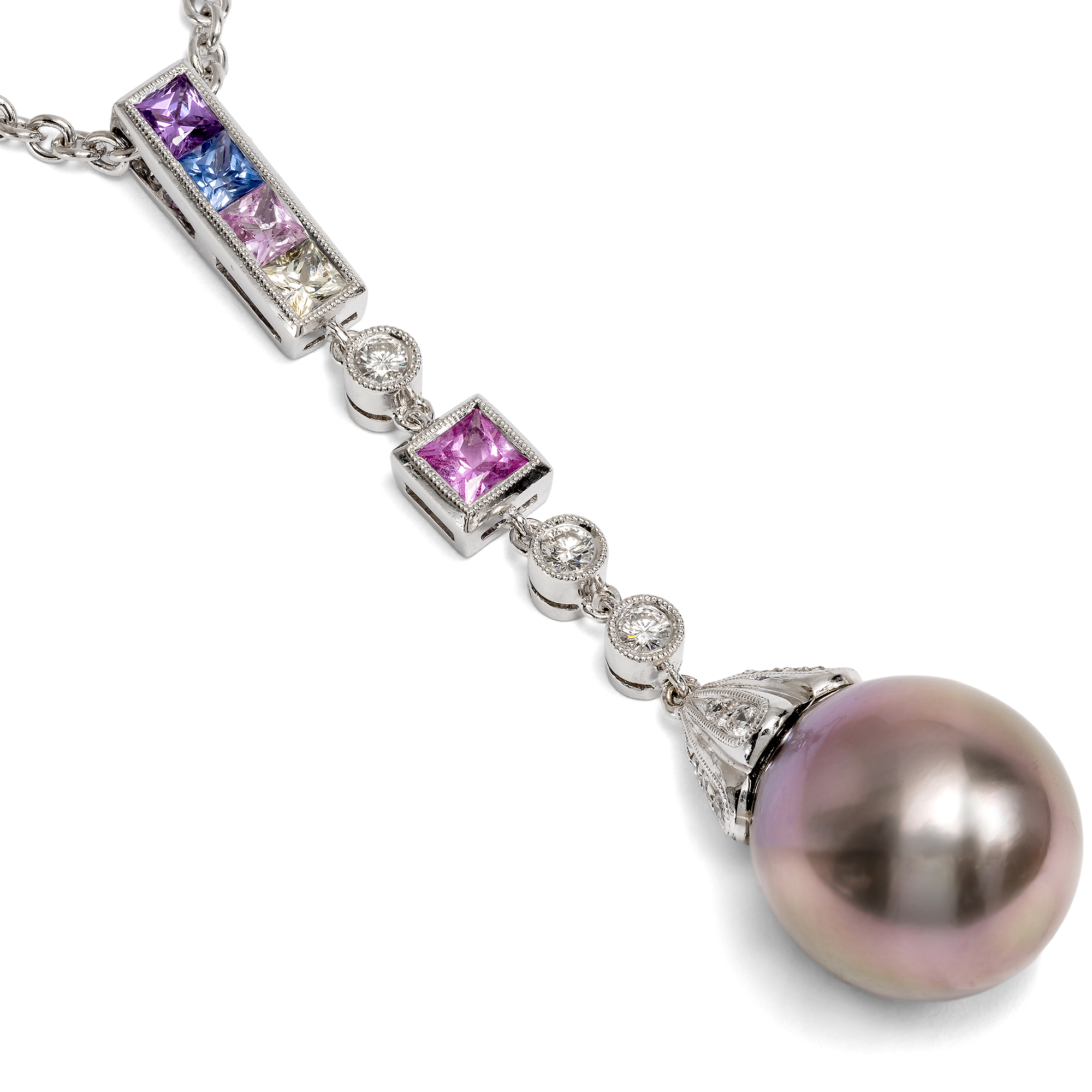 Tahitiperlen zählen zu den begehrtesten und edelsten Perlen der Welt – nicht nur wegen ihrer Größe, sondern auch aufgrund ihrer natürlichen, faszinierenden Farbigkeit. Ihre Zucht erfordert besondere Sorgfalt: Sie entstehen ausschließlich in den warmen, kristallklaren Lagunen Französisch-Polynesiens – auf Atollen und Archipelen, wo die empfindliche schwarzlippige Auster (Pinctada margaritifera) ideale Bedingungen vorfindet. Nur diese Muschelart bringt jene einzigartigen, dunkelgrauen bis tiefschwarzen Perlen hervor, die als Tahitiperlen weltweit Anerkennung genießen. Eine besonders schöne Tahitiperle mit einem Durchmesser von etwa 14,7 mm ist in diesem modernen Anhänger verarbeitet, den wir hier in Berlin entdeckt haben. Die dunkelgraue Perle hat eine makellose Oberfläche mit einem vielfarbigen Überfang in sog. „Peacock-Farben“. Tatsächlich schimmert die Perle je nach Lichteinfall violett und grün, so dass sie in dieser Farbigkeit tatsächlich an das edle Gefieder eines Pfaus erinnert. Die Perle wird gehalten von einer Fassung, die mit feinen Brillanten und kleinen Millegreffes verziert ist. Darüber ist eine Reihe kostbarer Saphire gesetzt, in feinen Pastellfarben. Die natürlichen Steine haben ein Gewicht von zusammen etwa 1,25 ct, und sie sind im Carréeschliff geformt. Drei weitere Brillanten vervollständigen die Komposition, die an einer massiven Ankerkette getragen werden kann. Ersonnen wurde das kostbare Schmuckstück in der Manufaktur Schöffel in Stuttgart, und geliefert wird es mit einem detaillierten Gutachten aus Wien.