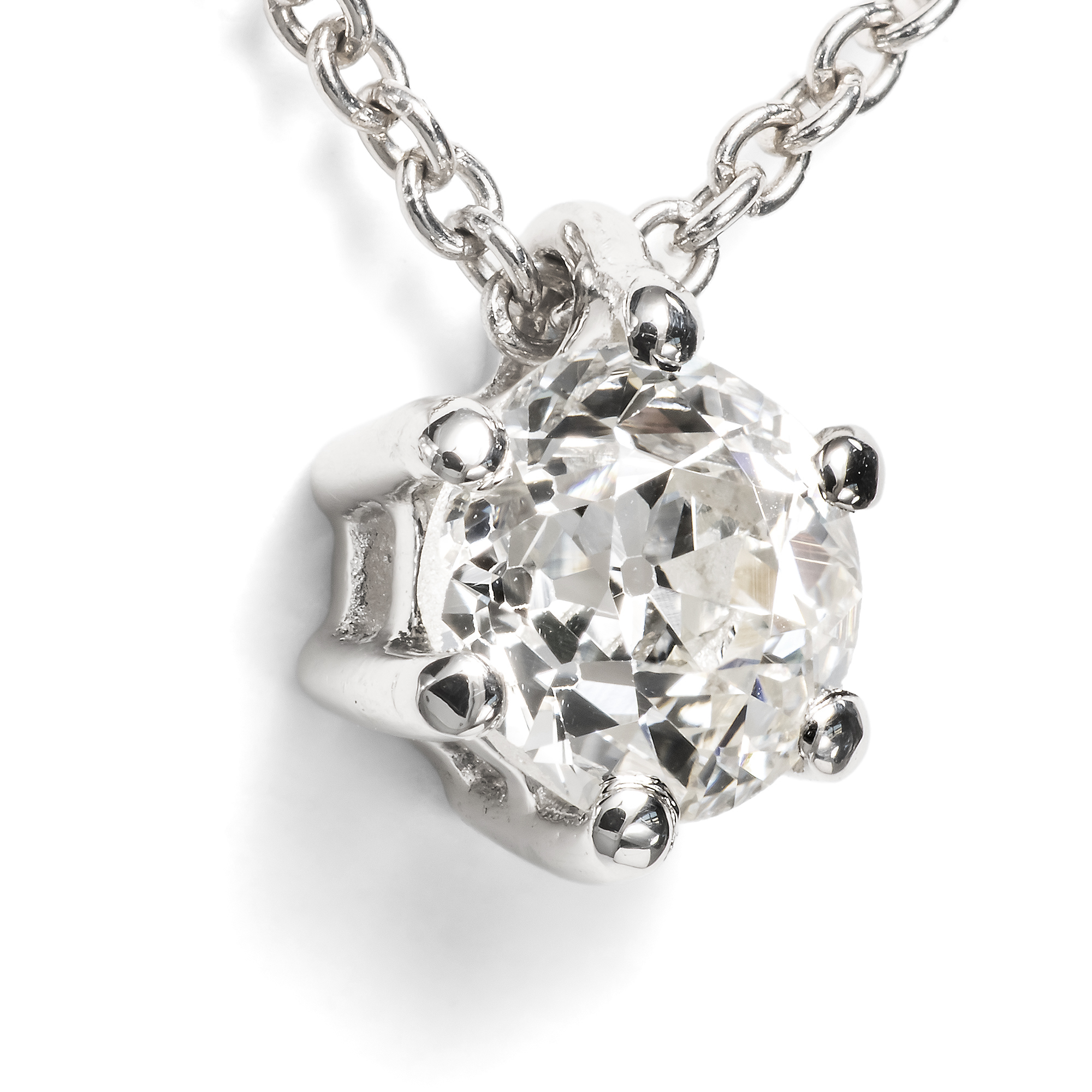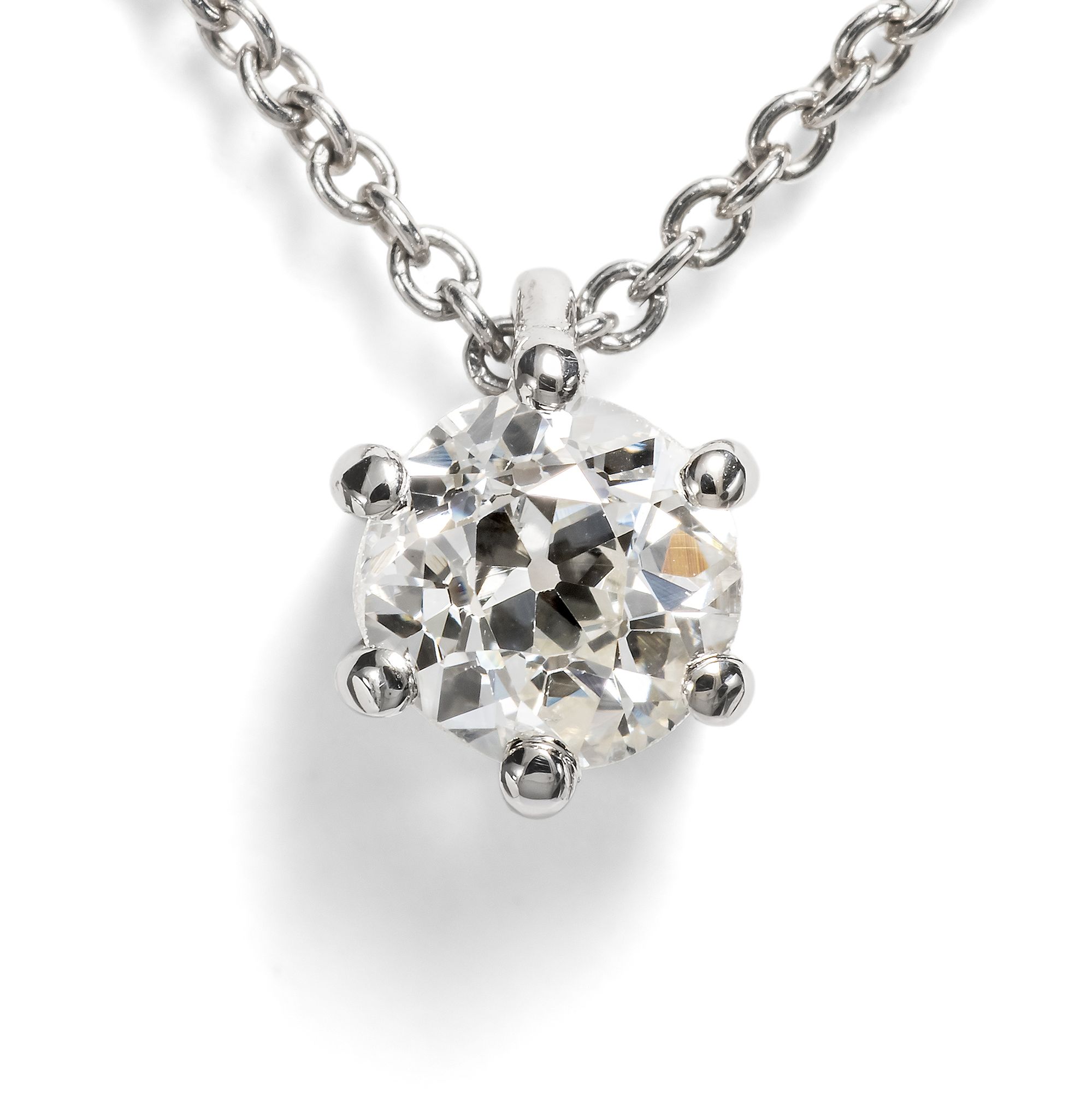 Ein schlichter Anhänger mit einem einzelnen Diamanten strahlt zurückhaltende Eleganz und zeitlose Klasse aus. Gerade durch das reduzierte Design rückt die natürliche Schönheit und Brillanz des Steins in den Mittelpunkt. Er lässt sich vielseitig tragen – ob im Alltag oder zu besonderen Anlässen – und wird so zum dezenten, aber wirkungsvollen Begleiter. Das klassisch schlichte Collier aus unserer Werkstatt präsentiert einen Brillant-Solitär an einer Kette aus Platin. Der antike Stein hat ein Gewicht von 0,46 Karat und funkelt in wunderbarem Feuer. Es handelt sich um einen antiken Diamanten im Altschliff, dem sog. „Old European Cut“, der bereits in der zweiten Hälfte des 19. Jahrhundert geschliffen wurde. Seine Proportionen folgen noch nicht dem Standard des heutigen Brillanten. Vielmehr wollte man den optimalen Weg finden zwischen dem besten Glanz einerseits und dem wenigsten Materialverlust beim Schleifen andererseits. Wir finden, dass gerade diese Individualität die alten Diamanten so besonders interessant macht. Man kann sie weniger gut vergleichen; auch lässt sich der Wert nicht einfach mittels einer Tabelle bestimmen: Denn man muss jeden Stein einzeln ansehen, um wirklich sagen zu können, ob er das Feuer und den Glanz hat, den man von einem Diamanten erwartet. Die zurückhaltende, klassische Fassung ist in unserem Auftrag in Süddeutschland entstanden. Sie hält den Stein sicher und führt den Blick immer wieder zurück auf den Diamanten. Die passende Ankerkette aus Platin ist ebenso neu angefertigt worden. Sie ist fein verarbeitet und liegt weich und angenehm auf der Haut.