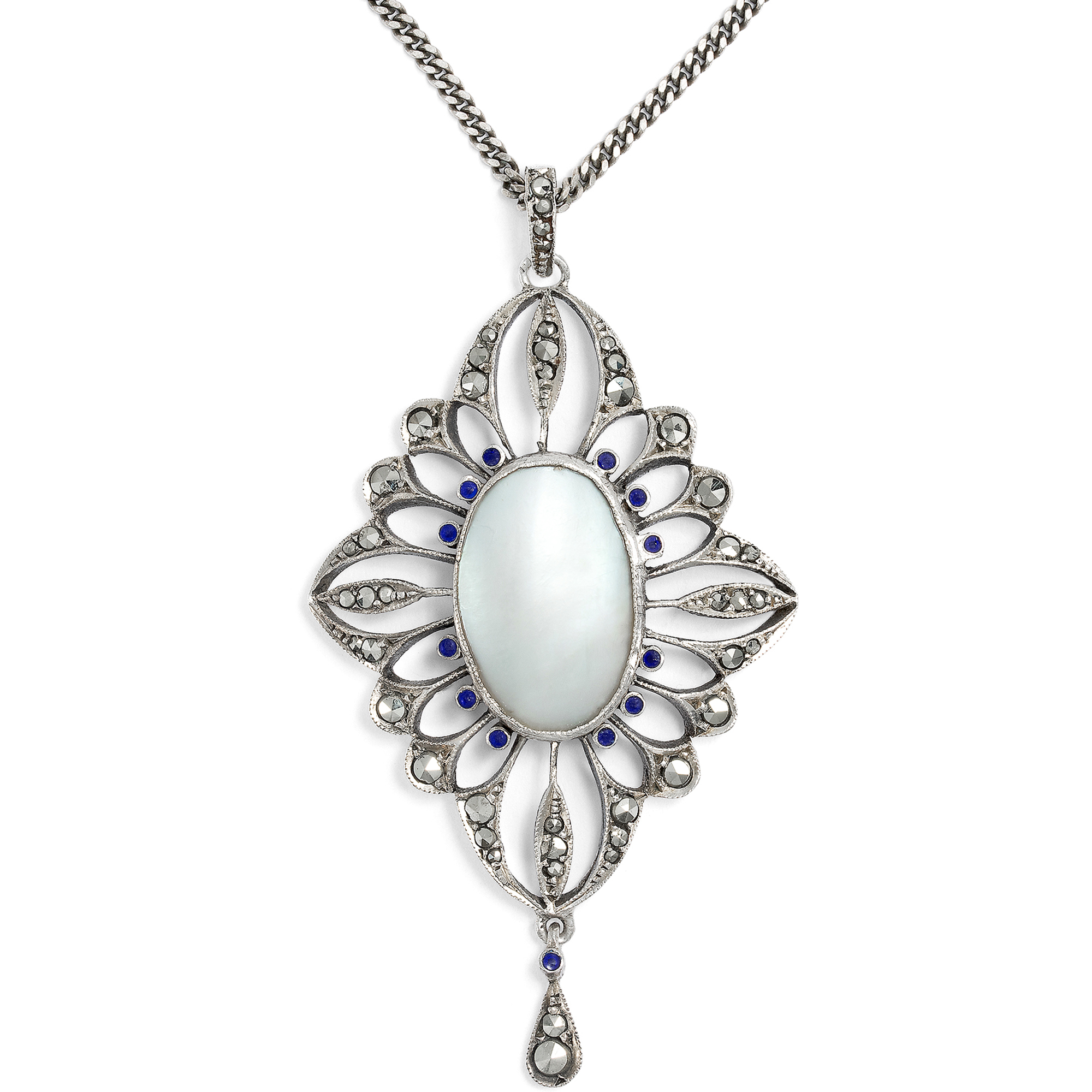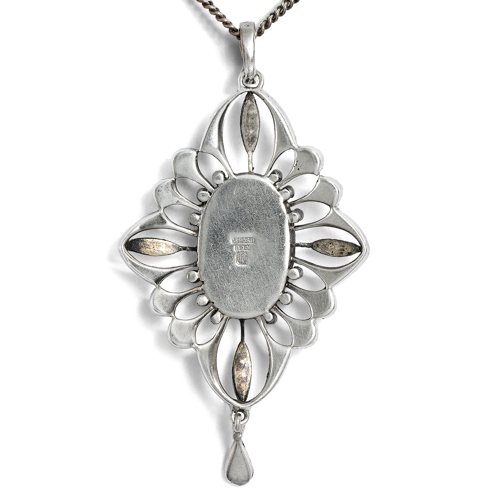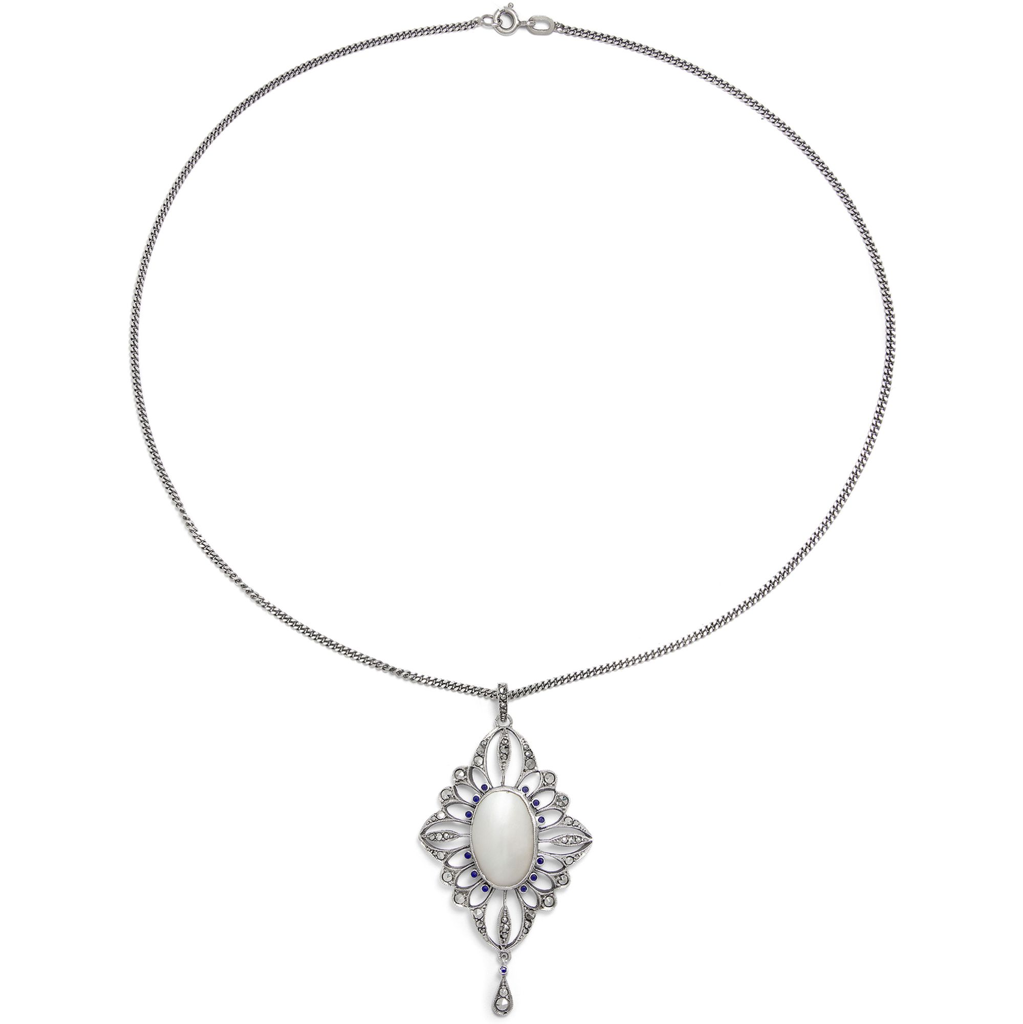 Der vorliegende Anhänger ist ein schönes Beispiel für modischen Schmuck aus den ersten Jahren des vorigen Jahrhunderts. Das aus Silber gearbeitete Schmuckstück stammt aus einer der zahlreichen Pforzheimer Manufakturen, die um die Jahrhundertwende mit ausgesprochen modernen und künstlerischen, dabei jedoch bezahlbaren Entwürfen aufwarteten. Der Anhänger aus gegossenem Silber präsentiert in seiner Mitte eine schimmernde Perlschale, gerahmt von einem Kranz aus kleinen dunkelblauen Glassteinen. Metallisch glitzernde Markasitrosen besetzen den Rand des in Form eines gestreckten Vierpasses gestalteten Entwurfs. Der Entwurf folgt der damals neuartigen graphischen Spielart des Jugendstils, die bereits zum Art Déco überleitet. Die Form ist strenger und geometrischer als die zeitgleichen französischen Arbeiten – typisch für deutsche Entwürfe. Laut Stempelung ist unser Anhänger eine Arbeit der Firma Levinger & Bissinger. Weitere Informationen zu Pforzheimer Schmuckerzeugnissen in französischen und deutschen Jugendstilformen finden sich in dem wunderbar bebilderten Band von Fritz Falk: Jugendstil-Schmuck aus Pforzheim, Stuttgart 2008, hier mit Werken von Levinger & Bissinger auf den Seiten 209–243.