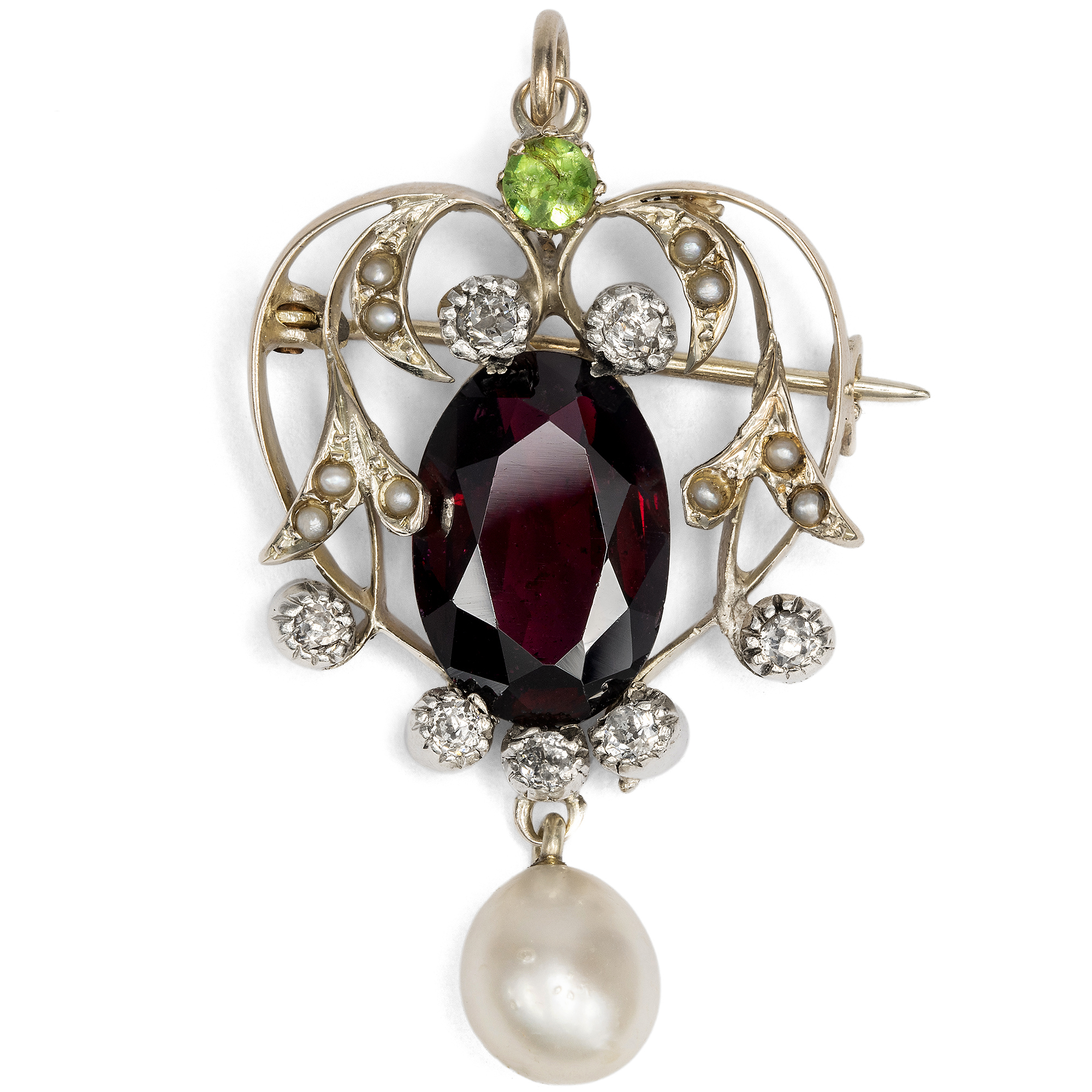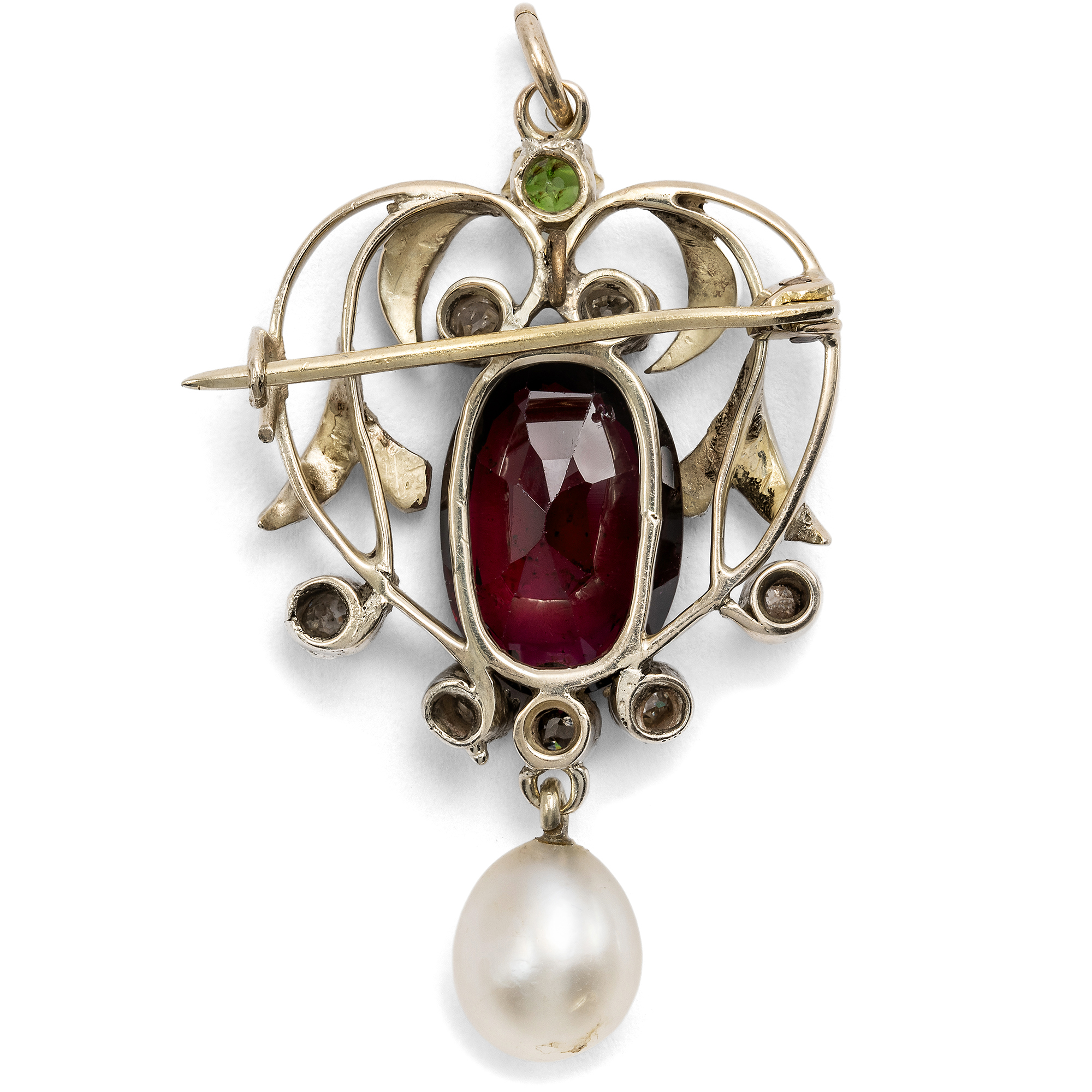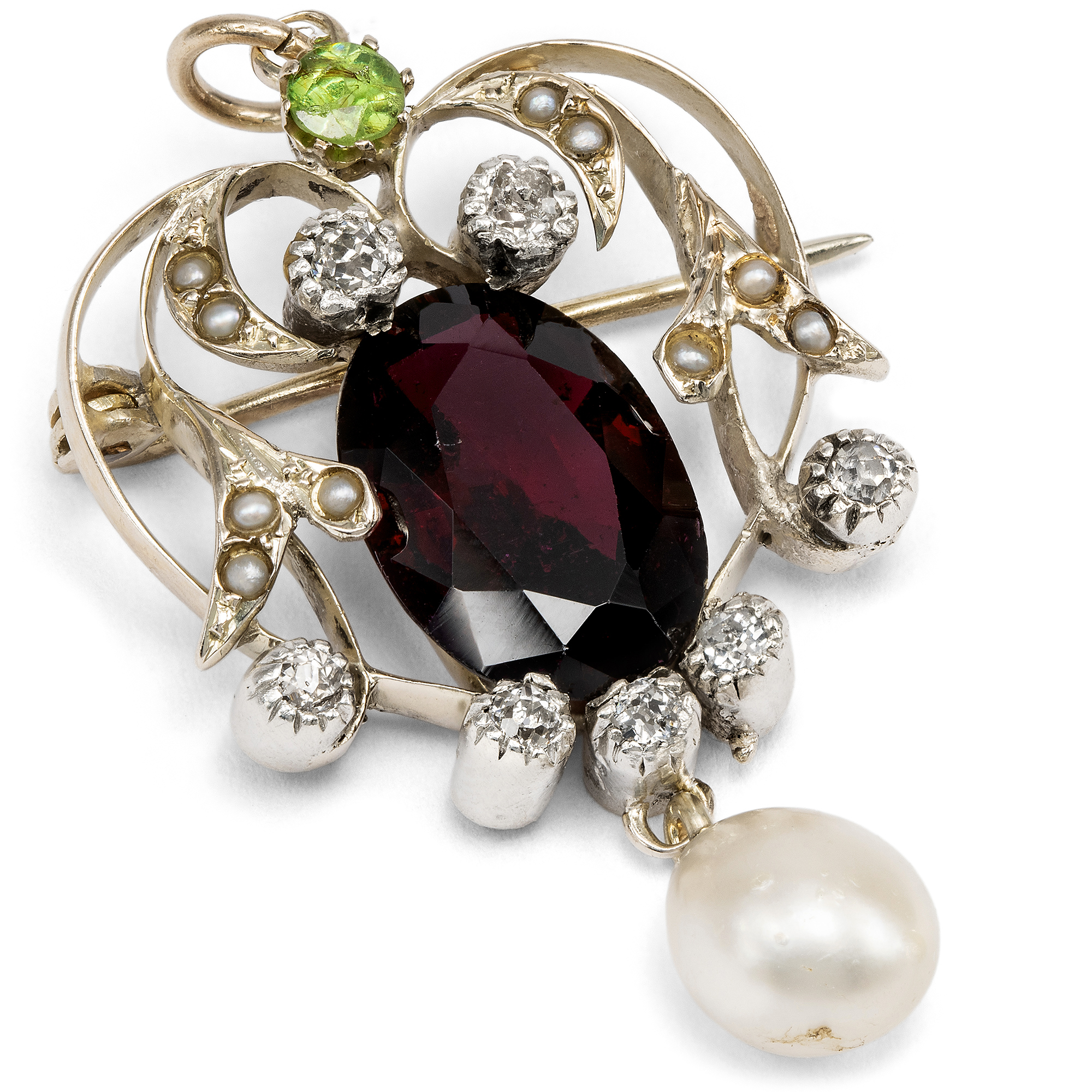 Antike Anhänger-Brosche mit Demantoid, Granat, Diamanten & Naturperle, um 1910