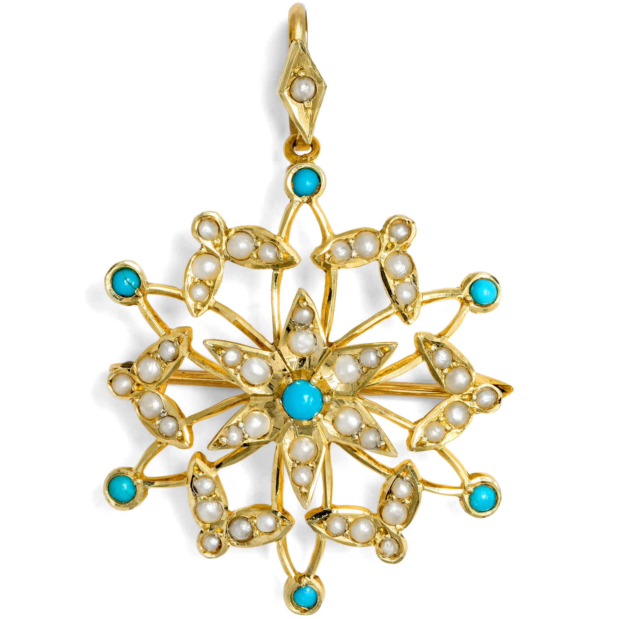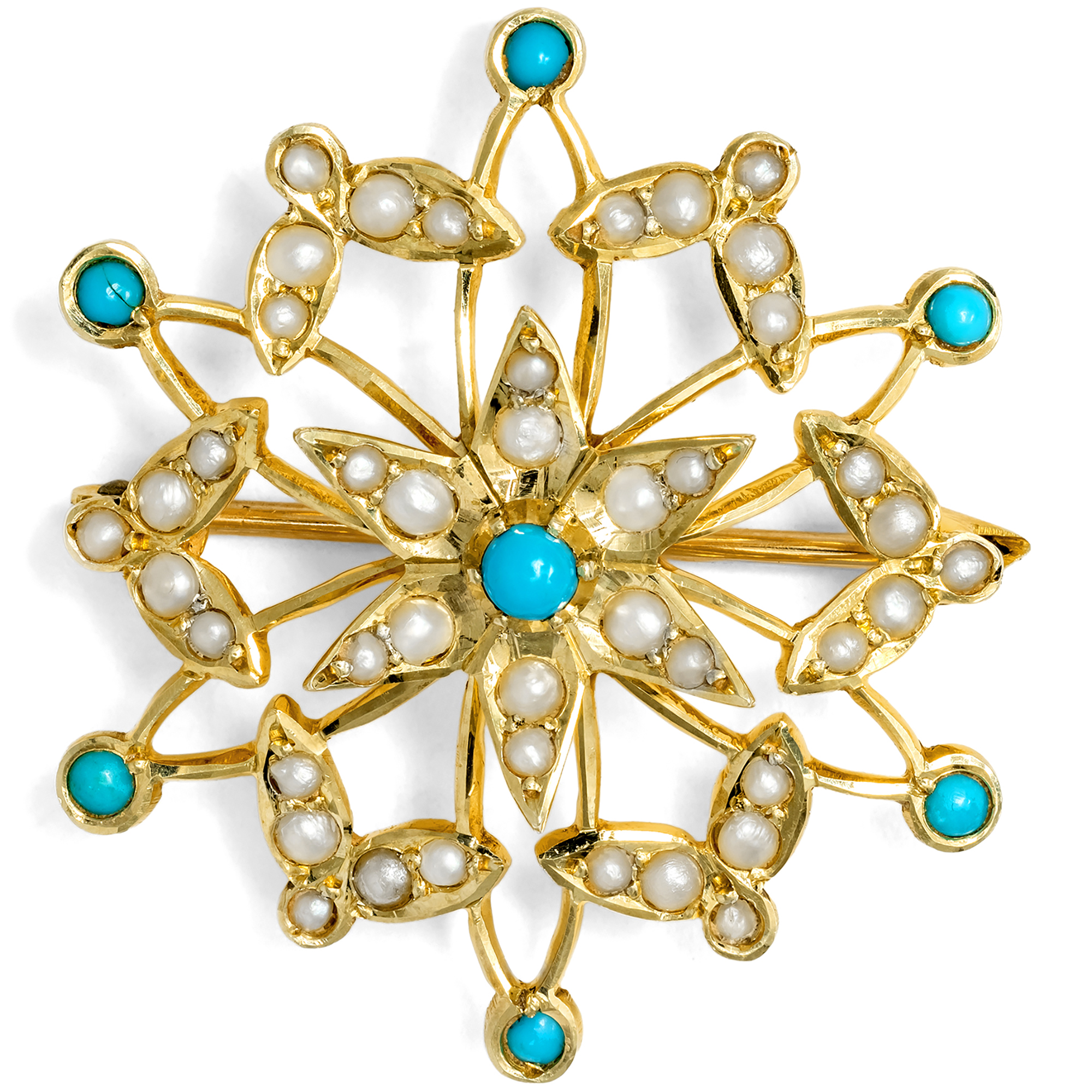 Himmelskörper zählten an der Wende vom 19. zum 20. Jahrhundert zu den beliebtesten Schmuckmotiven. Ob Halbmonde, Sonnen oder Sterne – sie schmückten die Dekolletés und Blusen der Damen, für festliche Anlässe in funkelnden Diamanten, für den Tag in edlem Gold gestaltet. Der hier gezeigte, filigran durchbrochen gearbeitete Stern ist vollständig mit schimmernden Naturperlen und im Cabochonschliff geschliffenen Türkisen besetzt. Beide Edelsteine wurden in jener Zeit bevorzugt in warmes Gelbgold gefasst – wie auch bei diesem Stück. Diese harmonische Farbkombination war vor allem für den Tagesgebrauch bestimmt und weckt noch heute Erinnerungen an sanfte Sommerabende. Der Stern kann sowohl als Brosche als auch als Anhänger getragen werden. Dank einer abnehmbaren Anhängerschlaufe lässt sich das Schmuckstück im Handumdrehen verwandeln. So ging man schon in der Vergangenheit sicher, dass eine einmal getätigte Investition in ein Schmuckstück sich durch seine Vielseitigkeit auszahlen würde. Entdeckt haben wir dieses bezaubernde, aus 9-karätigem Gold gefertigte Stück in London.