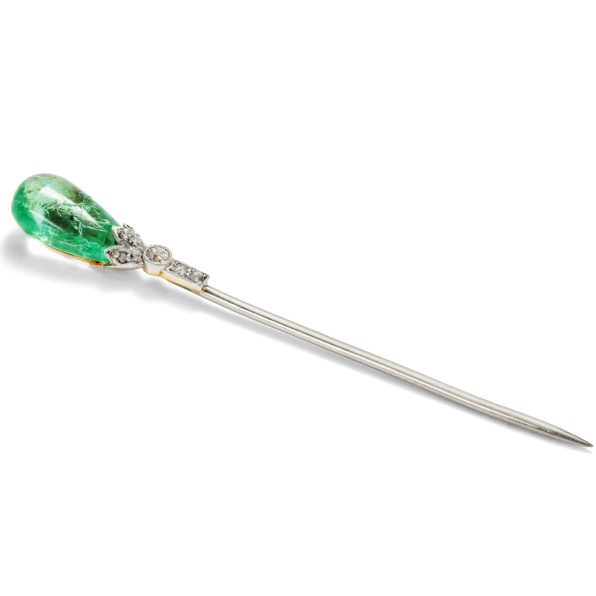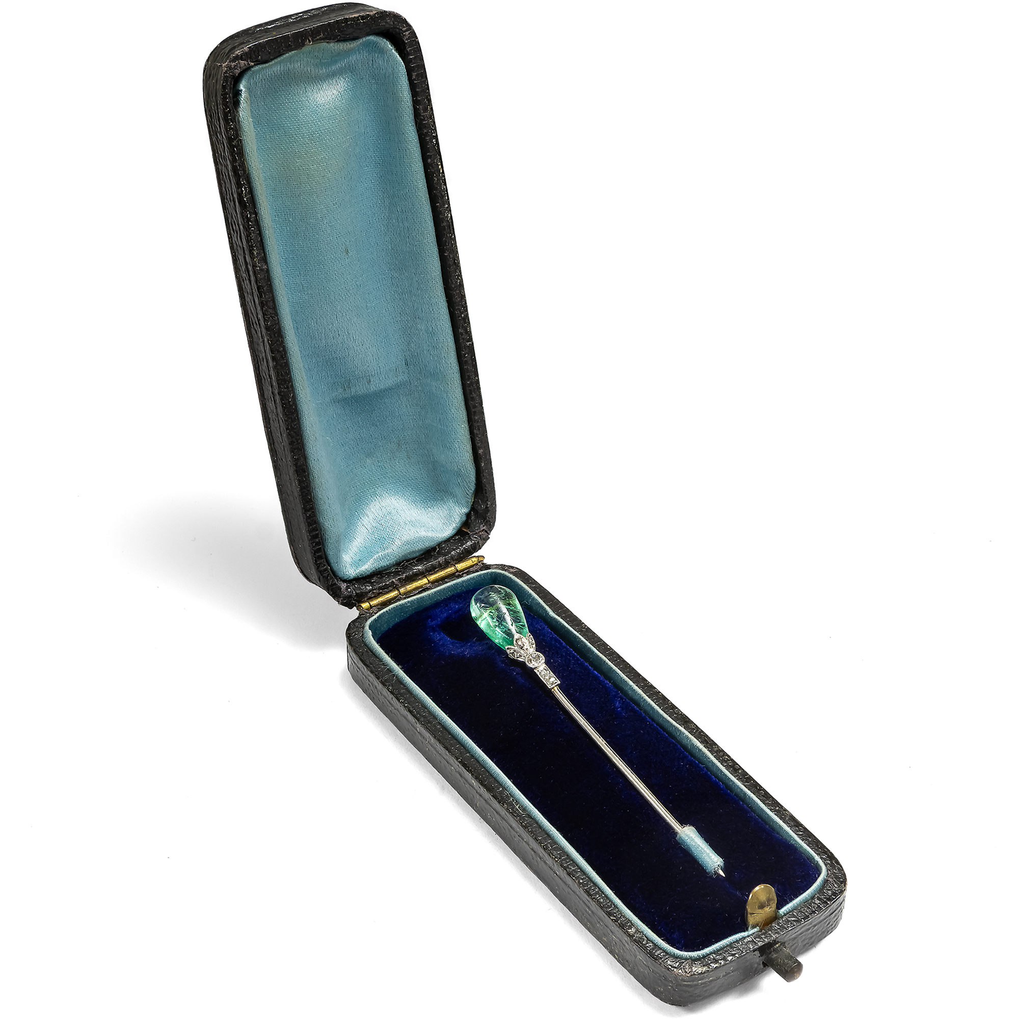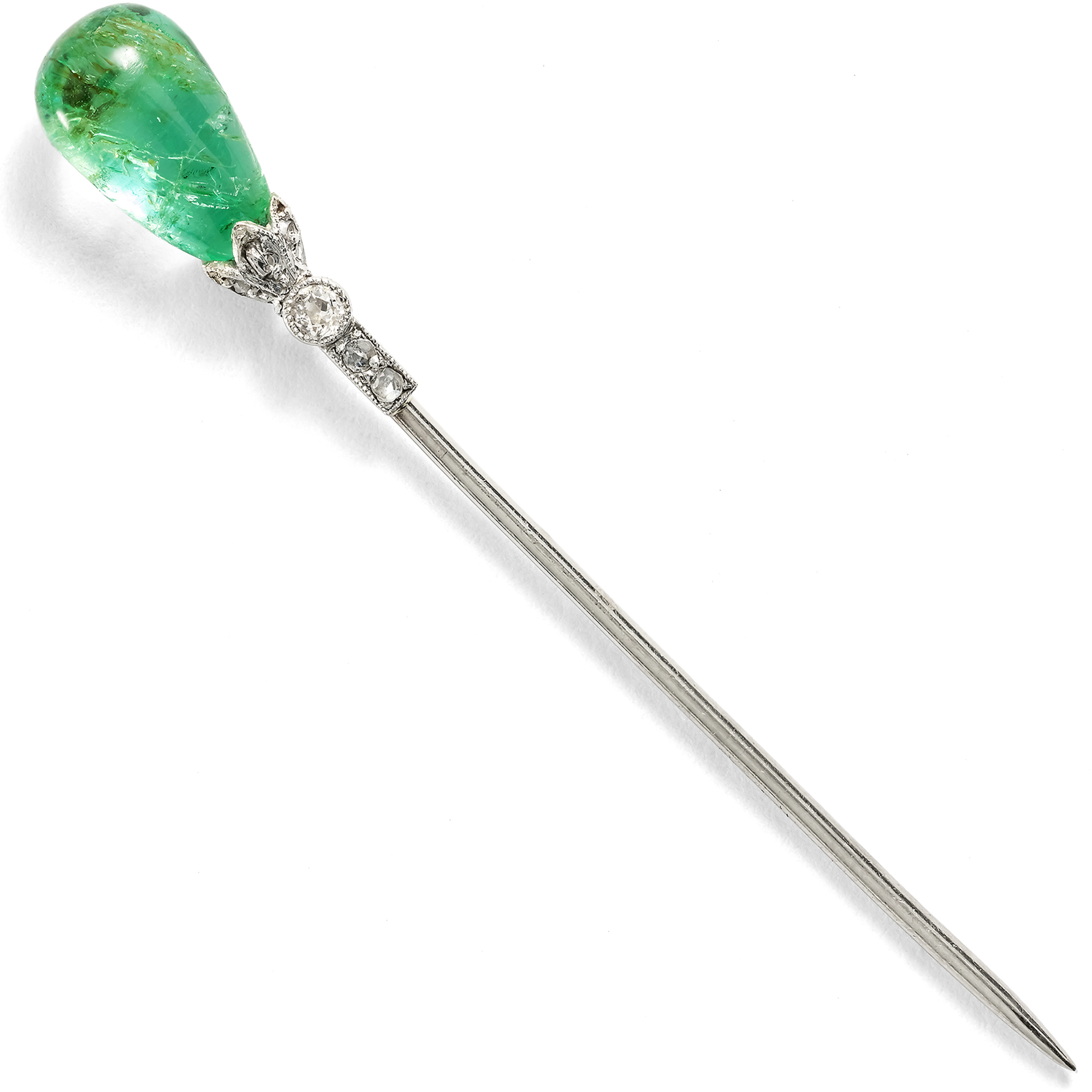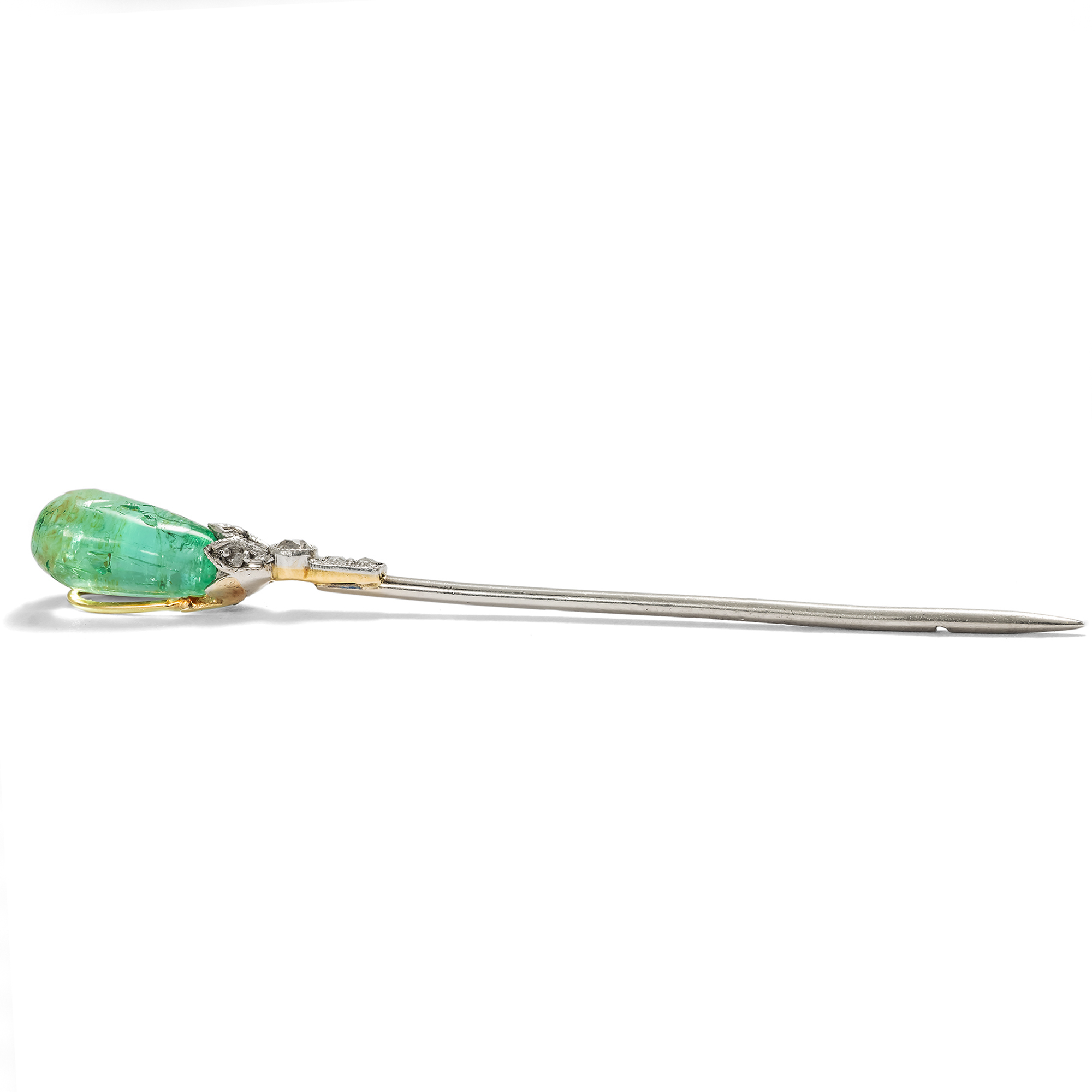 „Ohne Krawattennadel bin ich nicht angezogen“, bemerkte Karl Lagerfeld – ein Ausspruch, der seine kompromisslose Auffassung von Stil und Vollendung treffend widerspiegelt. Als feines Accessoire setzen Krawatten- und Reversnadeln gezielte Akzente und verleihen der Erscheinung eine zusätzliche Nuance von Eleganz. Sie sind mehr als bloßer Schmuck: ein bewusst gewähltes Detail, das Persönlichkeit und Stilsicherheit unterstreicht. Die vorliegende besonders edle Nadel fand aus dem Süden Englands zu uns. Gefertigt in den ersten Jahren des 20. Jahrhunderts, präsentiert sie als zentrales Schaustück einen eindrucksvollen Smaragdtropfen. Damit entspricht sie ganz dem Geschmack ihrer Zeit, denn tropfenförmige Smaragde waren um 1900 en vogue. Zahlreiche dieser Steine kamen damals aus Indien nach Europa. Sie waren bereits in früheren Jahrhunderten aus Südamerika nach Indien gekommen; nun ließen die Maharadschas die Steine in Europa neu fassen. Vermutlich stammt auch der Stein in unserer Nadel aus einem älteren Kontext. Der Smaragd ist an der Spitze gebohrt und wird von einer blütenförmigen Fassung aus Platin gehalten. Feine Diamantrosen sowie ein Diamant im Altschliff begleiten den farbintensiven Edelstein und verleihen dem Stück zusätzliche Brillanz.