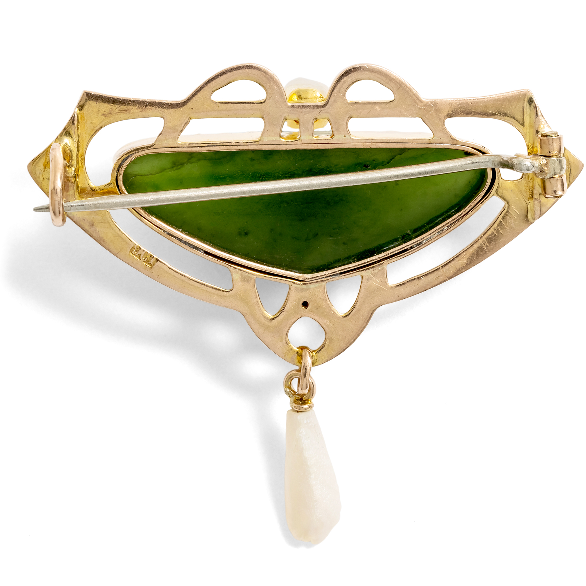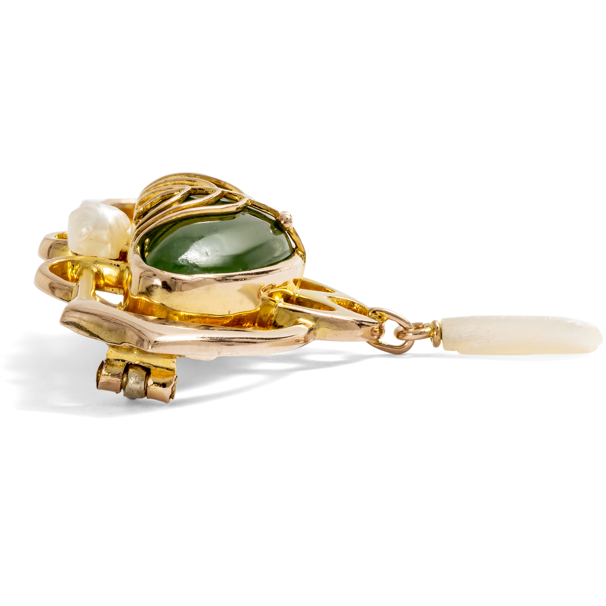 Antike britische Brosche mit Nephrit & Perlen in Gold, Jugendstil um 1905