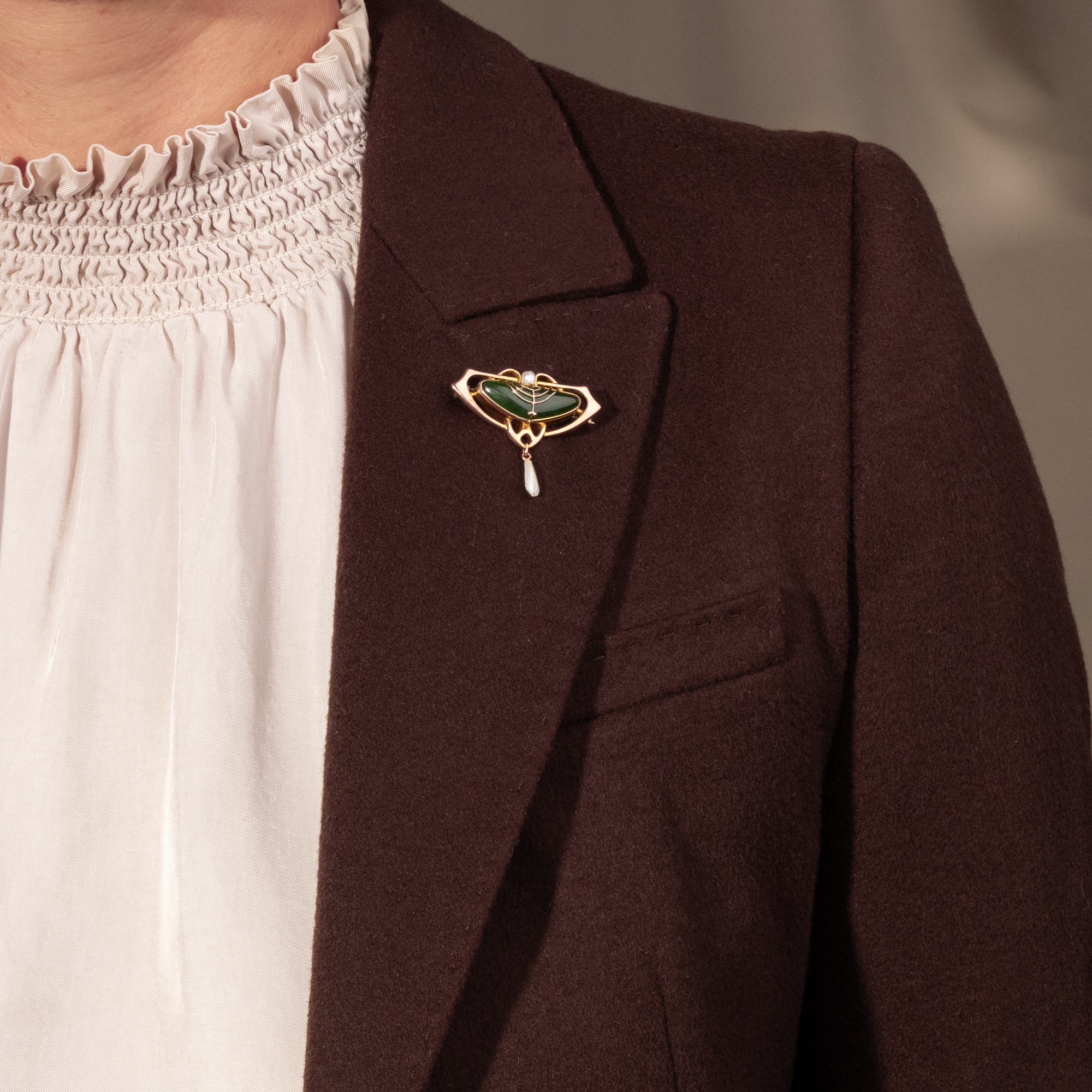 Die organischen Formen des Jugendstil traten in den Jahren kurz vor 1900 von Frankreich aus ihren Siegeszug rings um die Welt an. Der Name des Stils jedoch änderte sich von Land zu Land. In Frankreich war es die „Art Nouveau“, die neue Kunst. In Deutschland erhielt der Stil den Namen „Jugendstil“ nach der in München erscheinenden Zeitschrift „Jugend“. In Großbritannien lieh dem neuen Stil das Londoner Nobel-Kaufhaus Liberty’s des Unternehmers Sir Arthur Liberty den Namen. Hier wurde er als „Liberty-Style“ bekannt. Die hier vorliegende Brosche aus Großbritannien wäre zu ihrer Entstehungszeit mit diesem Namen bezeichnet worden. Das aus 9-karätigem Gold gefertigte Schmuckstück gehört zum Typus der sogenannten Kragenbroschen (vgl. „Erfahren Sie mehr“) und präsentiert eine grüne Nephrit-Jade sowie eine abgehängte Flügelperle und eine kleinere Barockperle. Goldene Stege schwingen sich zu einer symmetrischen und luftigen Komposition auf. Der Feingehaltsstempel zeigt, dass die Brosche in Großbritannien entstanden ist. Sie ist sehr gut erhalten und hat uns mit ihren eleganten Bögen sehr gut gefallen. Entdeckt haben wir sie in London.