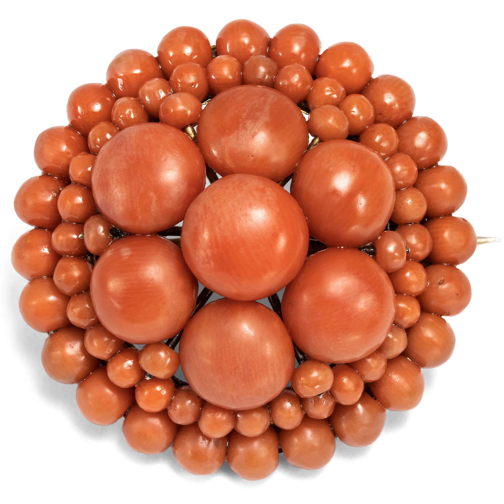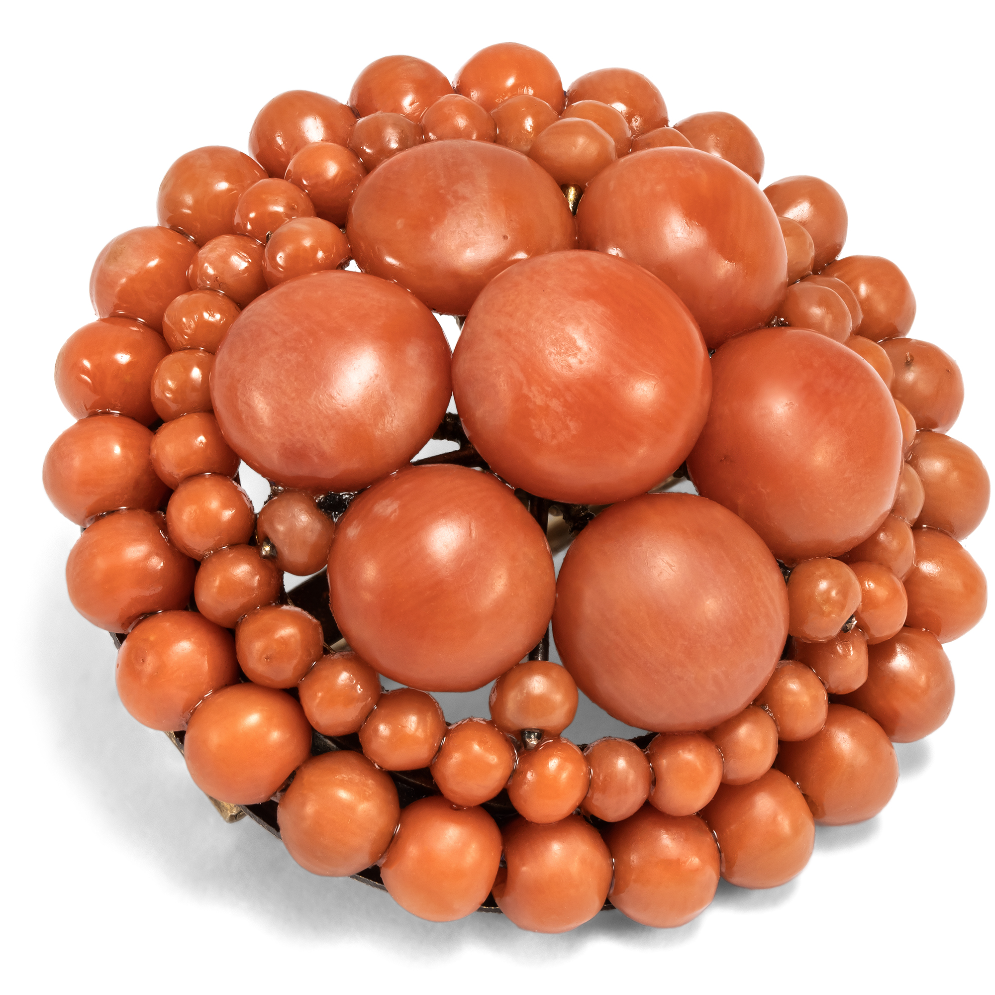 Die Koralle wird bereits seit dem Altertum als Glückszeichen verehrt. Aus dem 17. Jahrhundert etwa ist aus Venedig überliefert, die Koralle „Portati dovunque l’huomo sia, ò in casa, ò in nave, scaccia le cattive ombre de gli spiriti, sogni, fulmini, venti, e tempeste e gli diffende da ogni assalto di fiere.“ - „Wo auch immer der Mensch hingehe, ob er zu Hause sei, oder mit dem Schiff reise - die Koralle vertreibt die bösen Schatten der Geister, schlechte Träume, Blitze, Winde und Gewitter und schützt vor jedem Unbill.“ In Neapel glaubt man bis heute fest an die magische Kraft der Koralle, sie soll vor dem bösen Blick schützen, Unheil fernhalten und Glück bescheren. Wer also mit dieser Brosche unterwegs ist, dürfte rundum auf der sicheren Seite sein. In der hier vorliegenden Brosche sind die kleinen Glücksbringer aus dem Schoß des Meeres zu einer charmanten Blüte zusammengestellt. Perlen und Boutons aus lachsroter Mittelmeerkoralle bilden den leuchtenden Besatz, angeordnet auf einer feinen Montierung aus vergoldetem Silber. Das Schmuckstück lebt geradezu vor mediterraner Sonne und guter Laune. Sein Weg führte es aus dem warmen Süden hierher nach Berlin, wo es nun mit neapolitanischem Charme auf sein nächstes Abenteuer wartet. Zitat nach Isabella Palumbo Fossati Casa: Intérieurs vénitiens à la Renaissance. Maisons, société et culture, Paris 2012, S. 276.