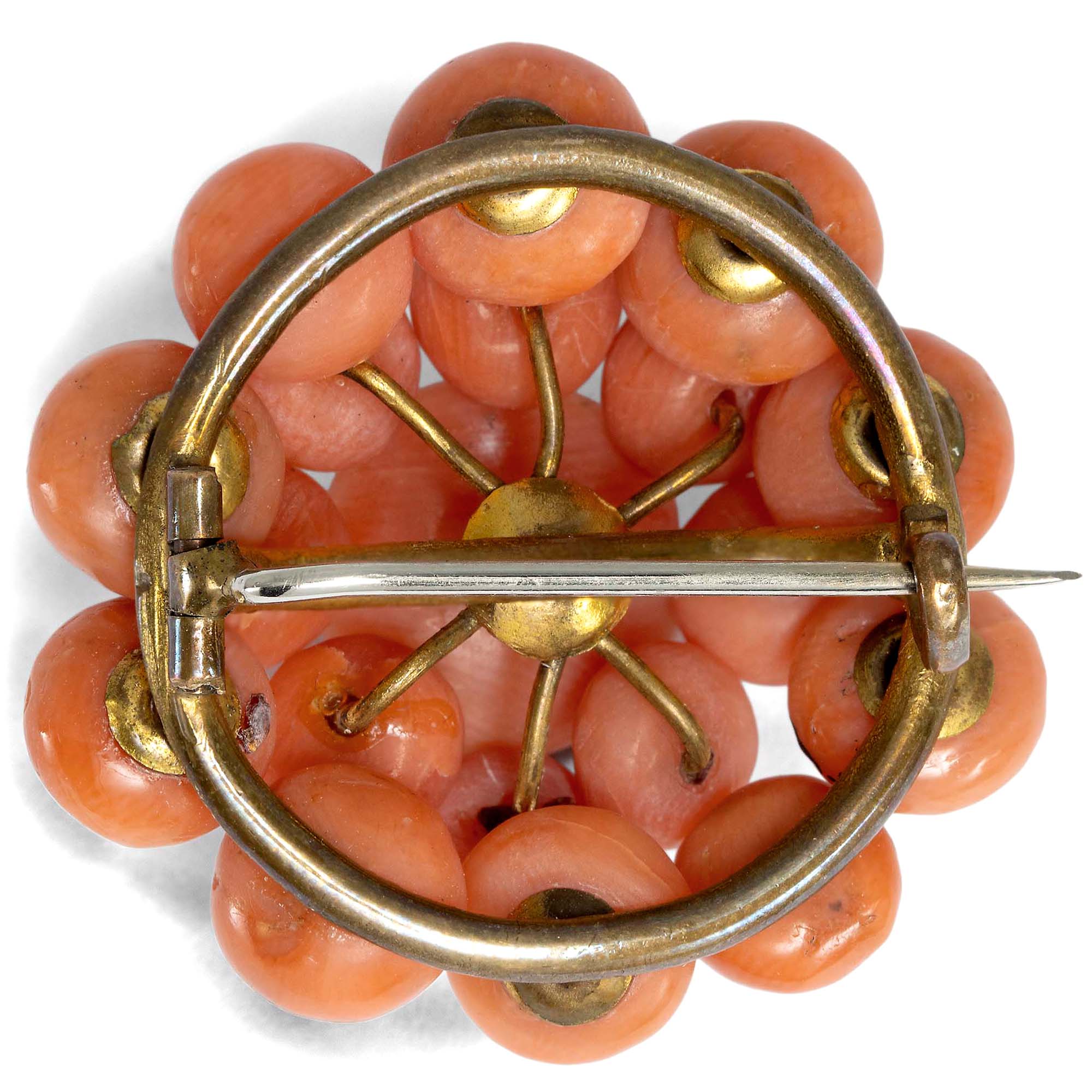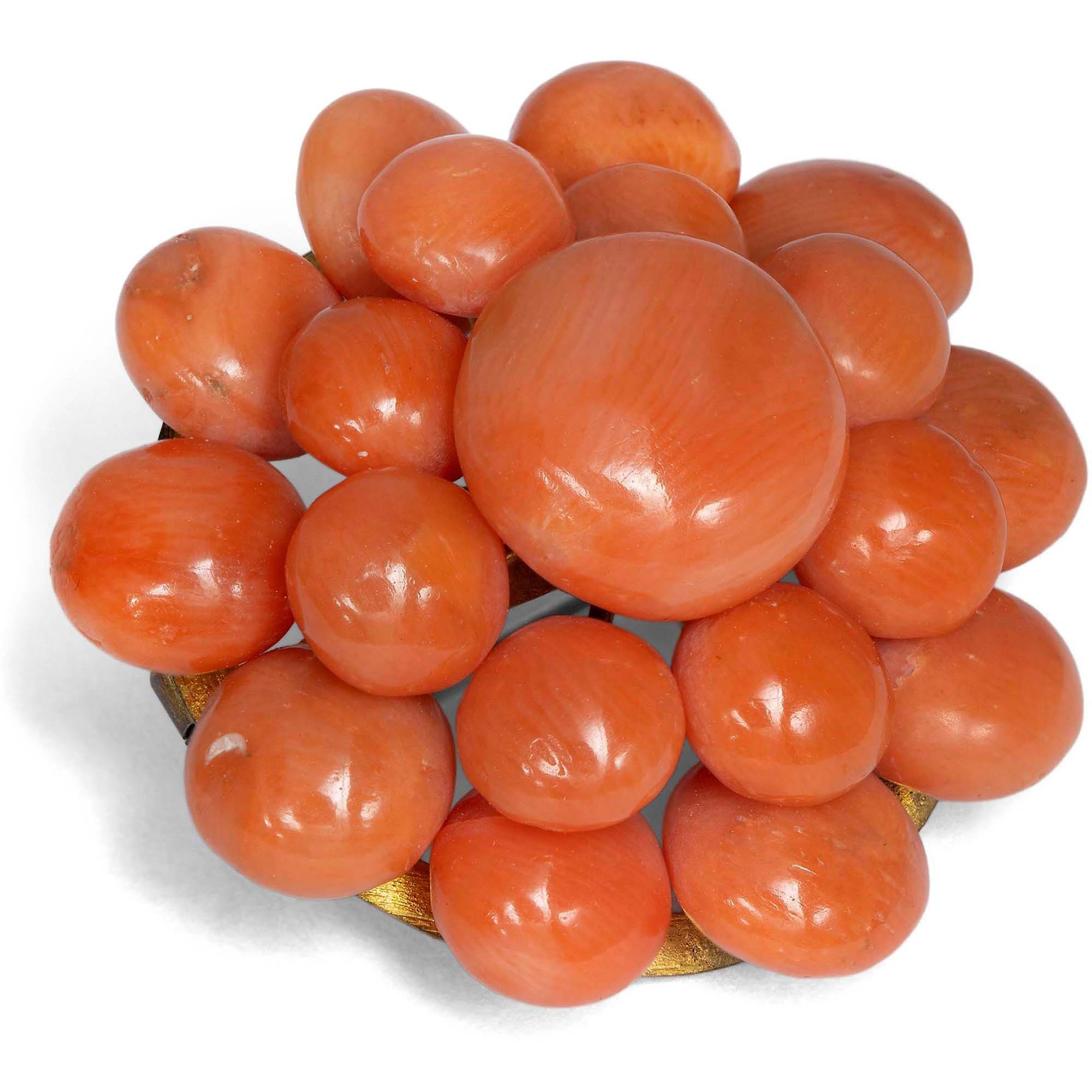 Die Koralle wird bereits seit dem Altertum als Glückszeichen verehrt. Aus dem 17. Jahrhundert etwa ist aus Venedig überliefert, dass die Koralle „Portati dovunque l’huomo sia, ò in casa, ò in nave, scaccia le cattive ombre de gli spiriti, sogni, fulmini, venti, e tempeste e gli diffende da ogni assalto di fiere.“ – „Wo auch immer der Mensch hingehe, ob er zu Hause sei oder mit dem Schiff reise – die Koralle vertreibt die bösen Schatten der Geister, schlechte Träume, Blitze, Winde und Gewitter und schützt vor jedem Unbill.“ In Neapel glaubt man bis heute fest an die magische Kraft der Koralle, sie soll vor dem bösen Blick schützen, Unheil fernhalten und Glück bescheren. Wer also mit dieser Brosche unterwegs ist, dürfte rundum auf der sicheren Seite sein. In der hier vorliegenden Brosche sind die kleinen Glücksbringer aus dem Schoß des Meeres zu einer charmanten Blüte zusammengestellt. Boutons aus lachsroter Mittelmeerkoralle, sogenannter „Corallo Sciacca“, bilden den leuchtenden Besatz, angeordnet auf einer Montierung aus vergoldetem Metall. Das Schmuckstück vibriert geradezu von mediterraner Sonne und guter Laune. Sein Weg führte es aus dem warmen Süden hierher nach Berlin, wo es nun mit neapolitanischem Charme auf sein nächstes Abenteuer wartet. Zitat nach Isabella Palumbo Fossati Casa: Intérieurs vénitiens à la Renaissance. Maisons, société et culture, Paris 2012, S. 276.