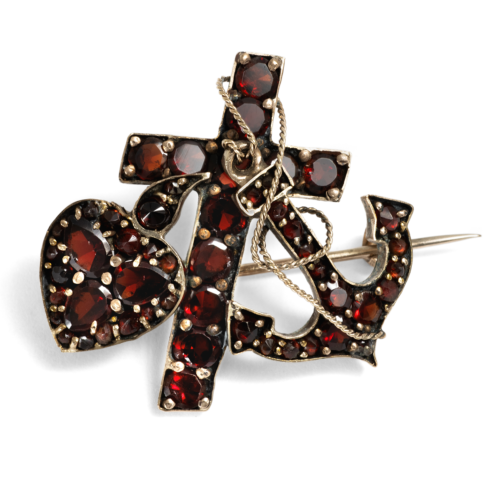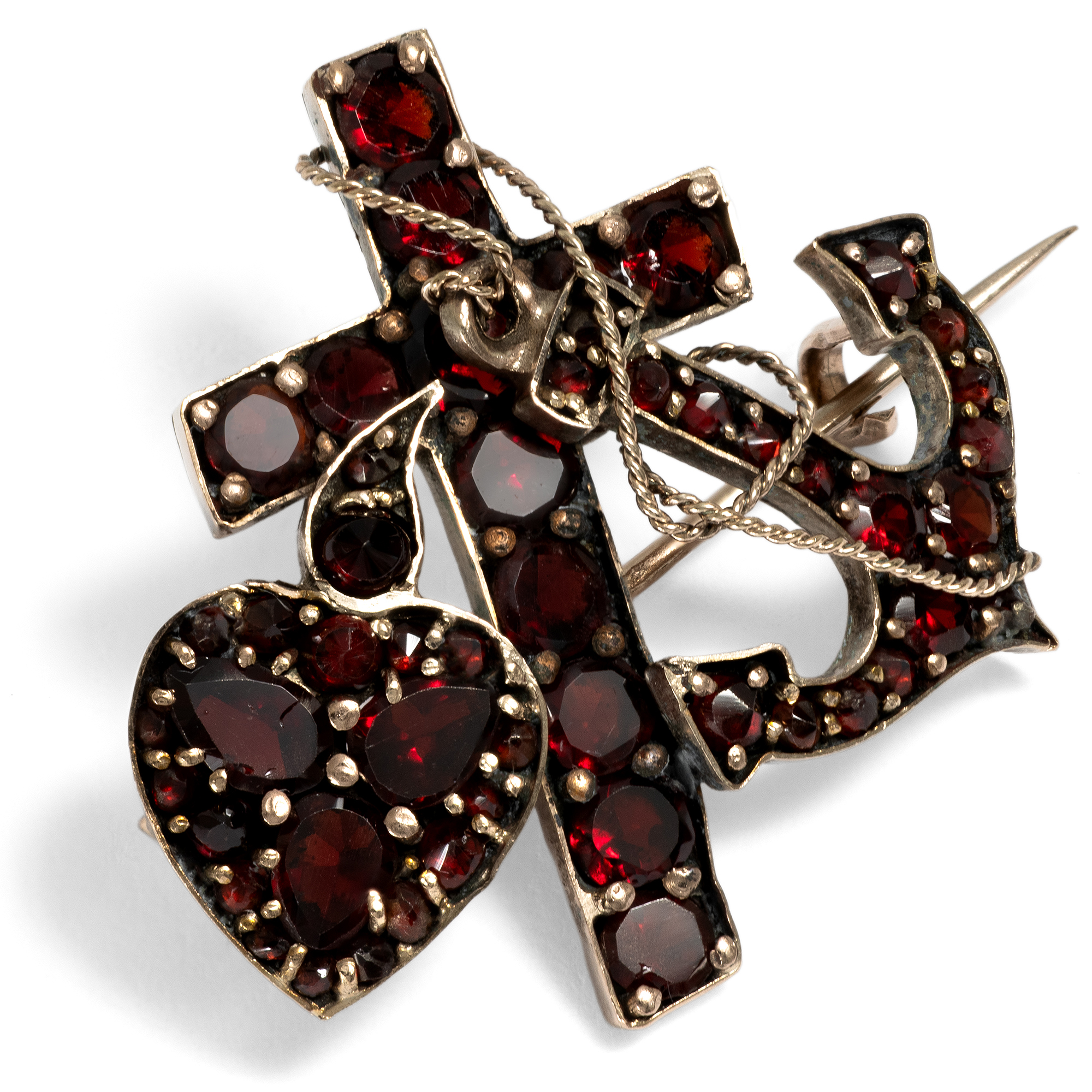 „Für jetzt bleiben Glaube, Hoffnung, Liebe, diese drei; doch am größten unter ihnen ist die Liebe.“ (1 Kor 13,13) Die drei christlichen Tugenden waren oft Thema der bildenden Künste, doch auch Gegenstand im Bereich des Schmucks. Dabei werden einer alten Tradition zufolge Glaube, Liebe und Hoffnung, durch Anker, Herz und Kreuz dargestellt. Die hier vorliegende Brosche präsentiert die drei Symbole in funkelndem Granat. Die Granate aus Böhmen sind im Rosen- und im Tafelschliff geformt und in vergoldetes Tombak gefasst. Schön ist das Details des Taus, dass den Anker und das Kreuz verbindet. Die Brosche ist ausweislich ihrer Verarbeitung in den Jahren um 1900 entstanden. Wir haben sie hier in Berlin als Teil einer größeren Sammlung Granatschmuck aus dem Nachlass eines Juweliers ankaufen können. Sie ist daher sehr wahrscheinlich bislang noch nie getragen worden. Gleichwohl ist das Metall stellenweise leicht angelaufen.