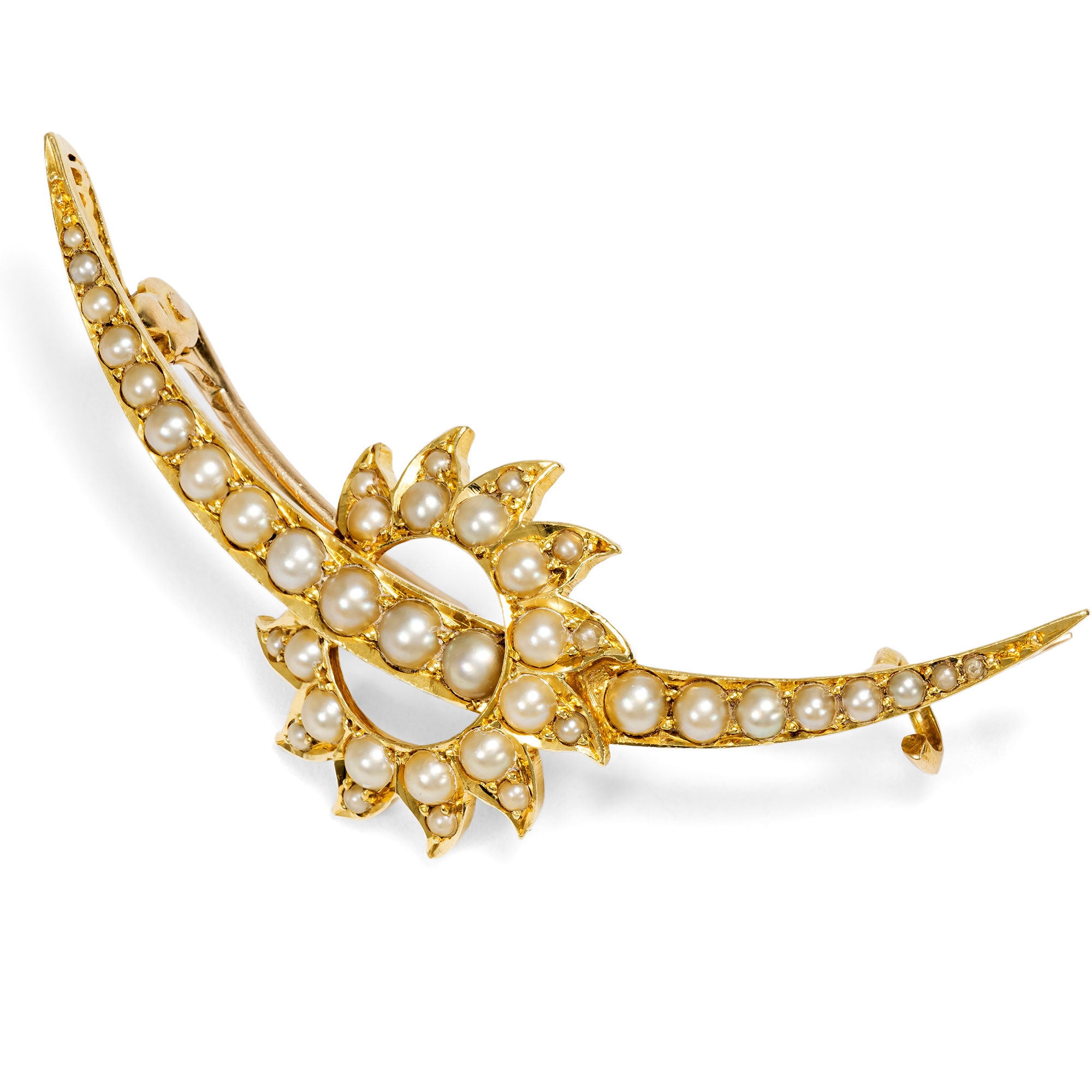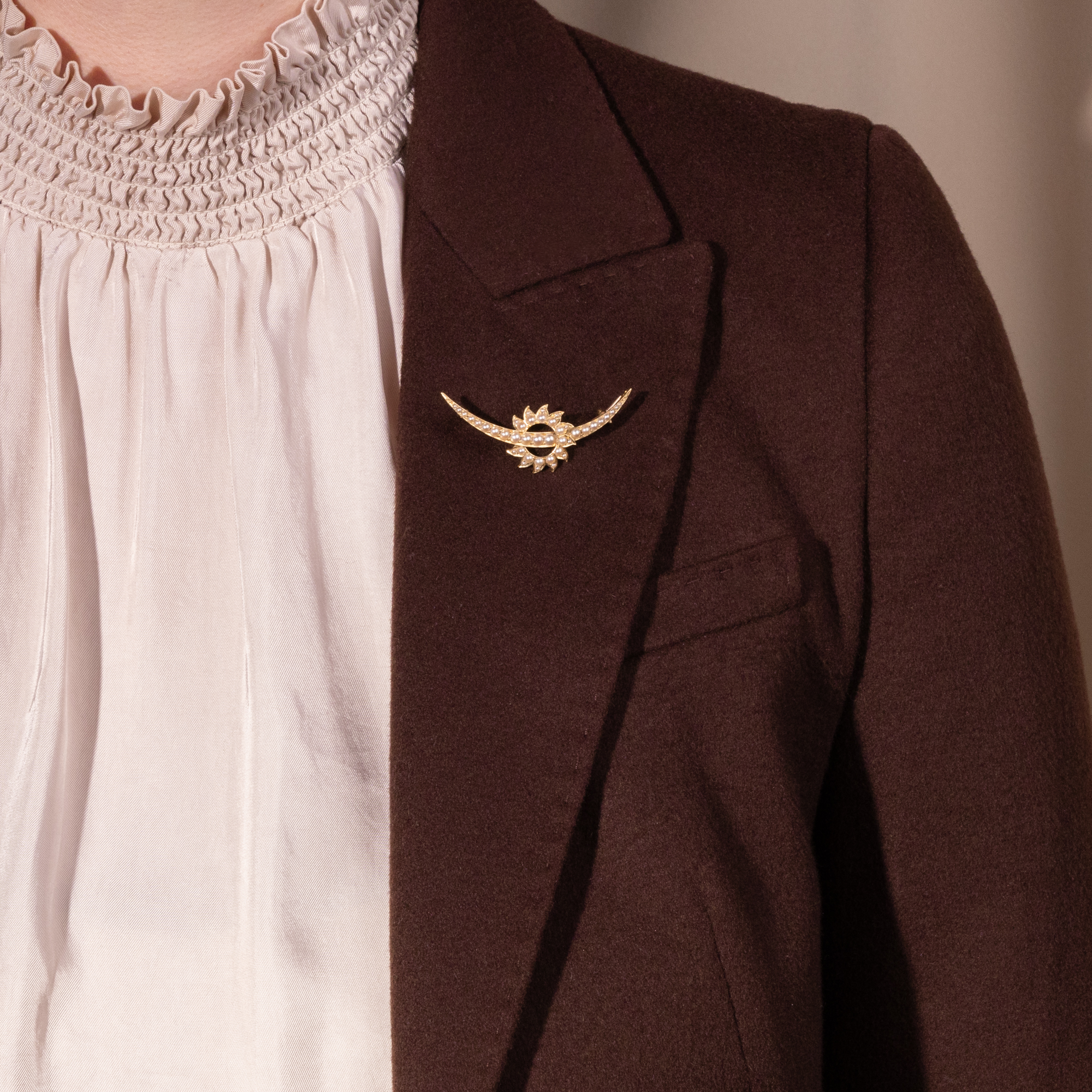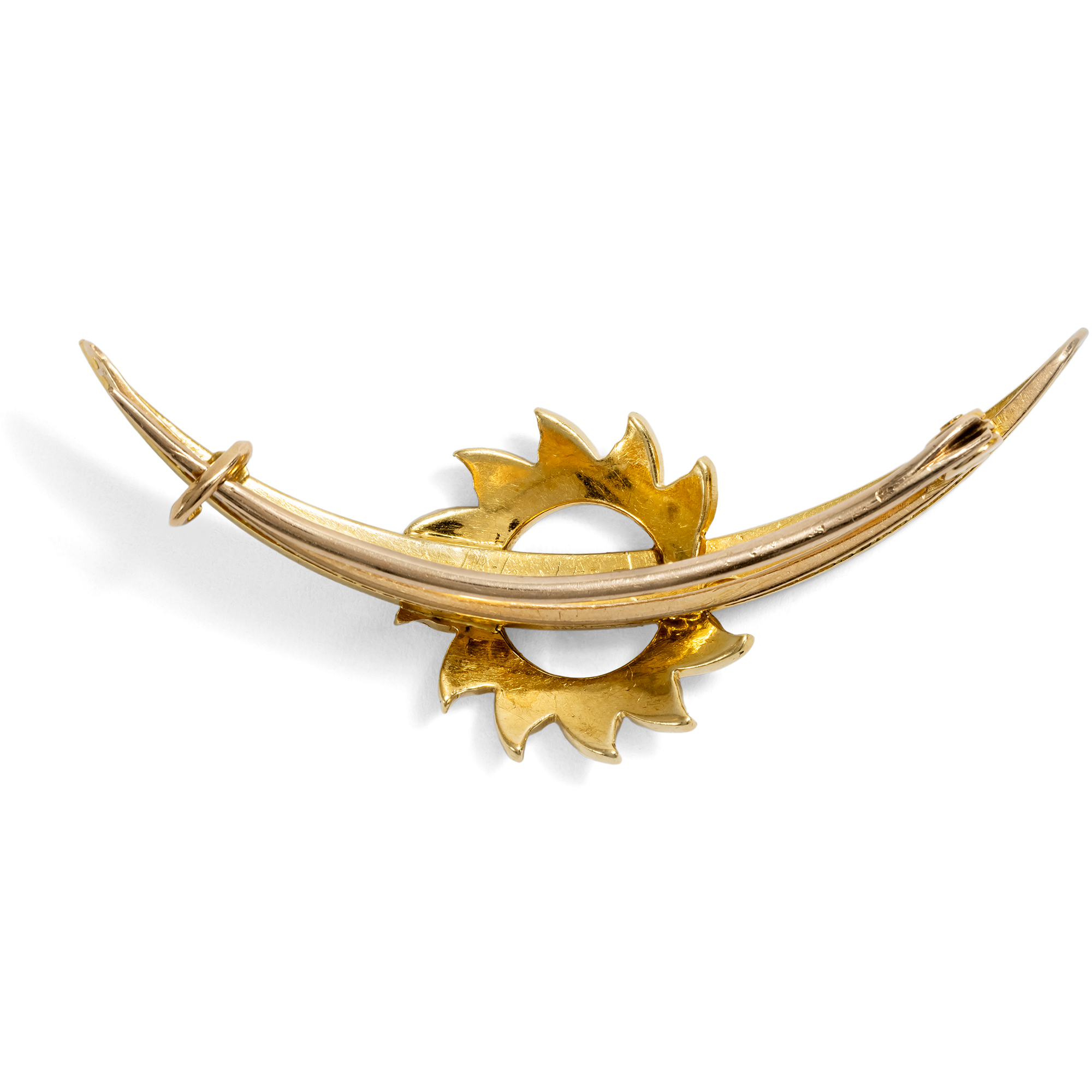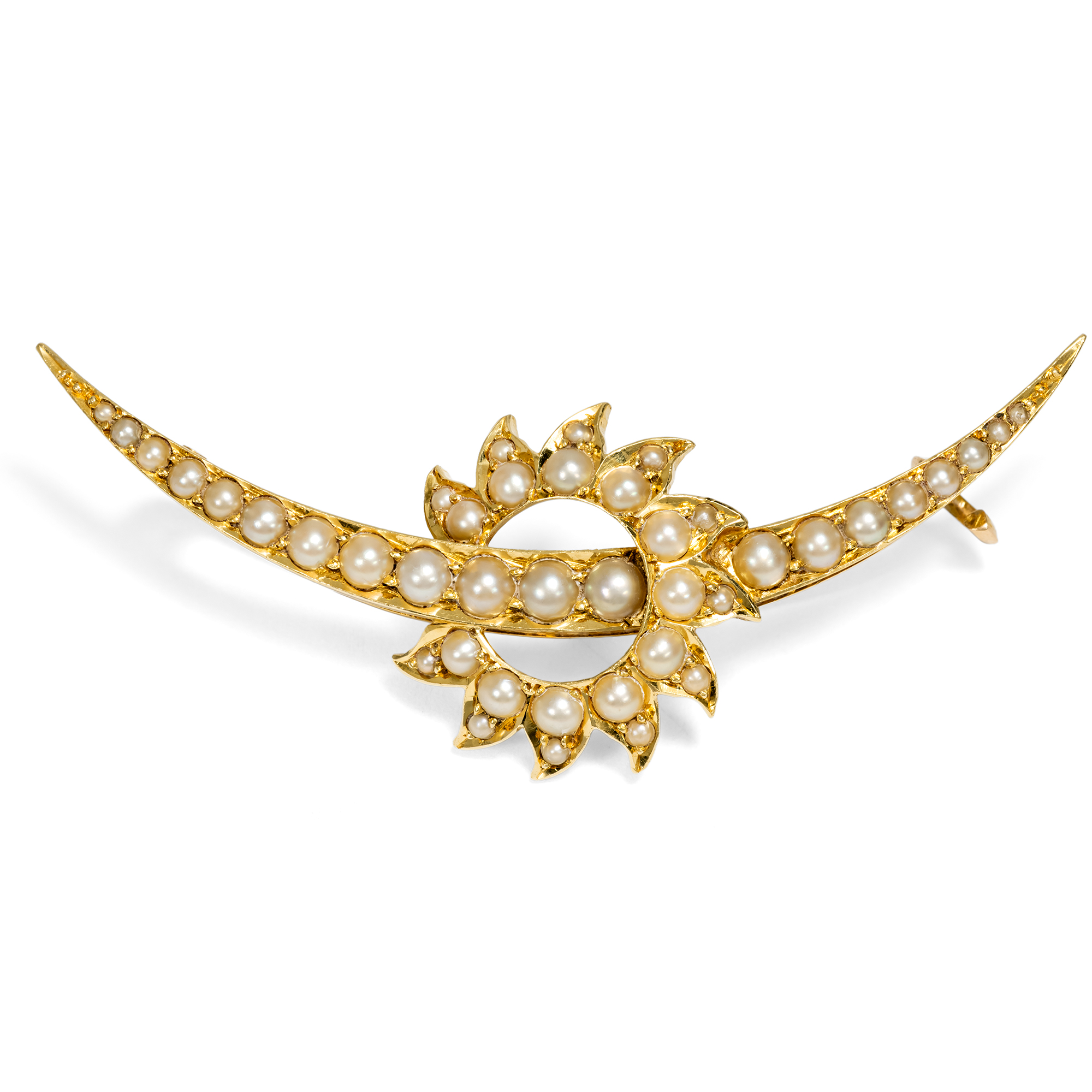Himmelskörper sind ein immer wiederkehrendes Motiv im Schmuck der viktorianischen und edwardianischen Epoche. Sonnen, Monde, Sterne, selbst Kometen: Mal funkeln sie kühl im Licht großer Diamanten in Silber, mal glänzen sie im warmen Lüster von Perlen in Gold, ab und an gesellen sich auch Farbedelsteine dazu. Selten ist es jedoch, gleich zwei dieser Motive vereint zu sehen. In der hier vorliegenden Brosche windet sich ein schmaler Sichelmond durch die Strahlen einer gleißenden Sonne. Die verwendeten Materialien nehmen das Licht der beiden Himmelskörper auf: Die Perlen glänzen weich und kühl wie der Mond, das Gold strahlt im warmen Glanz der Sonne. Tatsächlich sind beide Materialien auch kulturhistorisch mit den jeweiligen Himmelskörpern verknüpft. So erzählte man sich im Mittelalter vom Ursprung der Perle, die Muschel würde nachts zur Meeresoberfläche steigen und durch die reinen, weißen Mondstrahlen die Perle empfangen. Die Sonne hingegen ist das klassische Symbol des Goldes in der Alchemie. Wir konnten die schöne Brosche in London entdecken. Sie ist ein wunderbar erhaltenes antikes Accessoire, wie es um 1900 auf der Insel Hochkonjunktur hatte.