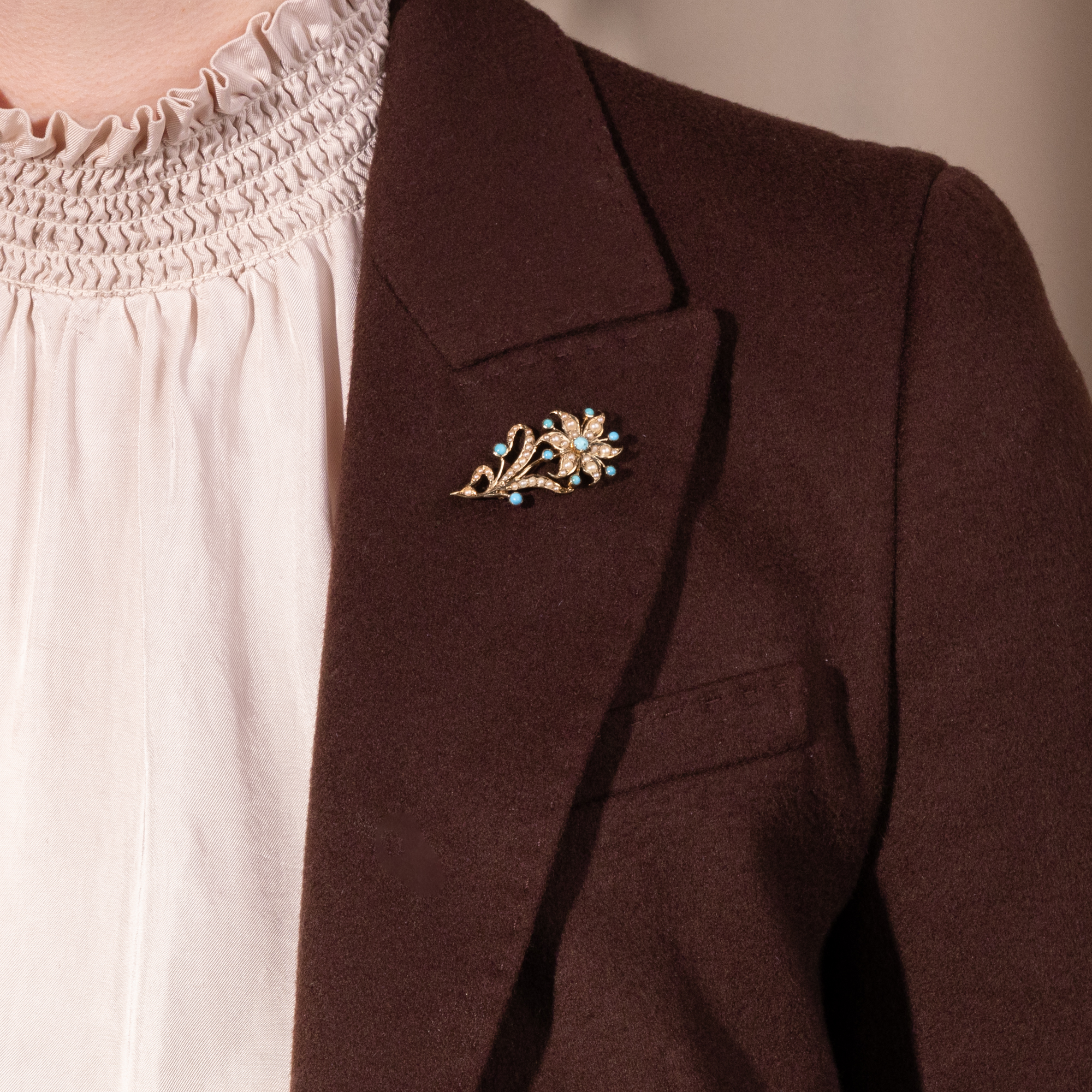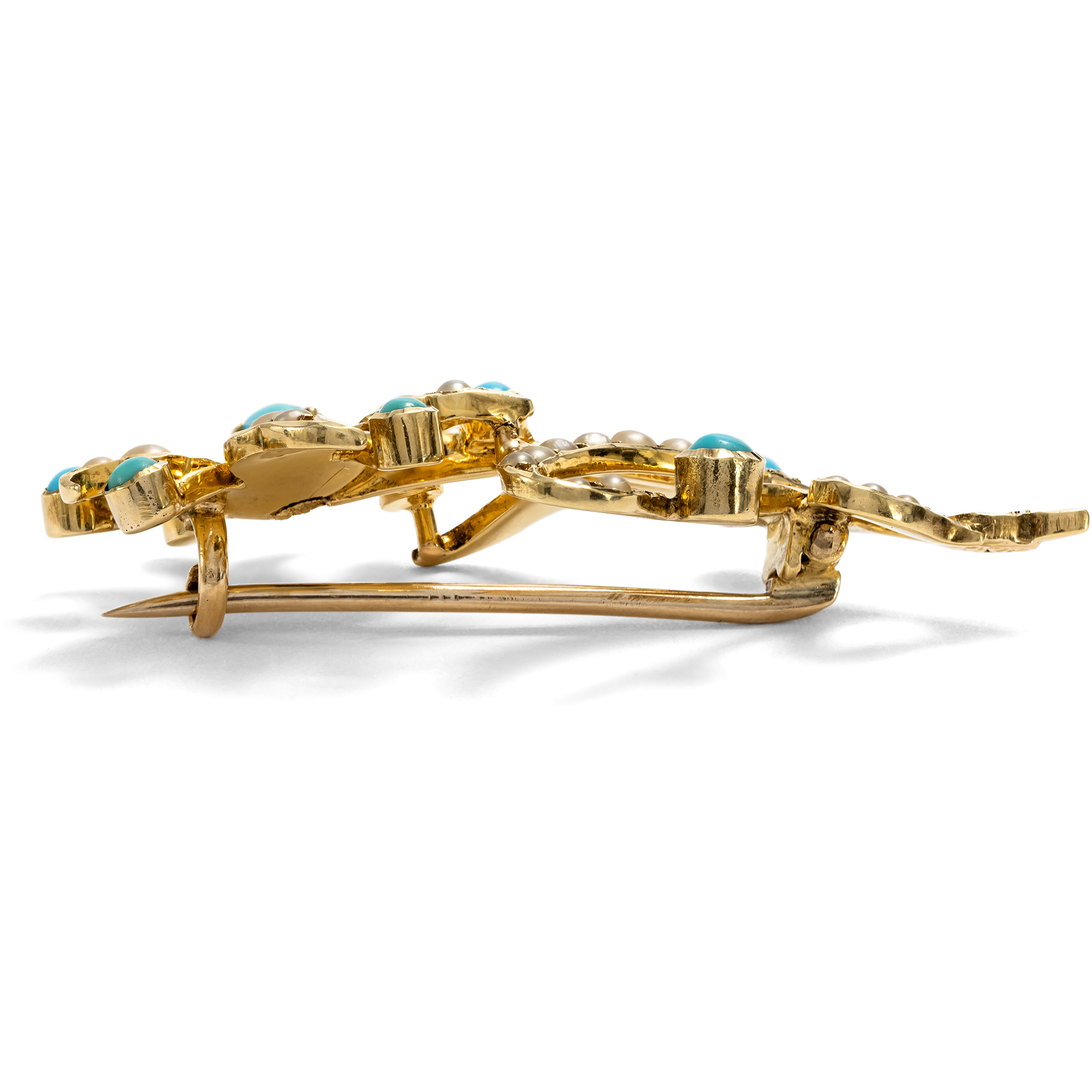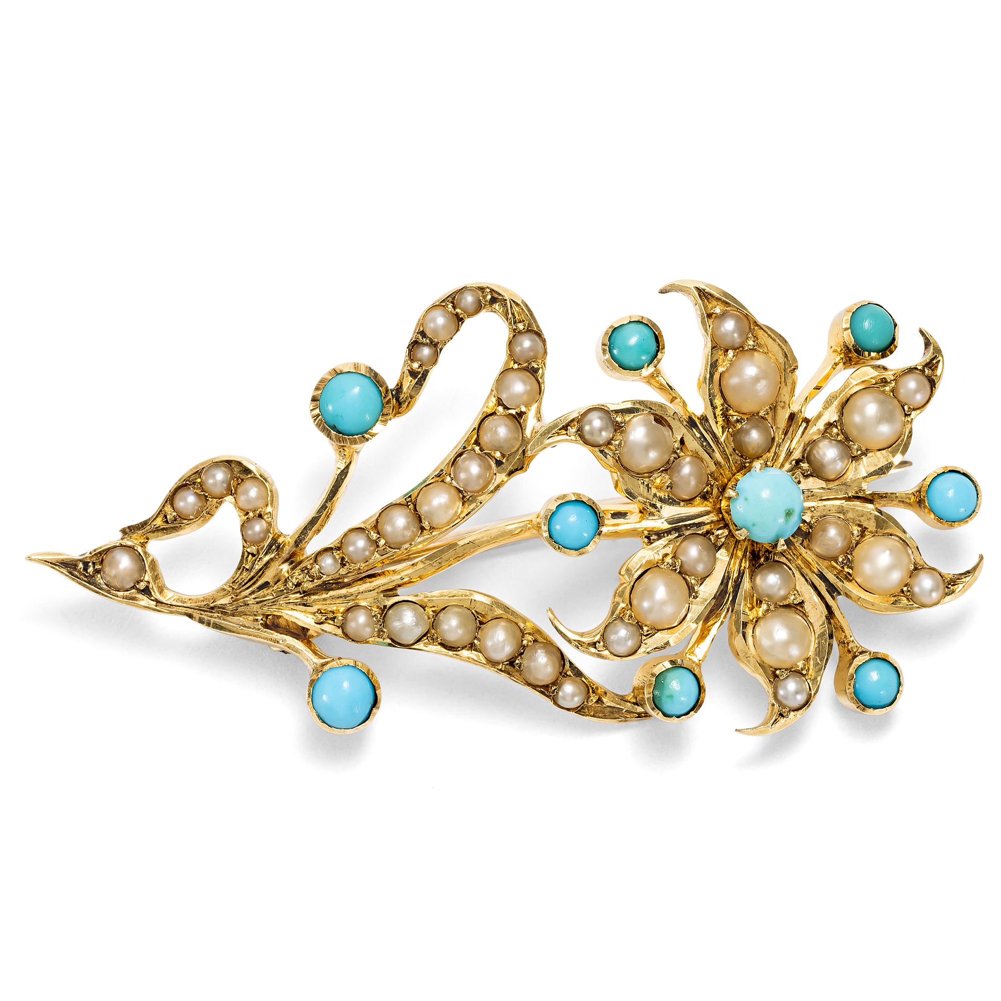 Antike Brosche mit Türkisen & Perlen in Gold, England um 1900