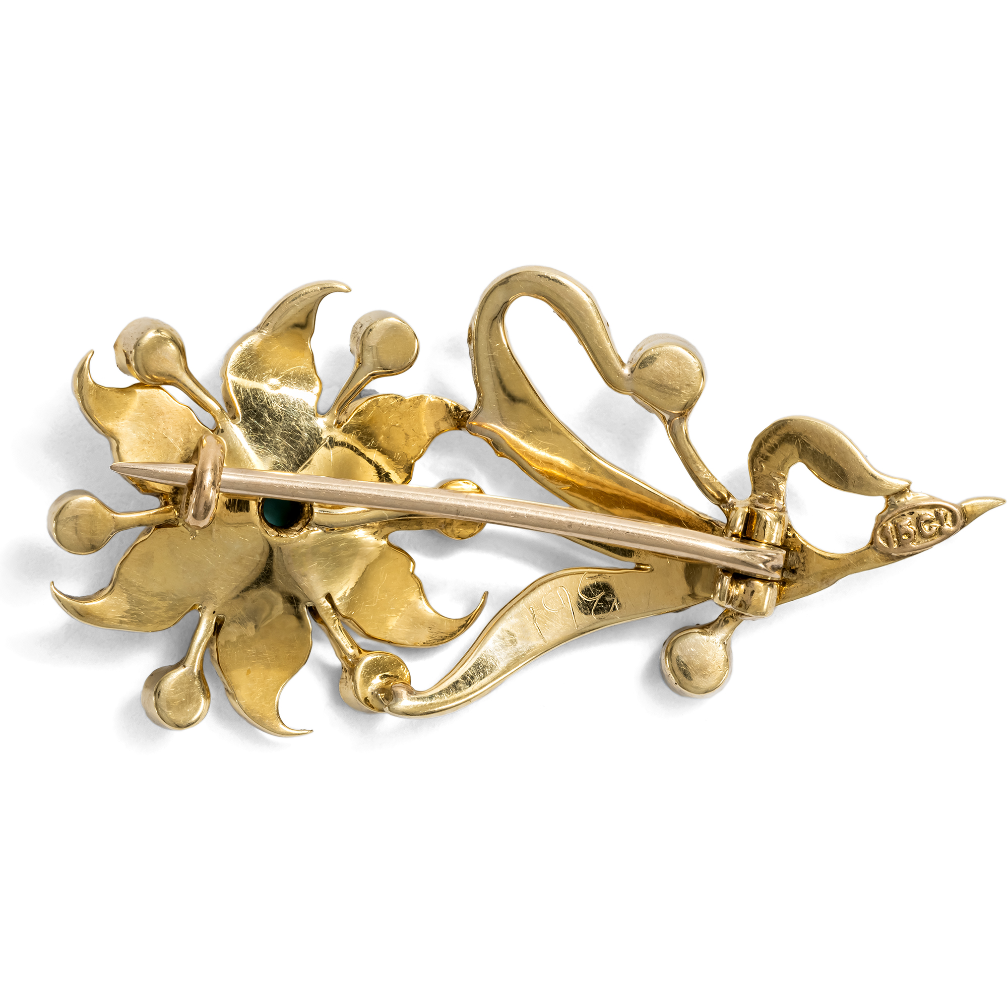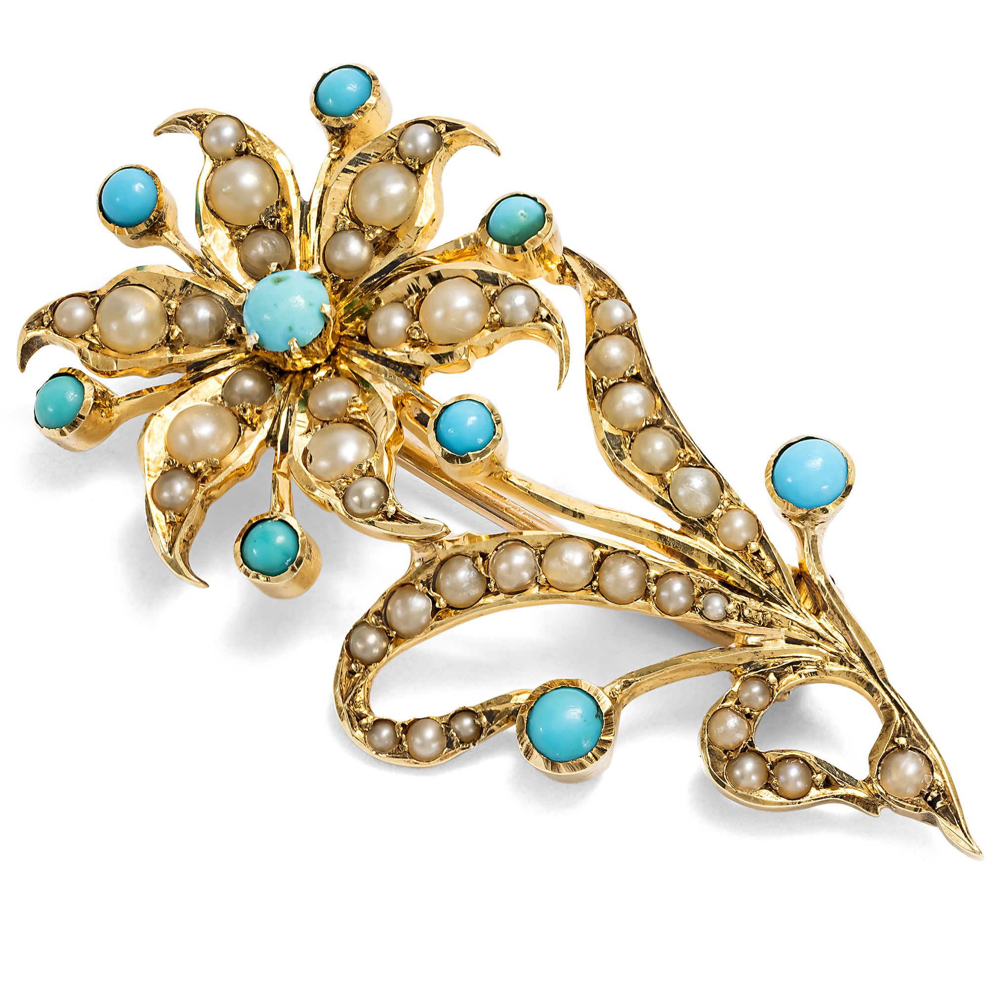 Jedes Land und jede Epoche hat ihre eigenen Moden, die sich mal mehr, mal weniger von jenen anderer Länder und Zeiten unterscheiden. In Großbritannien finden wir, vielleicht durch die Insellage begünstigt, im 19. und frühen 20. Jahrhundert gleich mehrere ganz eigene Moden. Eine dieser Leidenschaften ist die Liebe zu Schmuck aus warm leuchtenden Gelbgold, ausgefasst mit zahllosen kleinen Perlen und Farbsteinen – ein sehr schönes Beispiel hierfür sehen wir hier. Eine bezaubernde Blume aus Gold ist mit Perlen und Türkisen besetzt. Die Farbe der Türkise – der Ton des Vergissmeinnichts – und das reine Weiß der Perlen ergänzen sich wunderbar. Der Gelbgoldton fügt eine warme Grundstimmung hinzu. Die Datierung und Herkunft des Stückes bestätigt nicht zuletzt der Goldstempel: 15-karätiges Gold wurde in Großbritannien nur bis 1932 verwendet. Die Blume, deren Materialien leise das Lied der Liebe singen (vergissmeinnichtfarbige Türkise galten im 19. Jahrhundert als Steine der Liebe, ebenso wie die Perle) ist erstklassig erhalten. Wir haben sie in London gefunden und freuen uns, sie Ihnen hier vorstellen zu dürfen.