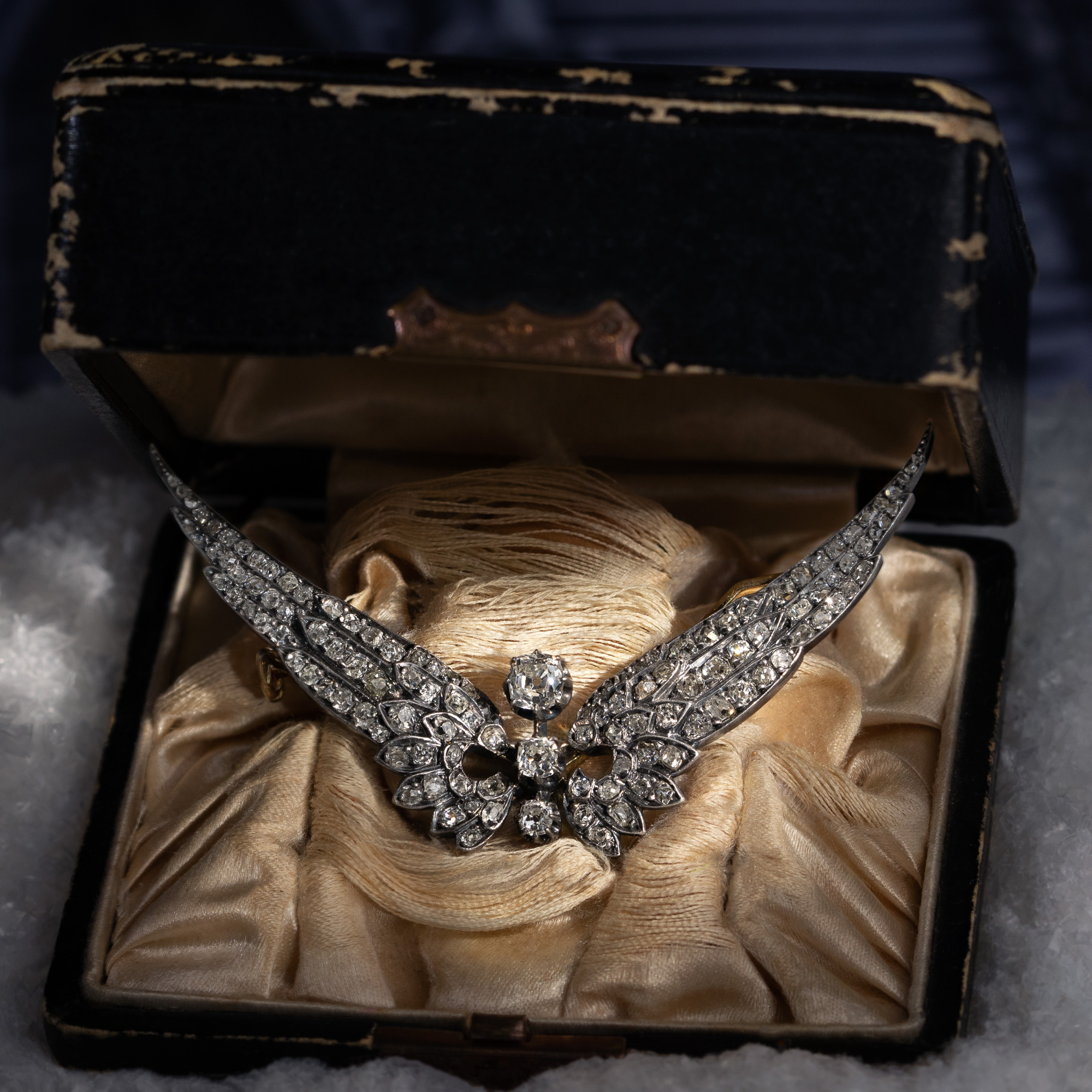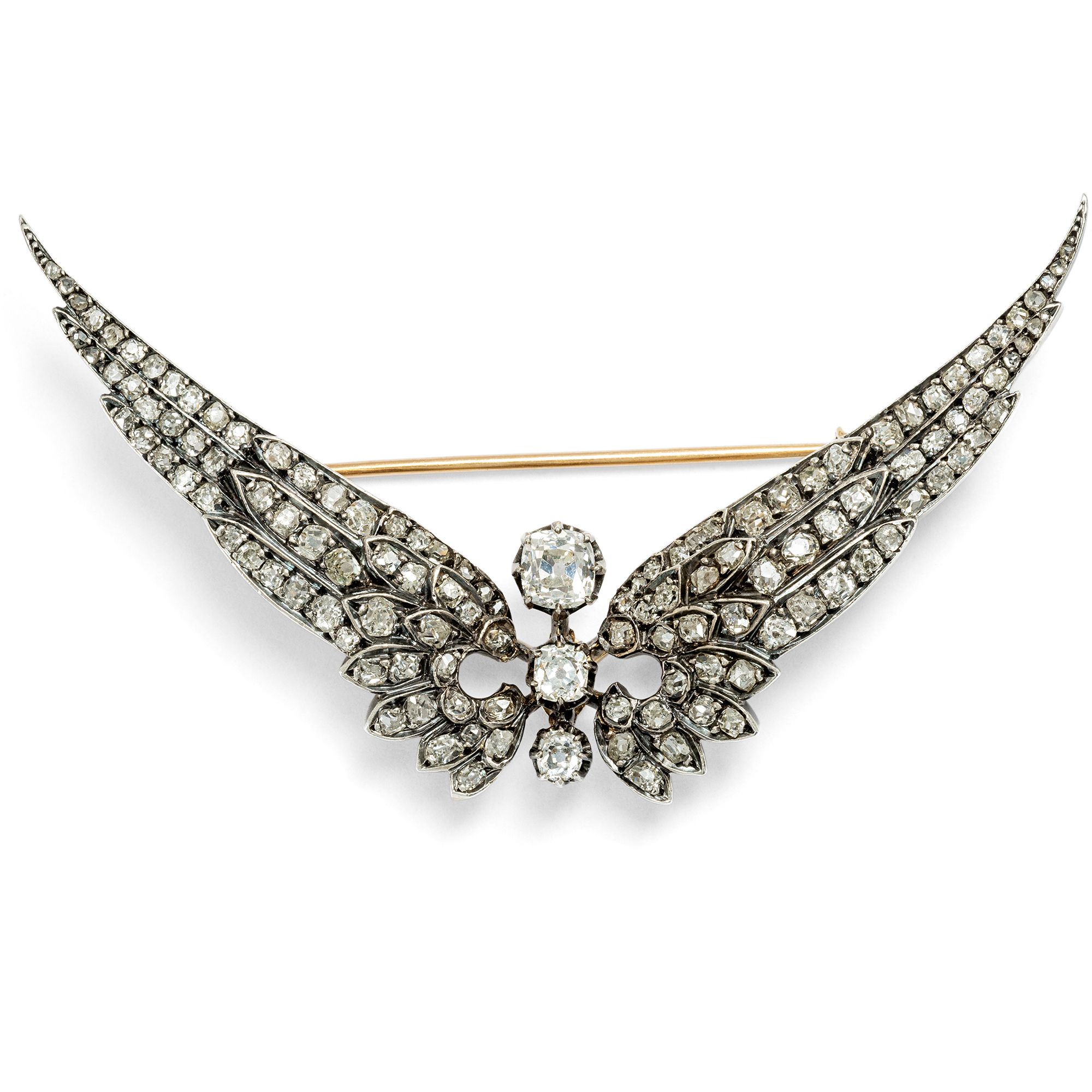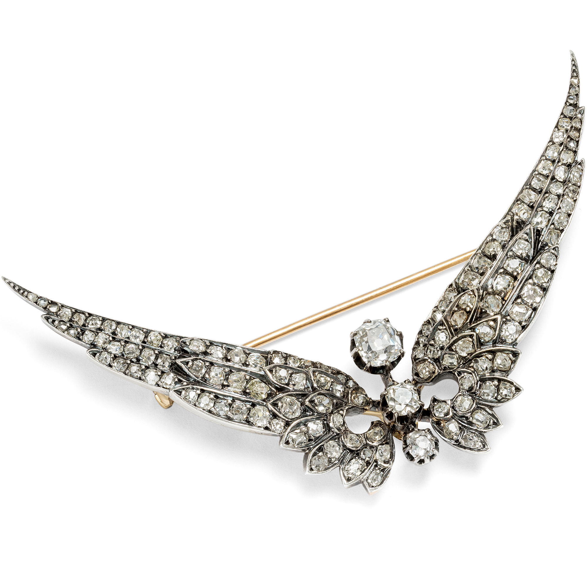 Eine neue Mode beflügelte im wahrsten Sinne des Wortes die eleganten Damen der High Society der 1890er Jahre: die sog. Mercury Wings (Merkurflügel), benannt nach dem geflügelten Gott. Sie wurden in Perlen, Diamanten und anderen Edelsteinen ausgeführt und als Brosche am Dekolleté sowie oftmals auch als Aigrette im Haar getragen, wobei sie zu letzterem mit wirklichen Federn kombiniert wurden. Schon 1893 berichtete das amerikanische Journal The Jewelers' Circular, 'The Mercury wings are now introduced in jewels and feathers for the hair.' (Die Merkurflügel werden nun als Schmuck und als Federn für das Haar eingeführt.) Das hier vorliegende Paar Schwingen ist besonders kostbar ausgestattet. Insgesamt etwa 3,59 ct Diamanten in historischen Schliffen besetzen die Oberfläche, die naturalistisch gestaltet ist und wie wirkliche Federn anmutet. Die drei größten Diamanten im leicht kissenförmigen Old Mine Cut besetzen als vertikale Reihe das Zentrum der Brosche. Um dieser neuen Mode mit einem so opulent ausgestatteten Modell folgen zu können, bediente sich die erste Trägerin des Stückes ganz offensichtlich der damals beliebten Methode, die Diamanten aus Erbstücken ausfassen zu lassen und hier in Zweitverwendung einzusetzen – so ließen sich Materialkosten sparen. Viele der Diamantschliffe datieren eindeutig in frühere Dekaden des 19. Jahrhunderts. Die symmetrische Ausrichtung und nach oben angewinkelten Flügel zeigen, dass Broschen wie diese zentral am Ausschnitt getragen wurden, dessen Linie sie somit folgten. Vergleichen Sie hierzu auch das 1904 entstandene Portrait der Susannah Pearson von Sir Frank Dicksee. Zusätzlich ließ sich die Broschnadel einst durch eine Haarnadel austauschen, die im Laufe der Generationen jedoch – wie dies beinahe immer der Fall ist – verloren ging. Die Brosche ist sehr gut erhalten. Sie erreichte uns aus Frankreich, doch wurde sie zuvor dorthin importiert und entstand vermutlich in Großbritannien. Die Mode für Flügelbroschen war international, wie auch Berichte aus amerikanischen Modejournalen zeigen. Anbei bilden wir eine Seite aus dem französischen Entwurfswerk Le Bijou ab, welches im Oktober 1897 eine ganz ähnliche Brosche zeigte. Das Zitat nach Elsie Bee, 'Fashions in Jewelry and Silverware', The Jewelers' Circular, 22. November 1893, S. 37.