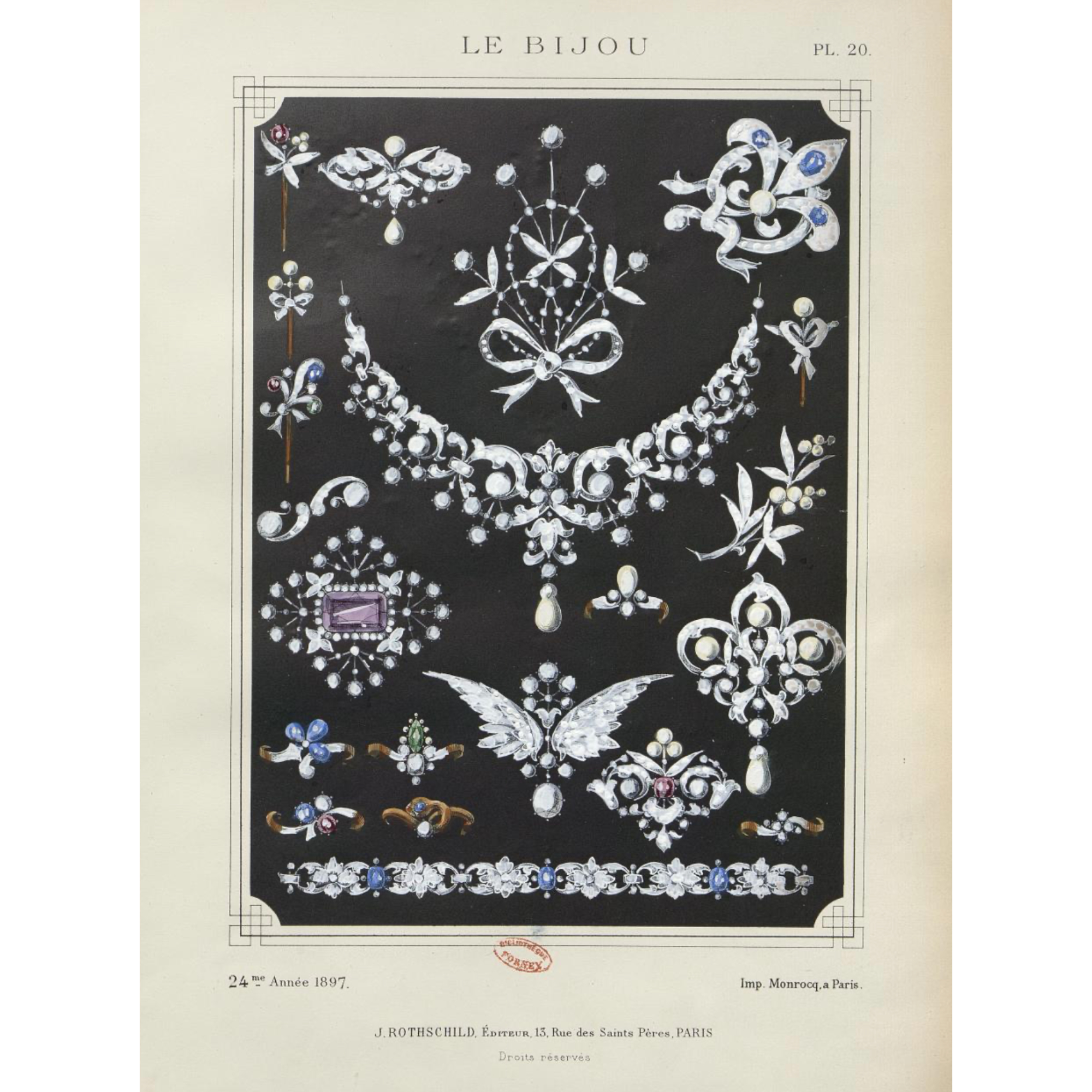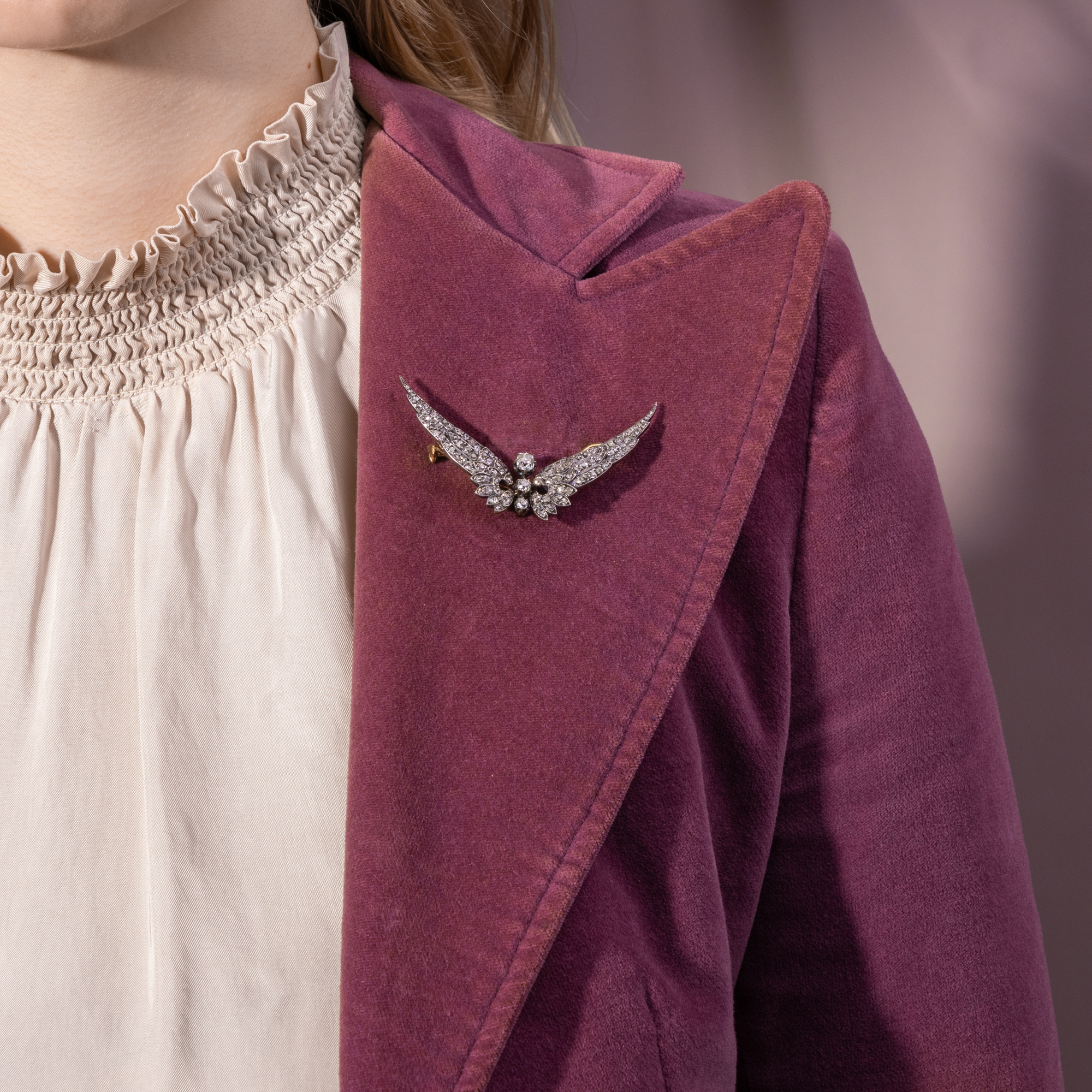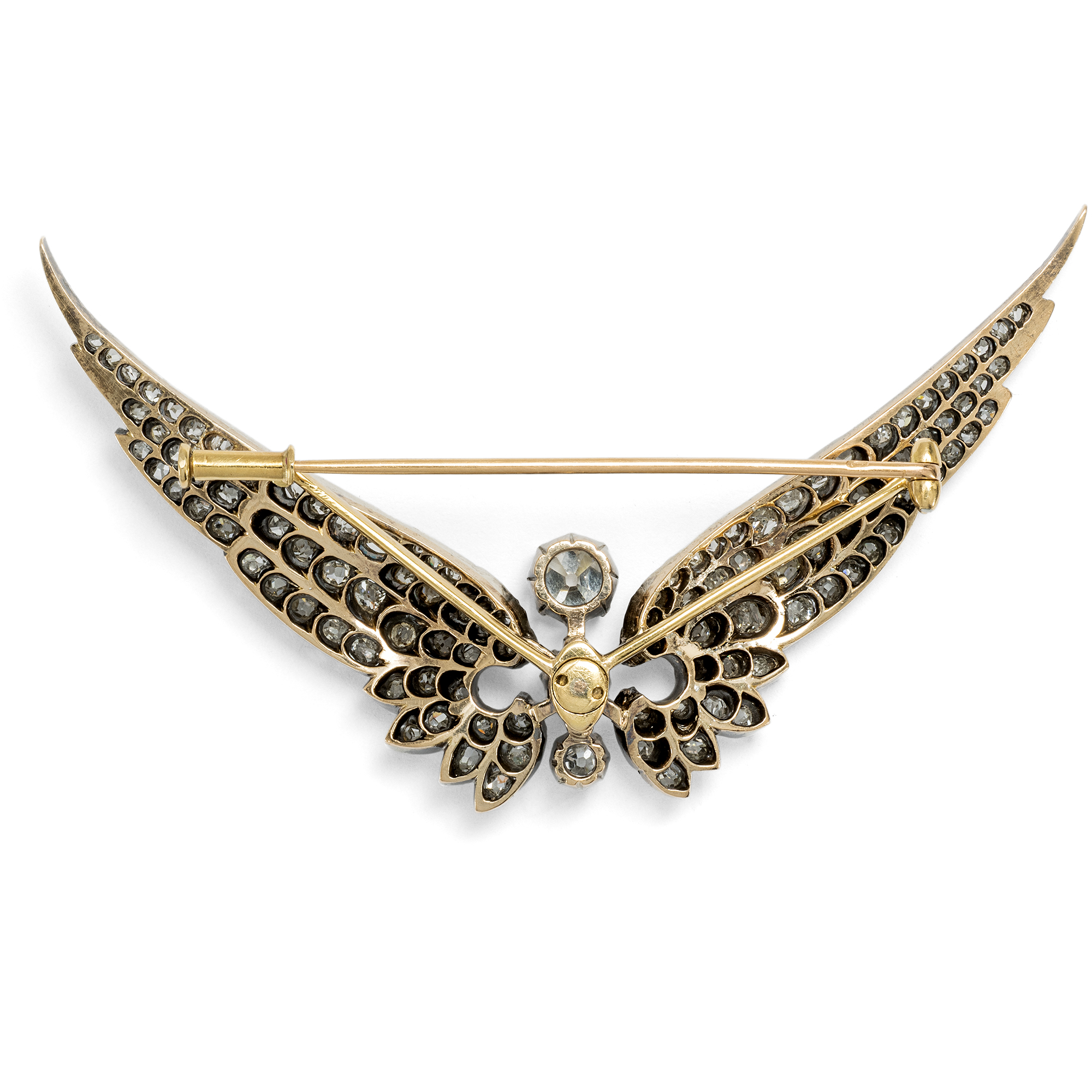Eine neue Mode beflügelte im wahrsten Sinne des Wortes die eleganten Damen der High Society der 1890er Jahre: die sog. Mercury Wings (Merkurflügel), benannt nach dem geflügelten Gott. Sie wurden in Perlen, Diamanten und anderen Edelsteinen ausgeführt und als Brosche am Dekolleté sowie oftmals auch als Aigrette im Haar getragen, wobei sie zu letzterem mit wirklichen Federn kombiniert wurden. Schon 1893 berichtete das amerikanische Journal The Jewelers' Circular, 'The Mercury wings are now introduced in jewels and feathers for the hair.' (Die Merkurflügel werden nun als Schmuck und als Federn für das Haar eingeführt.) Das hier vorliegende Paar Schwingen ist besonders kostbar ausgestattet. Insgesamt etwa 3,59 ct Diamanten in historischen Schliffen besetzen die Oberfläche, die naturalistisch gestaltet ist und wie wirkliche Federn anmutet. Die drei größten Diamanten im leicht kissenförmigen Old Mine Cut besetzen als vertikale Reihe das Zentrum der Brosche. Um dieser neuen Mode mit einem so opulent ausgestatteten Modell folgen zu können, bediente sich die erste Trägerin des Stückes ganz offensichtlich der damals beliebten Methode, die Diamanten aus Erbstücken ausfassen zu lassen und hier in Zweitverwendung einzusetzen – so ließen sich Materialkosten sparen. Viele der Diamantschliffe datieren eindeutig in frühere Dekaden des 19. Jahrhunderts. Die symmetrische Ausrichtung und nach oben angewinkelten Flügel zeigen, dass Broschen wie diese zentral am Ausschnitt getragen wurden, dessen Linie sie somit folgten. Vergleichen Sie hierzu auch das 1904 entstandene Portrait der Susannah Pearson von Sir Frank Dicksee. Zusätzlich ließ sich die Broschnadel einst durch eine Haarnadel austauschen, die im Laufe der Generationen jedoch – wie dies beinahe immer der Fall ist – verloren ging. Die Brosche ist sehr gut erhalten. Sie erreichte uns aus Frankreich, doch wurde sie zuvor dorthin importiert und entstand vermutlich in Großbritannien. Die Mode für Flügelbroschen war international, wie auch Berichte aus amerikanischen Modejournalen zeigen. Anbei bilden wir eine Seite aus dem französischen Entwurfswerk Le Bijou ab, welches im Oktober 1897 eine ganz ähnliche Brosche zeigte. Das Zitat nach Elsie Bee, 'Fashions in Jewelry and Silverware', The Jewelers' Circular, 22. November 1893, S. 37.