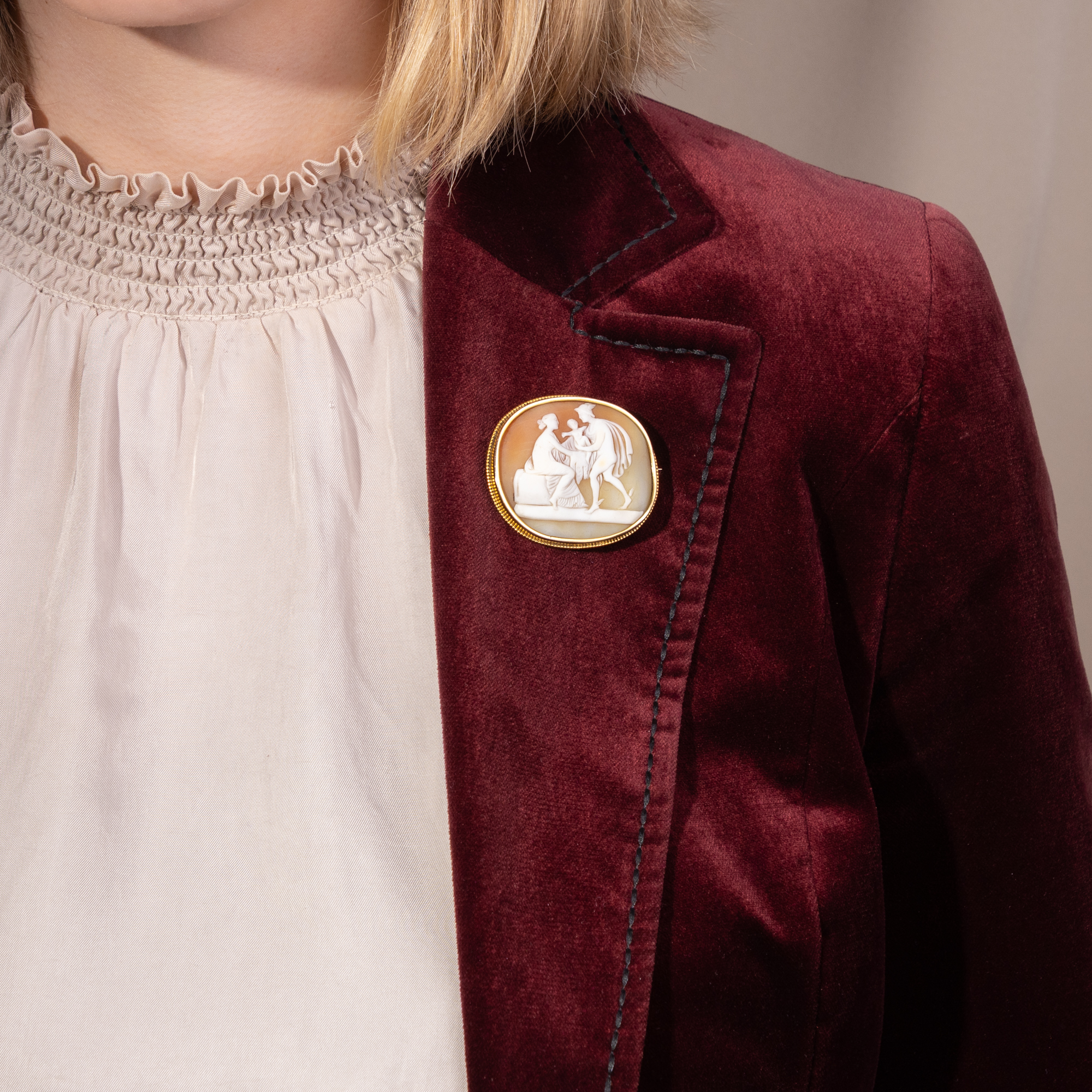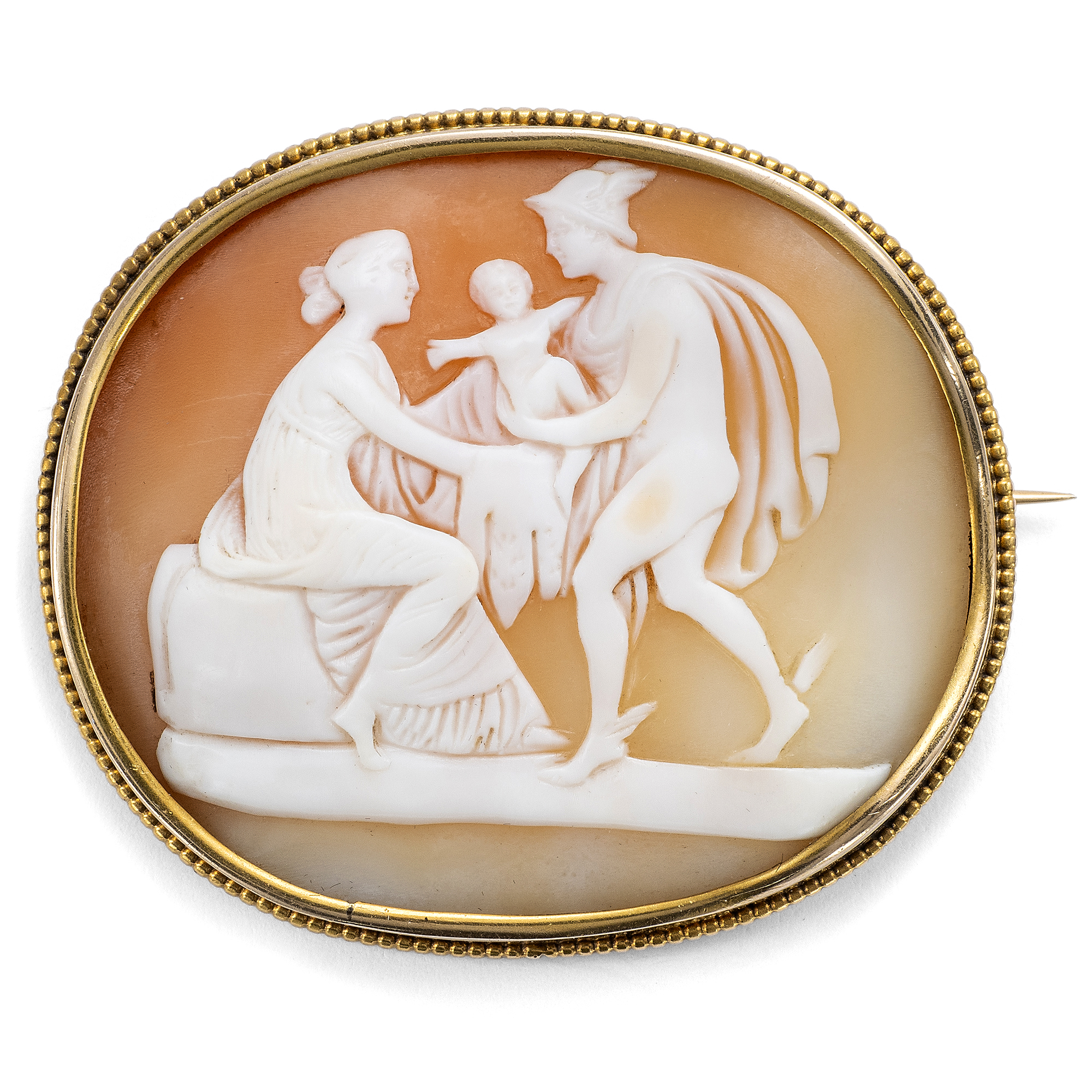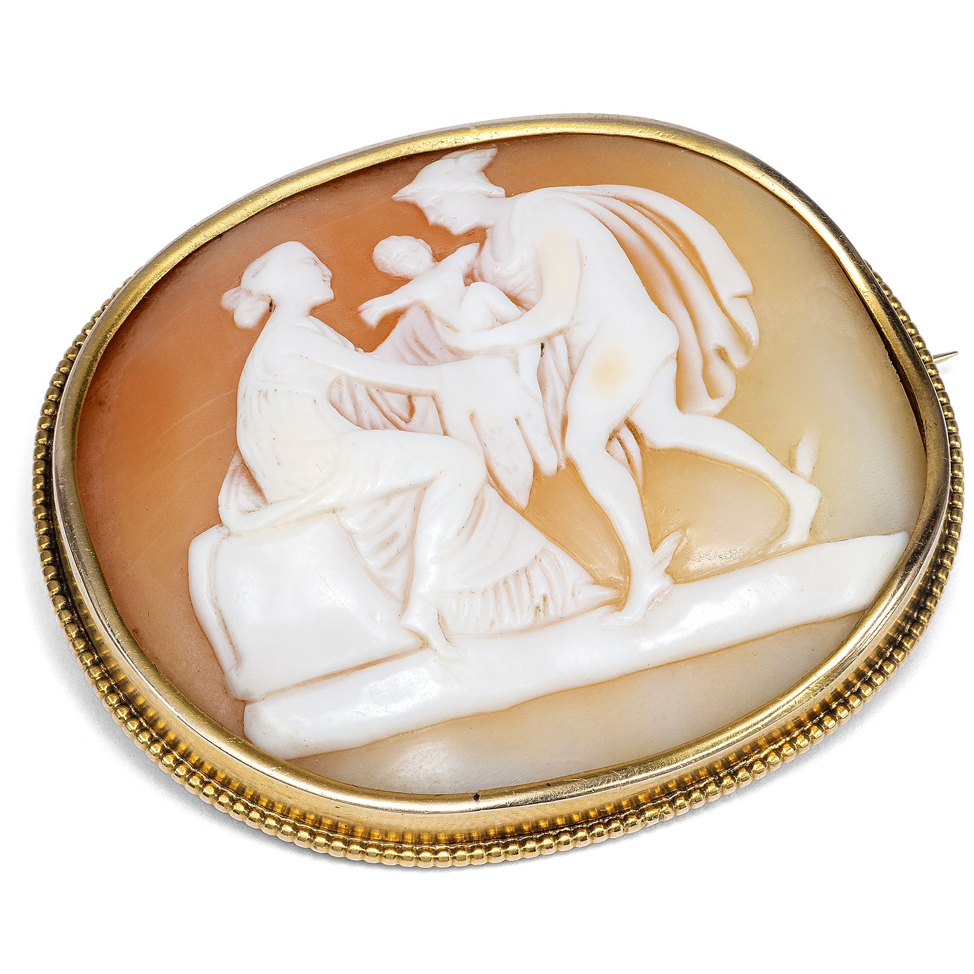 Die vorliegende Brosche präsentiert eine feingeschnittene Kamee aus Muschelschale: Wir sehen eine männliche Figur, die mit leicht vorwärtsgerichteter Bewegung auf eine sitzende weibliche Gestalt zutritt und ihr ein kleines Kind überreicht. Die Figuren sind durch ihre Gesten und Blicke in einer Diagonalen verbunden, während das Kind den Mittelpunkt der Darstellung bildet. Die Szene geht auf einen antiken Mythos zurück: Das Kind ist Bacchus (griechisch Dionysos), Sohn des höchsten Gottes Jupiter (Zeus) und der sterblichen Semele, einer Tochter des thebanischen Königs Kadmos. Jupiters Gemahlin Juno (Hera), eifersüchtig auf die Affäre, täuschte Semele und brachte sie dazu, Jupiter in seiner göttlichen Gestalt erscheinen zu lassen. Da kein Mensch den Anblick eines Gottes in voller Macht ertragen kann, verbrannte Semele dabei. Jupiter rettete das ungeborene Kind und ließ es weiter heranreifen, bis es geboren werden konnte. Um es vor Junos Verfolgung zu schützen, übergab er den Säugling dem Götterboten Merkur (Hermes), hier erkennbar an seinem geflügelten Hut und seinen Schuhen, der das Kind zu Semeles Schwester Ino brachte. Ino und ihr Gemahl Athamas nahmen Bacchus auf und zogen ihn auf. Die Darstellung unserer Kamee geht auf ein Relief zurück, das der dänische Bildhauer Bertel Thorvaldsen im Jahr 1809 in Rom schuf, und von dem mehrere Ausführungen überliefert sind. Wir bilden anbei ein Marmorrelief nach diesem Vorbild ab, das im Thorvaldsens Museum in Kopenhagen verwahrt ist und das auch online eingesehen werden kann, an dieser Stelle. Die Kamee entstand nach einer Stichvorlage dieser Bildfindung vermutlich am Golf von Neapel in Italien. Gehalten wird die querovale Gemme von einer schlichten Goldfassung mit umlaufendem Perlstab. Die in den Jahren um 1900 entstandene Arbeit ist sehr schön erhalten und fand hier in Berlin zu uns.