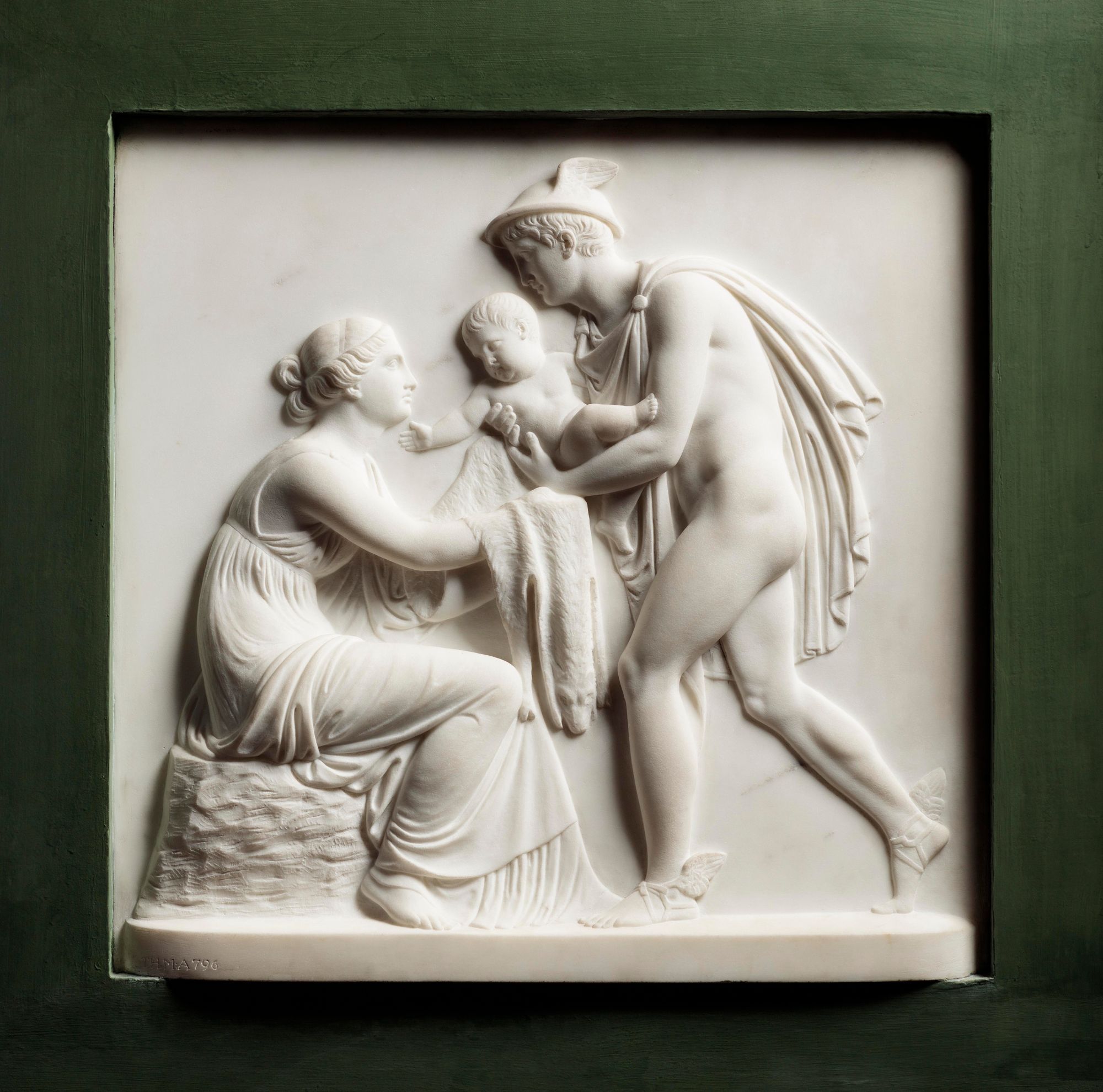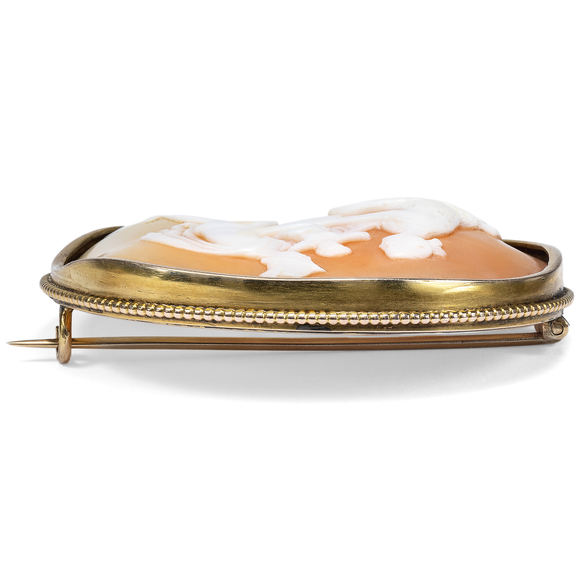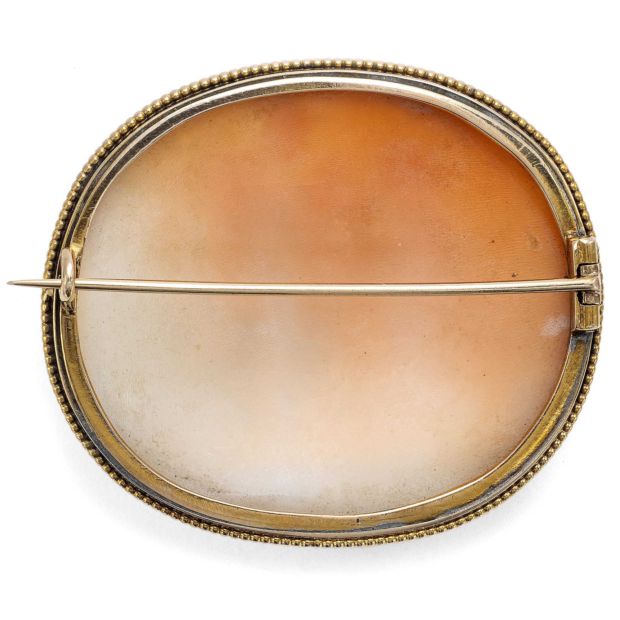 Die vorliegende Brosche präsentiert eine feingeschnittene Kamee aus Muschelschale: Wir sehen eine männliche Figur, die mit leicht vorwärtsgerichteter Bewegung auf eine sitzende weibliche Gestalt zutritt und ihr ein kleines Kind überreicht. Die Figuren sind durch ihre Gesten und Blicke in einer Diagonalen verbunden, während das Kind den Mittelpunkt der Darstellung bildet. Die Szene geht auf einen antiken Mythos zurück: Das Kind ist Bacchus (griechisch Dionysos), Sohn des höchsten Gottes Jupiter (Zeus) und der sterblichen Semele, einer Tochter des thebanischen Königs Kadmos. Jupiters Gemahlin Juno (Hera), eifersüchtig auf die Affäre, täuschte Semele und brachte sie dazu, Jupiter in seiner göttlichen Gestalt erscheinen zu lassen. Da kein Mensch den Anblick eines Gottes in voller Macht ertragen kann, verbrannte Semele dabei. Jupiter rettete das ungeborene Kind und ließ es weiter heranreifen, bis es geboren werden konnte. Um es vor Junos Verfolgung zu schützen, übergab er den Säugling dem Götterboten Merkur (Hermes), hier erkennbar an seinem geflügelten Hut und seinen Schuhen, der das Kind zu Semeles Schwester Ino brachte. Ino und ihr Gemahl Athamas nahmen Bacchus auf und zogen ihn auf. Die Darstellung unserer Kamee geht auf ein Relief zurück, das der dänische Bildhauer Bertel Thorvaldsen im Jahr 1809 in Rom schuf, und von dem mehrere Ausführungen überliefert sind. Wir bilden anbei ein Marmorrelief nach diesem Vorbild ab, das im Thorvaldsens Museum in Kopenhagen verwahrt ist und das auch online eingesehen werden kann, an dieser Stelle. Die Kamee entstand nach einer Stichvorlage dieser Bildfindung vermutlich am Golf von Neapel in Italien. Gehalten wird die querovale Gemme von einer schlichten Goldfassung mit umlaufendem Perlstab. Die in den Jahren um 1900 entstandene Arbeit ist sehr schön erhalten und fand hier in Berlin zu uns.