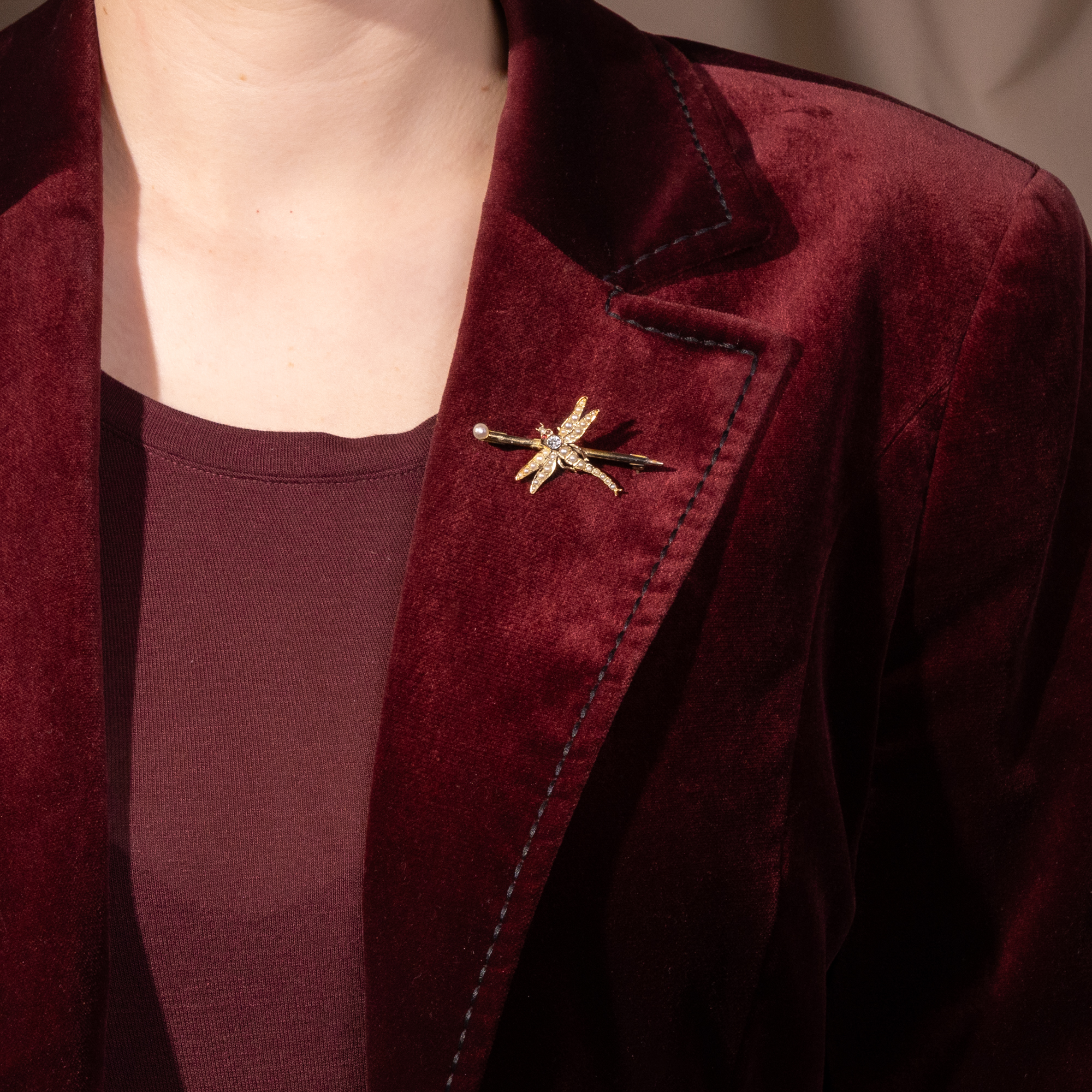 Schmuck war zur Zeit der Jahrhundertwende ein ebenso selbstverständlicher Teil der Garderobe der Dame wie Jacke, Hut oder Handschuhe. Am Abend trug man Diamanten und kostbare große Edelsteine, die im neuen elektrischen Licht der Ballsäle glitzerten. Am Tage jedoch hätten solch prachtvolle Juwelen als unfein gegolten – zumal im Frühjahr und Sommer, wenn die Temperaturen nur zarte Stoffe erlaubten. Hier nun griff man zu eleganten, leichten Schmuckstücken aus Gold und Perlen. Die hier vorliegende Libellen-Brosche entspricht allen Ansprüchen an den Schmuck für einen sonnigen Tag und ist wunderbar detailreich verarbeitet. Das Insekt hat sich auf einem Goldstab niedergelassen. Schimmernde Perlen bedecken seinen Schwanz und seine Flügel, während ein schöner Altschliff-Diamant die Leibesmitte bildet. Zwei rote Glassteine verleihen der Libelle einen geheimnisvollen Blick. Wir haben das schöne Schmuckstück in London entdeckt und in Großbritannien ist es vermutlich auch einst entstanden.