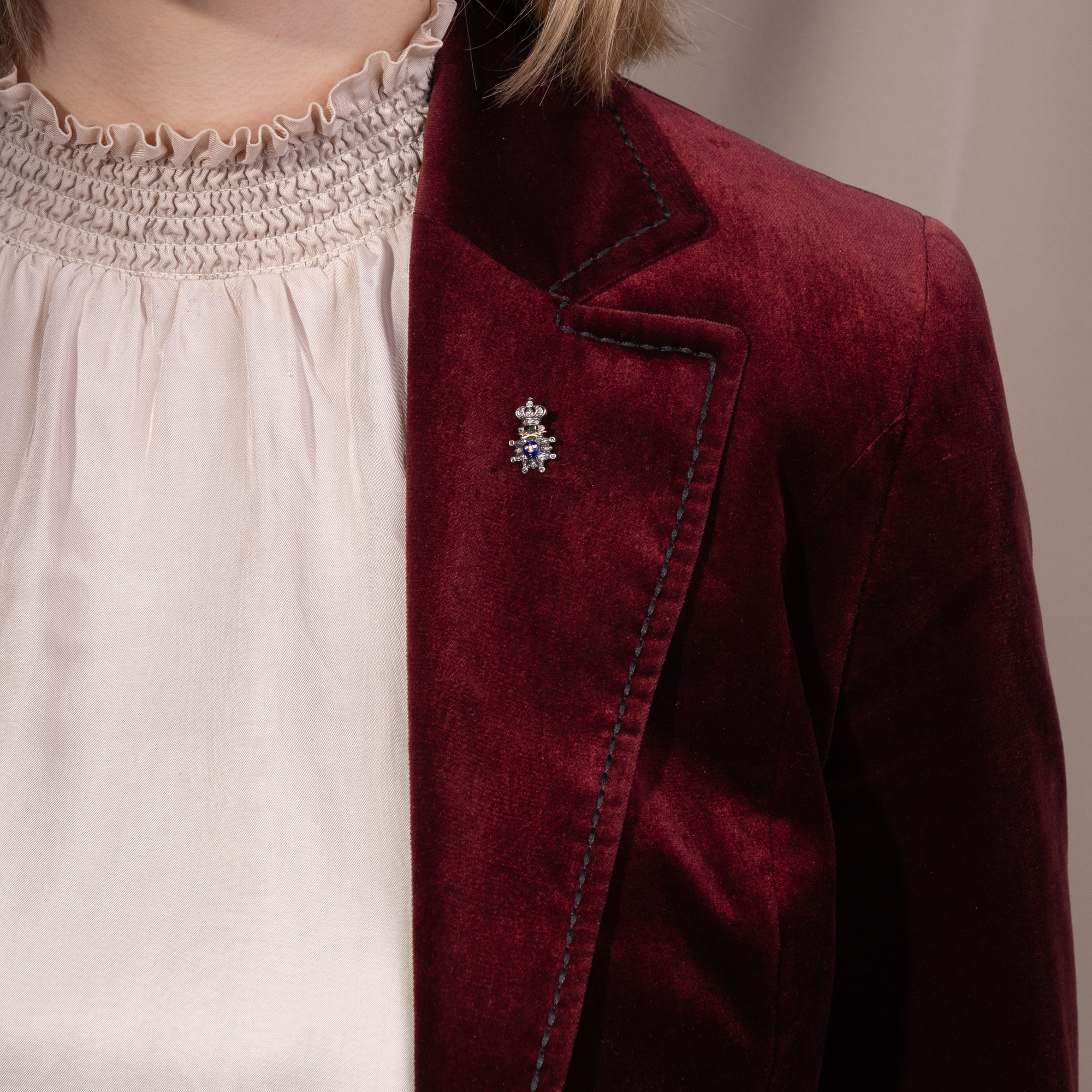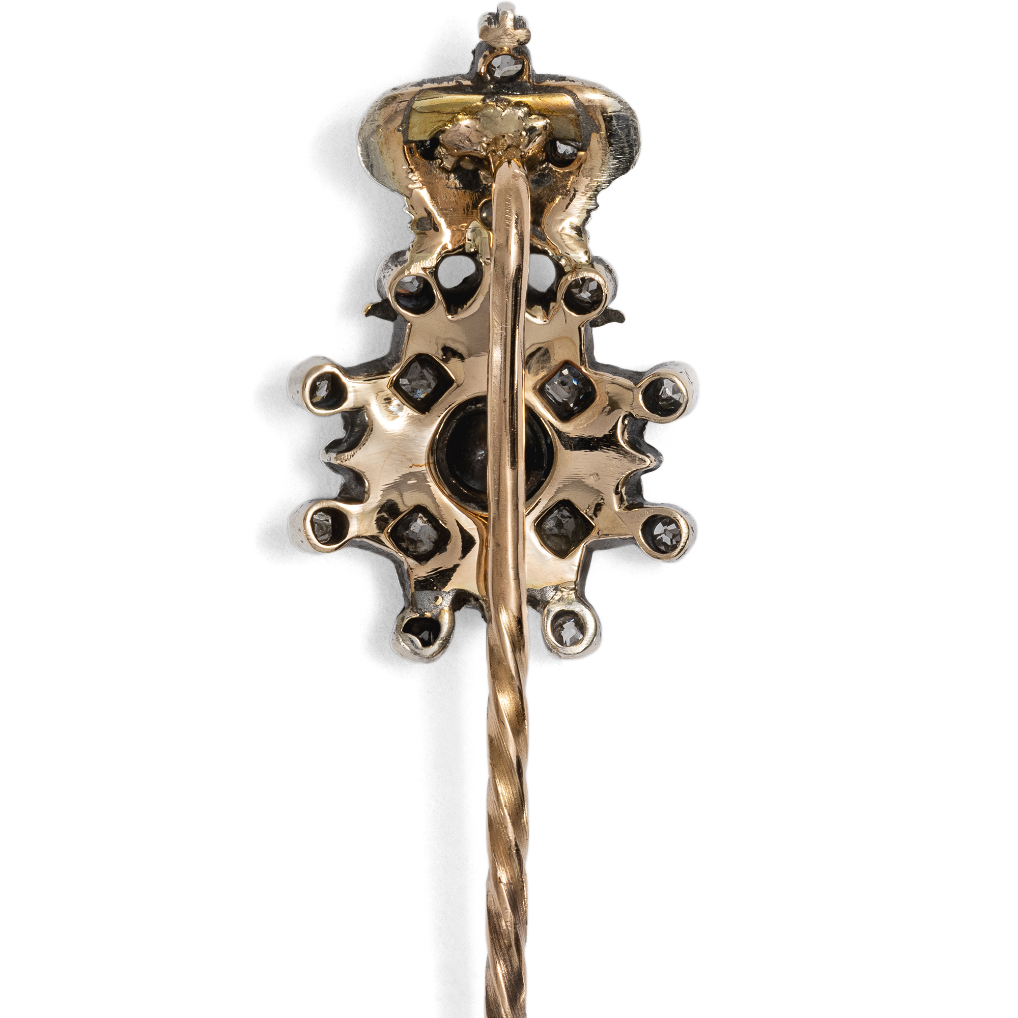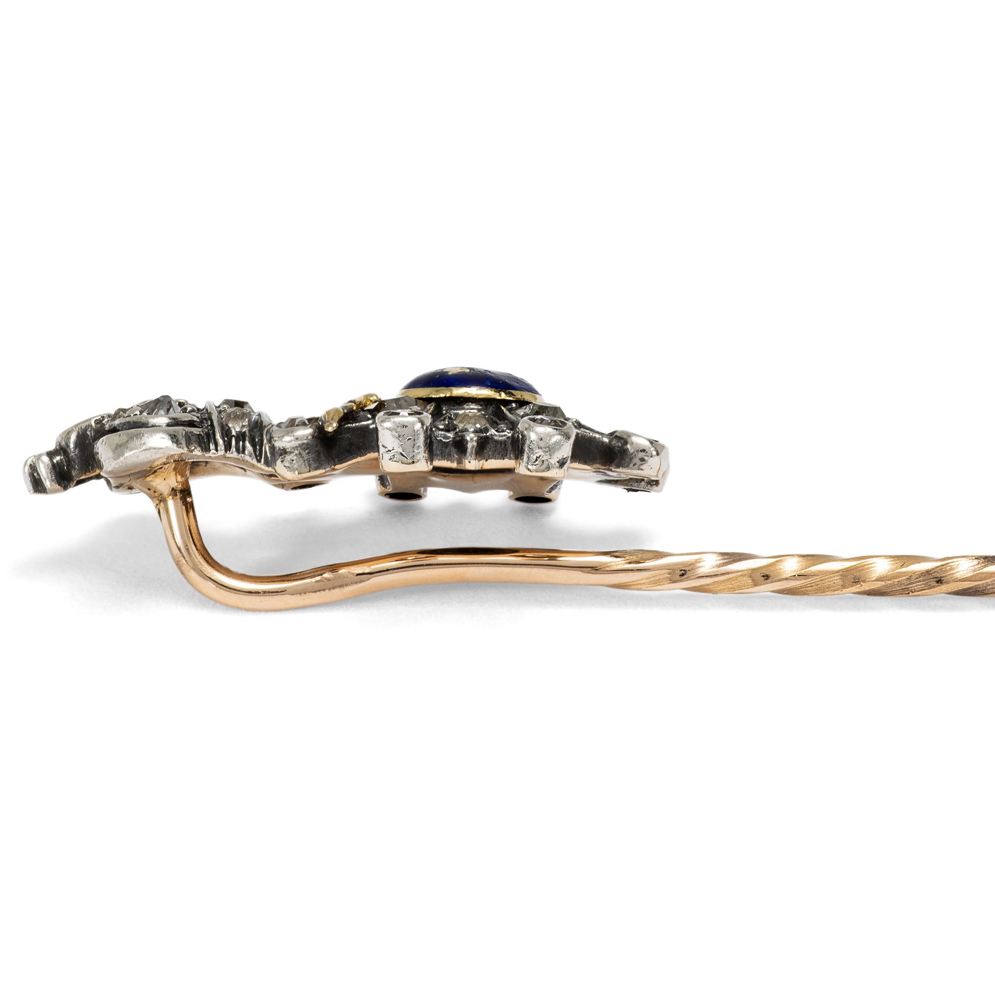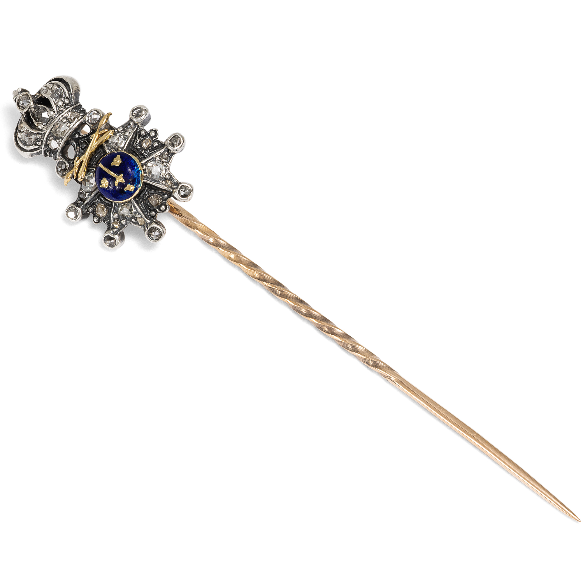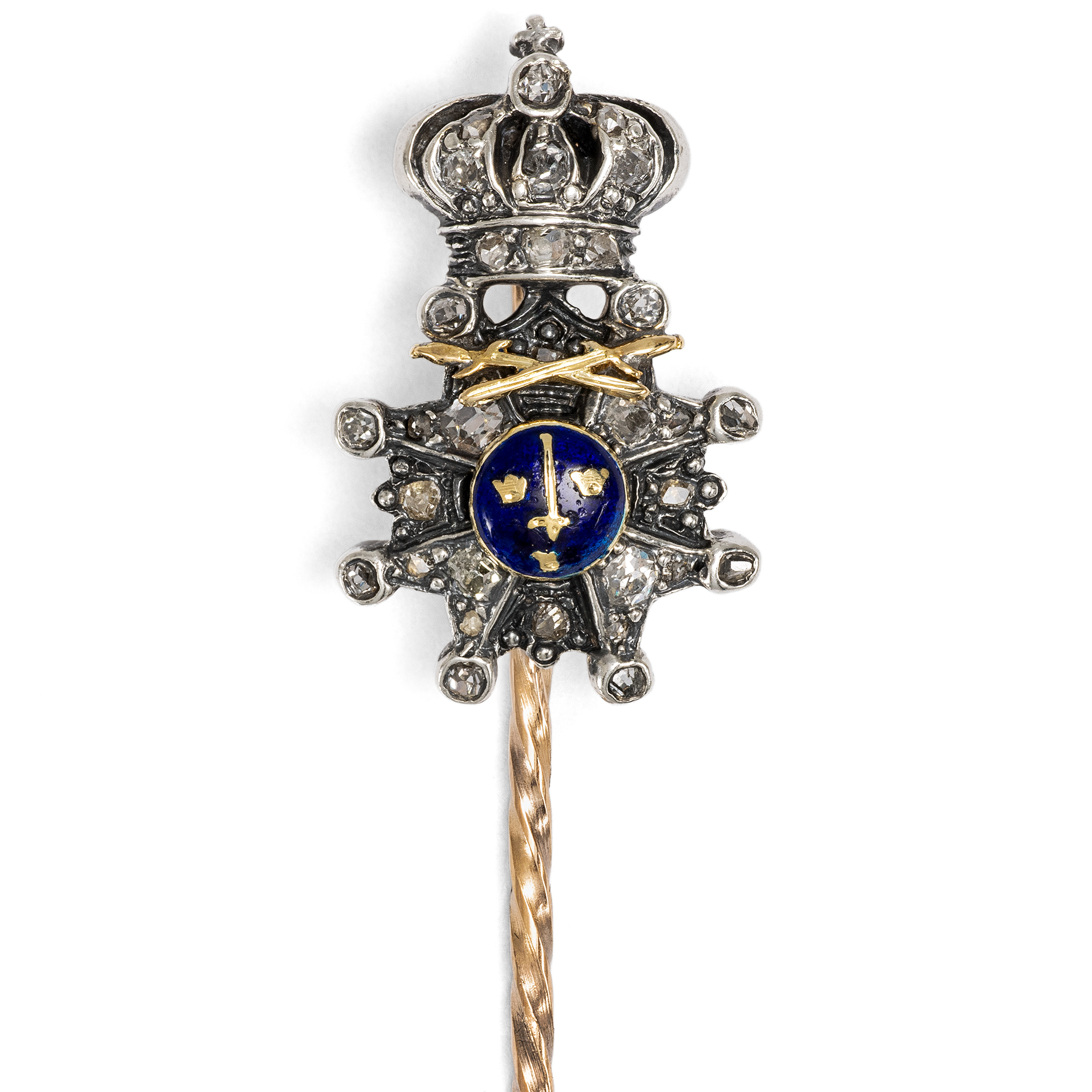 Jeder Staat der Erde pflegt bis heute ein jahrhundertealtes Ritual: Wenn Bürger des eigenen oder eines fremden Landes geehrt werden sollen, wird ihr oder ihm ein Orden verliehen. Eigentlich ist dies eine Idee aus dem Mittelalter, in dem Orden wie die Templer oder Malteser als Gemeinschaft von Adligen nach dem Vorbild der Mönche entstanden. Und so ist ein Orden bis heute nicht nur eine Medaille zum Anstecken, sondern auch die Gruppe all jener, welche dem Orden durch Verleihung beigetreten sind. Die hier vorliegende antike Anstecknadel zeigt als Schaustück einen Orden en miniature, eine Kleinausgabe eines wirklichen Ordens, aus Gold, Silber, Diamanten und Email. Es ist eine Version des überreichten großen Ordens, die nicht zu festlichen Anlässen an einer Schärpe, sondern im Alltag am Revers getragen wird. Unter einer Krone sehen wir zwei gekreuzte Schwerter und einen achtzackigen Stern mit emailliertem Mittelfeld. Dort sind vor blauem Grund ein weiteres Schwert und drei goldene Kronen dargestellt. Es ist der Militärverdienstorden des Königreichs Schweden, der Schwertorden, der Kungliga Svärdsorden.. Er wurde im Jahr 1748 von König Friedrich I. gestiftet und diente vor allem der Auszeichnung von Offizieren und Soldaten, die sich durch Tapferkeit, Treue und besondere Leistungen im Dienst des Königreichs Schweden hervorgetan hatten. Unser Orden ist in den Jahren um 1900 entstanden und präsentiert den Orden aus hochkarätigem Gold und Silber, besetzt mit einunddreißig Diamanten in historischen Schliffen und einem blau emaillierten Mittelfeld. Die Nadel fand hier in Berlin zu uns.