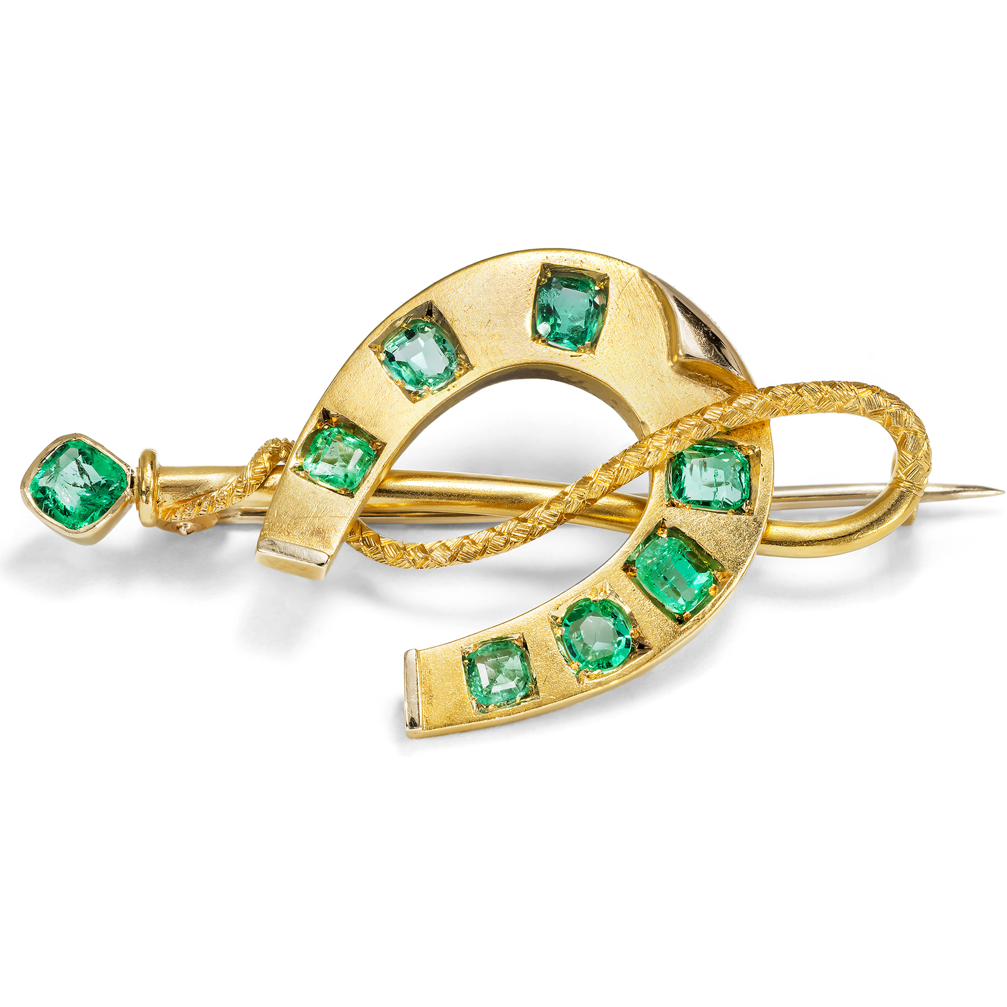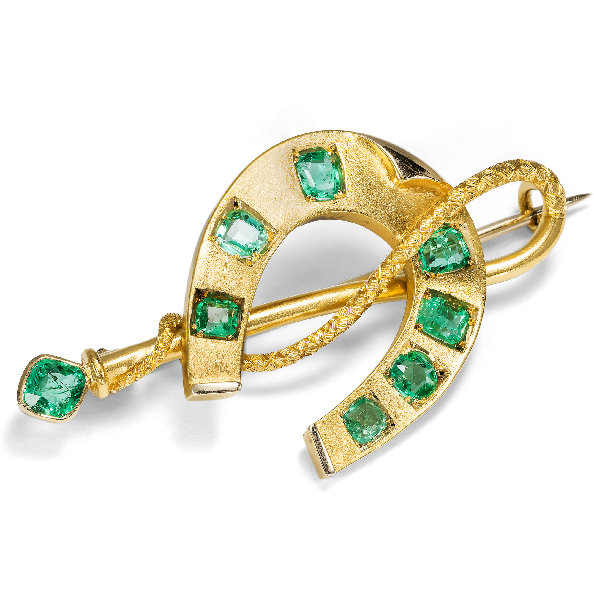 Der Pferdesport ist seit alters her als Sport der Könige bekannt, doch ist er gerade in England seit Jahrhunderten auch die Leidenschaft der Aristokratie und des Bürgertums. Das speziell für das Galopprennen gezüchtete Englische Vollblut gilt als schnellstes Rennpferd überhaupt, und einige der bekanntesten Rennstrecken der Welt, wie Ascot und das Epsom Derby, finden sich im Vereinigten Königreich. Bis heute sind die großen Rennen Höhepunkte des gesellschaftlichen Lebens, bei denen das Sehen und Gesehenwerden mindestens genauso wichtig ist wie der Sport selbst. Auch von Königin Viktoria ist überliefert, dass sie Pferderennen liebte. Einmal soll sie derart aufgeregt gewesen sein, dass sie ein Fenster der königlichen Loge in Ascot zerbrach, als sie hinausstürmte, um den Zieleinlauf zu verfolgen. Auch ihre Ururenkelin Elisabeth II., sonst für ihre kontrollierte Art bekannt, zeigte beim Pferderennen eine erstaunliche Leidenschaft und war selbst dem Wetten nicht abgeneigt. Ein Zeugnis der englischen Pferdebegeisterung ist die vorliegende Brosche aus den letzten Jahren des 19. Jahrhunderts. Als Schaustück präsentiert sie ein goldenes Hufeisen, das auf einer Reitgerte aufgelegt ist. Acht natürliche Smaragde aus Kolumbien in sehr guten Qualitäten sind darauf eingelassen. Die Brosche besteht aus sog. „bloomed gold“, bei dem die Oberfläche aus Feingold matt und buttrig schimmert, was wunderbar zum leuchtenden Grün der Smaragde passt. Die edle Nadel hat die Zeitläufe hervorragend überstanden. So ergibt sich ein auffallend schönes Schmuckstück für Bluse, Kleid und Jackett, mit dem Sie überall einen Hauch von Royal Ascot verbreiten können!