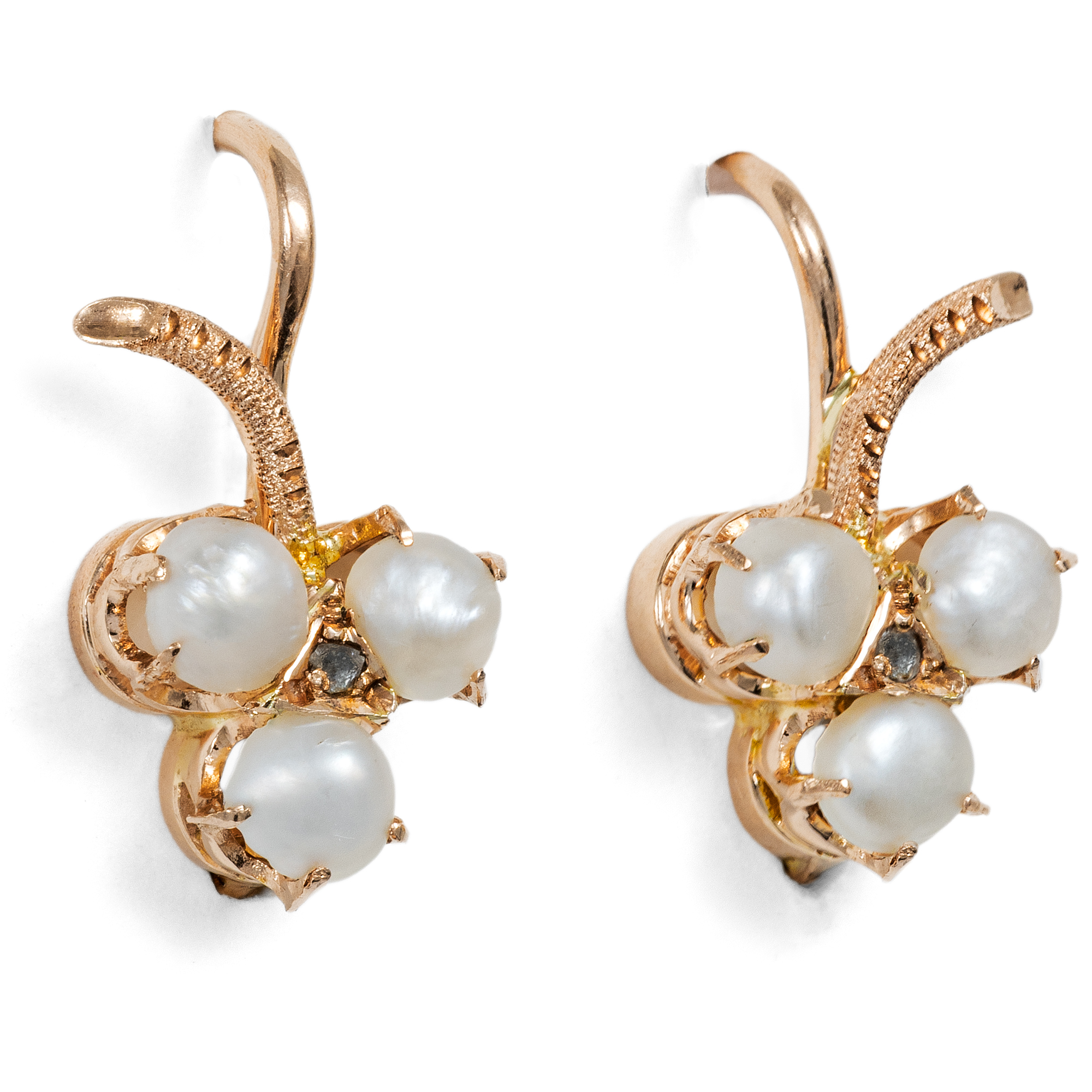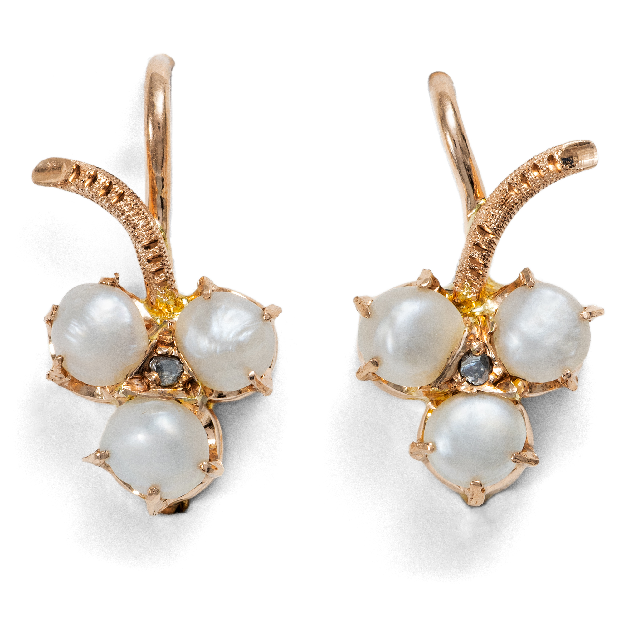 Diese Form der Ohrringe wird auch als „Dormeuse“ bezeichnet. Unter „Dormeusen“ versteht man kleine runde Ohrringe meist mit Klappbrisuren, die dicht unter dem Ohrläppchen getragen werden und damit so angenehm zu tragen sind, dass sie selbst während des Schlafs getragen werden könnten (franz. „dormir“= schlafen). Im späten 19. Jahrhundert kamen Dormeusen groß in Mode: Nachdem lange Ohrringe viele Dekaden lang de rigueur gewesen waren, galt es ab den 1880er Jahren auf einmal als unfein, solche zu tragen. Nur Ohrhänger von kleinem Format waren nun salonfähig. „Kleine Gehänge werden noch immer gern getragen. Eine Perle, ein großer Diamant dicht am Ohrläppchen und höchstens ein herabfallender Stein genügen vollkommen“, hieß es etwa 1897 im einflussreichen Damenjournal „Der Bazar“. Wie groß die Spannbreite der Entwürfe kleinformatiger Dormeusen war, beweist etwa ein Blick in den Katalog des New Yorker Kaufhauses H. O'Neill & Co. der Saison 1890/91 (vgl. unsere Abb.). Die hier vorliegenden Ohrringe sind als kleine Kleeblättchen gestaltet, die aus rötlichem Gold gebildet werden und deren Zentrum je von einer kleinen Diamantrose besetzt ist. Die Blätter sind mit jeweils drei echten Naturperlen besetzt und wirken so besonders lebensnah. Laut Stempelung sind die Ohrringe die Ohrringe einmal nach Wien exportiert worden, Wahrscheinlich sind sie in Deutschland entstanden.