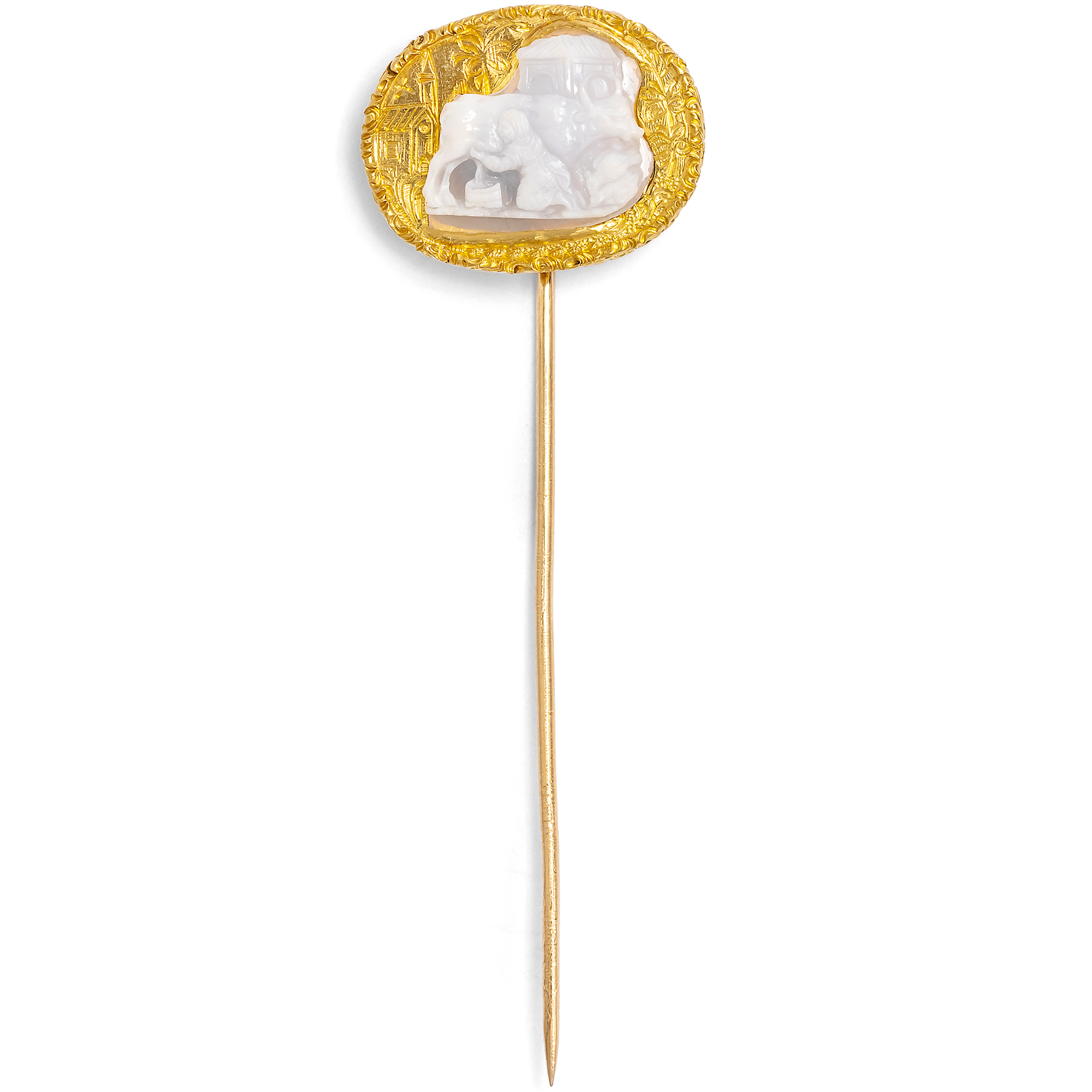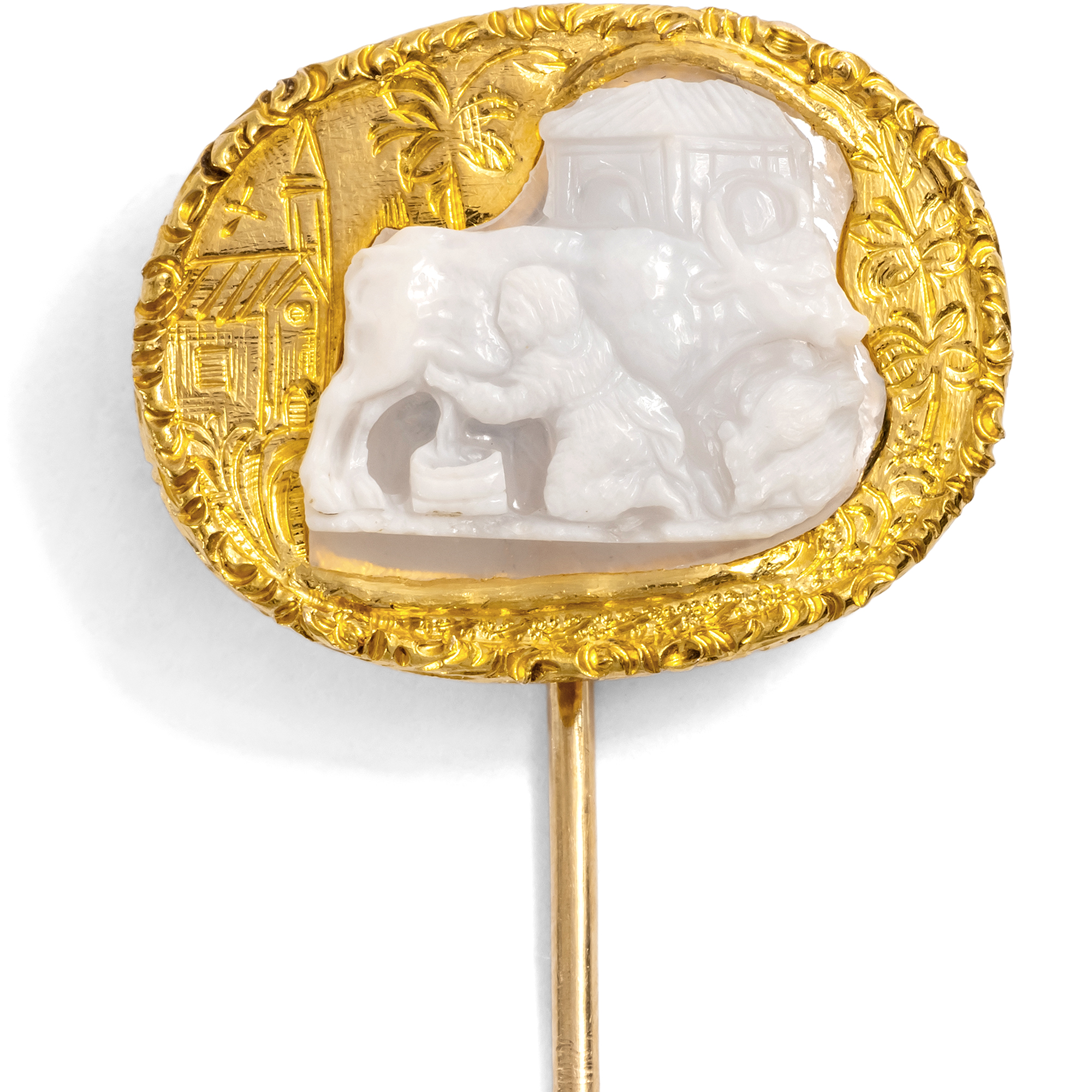 Gehen wir mit diesem Schmuckstück auf eine Zeitreise – nicht nur eine, sondern gleich zwei! Denn dieses Schmuckstück vereint zwei Epochen. Die feine Anstecknadel aus Gold fasst das Fragment einer Kamee aus Achat. Der erhaltene Teil zeigt eine ruhige Szene des Landlebens: Eine Frau sitzt vor einem Renaissancegebäude und melkt eine Büffelkuh. Die Darstellung wirkt still, beinahe kontemplativ, als hätte der unbekannte Steinschneider für einen Moment den Alltag seiner Zeit festhalten wollen. Die Kamee ist nicht vollständig erhalten und nur als Fragment überliefert; sehr wahrscheinlich war sie einst Teil einer größeren Szene, vielleicht einer Geburt Christi mit dem Stall in Bethlehem. Die Technik und Formensprache des Schnitts lassen uns annehmen, dass die Kamee in der frühen Neuzeit entstanden ist, im 16. oder 17. Jahrhundert. Dass das kleine Relief sehr wertgeschätzt wurde, zeigt die feine, aufwendige Fassung aus Gold, welche viele Generationen später um den Achat gelegt wurde. Der Goldschmied hat die fehlenden Partien auf dem goldenen Grundring um die Kamee ergänzt: Feine Gravuren setzen dort an, wo der Stein aufhört, als würde das Bild nahtlos weitergehen. Nach außen rahmt ein Band aus gravierten Rosenblüten im typischen Stil der ersten Jahre nach 1900 die Szene. Die Verbindung von altem Steinschnitt und späterer Ergänzung verleiht dem Stück einen besonderen Reiz. Es ist, als hätten zwei Handwerker über Jahrhunderte hinweg zusammengearbeitet. Entdeckt haben wir die Nadel in Stuttgart.