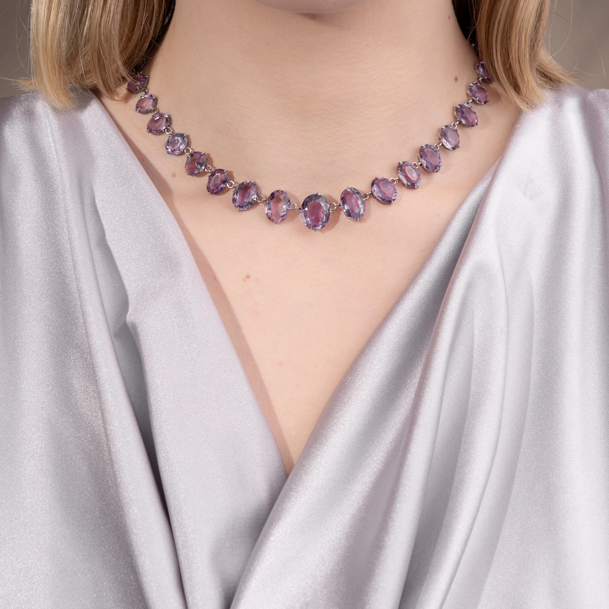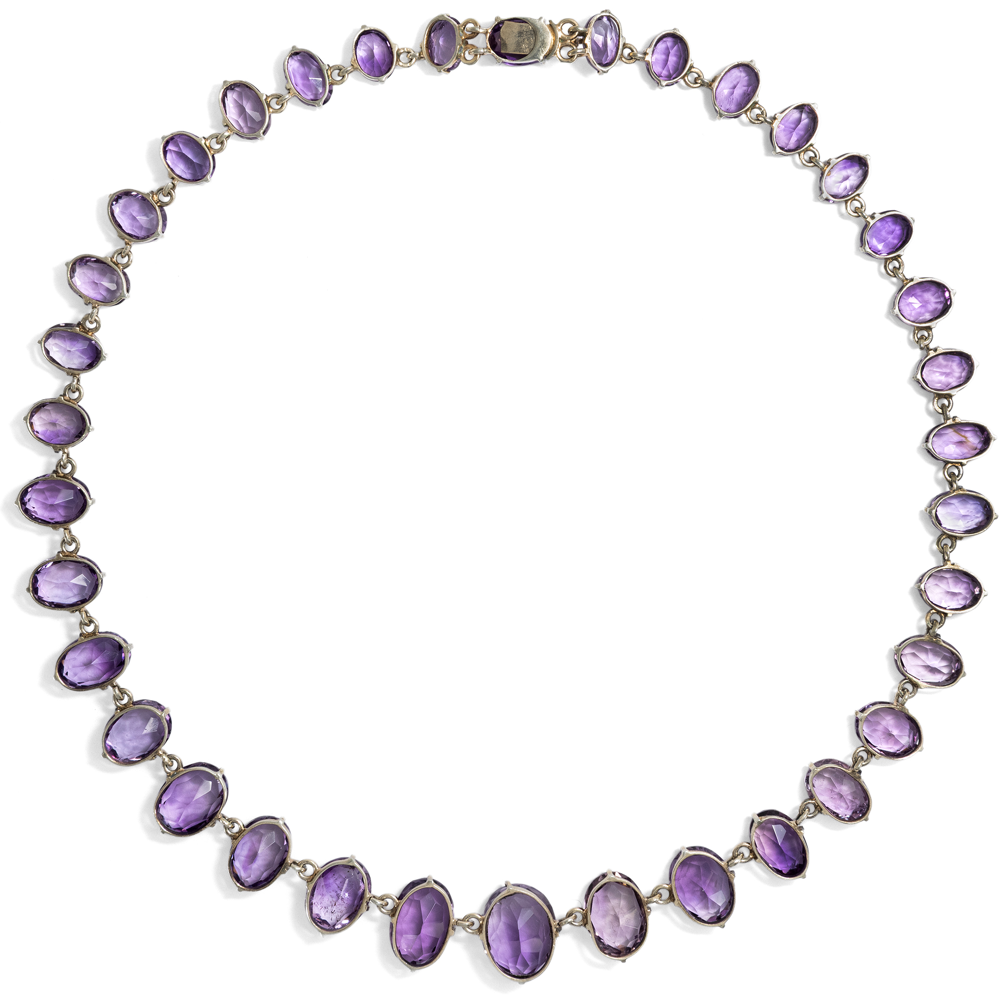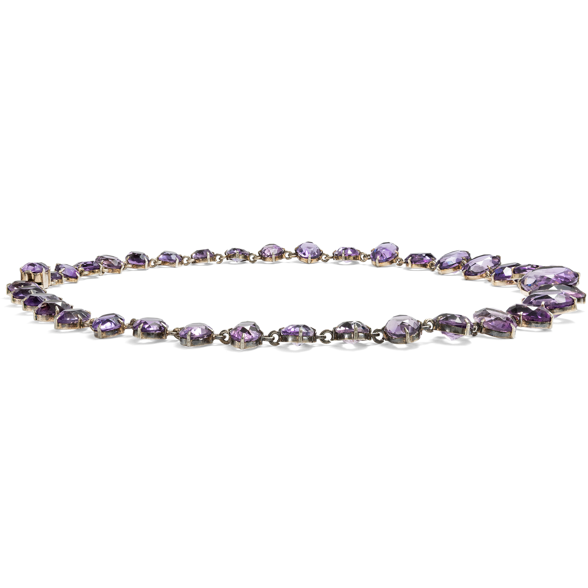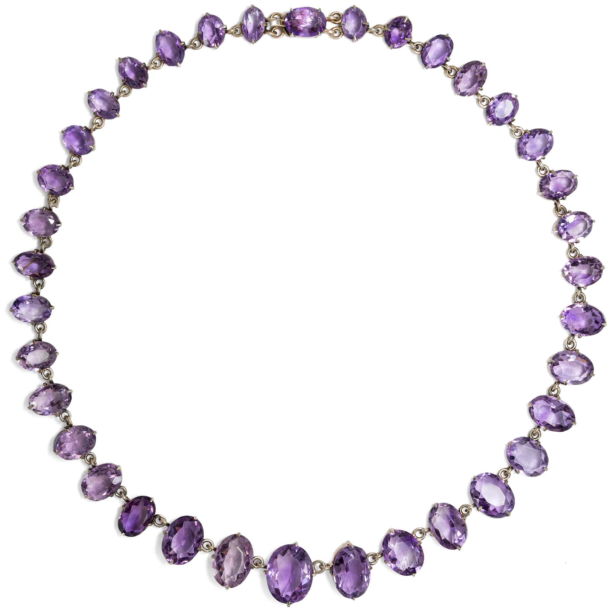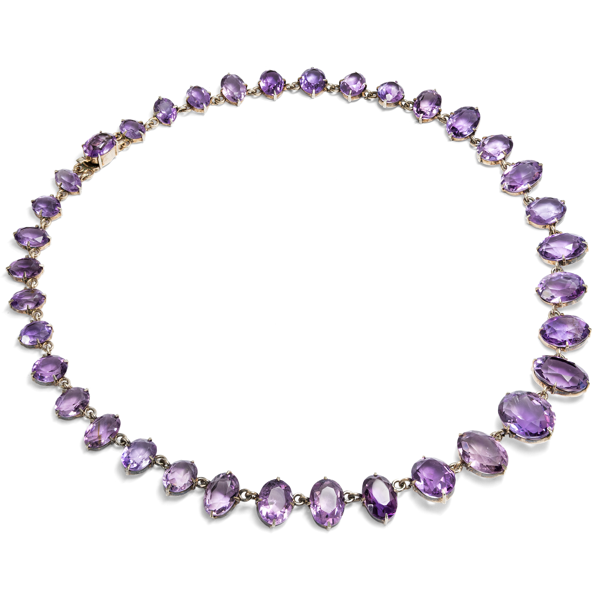 Die „Rivière“ ist ein Klassiker unter den Edelsteincolliers. Ihr Name leitet sich vom französischen Wort für Fluss ab, an welchen die fließenden Linien dieser Ketten erinnern. Die Kunst, ein Rivière-Collier zu schaffen, ist zweierlei: Zum einen ist die Auswahl von zueinander passenden Steinen entscheidend, zum anderen bestimmt die Art der Montierung die Qualität des Colliers. Sie muss die Steine seidig weich fließen lassen und harmonisch einreihen. Besonders im 19. Jahrhundert war diese Schmuckform beliebt. Nicht selten wurden für solche Colliers Edelsteine gewählt, denen man besondere Eigenschaften zuschrieb – im Fall des hier vorliegenden Colliers wurden leuchtende Amethyste ausgewählt, um das Collier zu bilden. Deren violette Farbe scheint eine besondere Wirkung auf den Menschen zu haben. Neben dem Glauben, dass ein Amethyst vor Trunkenheit schützen könne, wurde ihm beispielsweise auch eine Wirkung gegen Diebstahl nachgesagt. Ausgrabungen von Gräbern der Merowingerzeit zeigen etwa, dass diese nur in den seltensten Fällen in späterer Zeit beraubt wurden – was ungewöhnlich ist. Doch selbst wenn, wurden die als Halsketten beigegebenen Amethyste beinahe niemals gestohlen, auch dann nicht, wenn sich daran goldene Schmuckanhänger befanden. Möglicherweise schrieb man dem Amethyst in dieser frühen Epoche eine weitergehende, abschreckende Wirkung zu? Die vorliegende Rivière aus 36 Amethysten führt die Schönheit dieser besonderen Steine eindrucksvoll vor Augen. Die hellen Amethyste sind oval facettiert und in Silber gefasst. Im sanften Verlauf gereiht, wachsen sie zur Mitte hin an und unterstreichen so den fließenden Charakter des Colliers. Der zurückhaltende Farbton der Fassungen ergänzt den Glanz der Steine auf harmonische Weise. Insgesamt sind etwa 90 Karat Amethyste eingelassen. Ob die in den Jahren um 1890 entstandene Halskette aus natürlichen Amethysten tatsächlich Diebe fernhält, können wir jedoch nicht mit Sicherheit sagen …