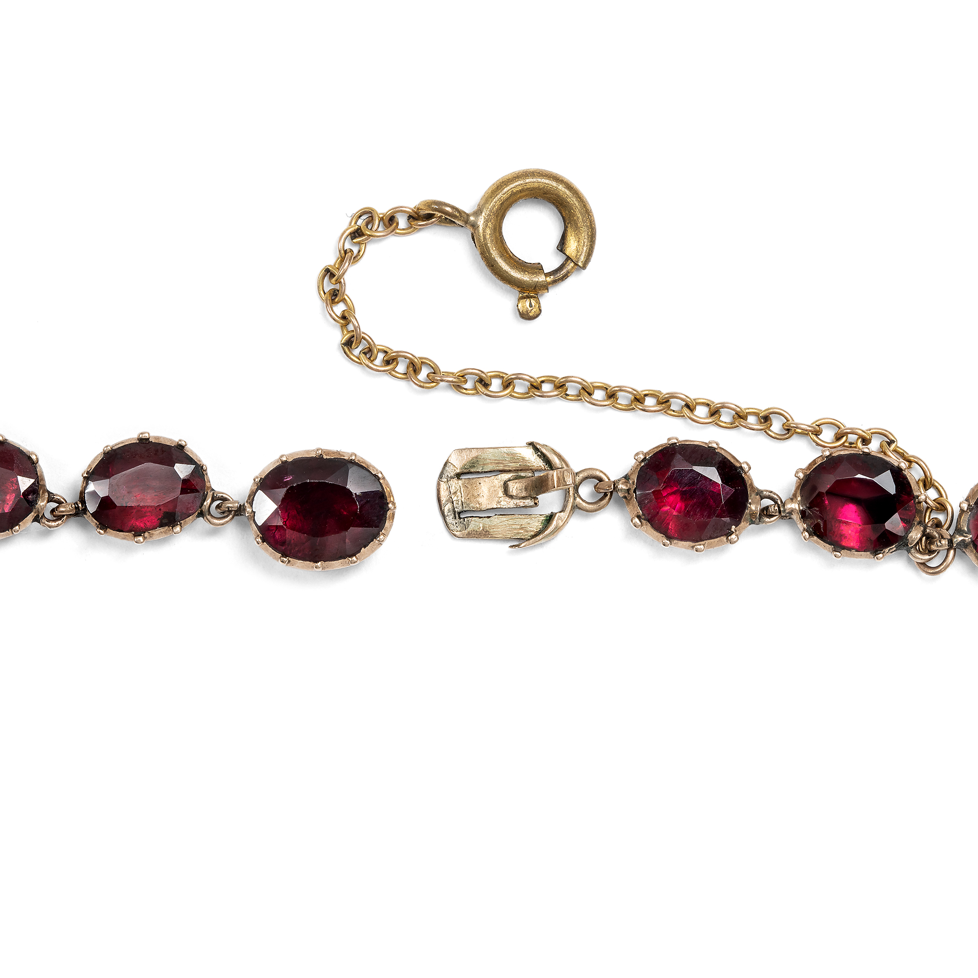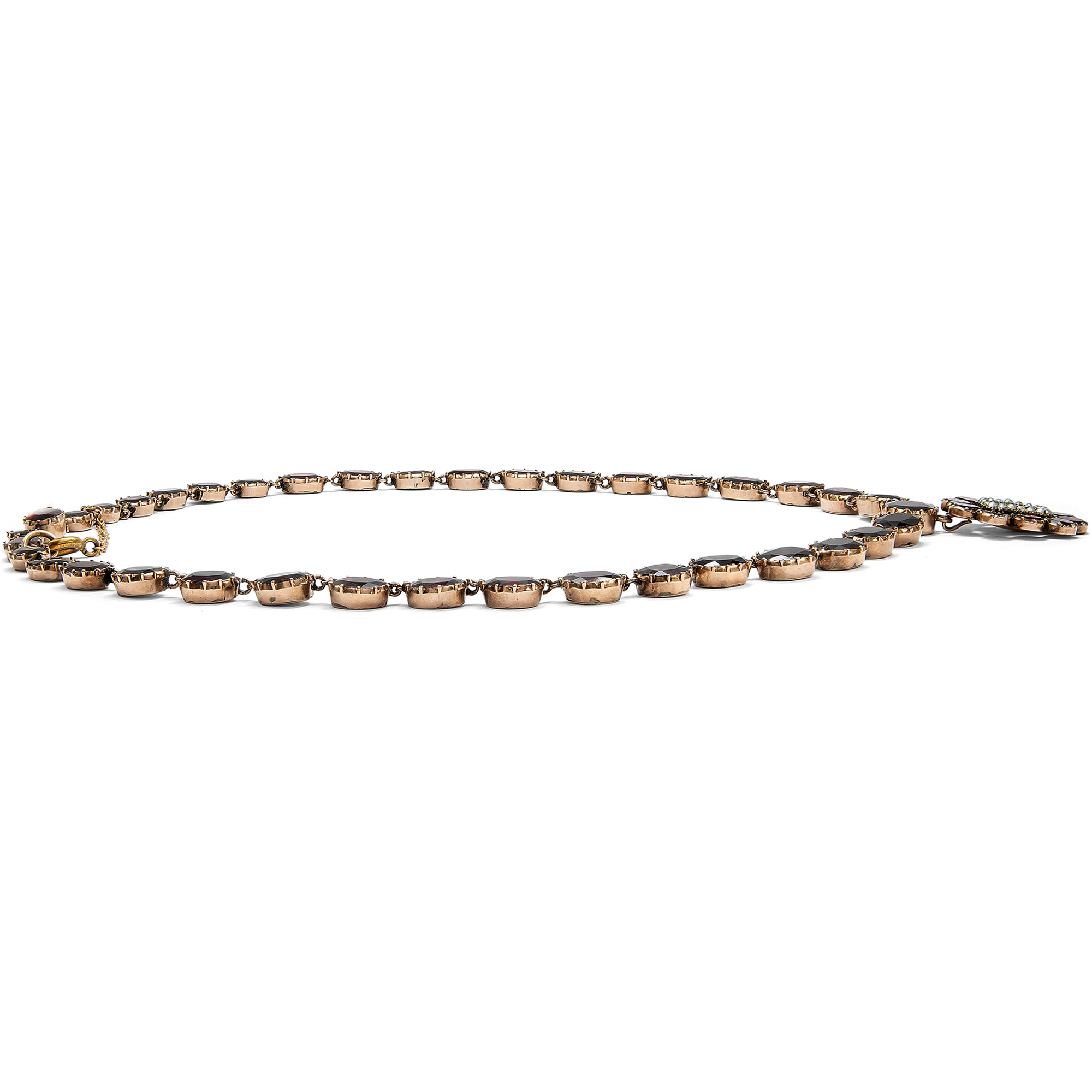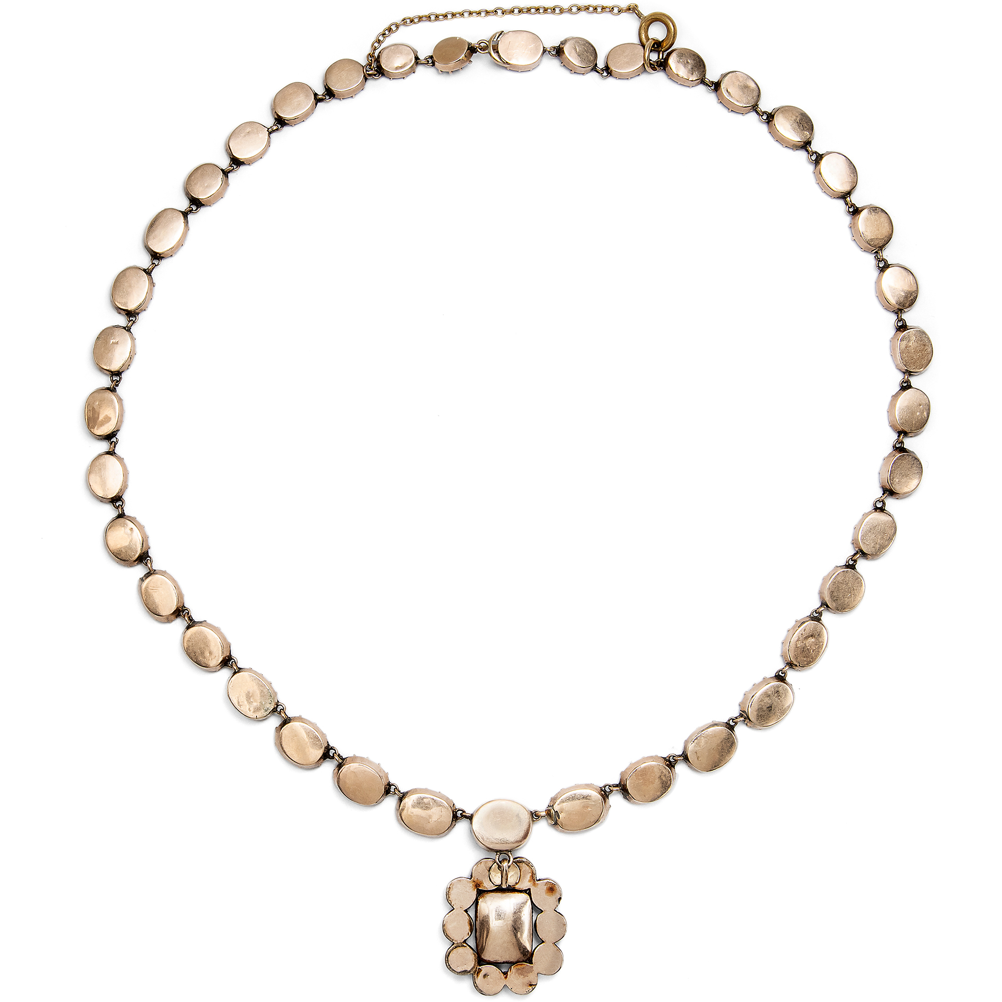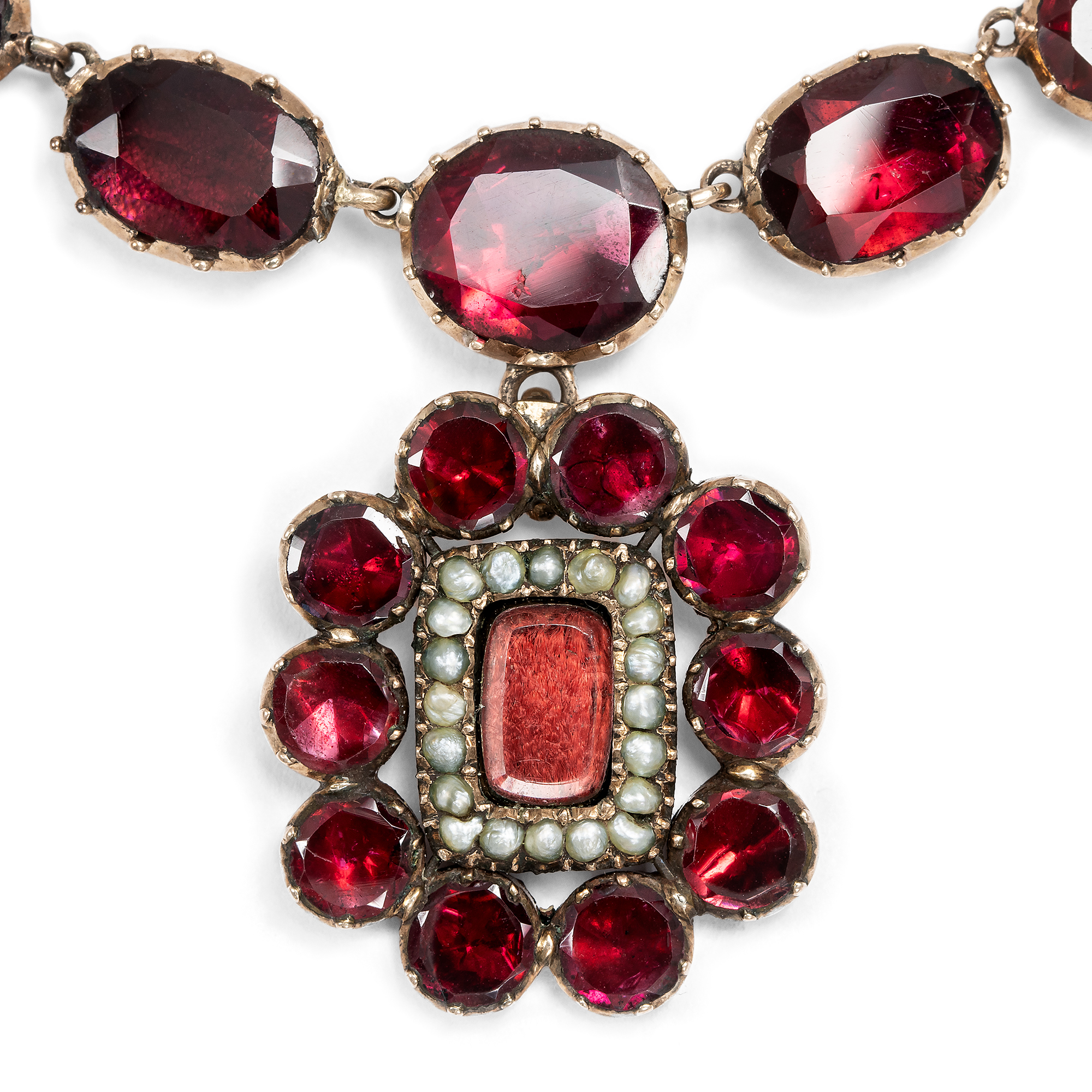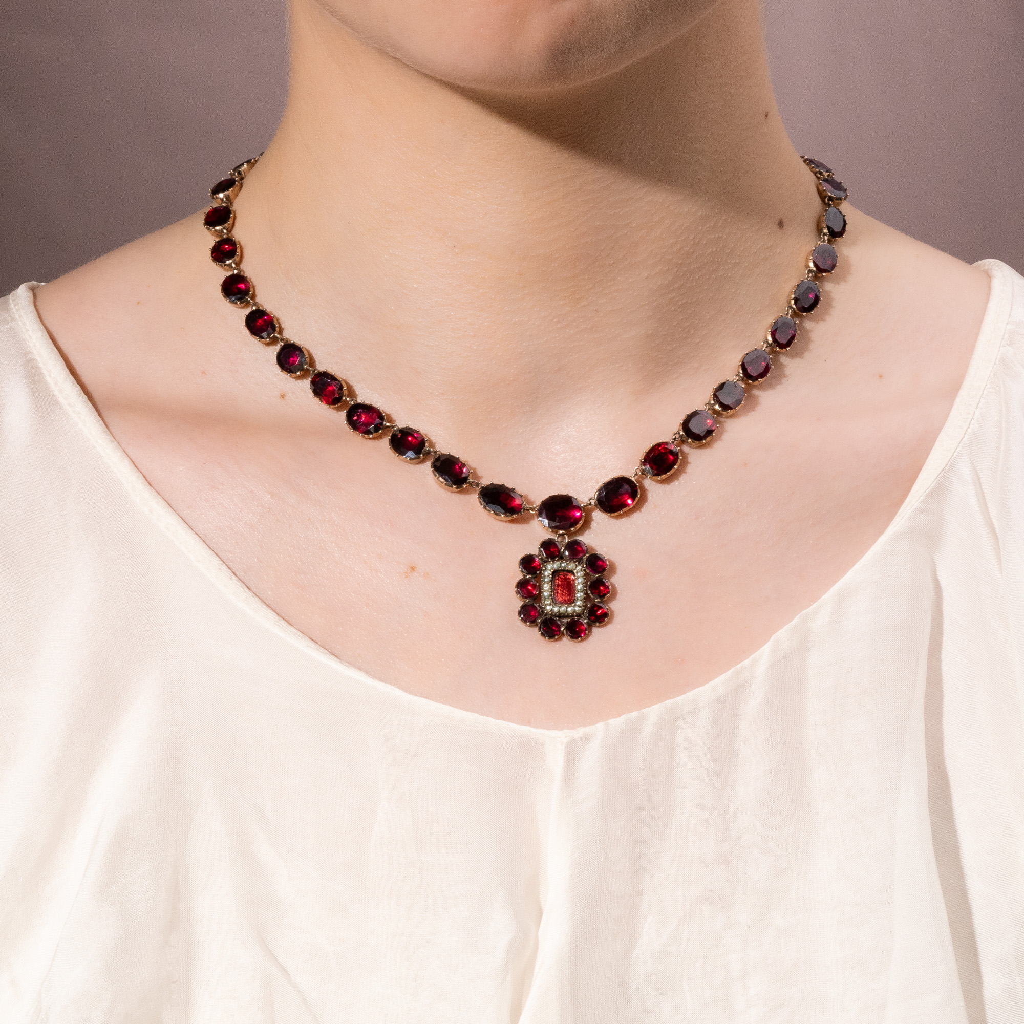 Das vorliegende Collier entspricht dem Typus der sogenannten Rivière. Der Begriff leitet sich vom französischen Wort für „Fluss“ ab und beschreibt den dahinfließenden Eindruck der dicht an dicht gereihten, glänzenden Edelsteine, die in ihren zurückhaltenden Fassungen beinahe auf der Haut zu schweben scheinen. Verwendet wurden hier Almandin-Granate, die sich durch ihren tiefen, leicht blaustichigen und an Rosenblätter erinnernden Rotton auszeichnen. Die Granate sind vor spiegelnden Silberfolien gefasst, wodurch ihre Farbe besonders reich wirkt. Je nach Lichteinfall warten die Granate mit intensiv leuchtenden Reflexen auf. Der flache Schliff der Granate mit großer Tafel erlaubt wunderbare Einblicke in die tiefe Farbwirkung. Zarte, gekniffene Fassungen aus Rotgold halten die dicht an dicht gereihten Steine. Mittig ist ein Anhänger eingehängt, der sich jedoch austauschen lässt. Der reiche Farbeffekt war um 1820 besonders begehrt, als nach der strengen und zuweilen kühlen Zurückhaltung des Klassizismus wieder strahlende Farben und bunte Edelsteine in den Mittelpunkt der Mode rückten. Das Collier ist ein schönes und charakteristisches Beispiel für dieses elegante und farbenprächtige Kapitel der Schmuckgeschichte. Wir bilden eine Modegrafik aus dem Costume Parisien des Jahres 1819 ab, die einen Eindruck von der zu einem ähnlichen Collier getragenen Mode gibt.
