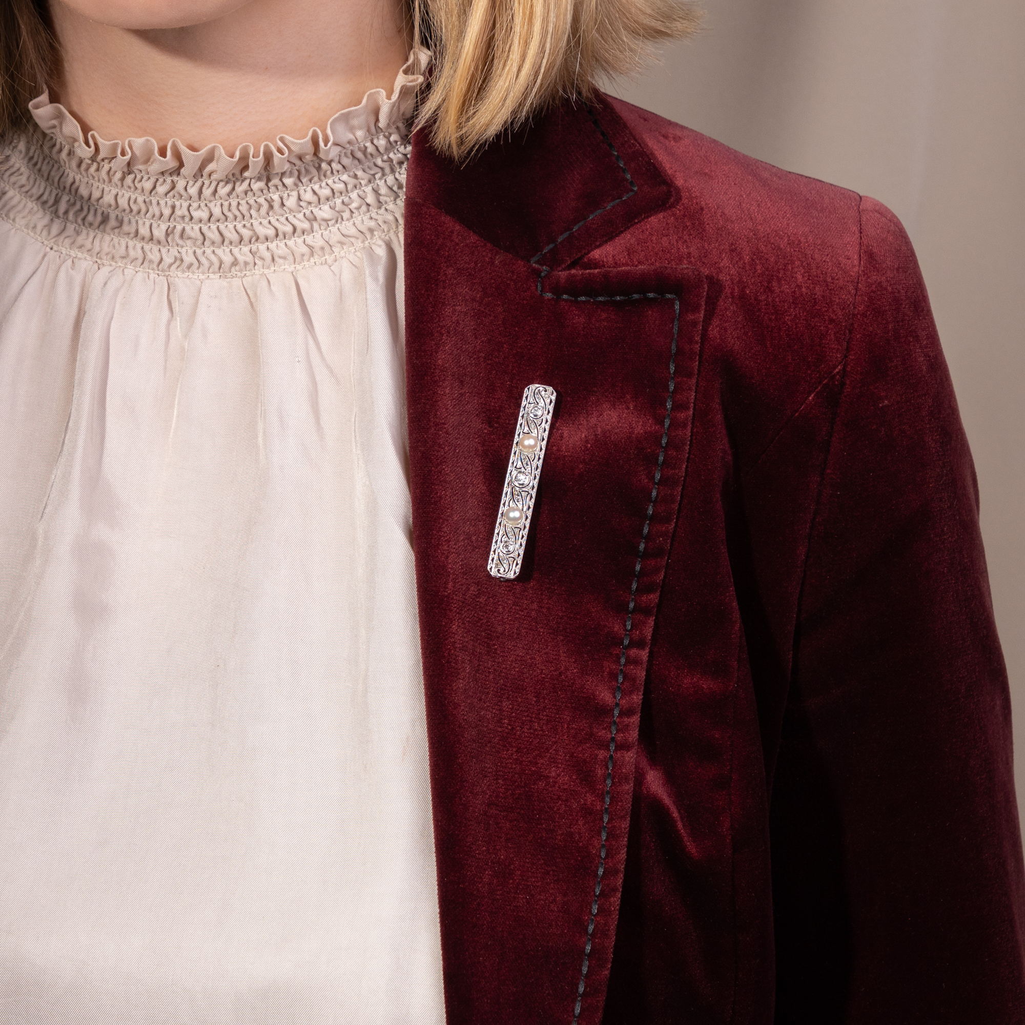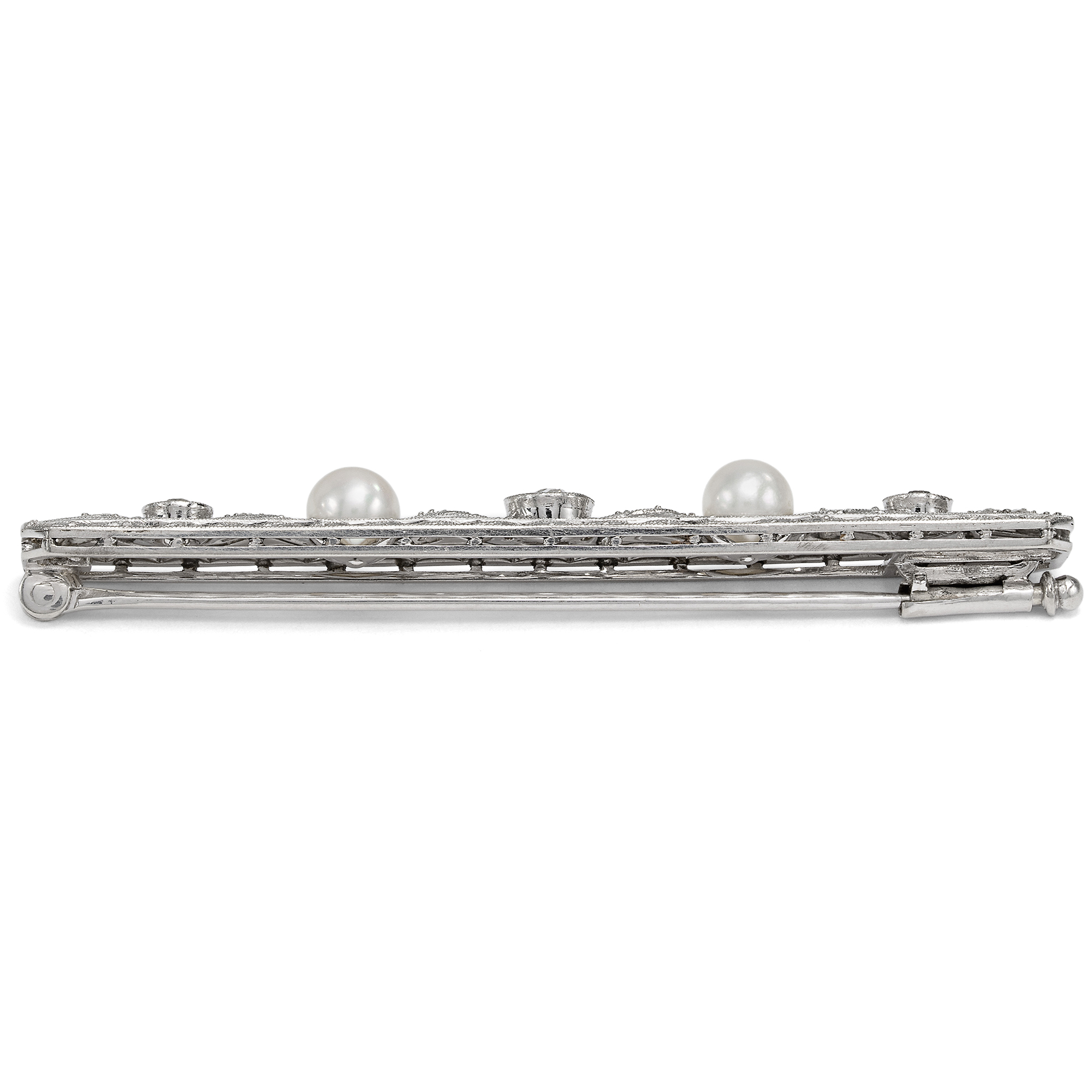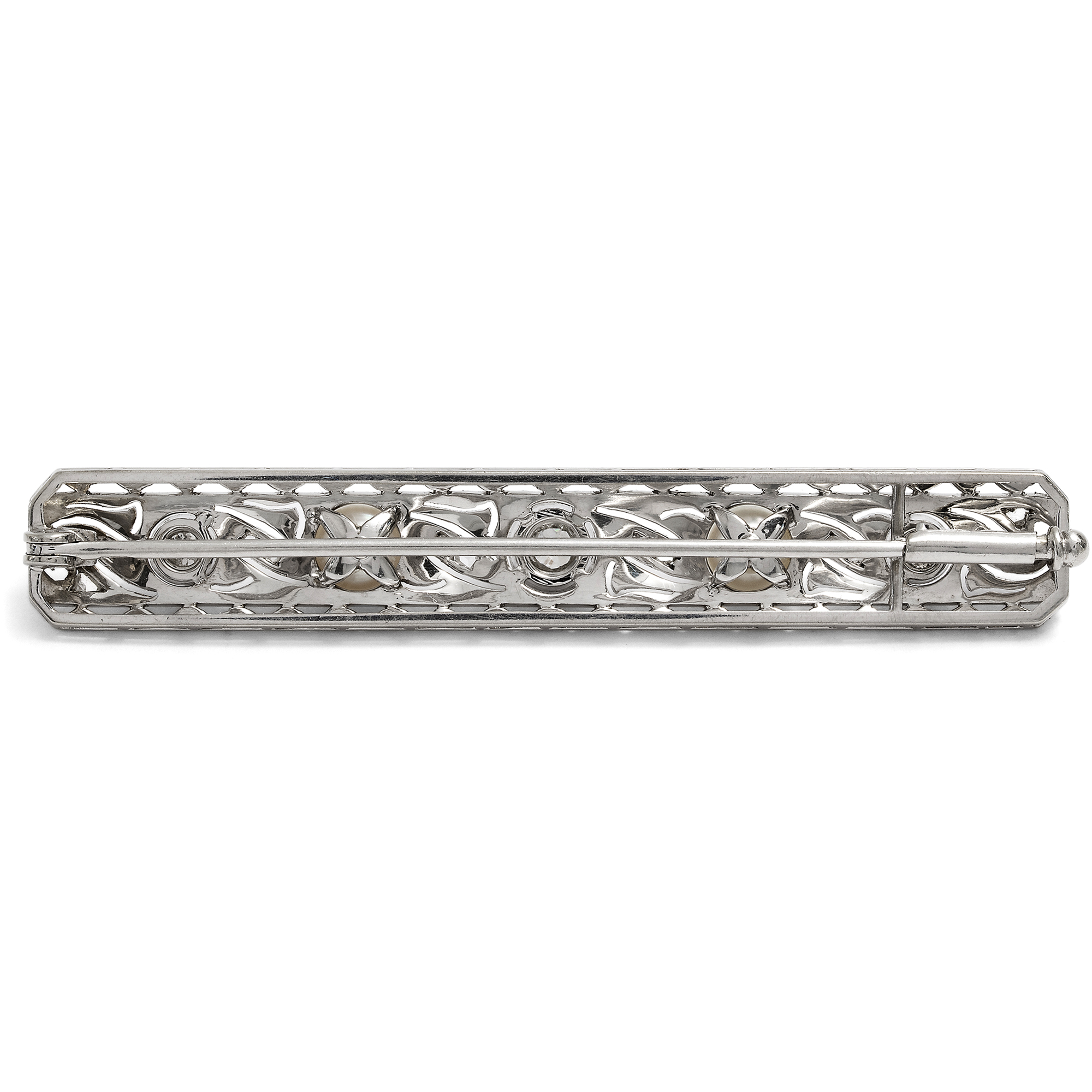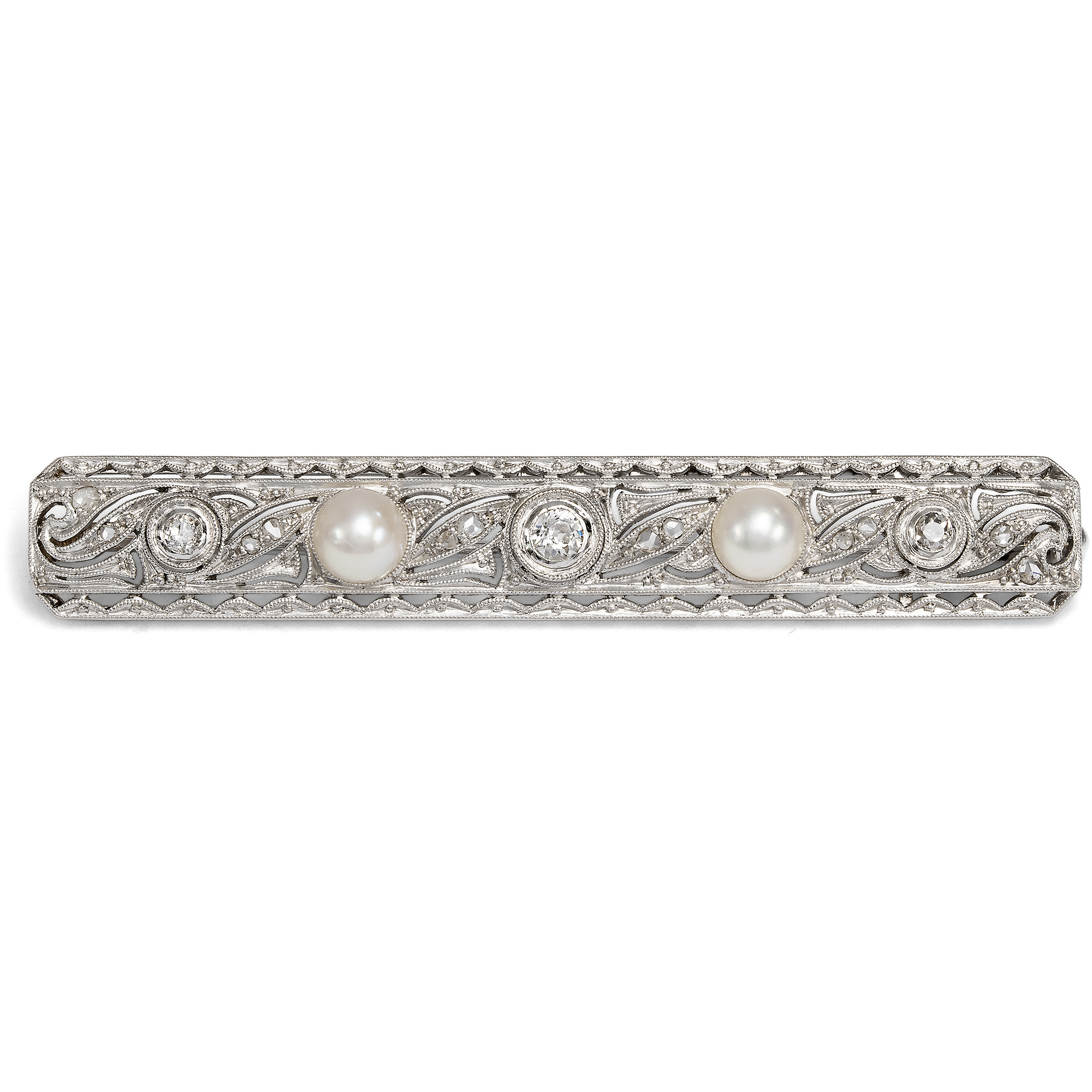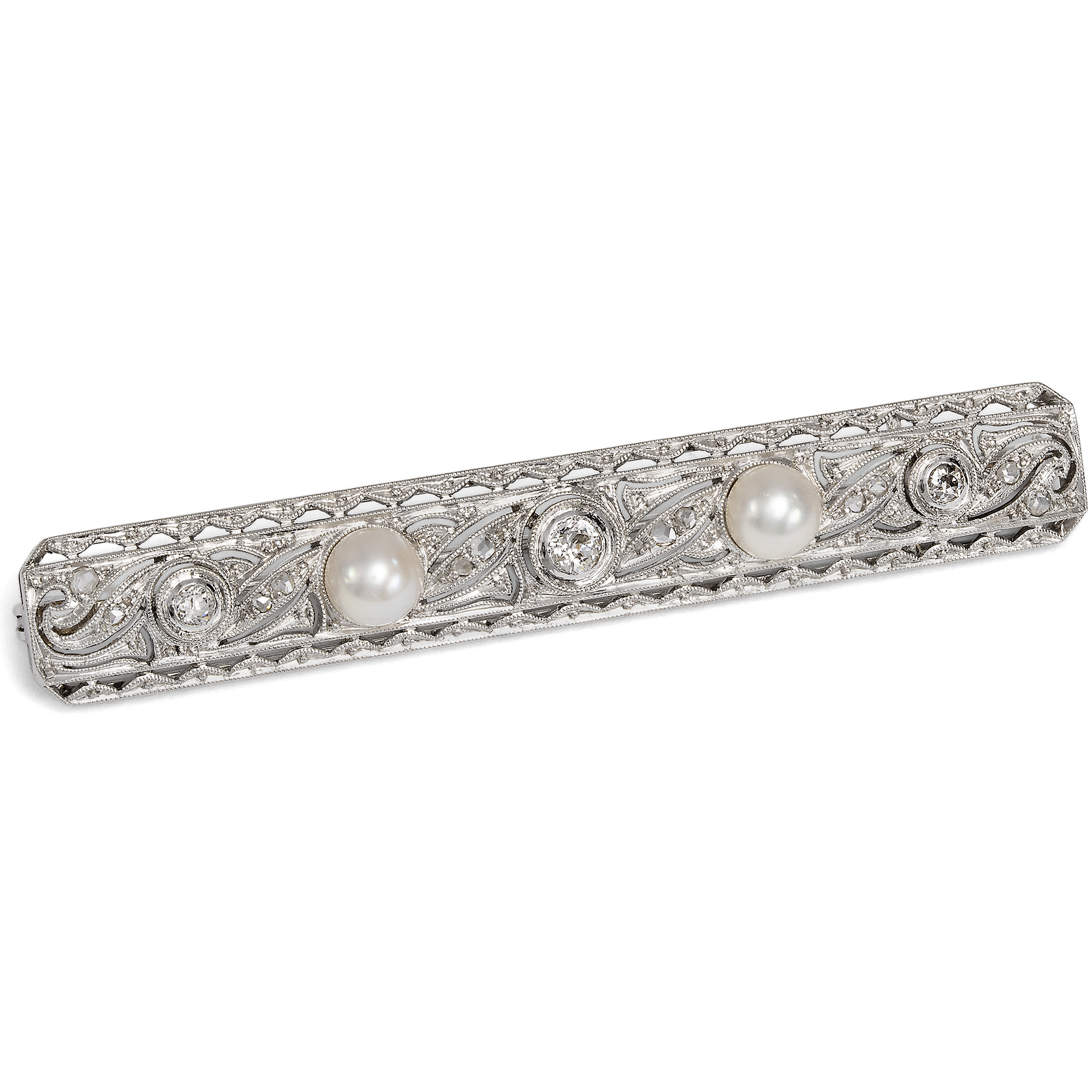 Etwa 0,30 Karat funkelnder Diamanten und zwei weich schimmernde Perlen sind dicht nebeneinander aufgereiht. Akkurat von Hand gesägte Arabesken umspielen die in Weißtönen gehaltene Schauseite aus Edelsteinen und lockern die strenge Form der Stabbrosche zusätzlich auf. In ihrer Gestaltung ist die Brosche zeitlos – aber wie modern waren ihre Materialien in ihrer Zeit! Die Brosche ist aus hochkarätigem Weißgold geschmiedet. Erst 1912 war es der deutschen Firma Dr. Richter & Cie. aus Pforzheim gelungen, Weißgold herzustellen – das sog. „Weißgold Dorico“, in seiner Zeit eine kleine Sensation. Notwendig war seine Erfindung wegen der hohen Platinpreise bei gleichwährender Popularität der Weißjuwelen geworden. „Weiß ist heute das Losungswort, Weiß ist Mode“ ließ die Leipziger Uhrmacherzeitung 1912 zum neuen Weißgold verlauten. Auch der Besatz aus feinen, vollrunden Zuchtperlen mit rosigem Lüster war Anfang der 1920er Jahre eine Sensation. Für europäische Goldschmiede waren die Mikimoto-Zuchtperlen aus Japan erstmals 1921 erhältlich, in den USA nur wenig früher. Zuvor hatten Perlentaucher Austern vom Grund des Ozeans holen müssen: Dabei trug nicht jede Auster eine Perle, und nicht jede Perle besaß die gewünschte Farbe und Größe. Die Perlenzucht eröffnete der Schmuckwelt somit ganz neue Möglichkeiten. Die schöne Brosche ist sehr gut erhalten. Sie entstand ausweislich ihrer Stempelung in Deutschland. Zu uns kam sie hier in Berlin.