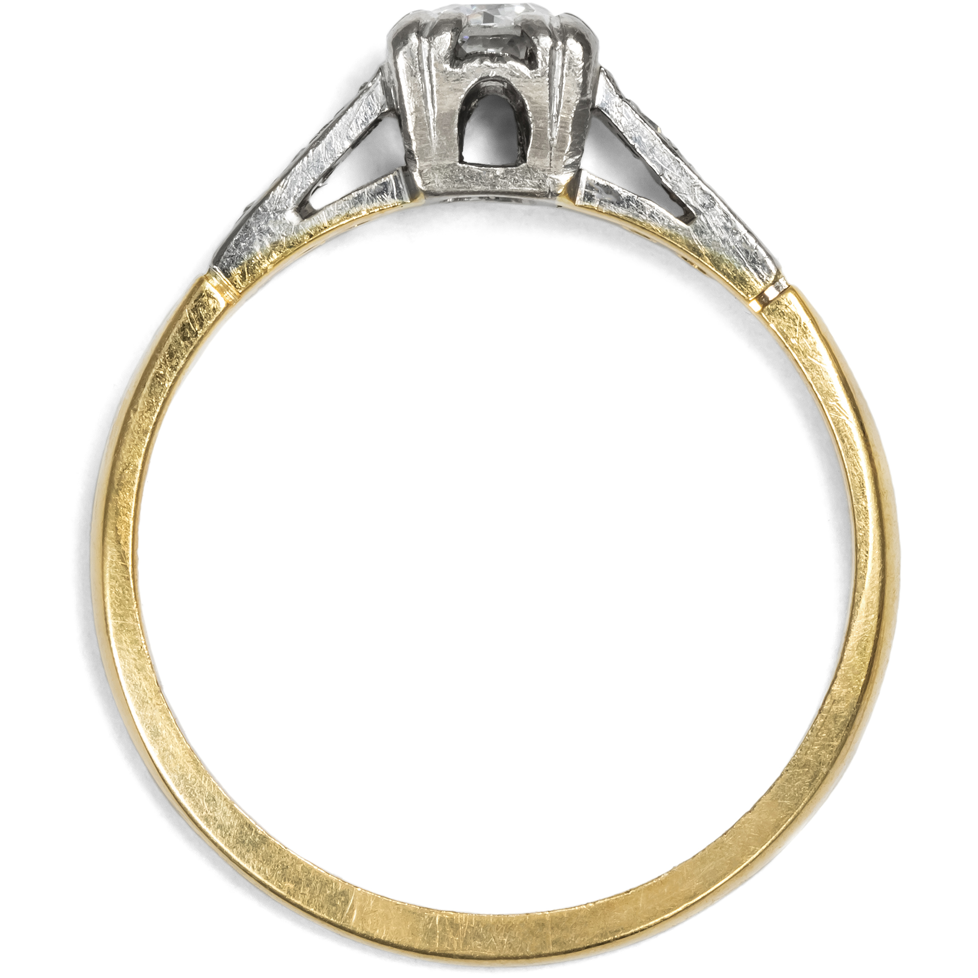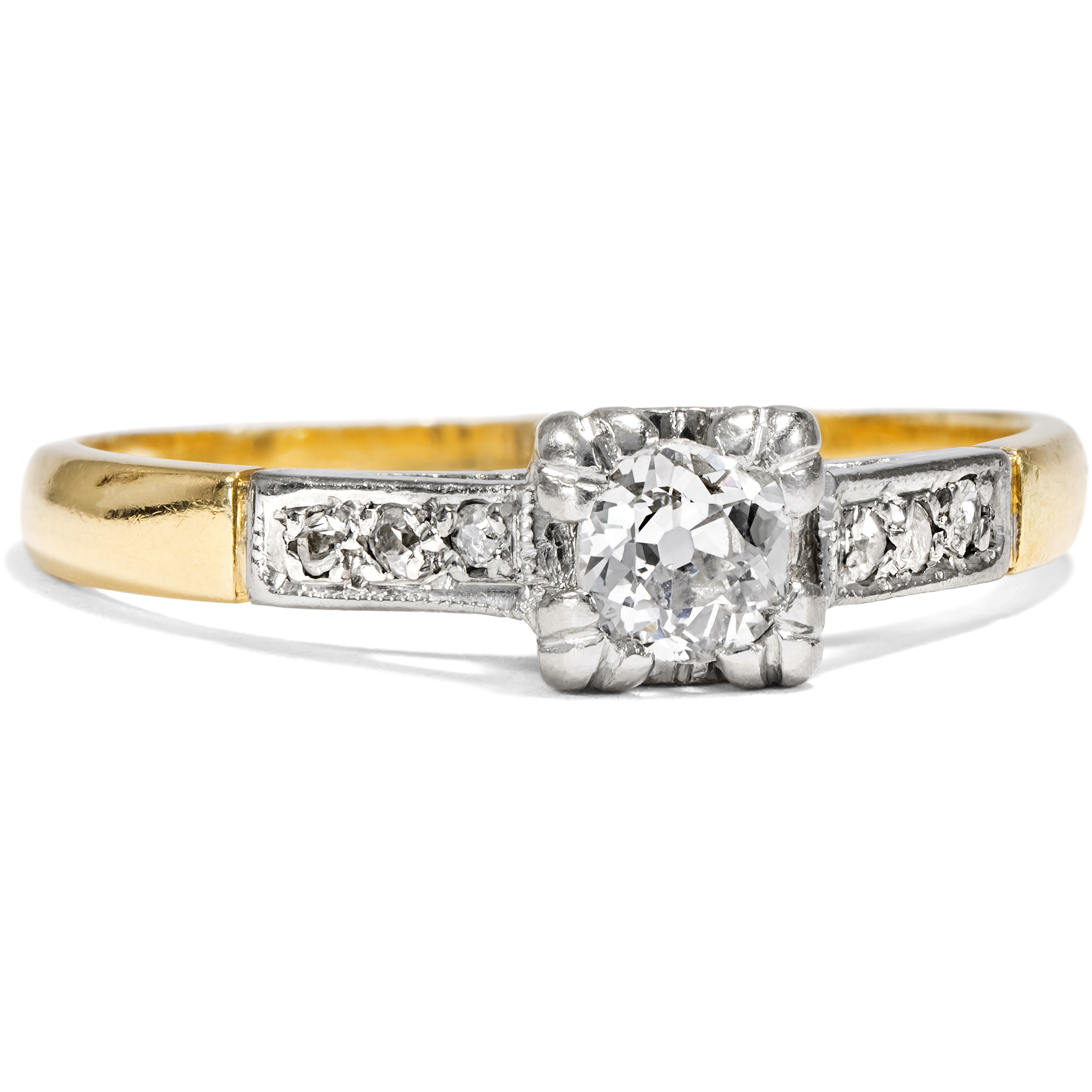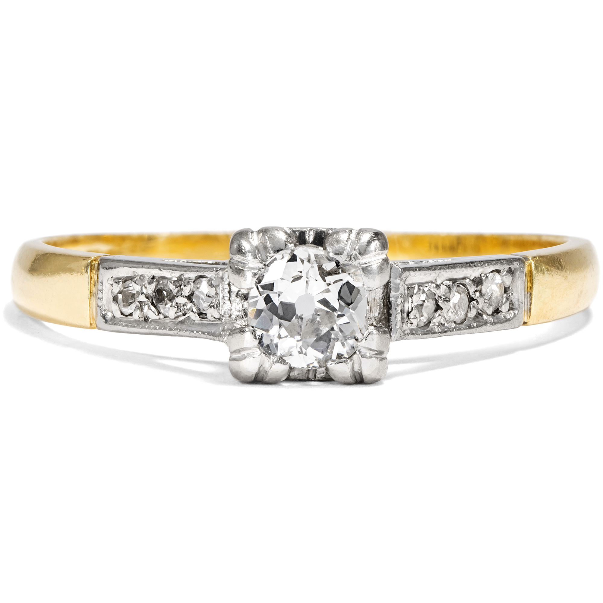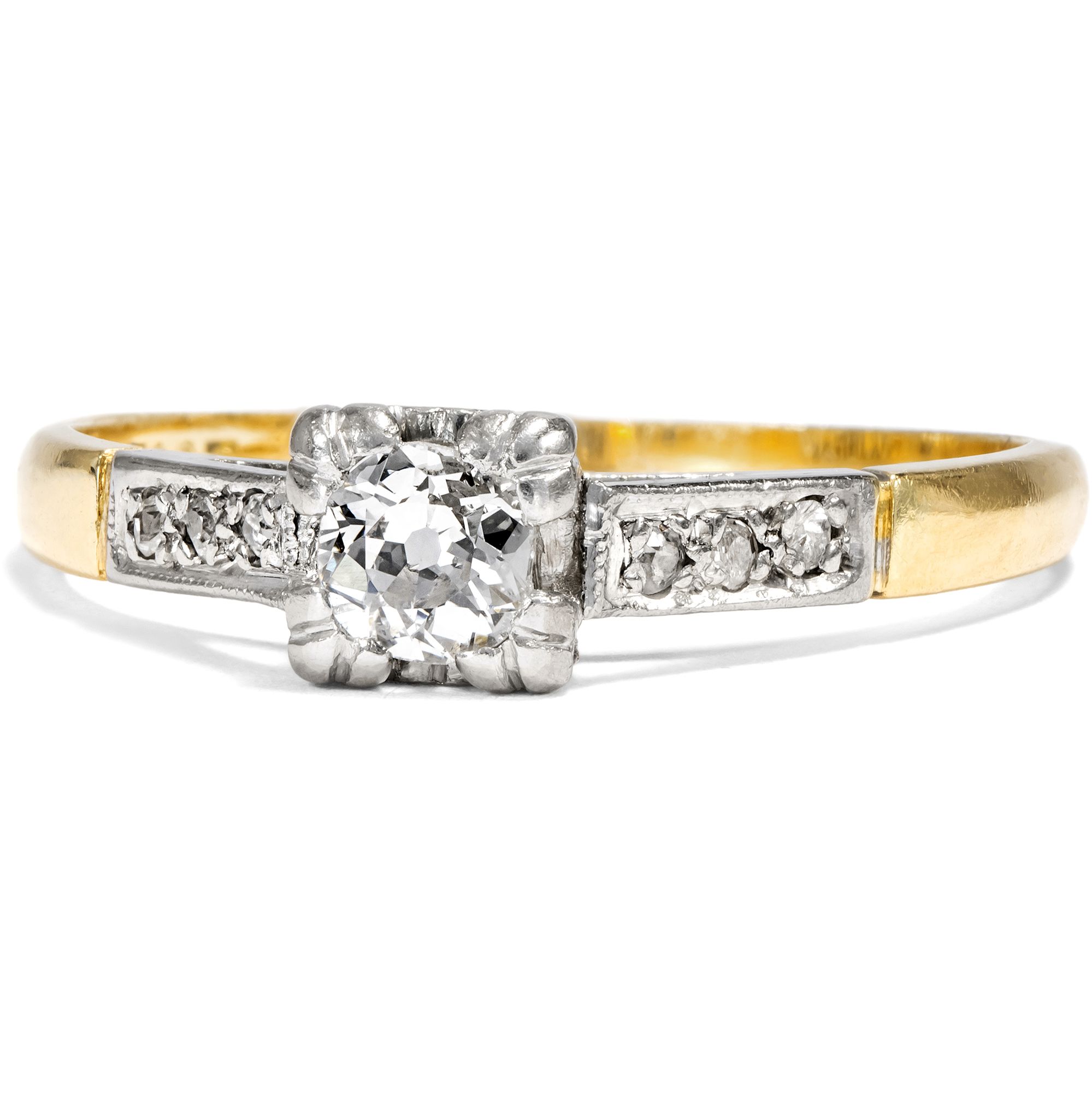 Kaum ein Schmuckstück hat eine so besondere Bedeutung wie ein Ring mit einem Diamanten. Als Zeichen immerwährender Liebe und Verbundenheit wird das härteste Mineral der Erde schon seit Jahrhunderten getragen. Sein weißes, strahlendes Funkeln ist zeitlos – und wird vermutlich auch in Zukunft nicht aus der Mode kommen. Hier nun liegt ein klassisch entworfener Solitärring vor. Der zentral eingelassene Diamant hat ein Gewicht von etwa 0,17 ct. Er ist im sog. „Old Mine Cut“ geschliffen, einer alten Form des Brillantschliffes, wie sie im frühen 19. Jahrhundert üblich war. Der Stein ist leicht kissenförmig, leuchtet weiß und zeigt nur sehr kleine Einschlüsse (H, vsi). Ein kräftiger Chaton hält den Diamanten an vier Eckpunkten. Sechs kleine Diamanten begleiten den Stein auf den sanft ansteigenden Ringschultern. Der Ring selbst ist aus Gelbgold gefertigt, während Schultern und Steinfassung aus Platin gearbeitet sind. Das Schmuckstück ist gut erhalten. Wir haben es in London entdeckt, und die englische Stempelfolge im Inneren der Ringschiene verrät, dass es auch in Großbritannien gefertigt wurde. Ein authentisches Schmuckstück aus der Zwischenkriegszeit in klassisch-eleganter Zurückhaltung.